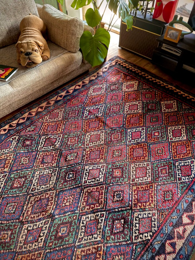 商品番号:No.618 年代:1960年代 産地:イラン西部 素材:ウール×ウール サイズ:172cm×290cm(フリンジ含まず) 厚み:8ミリ 全体的に淡いペールカラーのブルーにオレンジ、そしてエメラルドグリーンなどのカラフルな配色が独創的なこちらは、イラン西部に遊牧していたクルド族の支族であるジャフ・クルドのトライバルラグかと思われる特大サイズの1枚になります。 通称ジャフ族とも呼ばれペルシャ絨毯の産地セネ※現サナンダジ近郊を遊牧していた部族で、独特なバイアス柄で織られたフックドメダリオンの連続紋様にブルーを多用したラグが特徴的でありますが、不思議とホルジンなどのバッグフェイスのみが散見されるなか、ここまでの特大サイズのパイルラグは非常に希少だと思われ、リビングを覆う煌びやかな宝石箱と言わんばかりの色彩美に圧倒されます。 経年としては60年※それより以前のヴィンテージラグらしく、それなりの使用感に中央付近のパイルが擦れて短くなっている箇所がありますが、経年劣化として見れば目立つ汚れやダメージにリペア箇所のないグッドなコンディションで、油分を含んだ長めのパイルはしっとりとしていて心地よいメインラグになります。 また全体的な雰囲気は下記URLの Instagramにて最後の動画(室内での自然光にて撮影)を参照して下さい。 https://www.instagram.com/p/DROtv6PElcv/?img_index=12&igsh=cTZheGgxeHJhN3V1 ◎取り扱い商品について イランや仕入れ先の現地にて専門のリペアを施している物もありますが、現状により難がないなど見た目の雰囲気を重視してリペアしていない物もあり、こちらが気付かない程の些細なリペアもありますのでご理解下さい。 クリーニング済みとして現地のセラーから仕入れていますが、取りきれない砂にパイルの屑が出ることもありますのでご了承ください。 また稀にクリーニング後の乾燥による釘打ち跡がありますが、使用するうちに馴染んできますのでご安心下さい。 ※検品の際に酷い物は国内でクリーニングしていますが、どうしてもという場合は説明記載したうえで価格に反映されています。 最後にラグそのものに関しては羊毛特有の匂いがあり、採寸は中央付近で計測していますが、手織りならではの歪みによる誤差や水洗いクリーニングによる縮み、また草木染めによる経年劣化の色ムラなどがありますが、それもまたヴィンテージラグの魅力かとご理解ください。