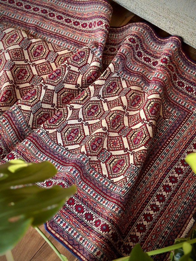 商品番号:No.654 年代:1980年代 産地:イラン北東部 素材:ウール×コットン サイズ:126cm×60cm(フリンジ含まず) 厚み:6ミリ 無染色のナチュラルなベージュカラーに、ネイティブ・アメリカンのオルテガを連想させる渋い柄が冴えるこちらは、イラン北東部に居住するトルクメン族のトライバルラグで、シンプルな色数で緻密に織られた柄がなんともかっこいい1枚になります。 元々はチュワルと呼ばれる穀物や家財道具を入れる袋物の表皮をラグに仕立て直したモノになりますが、特徴としては長手側にフリンジがつく場合が多いので壁掛けとしても使えるアイテムになり、もちろん床敷きのアクセントラグとして、短めのパイルのサラッとした足触りに癒されます。 経年としては40年ほどのヴィンテージラグになりますが、元が袋物だけに使用感は見られなく、目立つ汚れやダメージにリペア箇所は見当たらないグッドなコンディションで、個人的にも好きな柄であまり出会わない1枚と言えるでしょう。 また全体的な雰囲気は下記URLの Instagramにて最後の動画(室内での自然光にて撮影)を参照して下さい。 https://www.instagram.com/p/DQOEGXOkjUk/?img_index=14&igsh=MWN4eXcxMnlsbTJsdQ== ◎取り扱い商品について イランや仕入れ先の現地にて専門のリペアを施している物もありますが、現状により難がないなど見た目の雰囲気を重視してリペアしていない物もあり、こちらが気付かない程の些細なリペアもありますのでご理解下さい。 クリーニング済みとして現地のセラーから仕入れていますが、取りきれない砂にパイルの屑が出ることもありますのでご了承ください。 また稀にクリーニング後の乾燥による釘打ち跡がありますが、使用するうちに馴染んできますのでご安心下さい。 ※検品の際に酷い物は国内でクリーニングしていますが、どうしてもという場合は説明記載したうえで価格に反映されています。 最後にラグそのものに関しては羊毛特有の匂いがあり、採寸は中央付近で計測していますが、手織りならではの歪みによる誤差や水洗いクリーニングによる縮み、また草木染めによる経年劣化の色ムラなどがありますが、それもまたヴィンテージラグの魅力かとご理解ください。