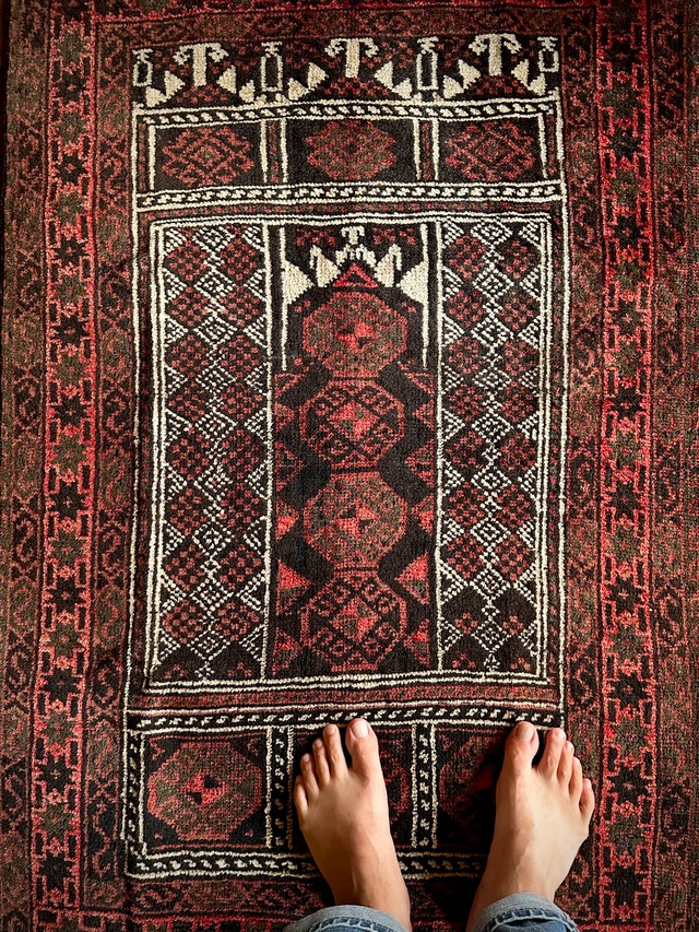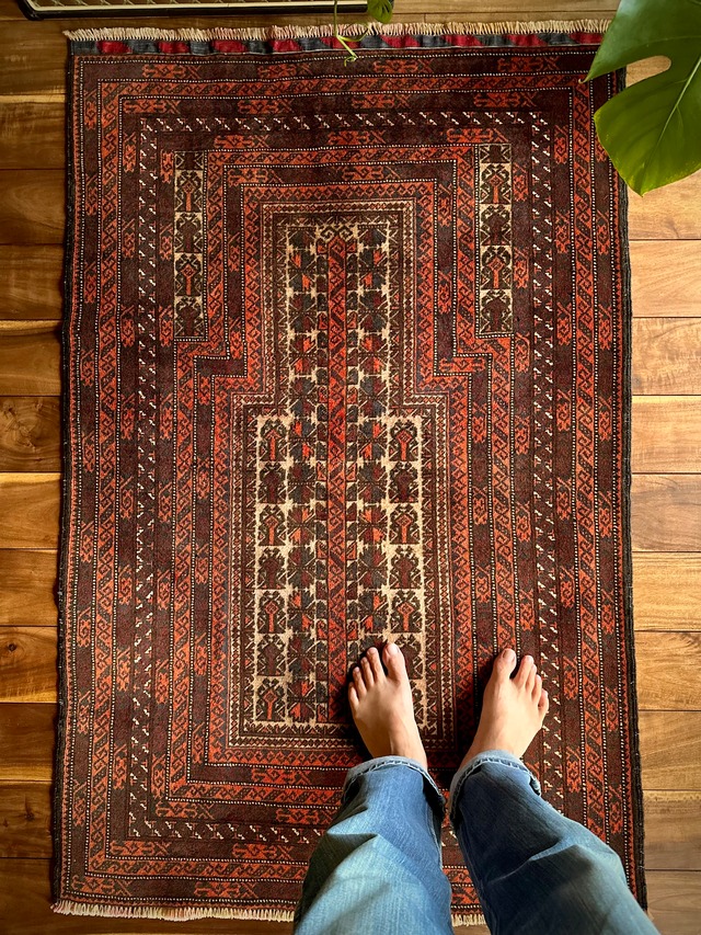 商品番号:No.632 年代:1970年代 産地:ヘラート/アフガニスタン 素材:ウール×ウール サイズ:79cm×132cm(フリンジ含まず) 厚み:5ミリ 色褪せた赤をベースにブラックやグレーにバーガンディの渋い配色がかっこいいこちらは、アフガニスタンはヘラート州に居住するバルーチ族のトライバルラグで、祈りの際に用いられるプレイヤーラグになります。 持ち運びに便利なように薄手に織られたプレイヤーですが、バルーチらしい紋様に八芒星のボーダーが抜かりなく、浮かび上がったホワイトラインが高ポイントでしょか。サイズ的には敷く場所を選ばないアクセントラグになります。 経年としては50年のヴィンテージラグらしくそれなりの使用感はありますが、色褪せた雰囲気もかっこよく、特に目立つ汚れやダメージにリペア箇所は見当たらないグッドなコンディションで、パイル自体は短めのサラッとした肌触りになります。 また全体的な雰囲気は下記URLの Instagramにて最後の動画(室内での自然光なにて撮影)を参照して下さい。 https://www.instagram.com/p/DPyKZ4CEsUT/?img_index=14&igsh=aG1tODlzYnhsMnFm ◎取り扱い商品について イランや仕入れ先の現地にて専門のリペアを施している物もありますが、現状により難がないなど見た目の雰囲気を重視してリペアしていない物もあり、こちらが気付かない程の些細なリペアもありますのでご理解下さい。 クリーニング済みとして現地のセラーから仕入れていますが、取りきれない砂にパイルの屑が出ることもありますのでご了承ください。 また稀にクリーニング後の乾燥による釘打ち跡がありますが、使用するうちに馴染んできますのでご安心下さい。 ※検品の際に酷い物は国内でクリーニングしていますが、どうしてもという場合は説明記載したうえで価格に反映されています。 最後にラグそのものに関しては羊毛特有の匂いがあり、採寸は中央付近で計測していますが、手織りならではの歪みによる誤差や水洗いクリーニングによる縮み、また草木染めによる経年劣化の色ムラなどがありますが、それもまたヴィンテージラグの魅力かとご理解ください。