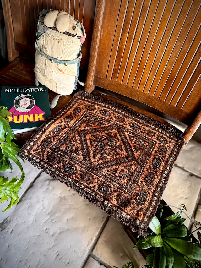 商品番号:No.677 年代:1980年代 産地:ヘラート/アフガニスタン 素材:ウール×ウール サイズ:48cm×38cm(フリンジ含まず) 厚み:5ミリ 何にでも合わせやすそうなテラコッタとブラウンの配色に大振りなギュル紋様がおおらかな雰囲気を醸し出しているこちらは、アフガニスタンはヘラート州に居住するバルーチ族のトライバルラグで、元はラクダなどに背負わせるホルジンと呼ばれる振り分け用バッグの表皮のみをラグに仕立て直したモノになります。 ちょっとしたお部屋のアクセントに植物の鉢置きとしても活用出来るミニラグなサイズ感で、ソファの座面や壁掛けとしても良い雰囲気でしょうか。 経年としては45年のヴィンテージラグらしく、元からざっくりとした織りにヤレ感などはありますが、特に目立つ汚れやダメージにリペア箇所は見当たらないグッドなコンディションで、パイル自体は短めのサラッとした肌触りのアクセントラグになります。 ◎取り扱い商品について イランや仕入れ先の現地にて専門のリペアを施している物もありますが、現状により難がないなど見た目の雰囲気を重視してリペアしていない物もあり、こちらが気付かない程の些細なリペアもありますのでご理解下さい。 クリーニング済みとして現地のセラーから仕入れていますが、取りきれない砂にパイルの屑が出ることもありますのでご了承ください。 また稀にクリーニング後の乾燥による釘打ち跡がありますが、使用するうちに馴染んできますのでご安心下さい。 ※検品の際に酷い物は国内でクリーニングしていますが、どうしてもという場合は説明記載したうえで価格に反映されています。 最後にラグそのものに関しては羊毛特有の匂いがあり、採寸は中央付近で計測していますが、手織りならではの歪みによる誤差や水洗いクリーニングによる縮み、また草木染めによる経年劣化の色ムラなどがありますが、それもまたヴィンテージラグの魅力かとご理解ください。