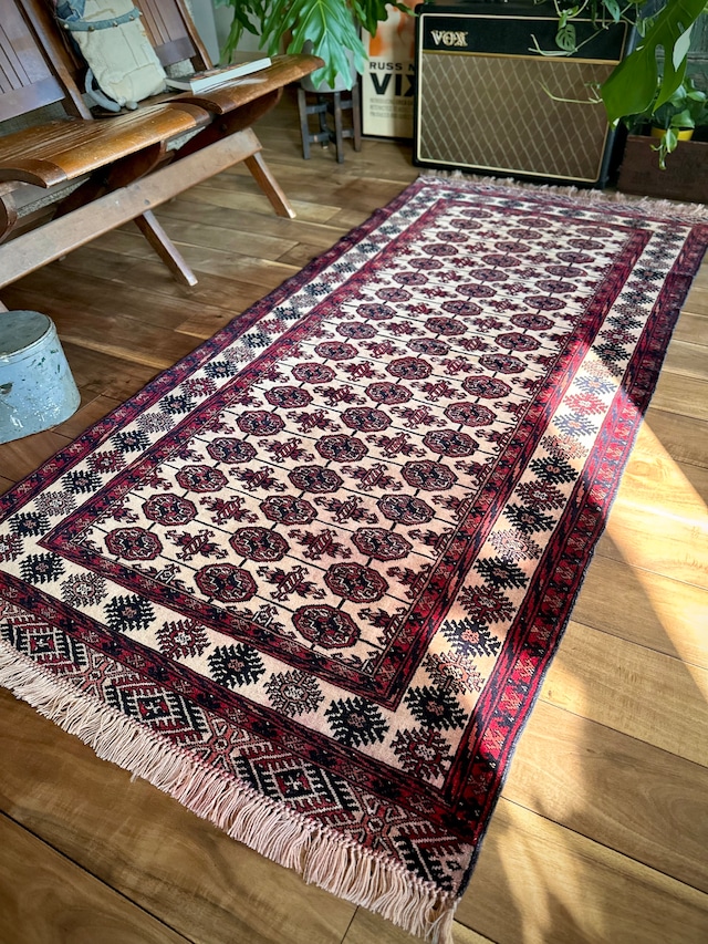 商品番号:No.711 年代:1980年代 産地:アンドホイ/アフガニスタン 素材:ウール×ウール サイズ:132cm×187cm(フリンジ含まず) 厚み:5ミリ 赤よりもさらに深い真紅のレッドカラーに伝統的なギュル紋様が威風堂々とした貫禄を放つこちらは、アフガニスタン北部に居住するトルクメン族のトライバルラグで、リビングやダイニングにも嵌る希少な幅広タイプのメインラグになります。 トルクメンの代表的なテッケギュルを小さくしたマウリギュルの連続紋様に、幾重にも重なったミルフィーユ状のボーダー部分がなんともかっこよく、その佇まいに騎馬民族を継承する誇り高い部族らしさが刻まれているでしょうか。トルクメンならではの薄手ながらもしっかりとした細かな織りに密度が安心感を与えてくれます。 経年としては45年のヴィンテージラグとなり、それなりの使用感に一部裂け目をリペアした箇所がありますが綺麗に補修されていて、そちら以外に目立つ汚れやダメージのないグッドなコンディションと言えるでしょうか。パイル自体は短めのサラッとした肌触りで年中ご使用になれる1枚になります。 また全体的な雰囲気は下記URLの Instagramにて最後の動画(室内での自然光にて撮影)を参照して下さい。 https://www.instagram.com/p/DTuaQFTkl2q/?img_index=16&igsh=M2F6am9vZmMydWhn ◎取り扱い商品について イランや仕入れ先の現地にて専門のリペアを施している物もありますが、現状により難がないなど見た目の雰囲気を重視してリペアしていない物もあり、こちらが気付かない程の些細なリペアもありますのでご理解下さい。 クリーニング済みとして現地のセラーから仕入れていますが、取りきれない砂にパイルの屑が出ることもありますのでご了承ください。 また稀にクリーニング後の乾燥による釘打ち跡がありますが、使用するうちに馴染んできますのでご安心下さい。 ※検品の際に酷い物は国内でクリーニングしていますが、どうしてもという場合は説明記載したうえで価格に反映されています。 最後にラグそのものに関しては羊毛特有の匂いがあり、採寸は中央付近で計測していますが、手織りならではの歪みによる誤差や水洗いクリーニングによる縮み、また草木染めによる経年劣化の色ムラなどがありますが、それもまたヴィンテージラグの魅力かとご理解ください。