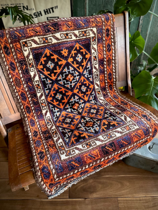 商品番号:No.695 年代:1970年代 産地:ヘラート/アフガニスタン 素材:ウール×ウール サイズ:70cm×121cm(フリンジ含まず) 厚み:8ミリ 目を惹くオレンジと淡い水色にコバルトブルーのバイアス柄で織り込まれたギュル紋様がトライバルらしいこちらは、アフガニスタンはヘラート州に居住するバルーチ族のトライバルラグで、元は家財道具などを収納するバーリシトと呼ばれる袋状の表皮のみをラグに仕立て直したモノになります。 見た目にもざっくりとした織りでソフトな質感がバーリシトらしく、パイル自体はフカフカとした長めのしっとりとした肌触りで、大きさもおひとり様の占有面積にぴったりでしょうか。個人的にはギターアンプの前に敷いてひとりプレイに興じる瞑想ラグさながらの心地よい1枚かと妄想します。 経年としては55年のヴィンテージラグになりますが、元が袋物だけにそれほどの使用感もなく、特に目立つ汚れやダメージにリペア箇所は見当たらないグッドなコンディションで、派手な色合いながらもしっくりとお部屋に馴染むアクセントラグになります。 また全体的な雰囲気は下記URLの Instagramにて最後の動画(室内での自然光にて撮影)を参照して下さい。 https://www.instagram.com/p/DTuTCYlEliH/?img_index=14&igsh=MTNybTNmd2p6MGN5Yg== ◎取り扱い商品について イランや仕入れ先の現地にて専門のリペアを施している物もありますが、現状により難がないなど見た目の雰囲気を重視してリペアしていない物もあり、こちらが気付かない程の些細なリペアもありますのでご理解下さい。 クリーニング済みとして現地のセラーから仕入れていますが、取りきれない砂にパイルの屑が出ることもありますのでご了承ください。 また稀にクリーニング後の乾燥による釘打ち跡がありますが、使用するうちに馴染んできますのでご安心下さい。 ※検品の際に酷い物は国内でクリーニングしていますが、どうしてもという場合は説明記載したうえで価格に反映されています。 最後にラグそのものに関しては羊毛特有の匂いがあり、採寸は中央付近で計測していますが、手織りならではの歪みによる誤差や水洗いクリーニングによる縮み、また草木染めによる経年劣化の色ムラなどがありますが、それもまたヴィンテージラグの魅力かとご理解ください。