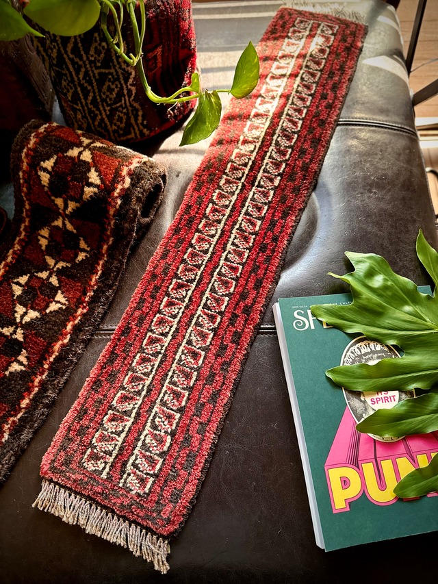 商品番号:No.718 年代:1980年代 産地:ヘラート/アフガニスタン 素材:ウール×ウール サイズ:14cm×72cm(フリンジ含まず) 厚み:5ミリ こちらの商品はアフガニスタンのヘラート州に居住するバルーチ族によって、ひとつひとつ手織りされたアニマル・トラッピングスと呼ばれる動物用の首飾りで、元はタッセルやビーズなどが付いていたのを取り除いてミニラグに仕立て直したモノになります。 その細長い形状からミニランナーとも呼称されますが、小さいだけにいろんな使い方が楽しめる1枚で、我が家でもテーブルにちょこんと敷いてコースター代わりにしたり、鉢置きや小物置きとしてもアクセントが効いていて、ちょっとしたプレゼントにも最適でしょうか。 経年としては40年のヴィンテージラグになりますが、それほどの使用感はなく目立つ汚れにダメージのないグッドなコンディションで、小さいながらもトライバルらしい柄がかっこよくシックな色合いが心揺さぶられます。 ◎取り扱い商品について イランや仕入れ先の現地にて専門のリペアを施している物もありますが、現状により難がないなど見た目の雰囲気を重視してリペアしていない物もあり、こちらが気付かない程の些細なリペアもありますのでご理解下さい。 クリーニング済みとして現地のセラーから仕入れていますが、取りきれない砂にパイルの屑が出ることもありますのでご了承ください。 また稀にクリーニング後の乾燥による釘打ち跡がありますが、使用するうちに馴染んできますのでご安心下さい。 ※検品の際に酷い物は国内でクリーニングしていますが、どうしてもという場合は説明記載したうえで価格に反映されています。 最後にラグそのものに関しては羊毛特有の匂いがあり、採寸は中央付近で計測していますが、手織りならではの歪みによる誤差や水洗いクリーニングによる縮み、また草木染めによる経年劣化の色ムラなどがありますが、それもまたヴィンテージラグの魅力かとご理解ください。