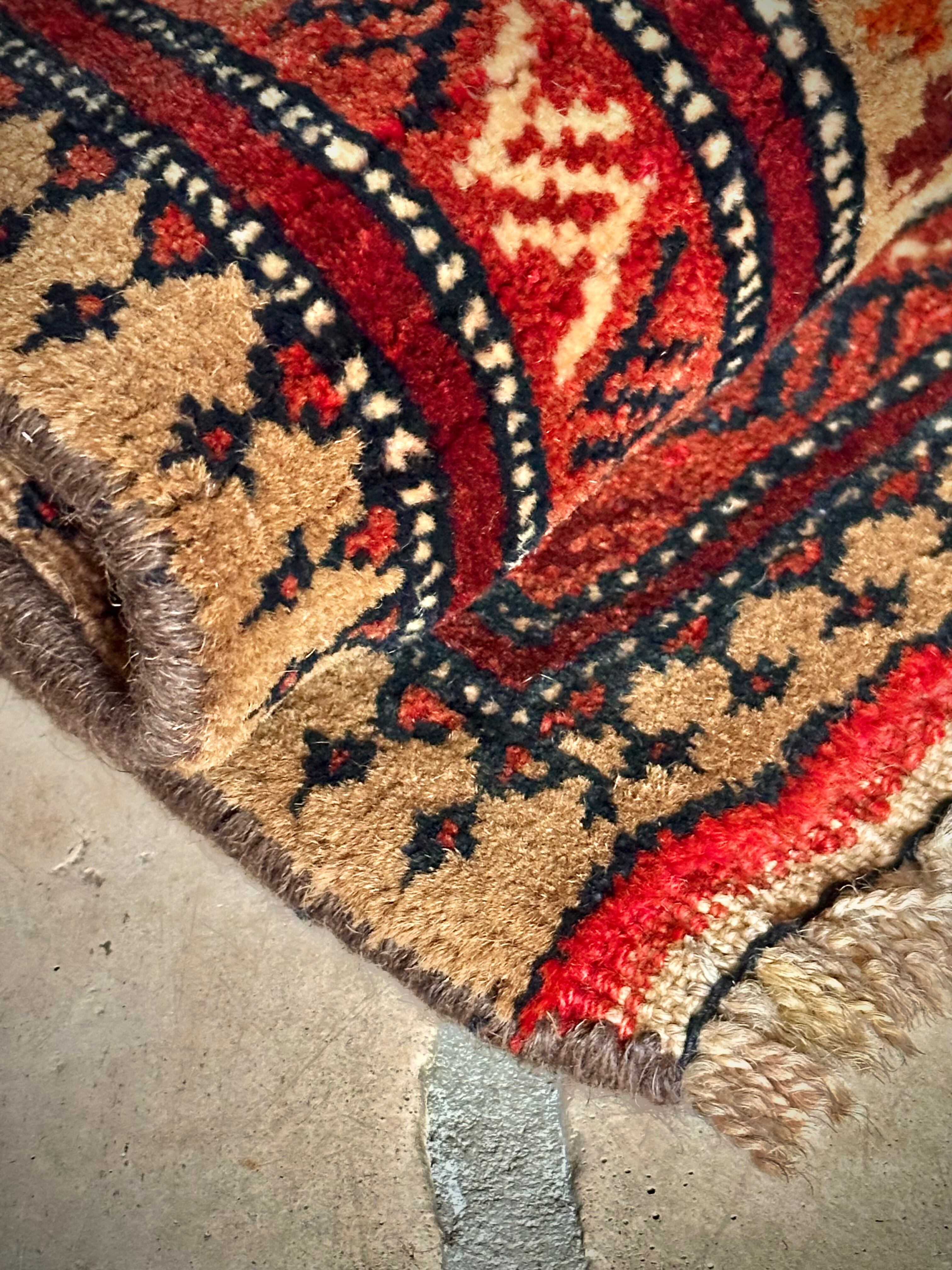 落ち着きのあるキャメルをベースにバーガンディやオレンジの暖色系で彩られたシンプルなこちらは、アフガニスタン北部のアクチャ近郊に居住するトルクメン族のトライバルラグで、上部にあしらわれたモスクの絵柄から祈祷用のプレイヤーラグかと推測されます。
