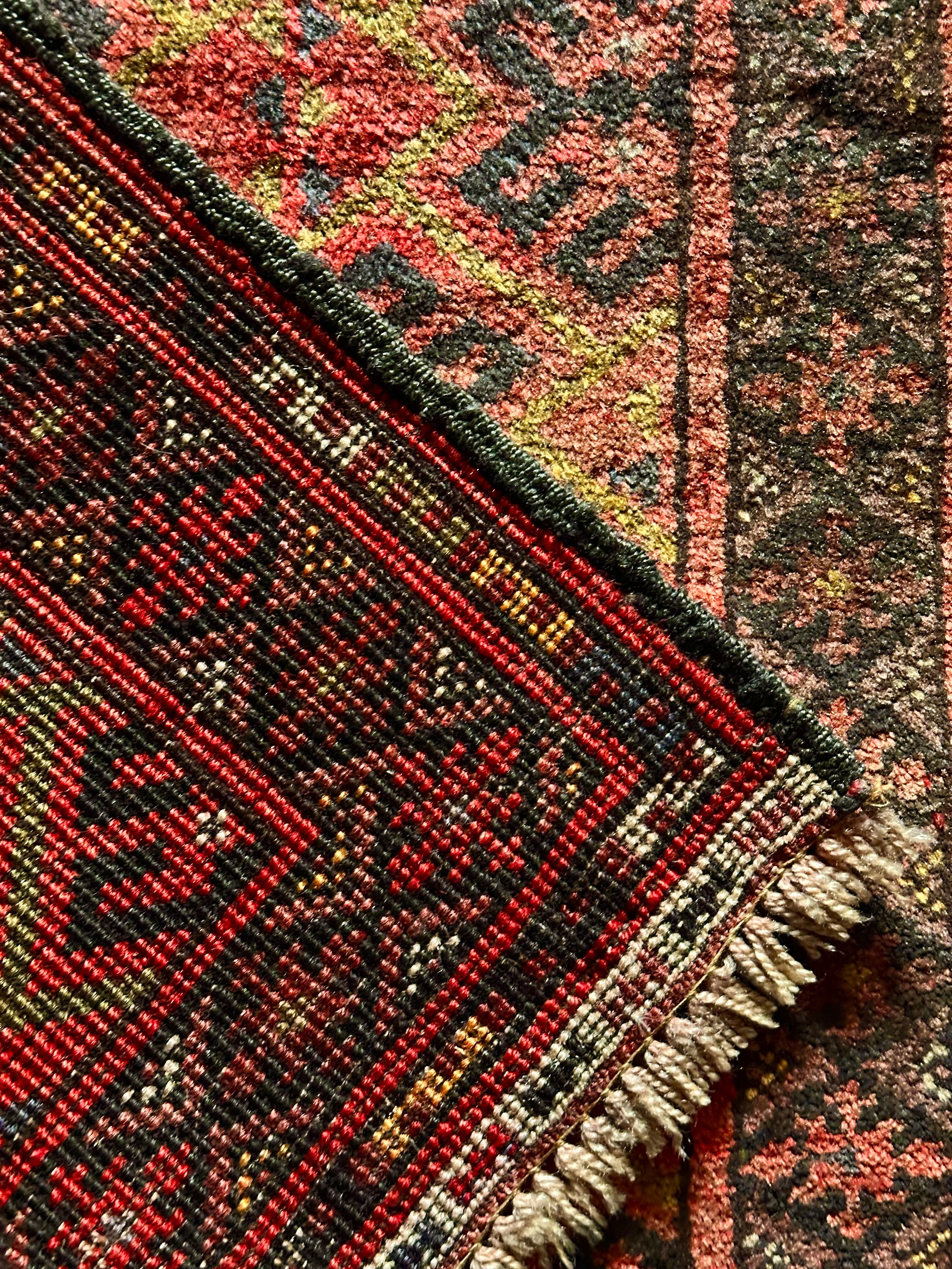 よく見ると繊細な色使いでセージグリーンの縁取りに淡いピンクやレッドにブラウンのボーダーなど、全体的にはトルクメンにも似た印象の素朴な絵柄がなんとも言えなく私的な好みでピックしましたが、実際に目にしてめちゃくちゃ良いと思った次第です。