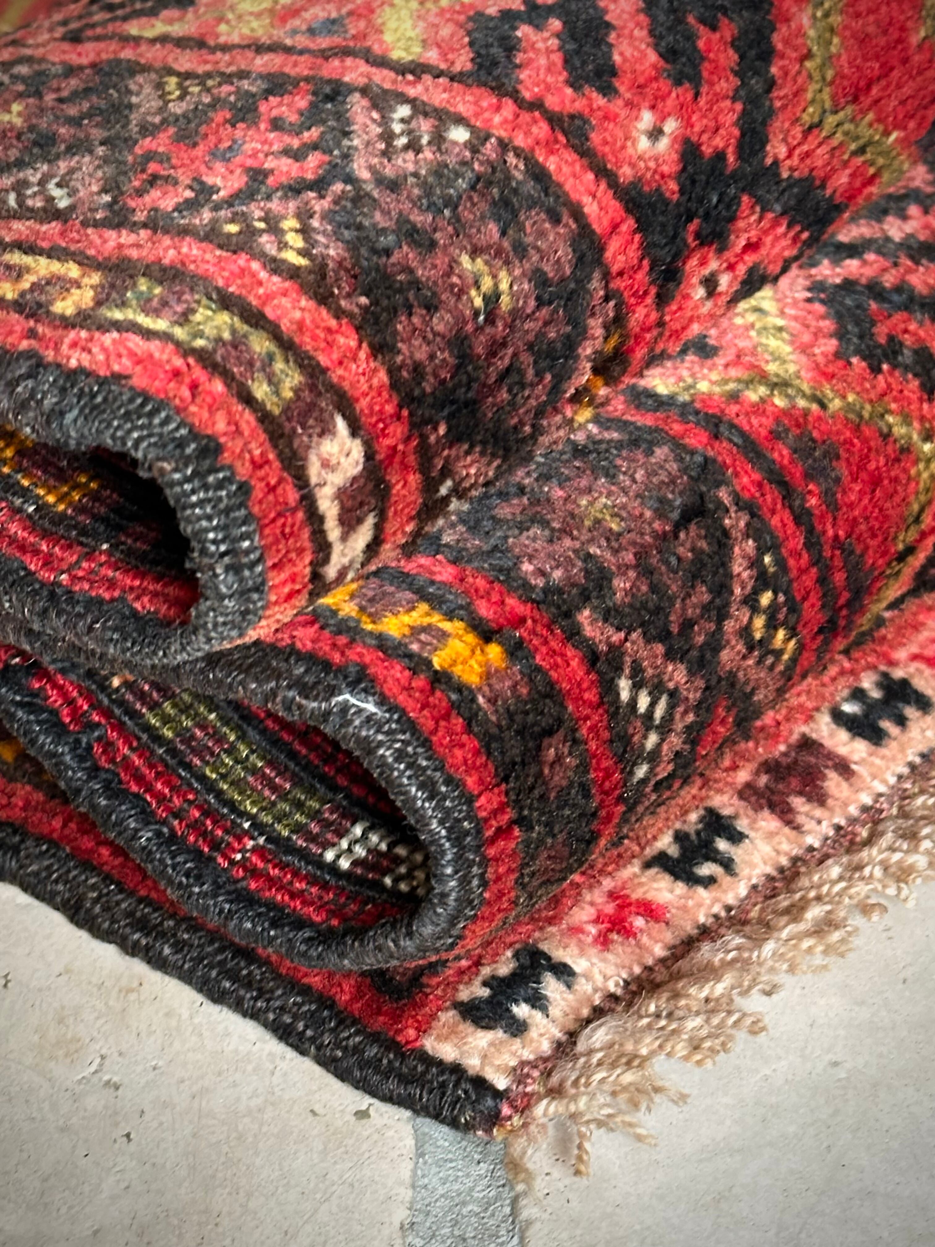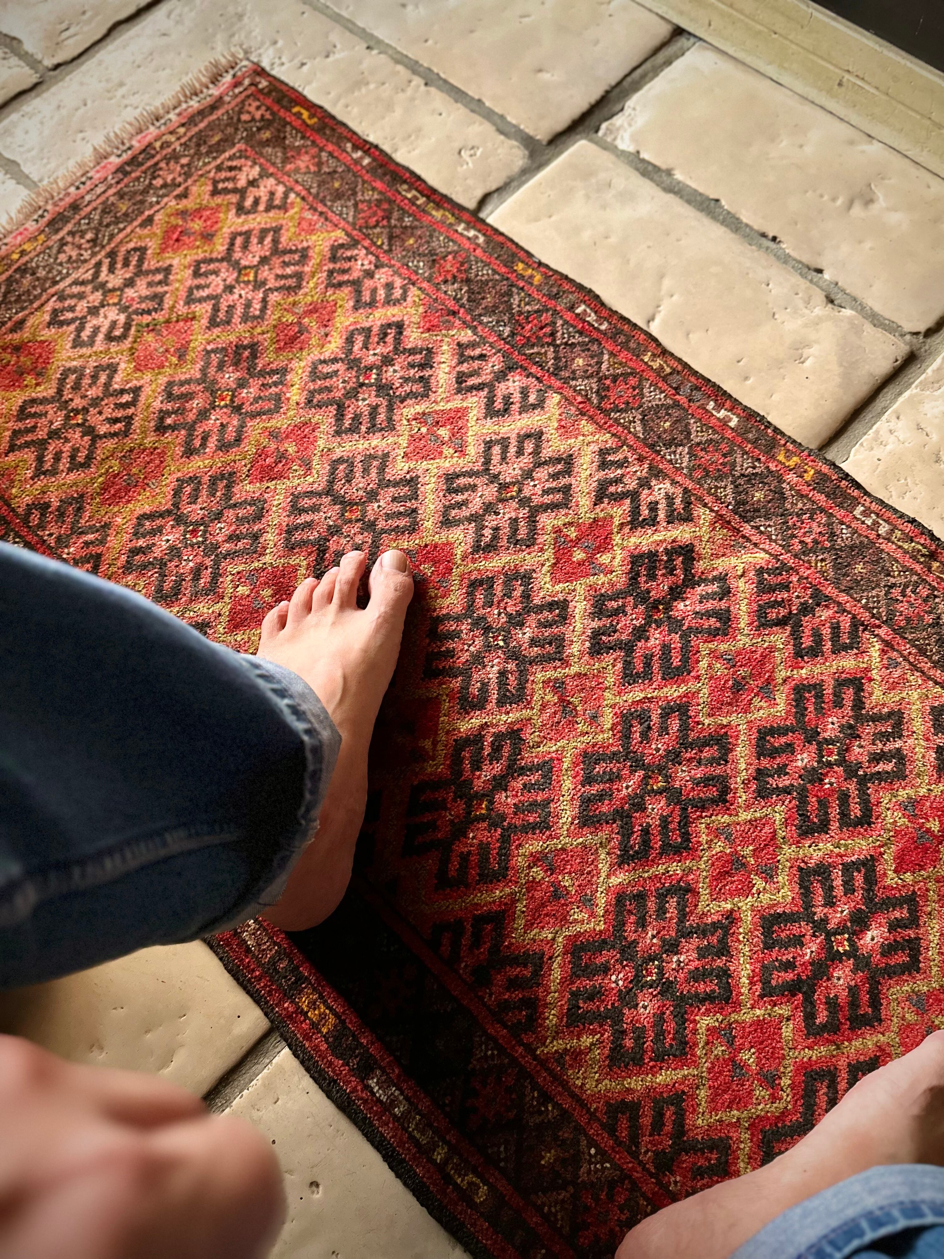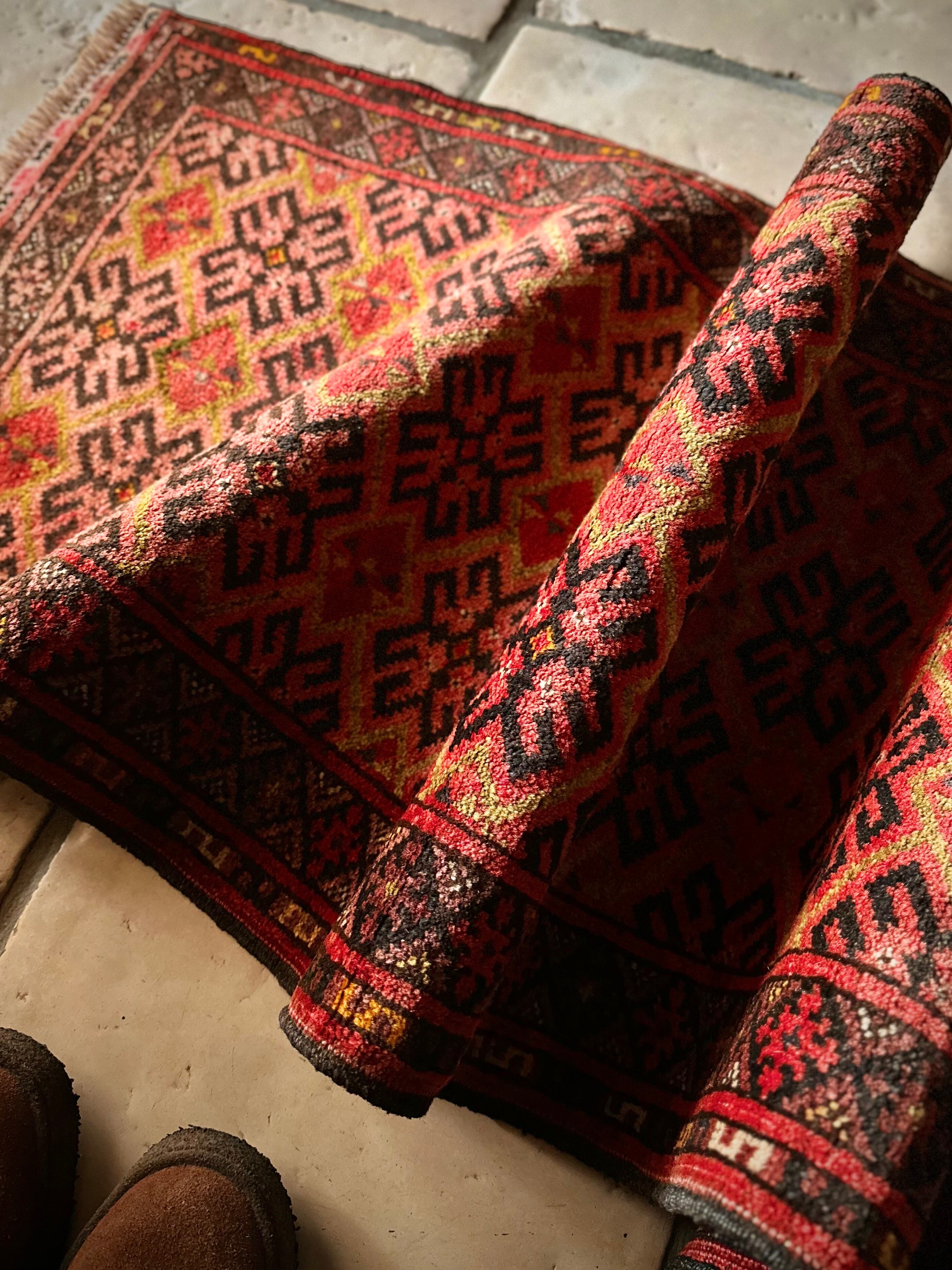 経年としては50年のヴィンテージラグらしく経年変化によるヤレ感はありますが、特に目立つ汚れやダメージにリペア箇所はみあたらなく、パイル自体もサラッとした手触りのしっかりとした織りの1枚になり、サイズ的にも使い勝手の良いアクセントラグと言えるでしょう。