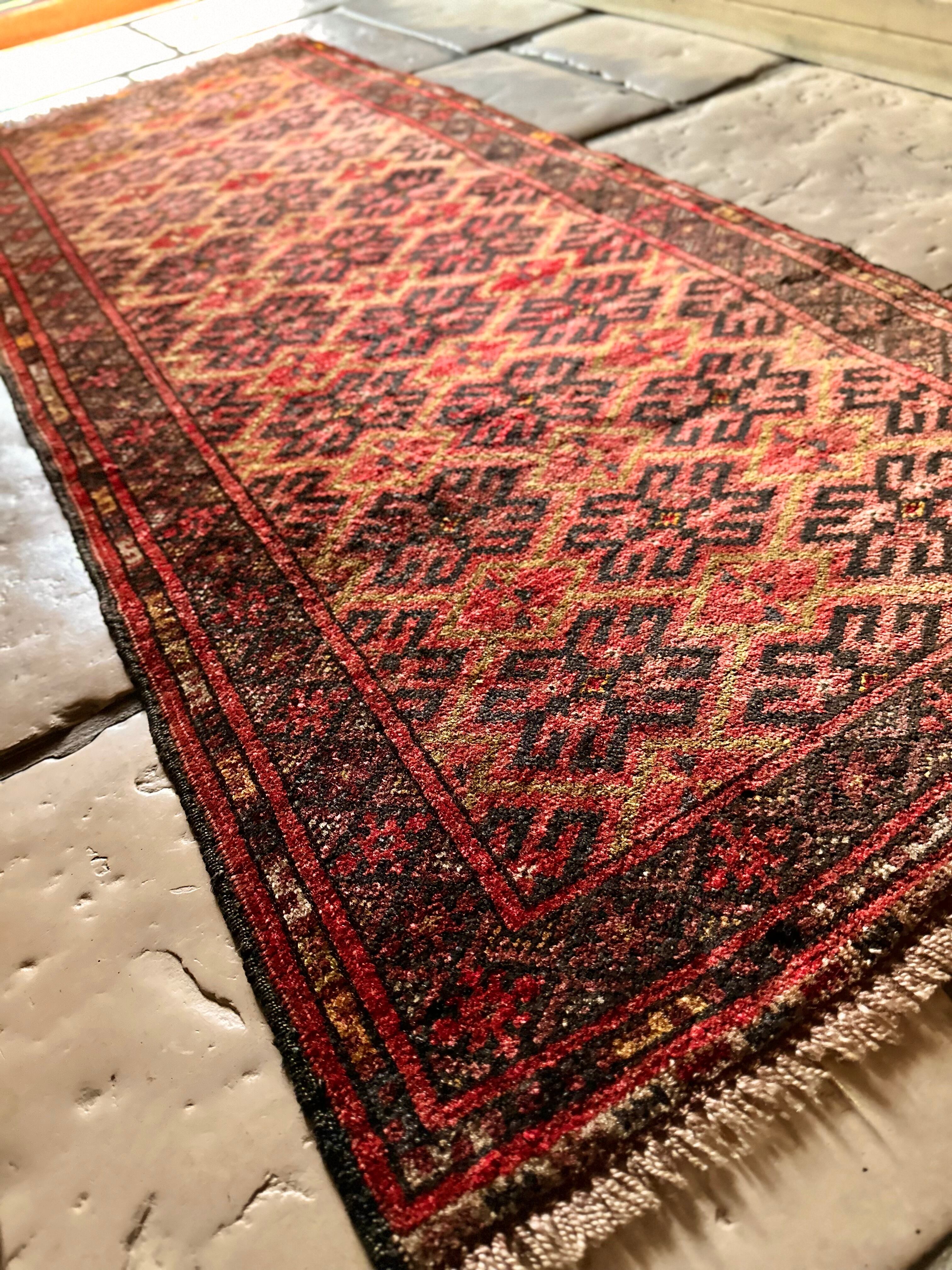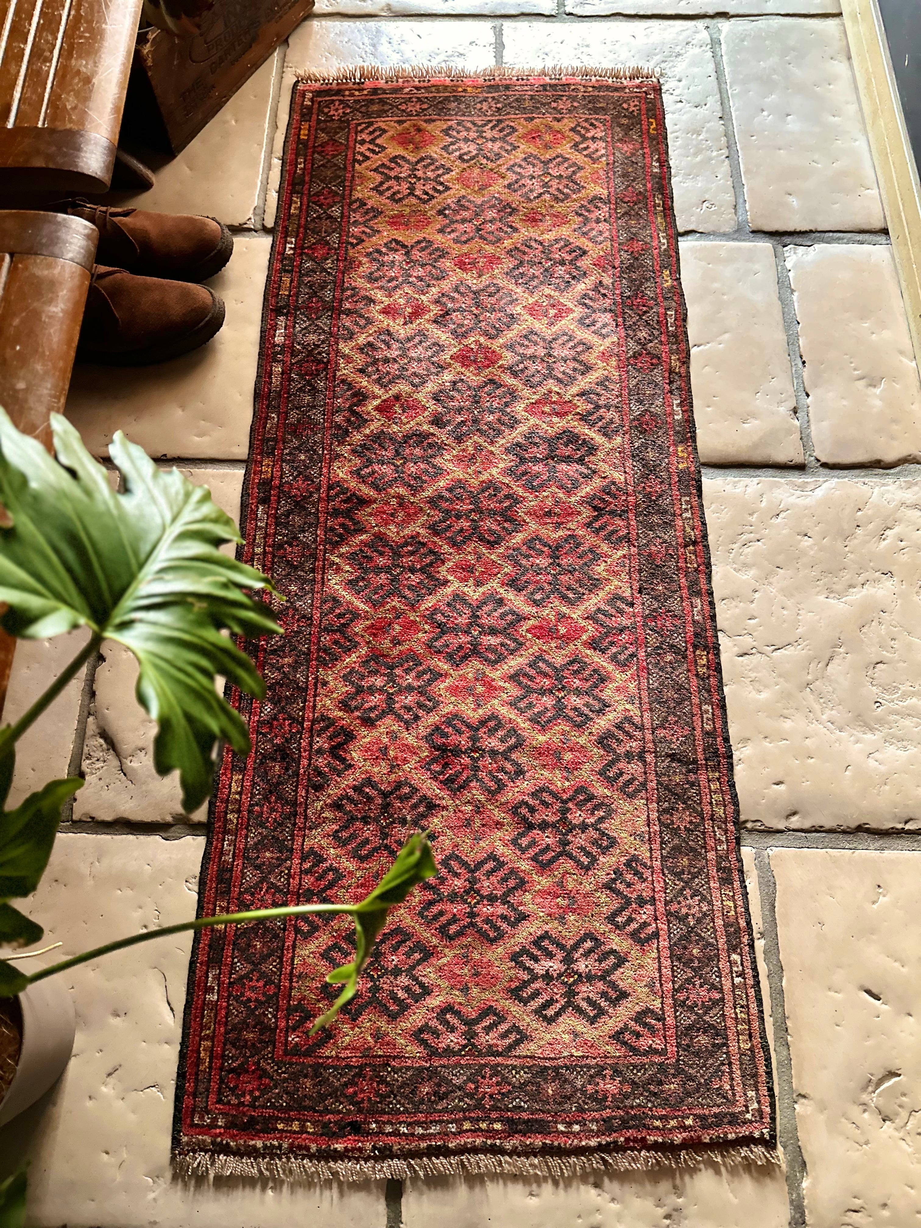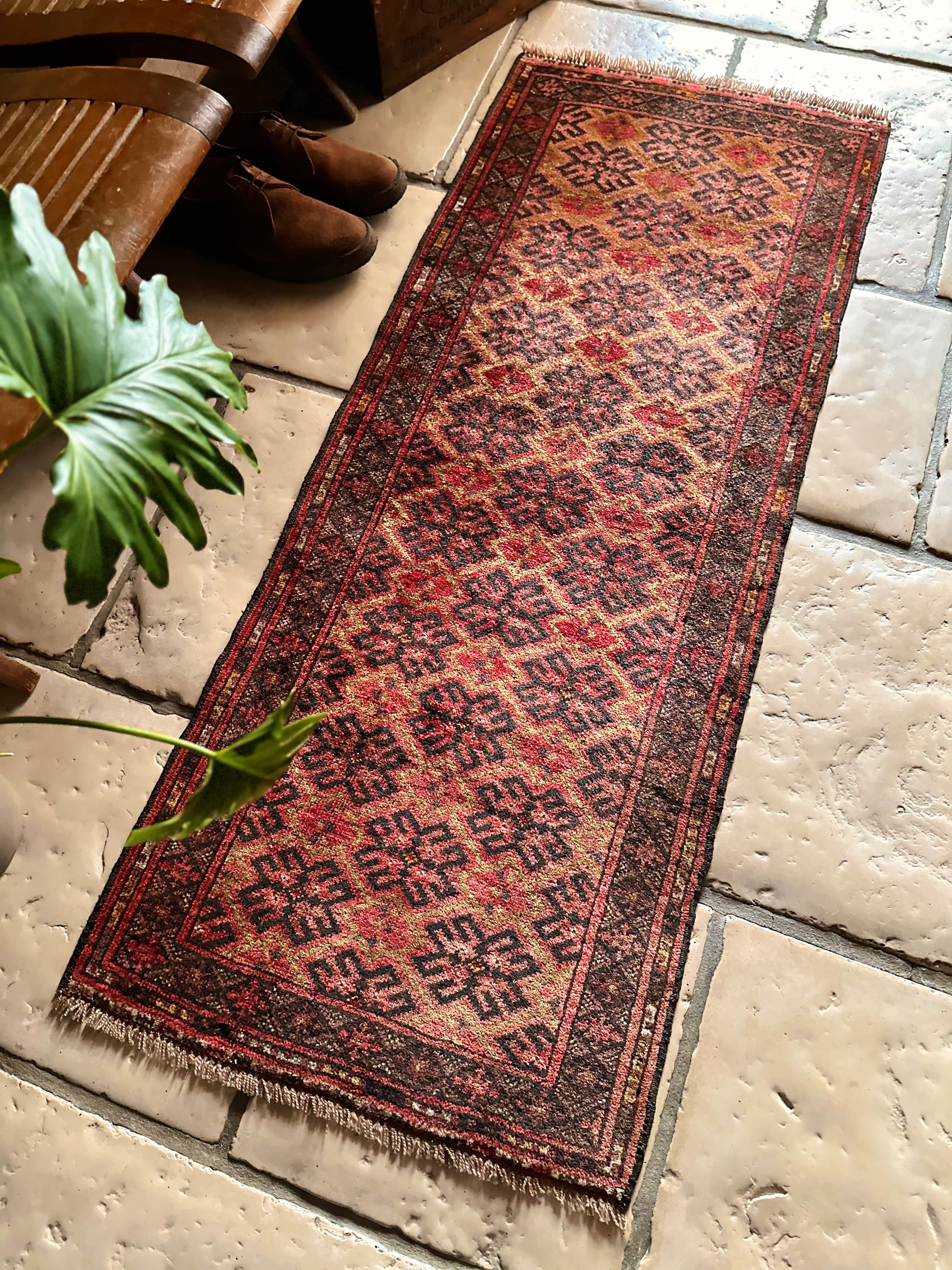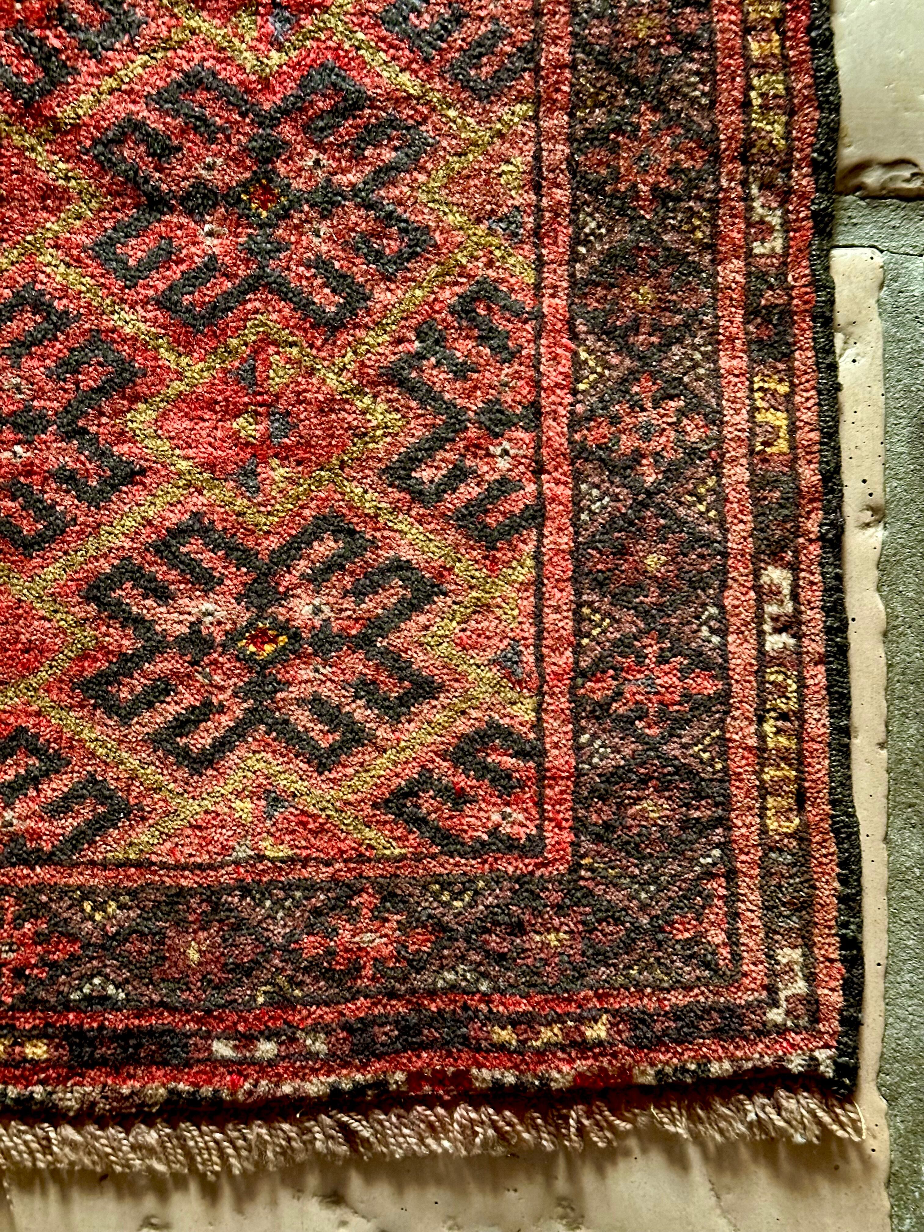 見た目にもシンプルかつプリミティブな印象が伺える小さなランナーサイズで、アフガニスタン北部のマイマナ近隣にあるDawlat Abadという村で織られたヴィレッジラグになります。