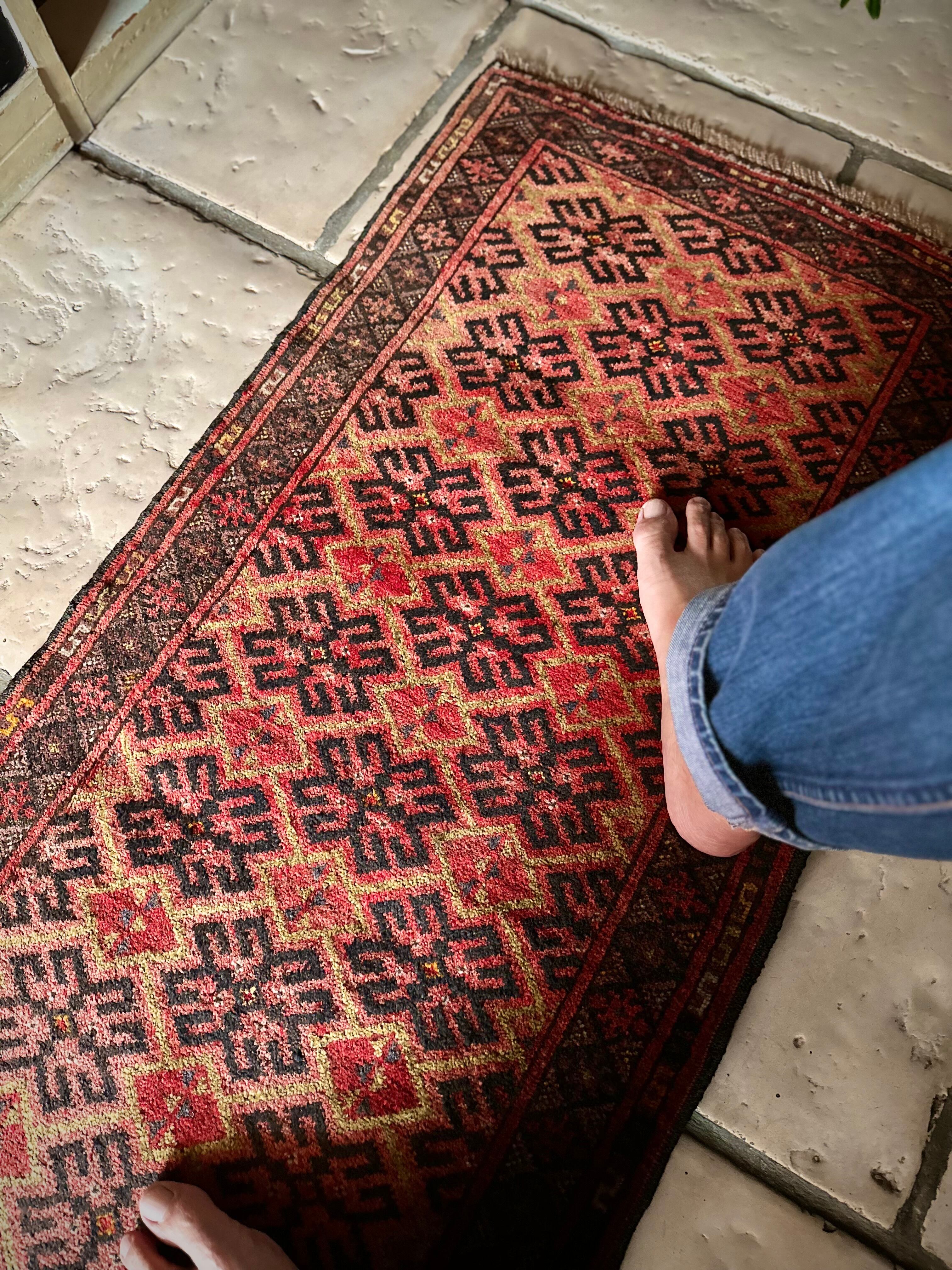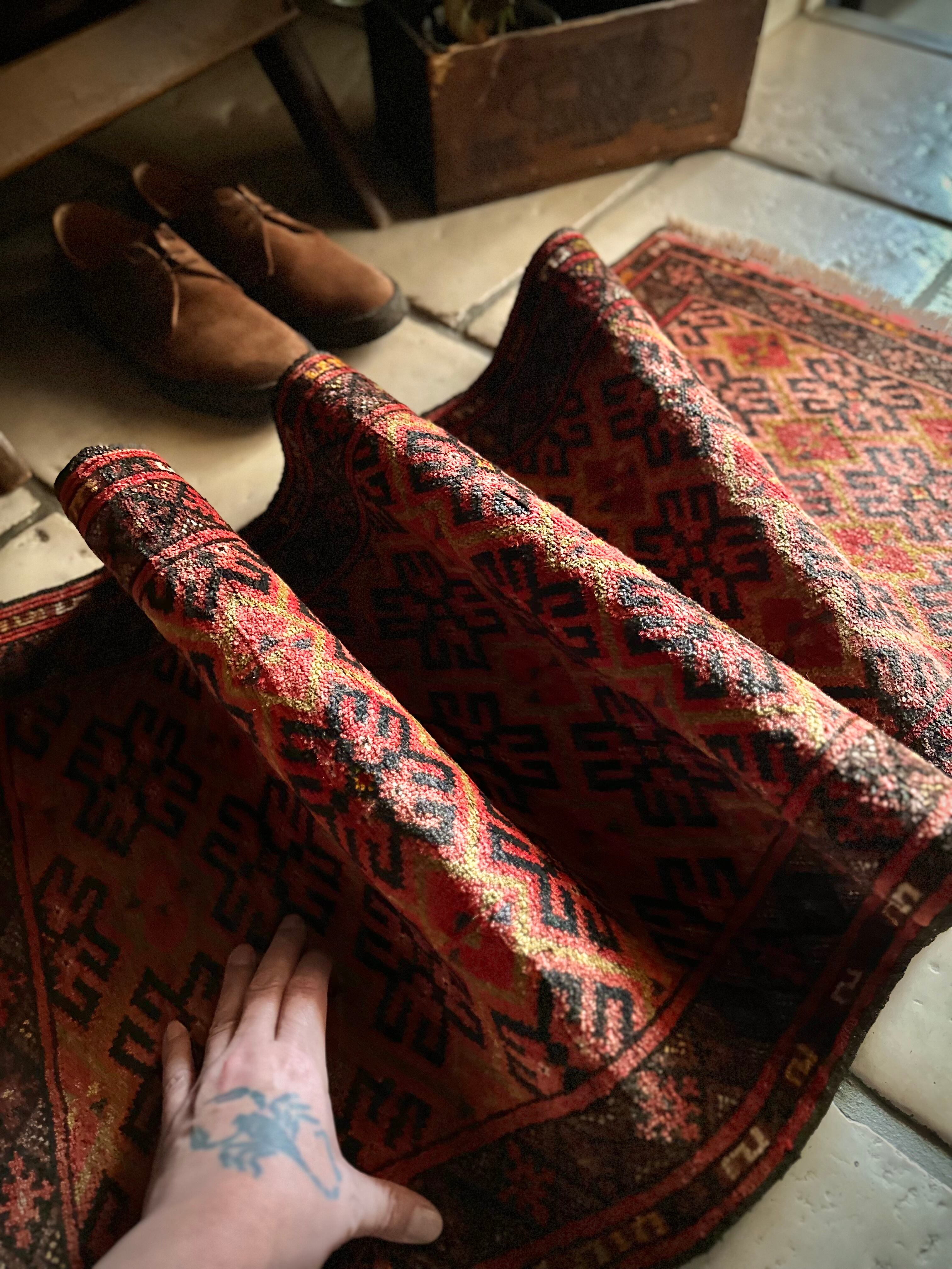最後にラグそのものに関しては羊毛特有の匂いがあり、採寸は中央付近で計測していますが、手織りならではの歪みによる誤差や水洗いクリーニングによる縮み、また草木染めによる経年劣化の色ムラなどがありますが、それもまたヴィンテージラグの魅力かとご理解ください。