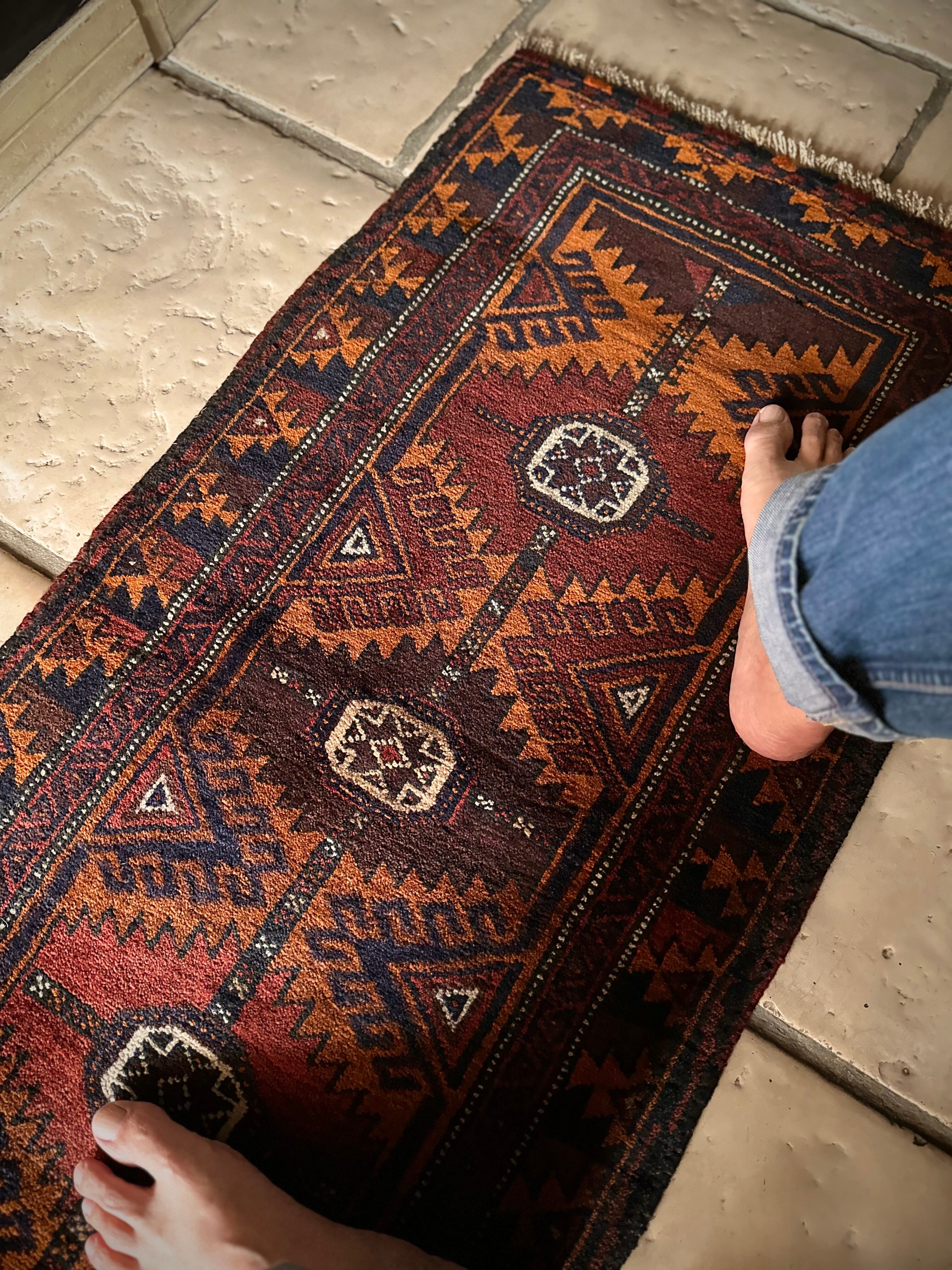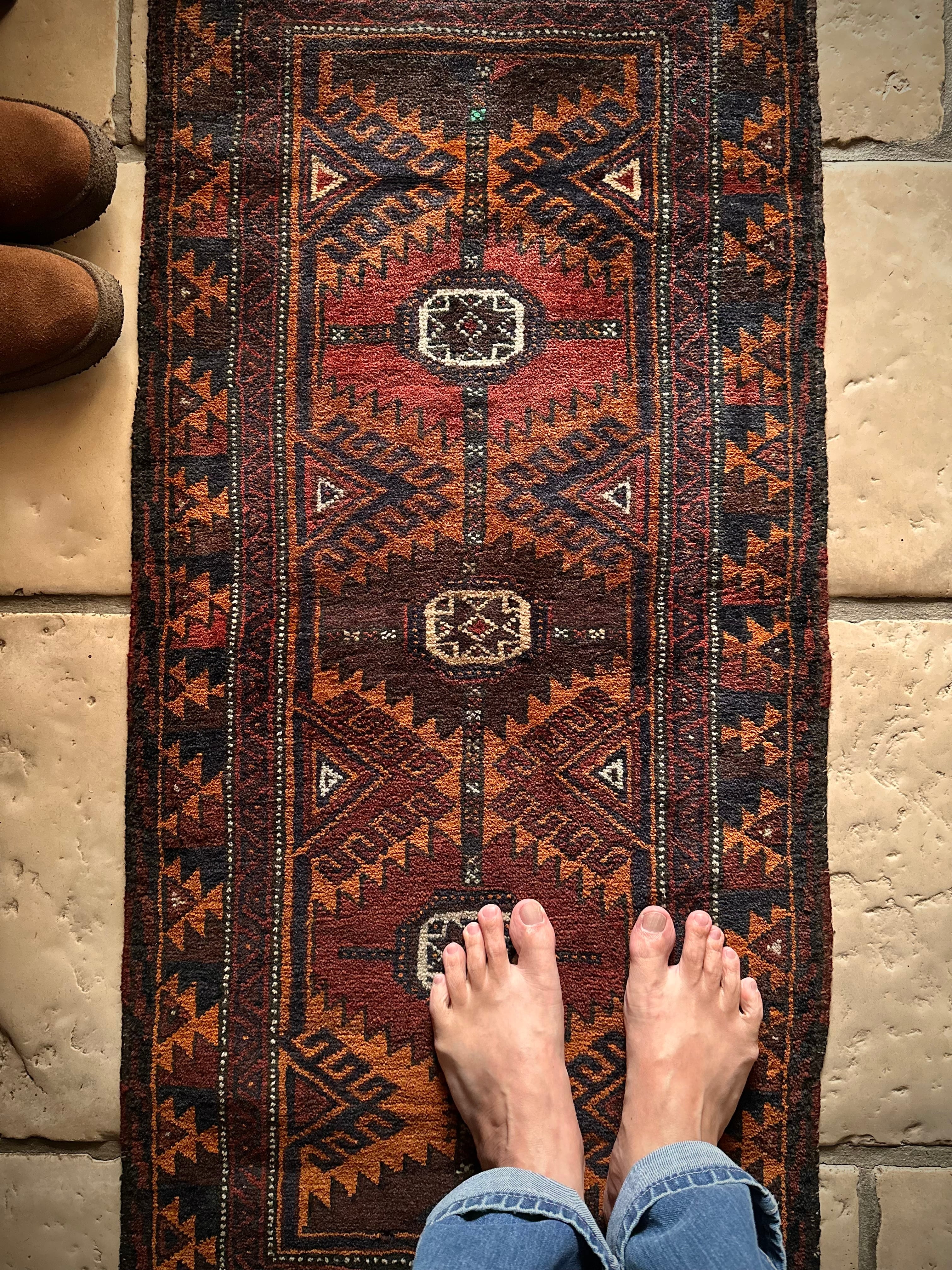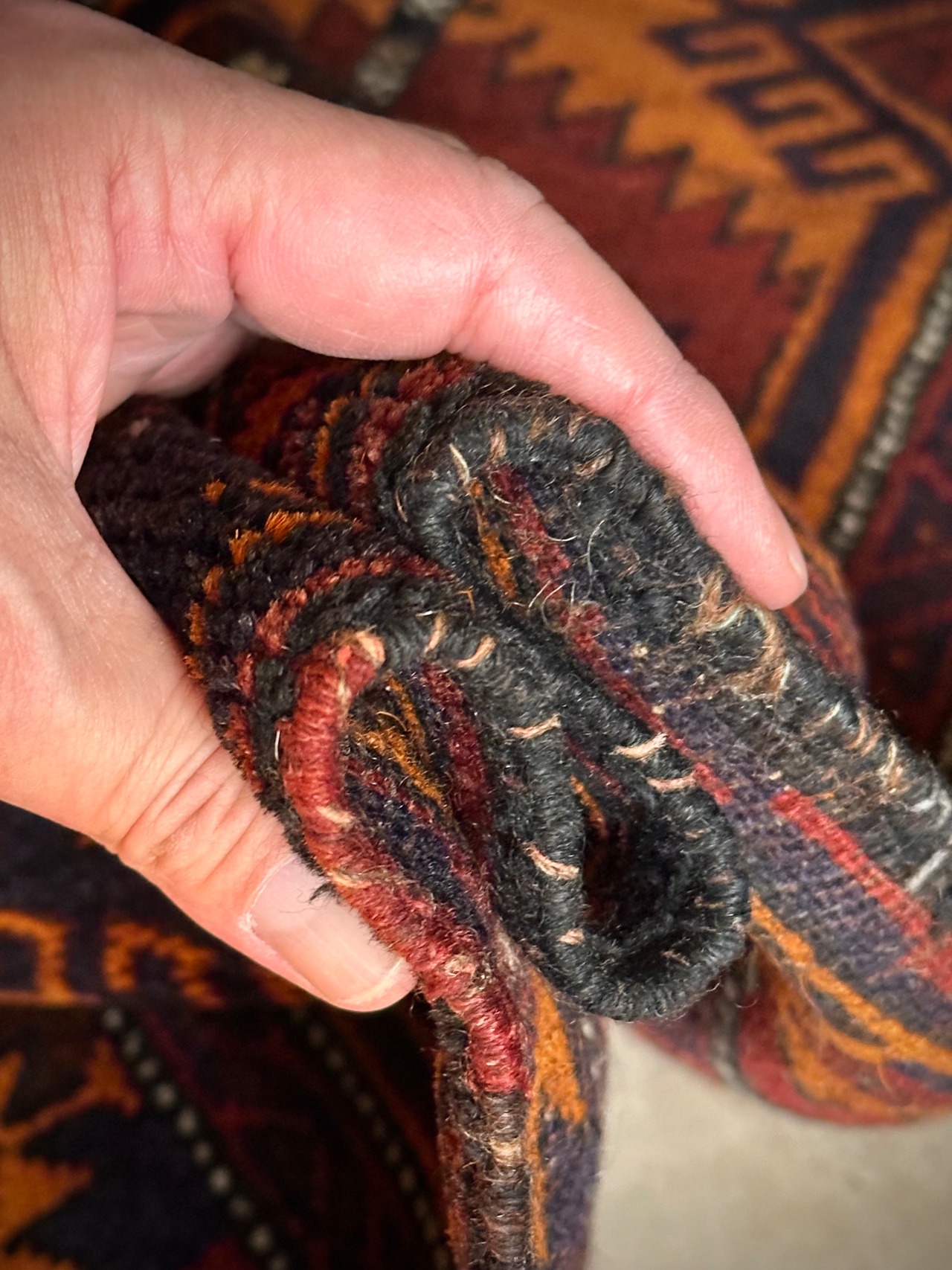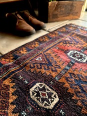 最後にラグそのものに関しては羊毛特有の匂いがあり、採寸は中央付近で計測していますが、手織りならではの歪みによる誤差や水洗いクリーニングによる縮み、また草木染めによる経年劣化の色ムラなどがありますが、それもまたヴィンテージラグの魅力かとご理解ください。