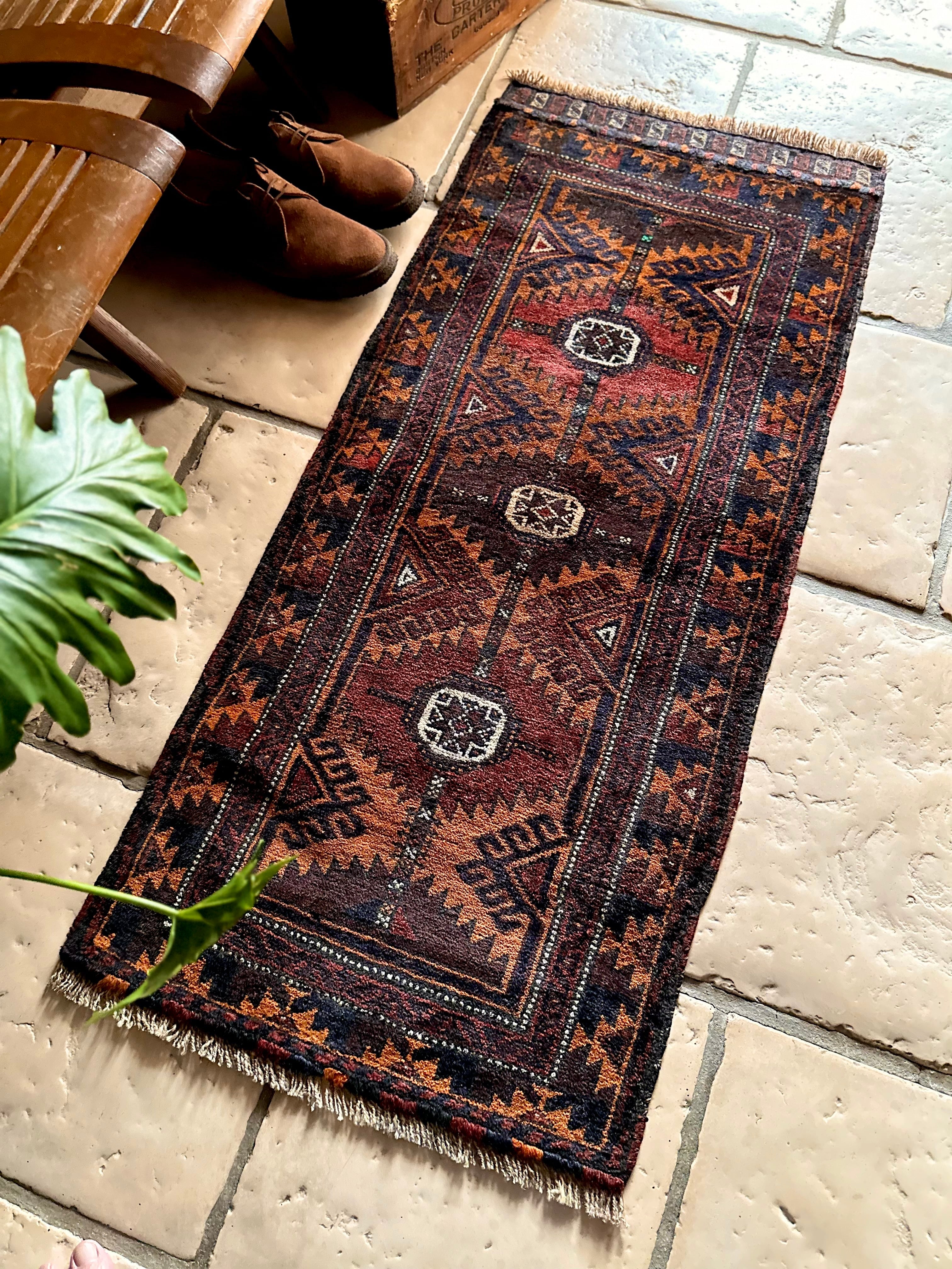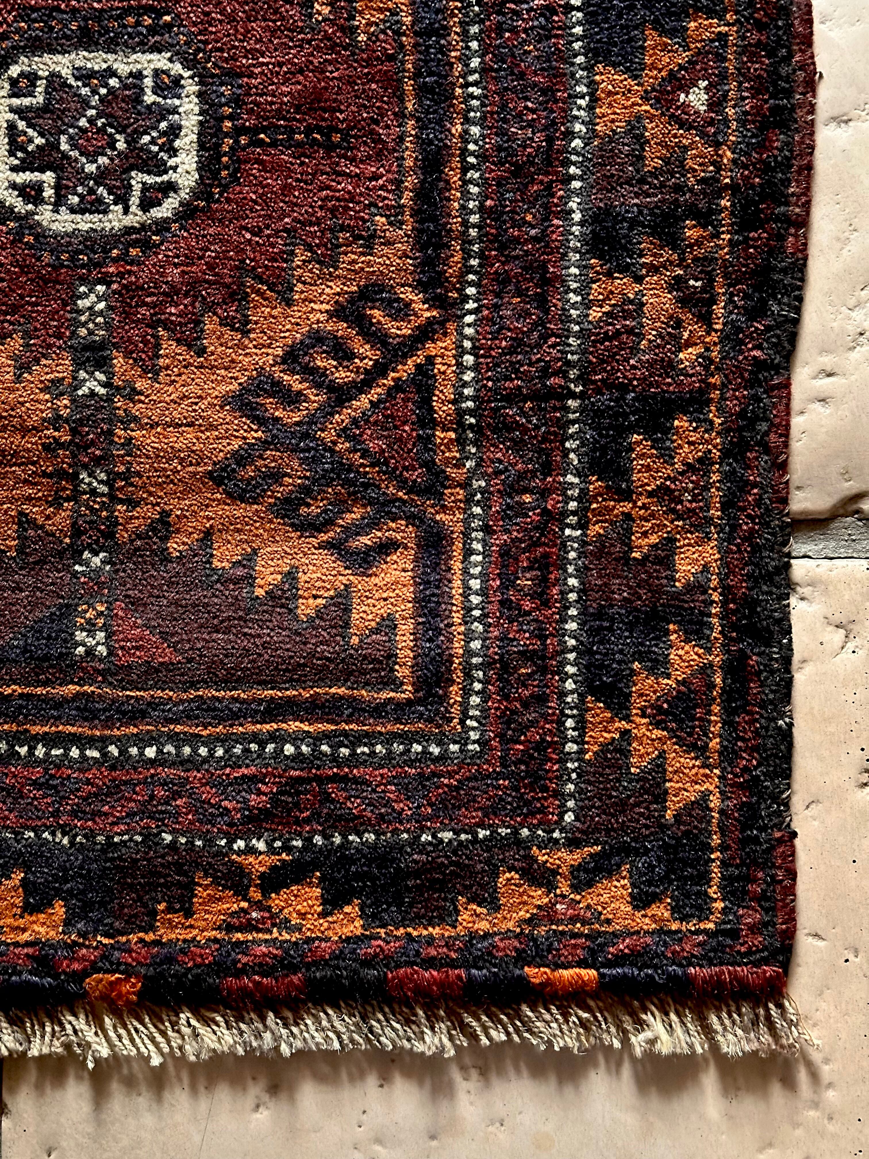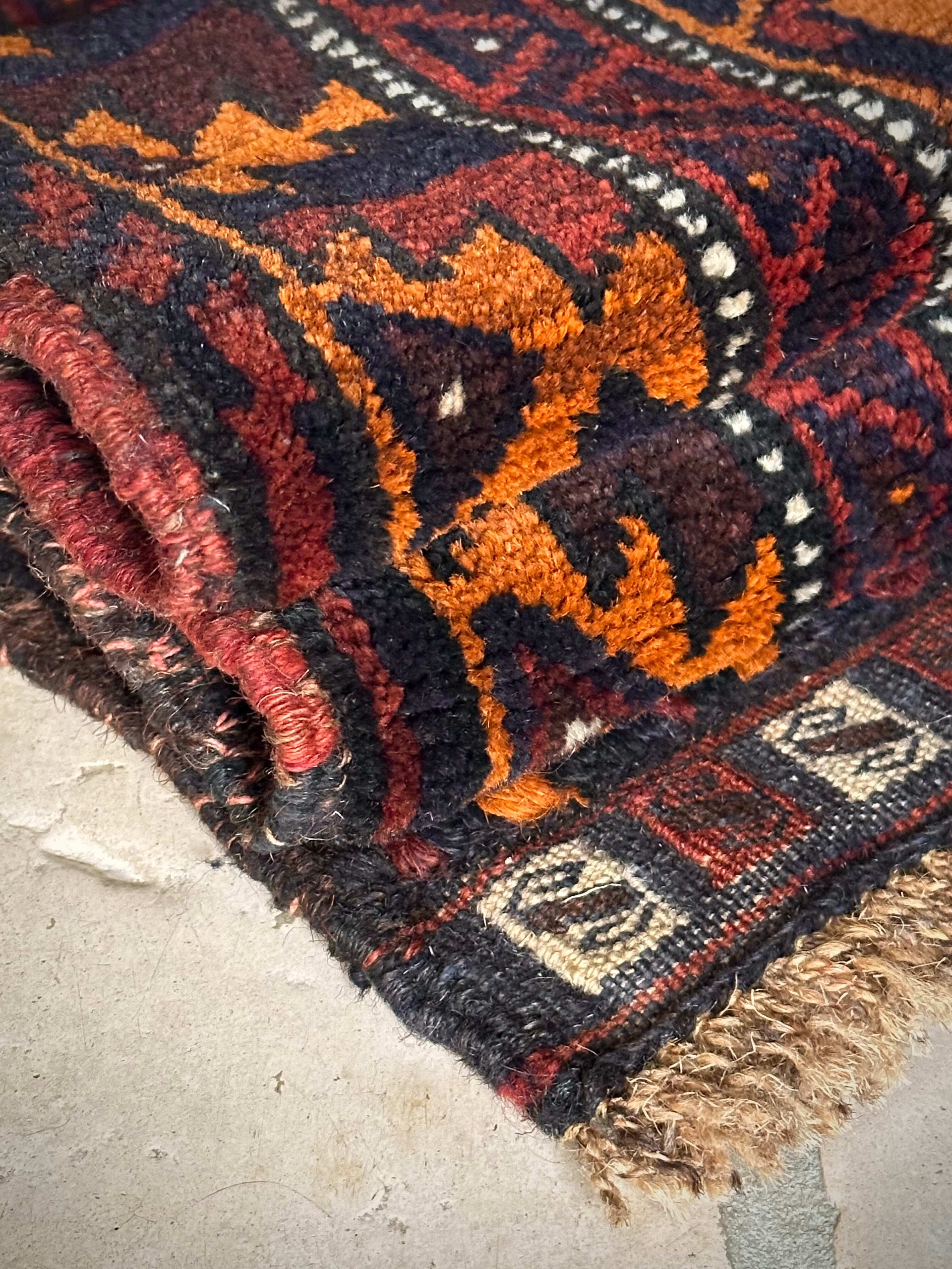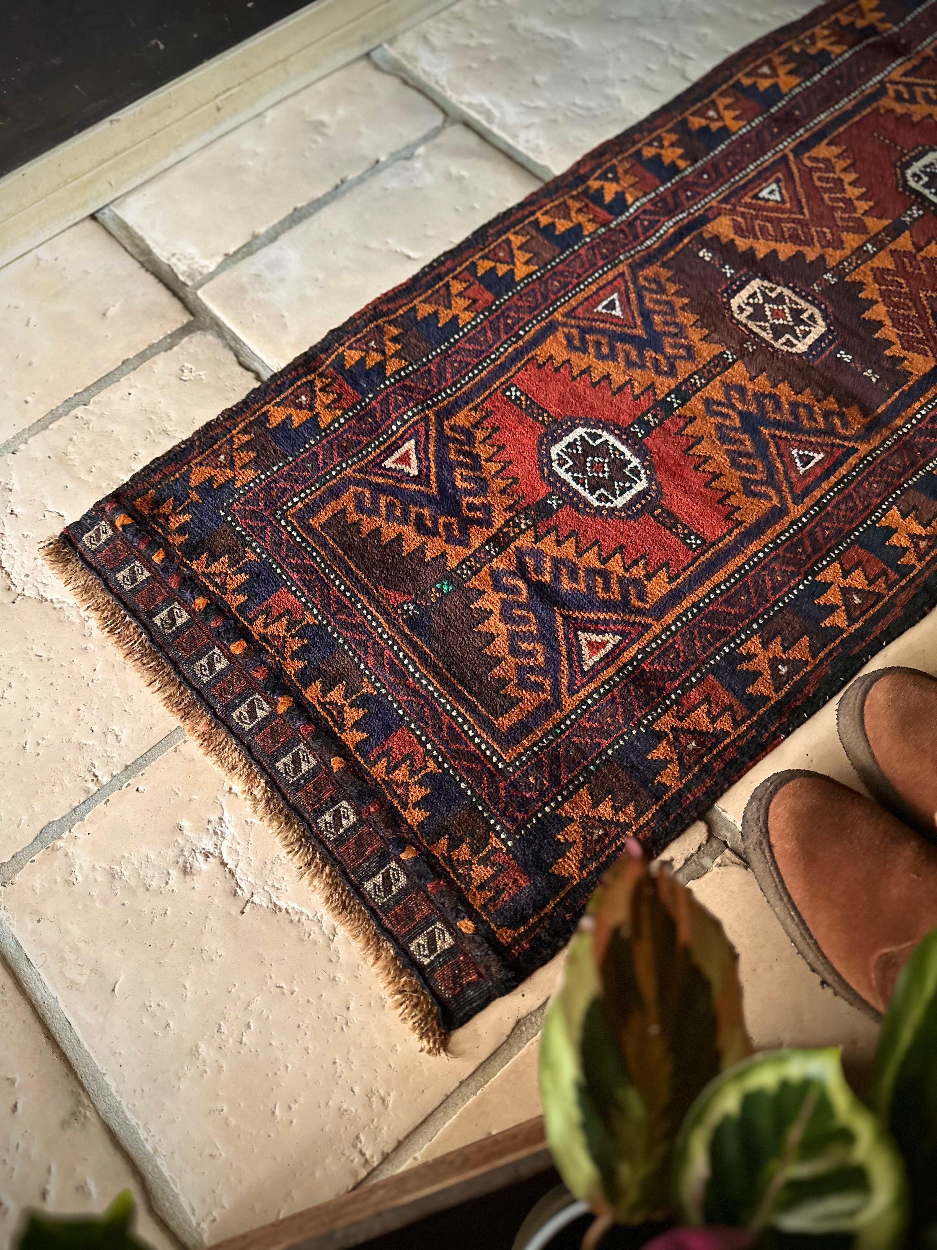 テラコッタと濃淡のあるブラウンで統一された暖色系の色合いが良い雰囲気のこちらは、アフガニスタンのヘラート州に居住するバルーチ族のトライバルラグで、元は家財道具を収納したりクッションとして使われるバーリシトと呼ばれる袋状の表皮をラグに仕立て直したモノになります。