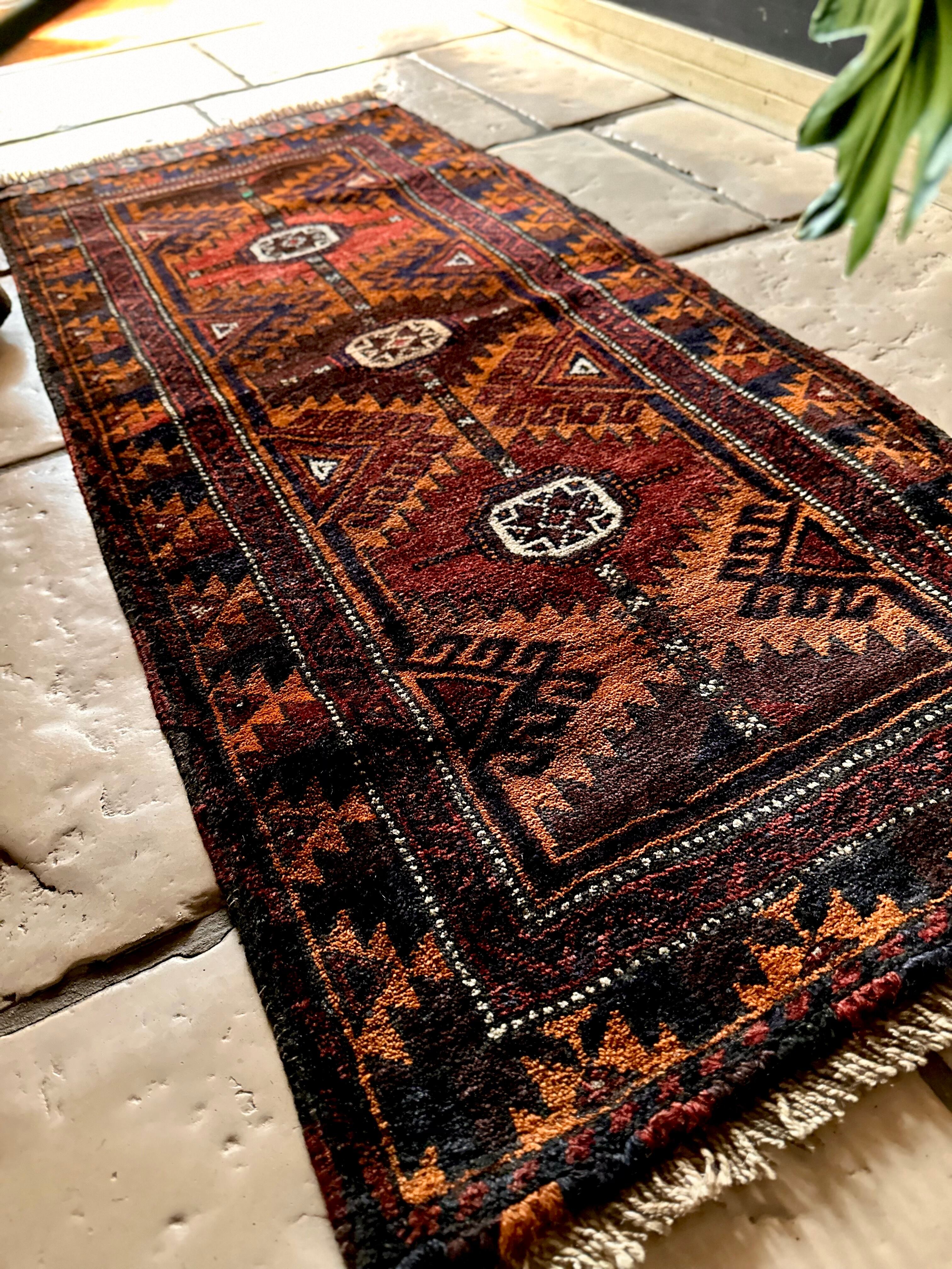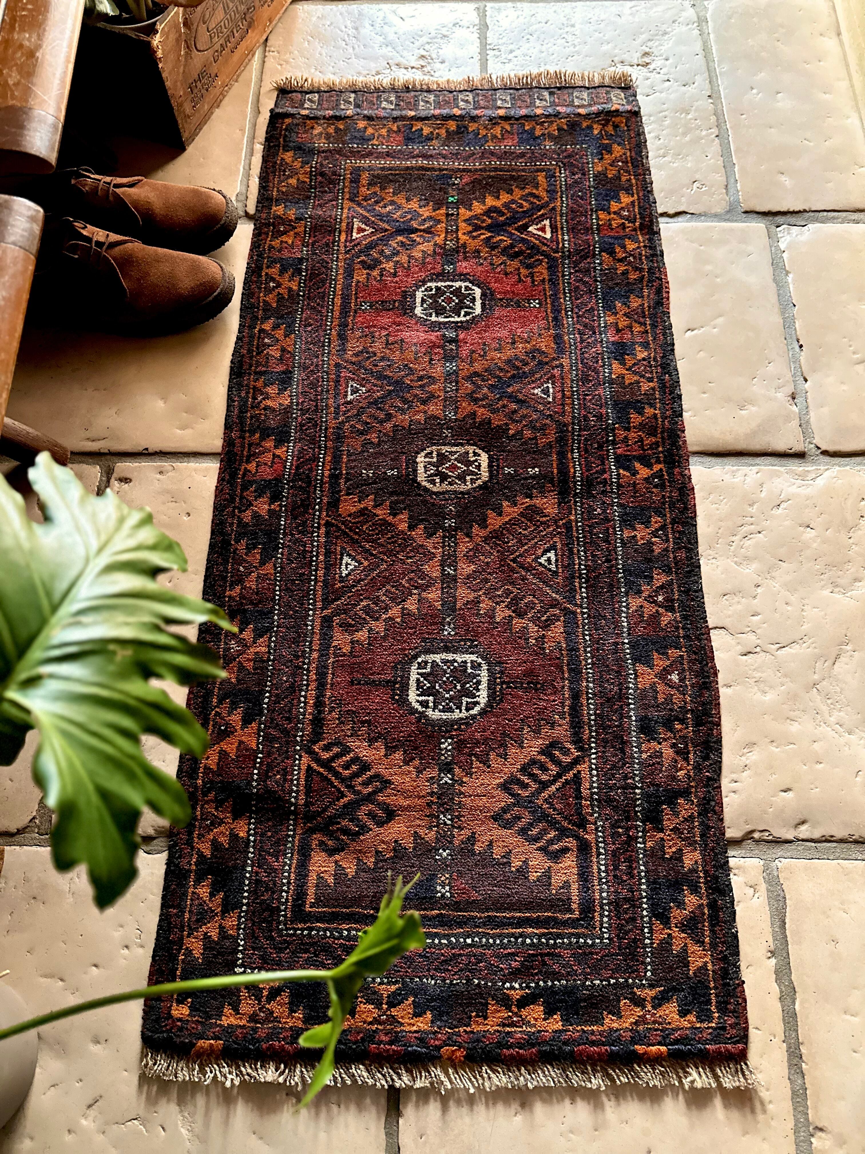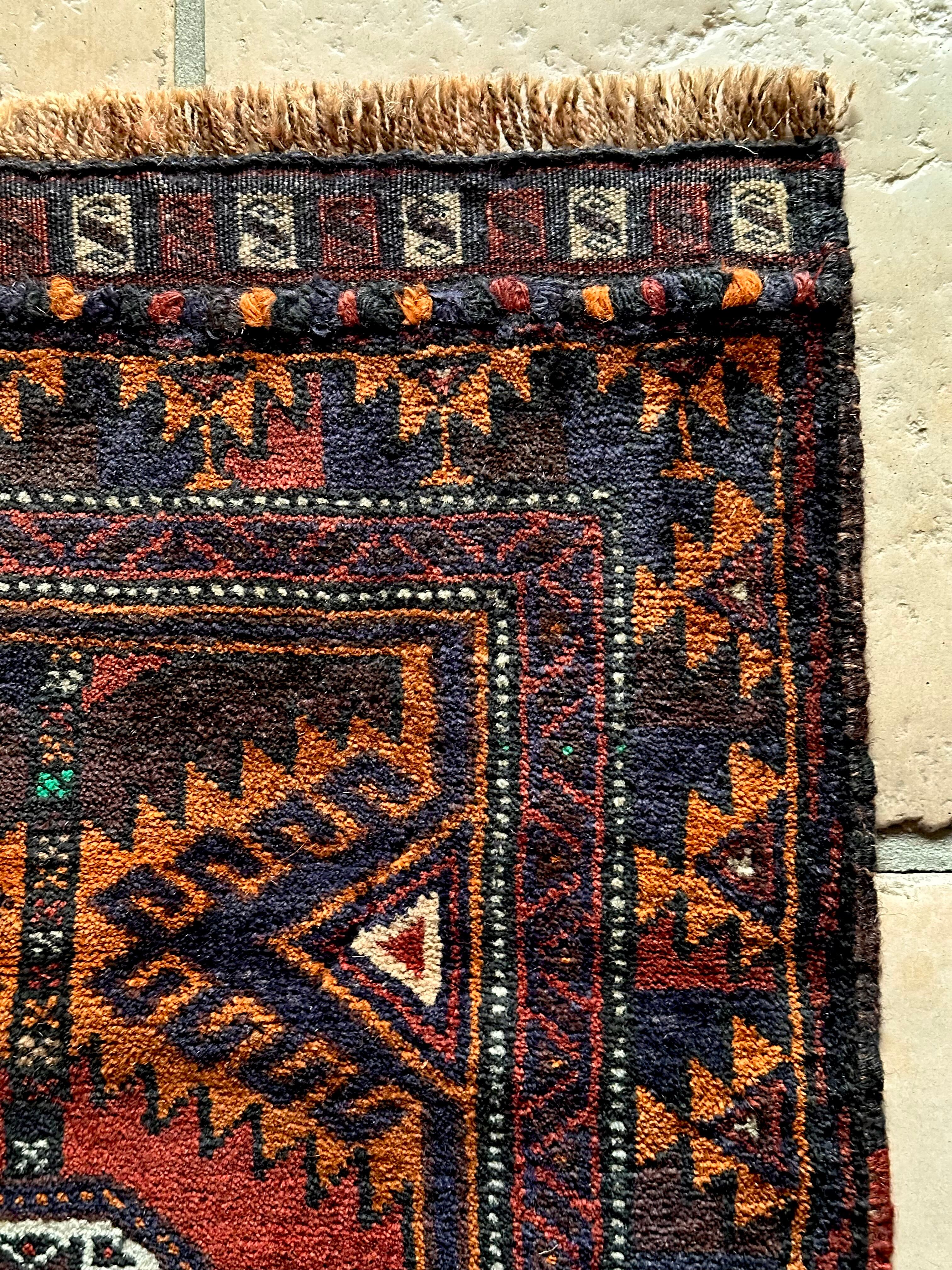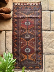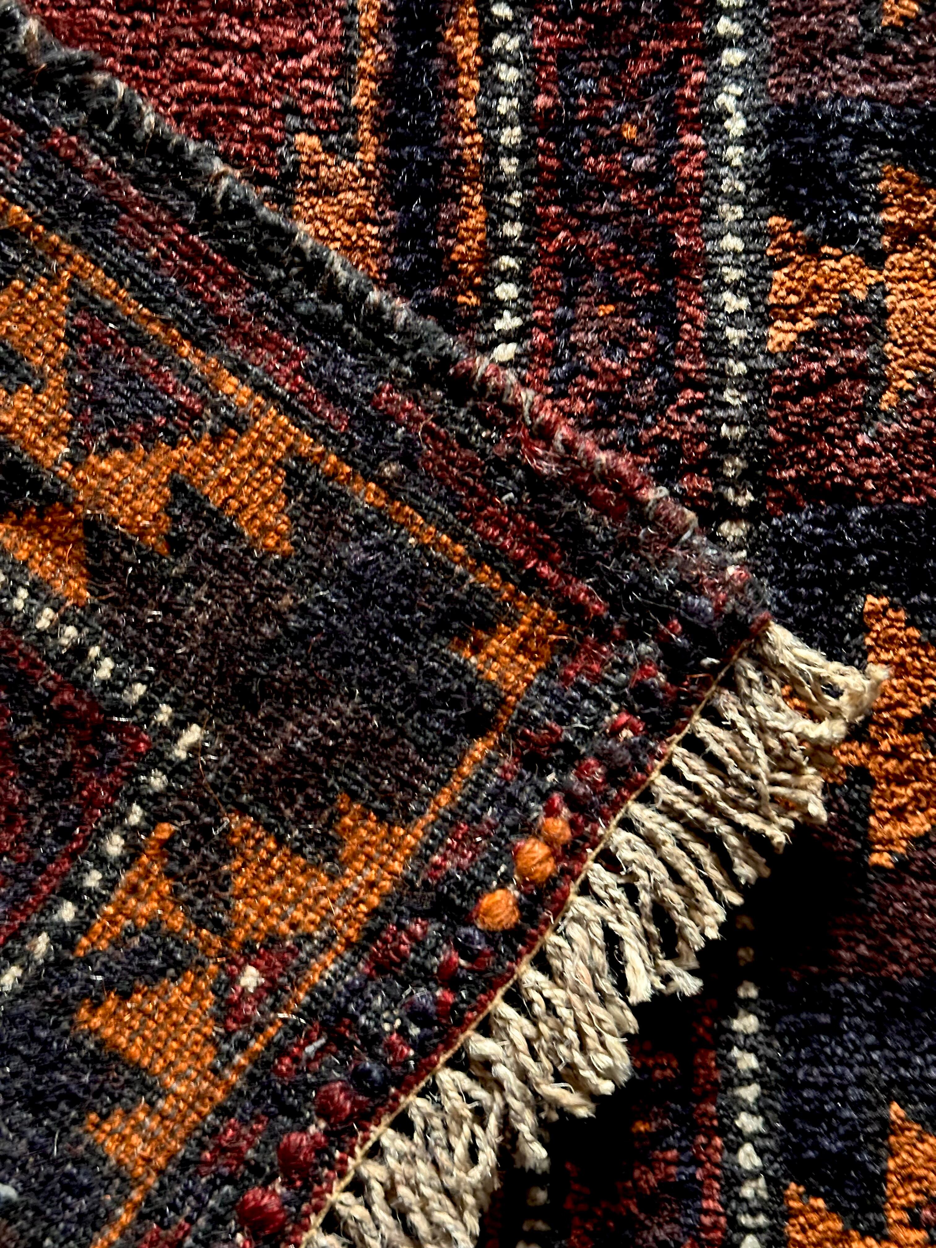 テラコッタと濃淡のあるブラウンで統一された暖色系の色合いが良い雰囲気のこちらは、アフガニスタンのヘラート州に居住するバルーチ族のトライバルラグで、元は家財道具を収納したりクッションとして使われるバーリシトと呼ばれる袋状の表皮をラグに仕立て直したモノになります。