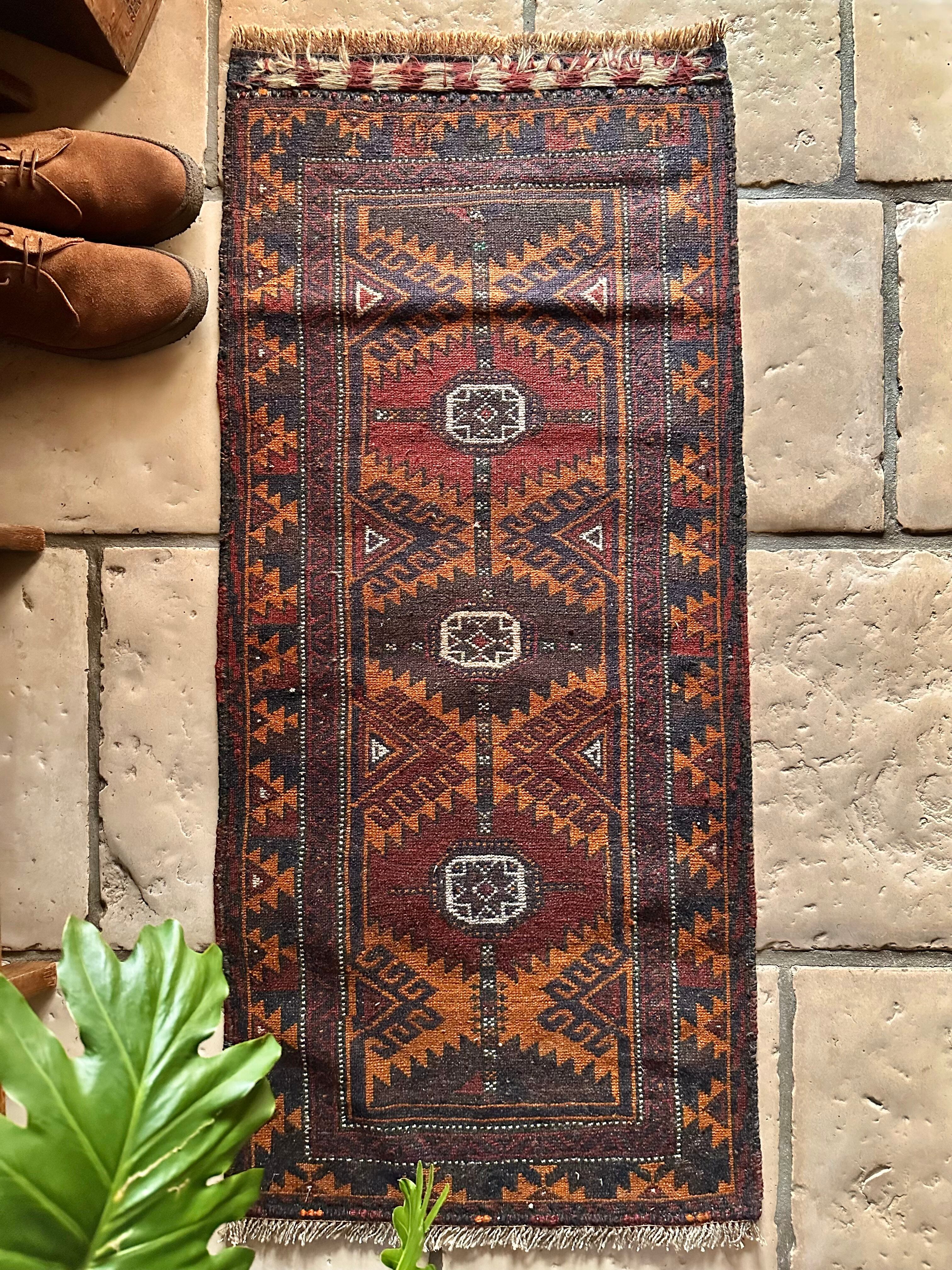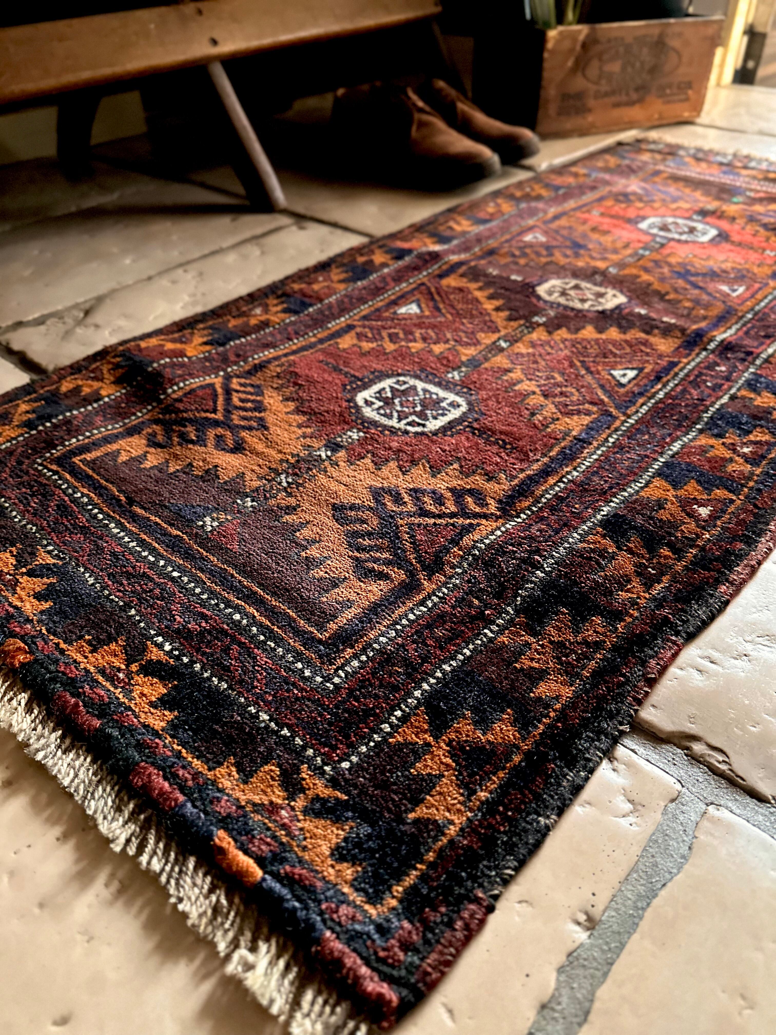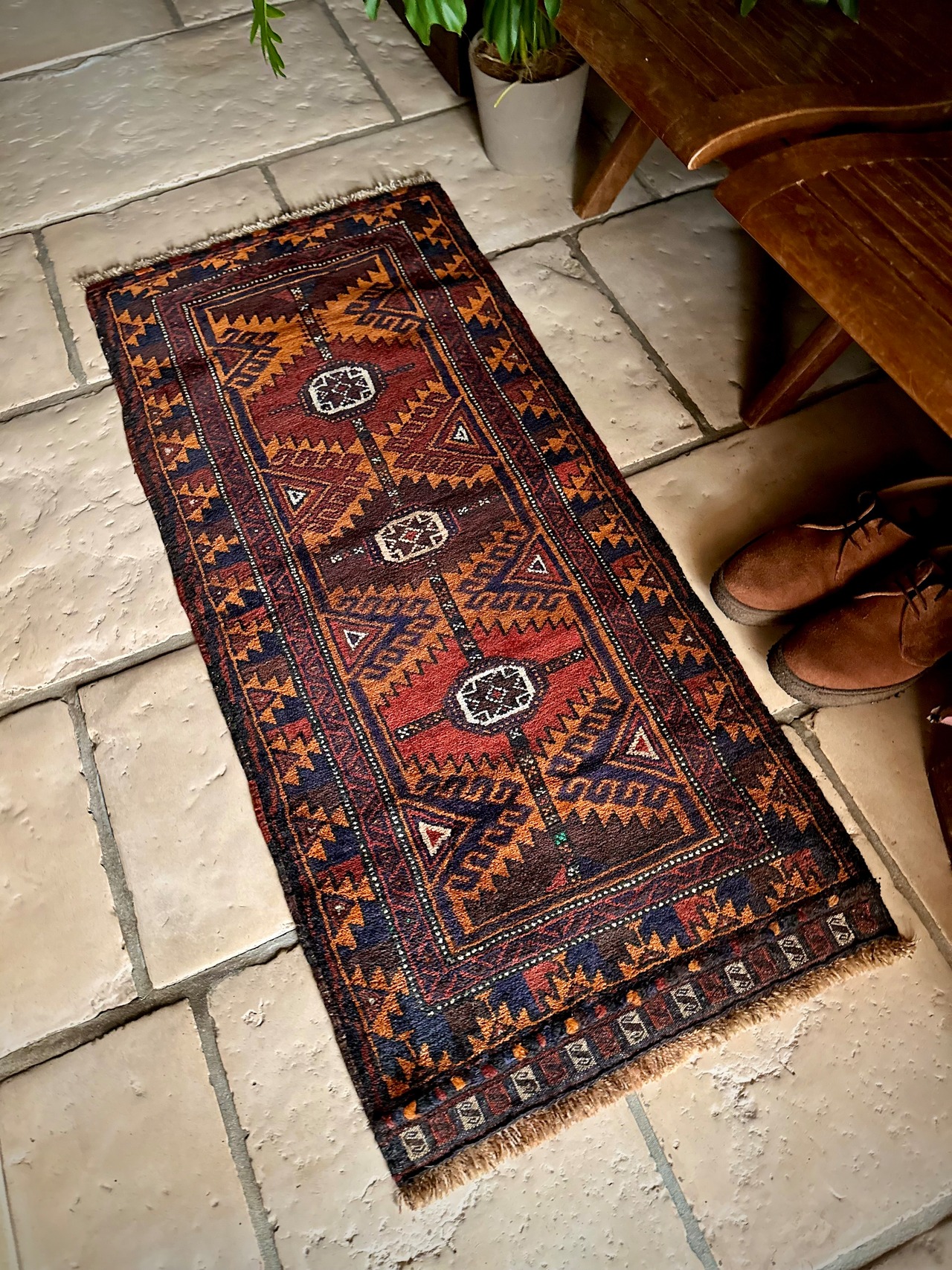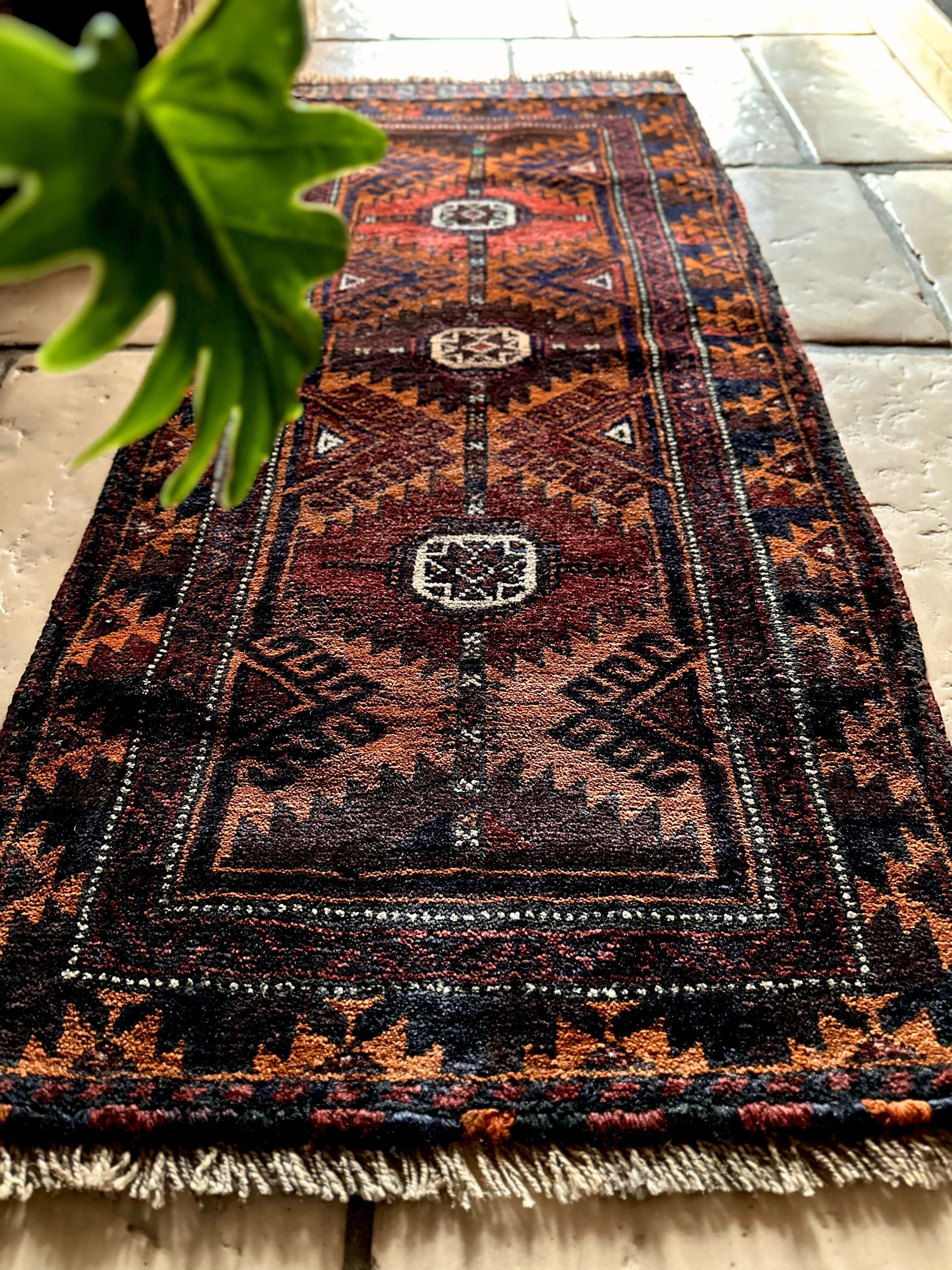 テラコッタと濃淡のあるブラウンで統一された暖色系の色合いが良い雰囲気のこちらは、アフガニスタンのヘラート州に居住するバルーチ族のトライバルラグで、元は家財道具を収納したりクッションとして使われるバーリシトと呼ばれる袋状の表皮をラグに仕立て直したモノになります。