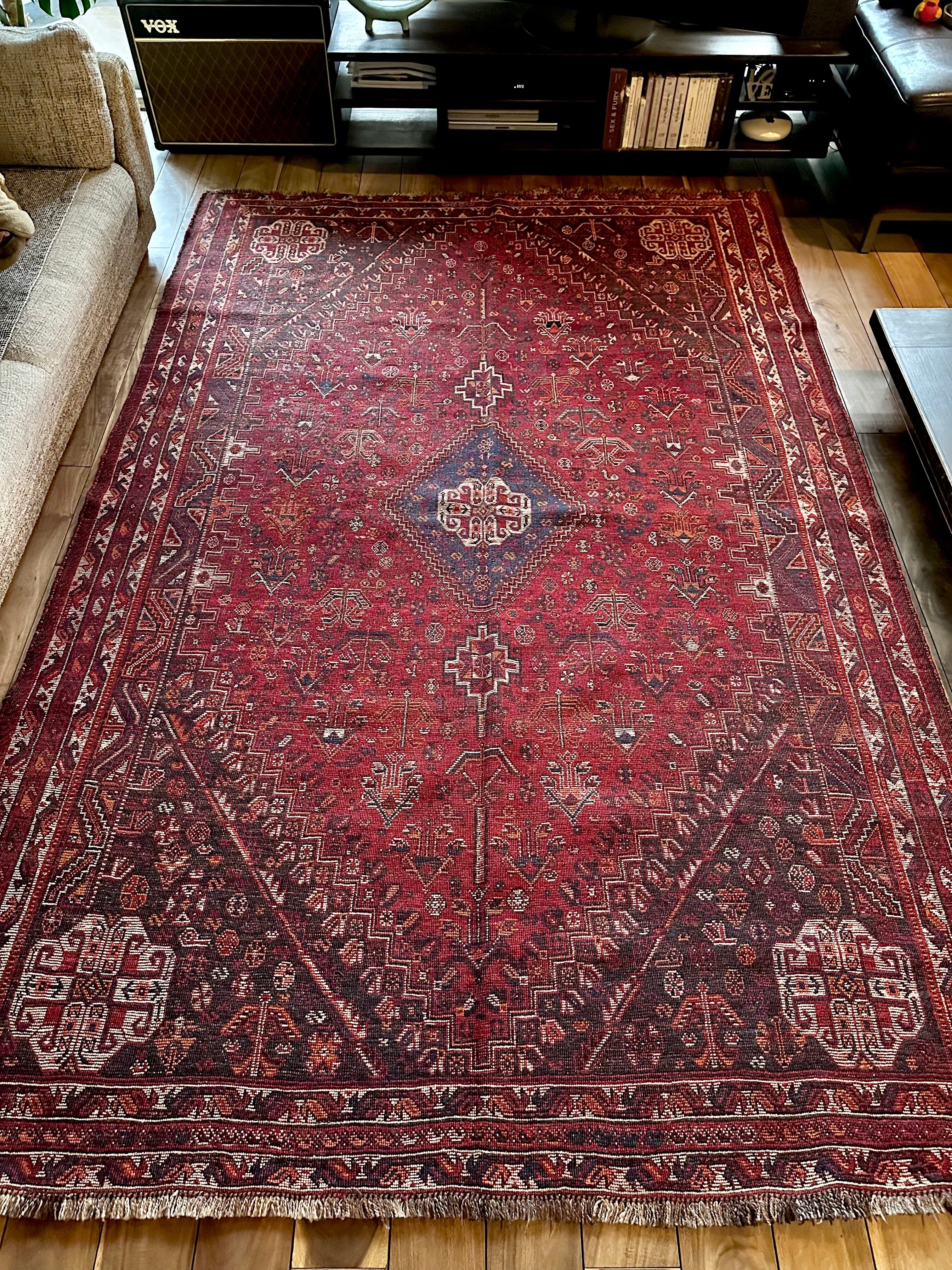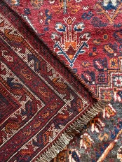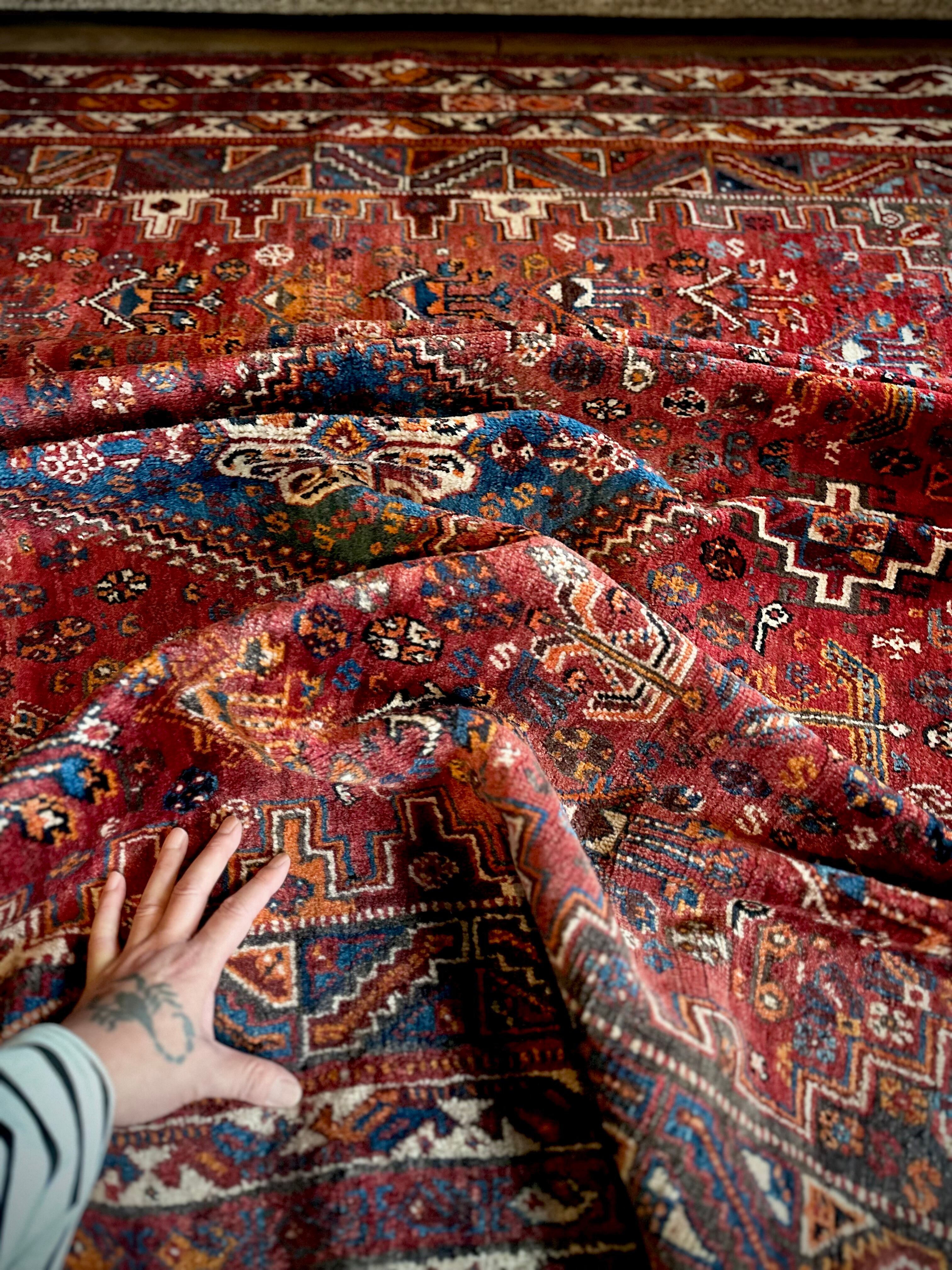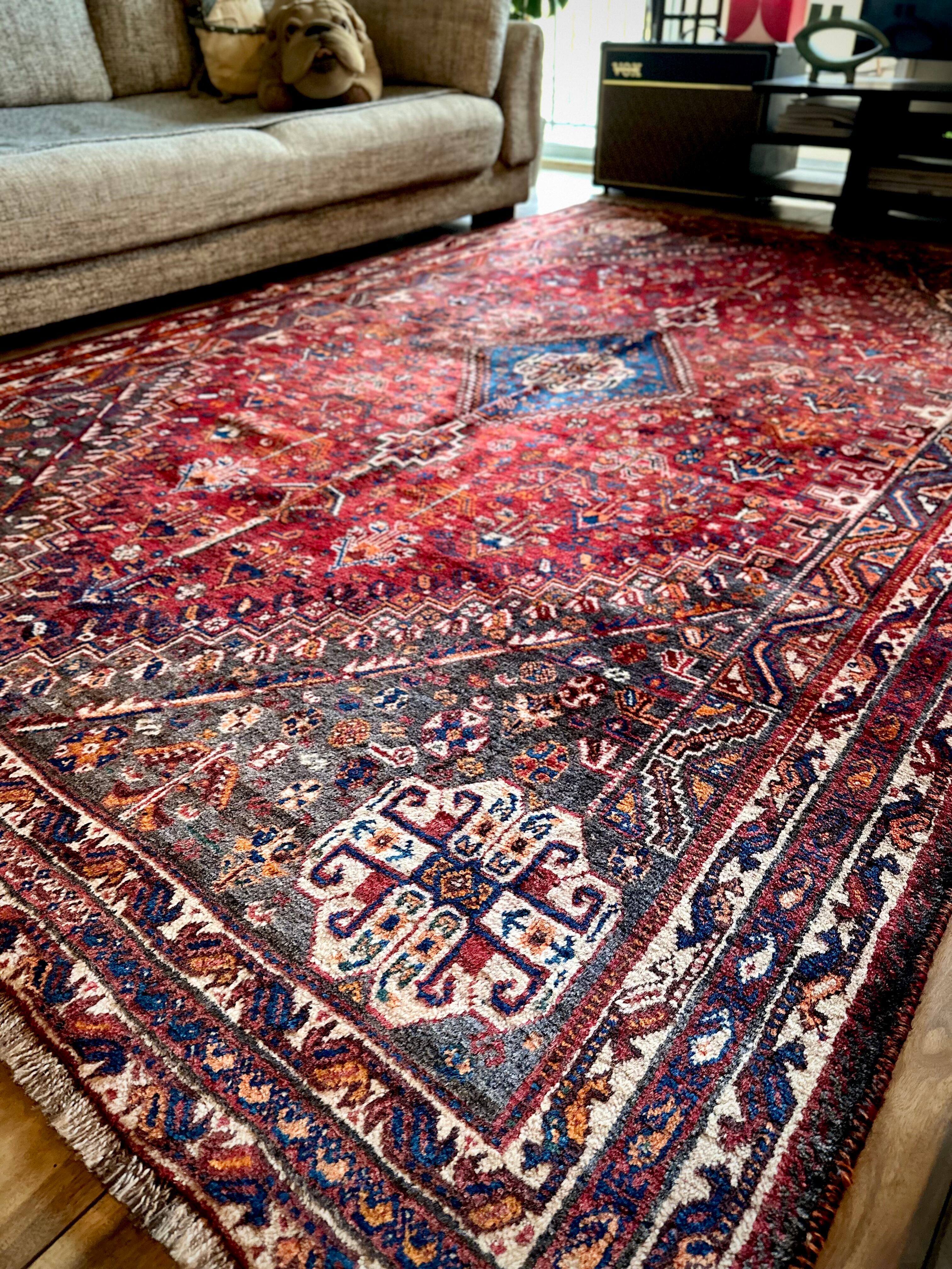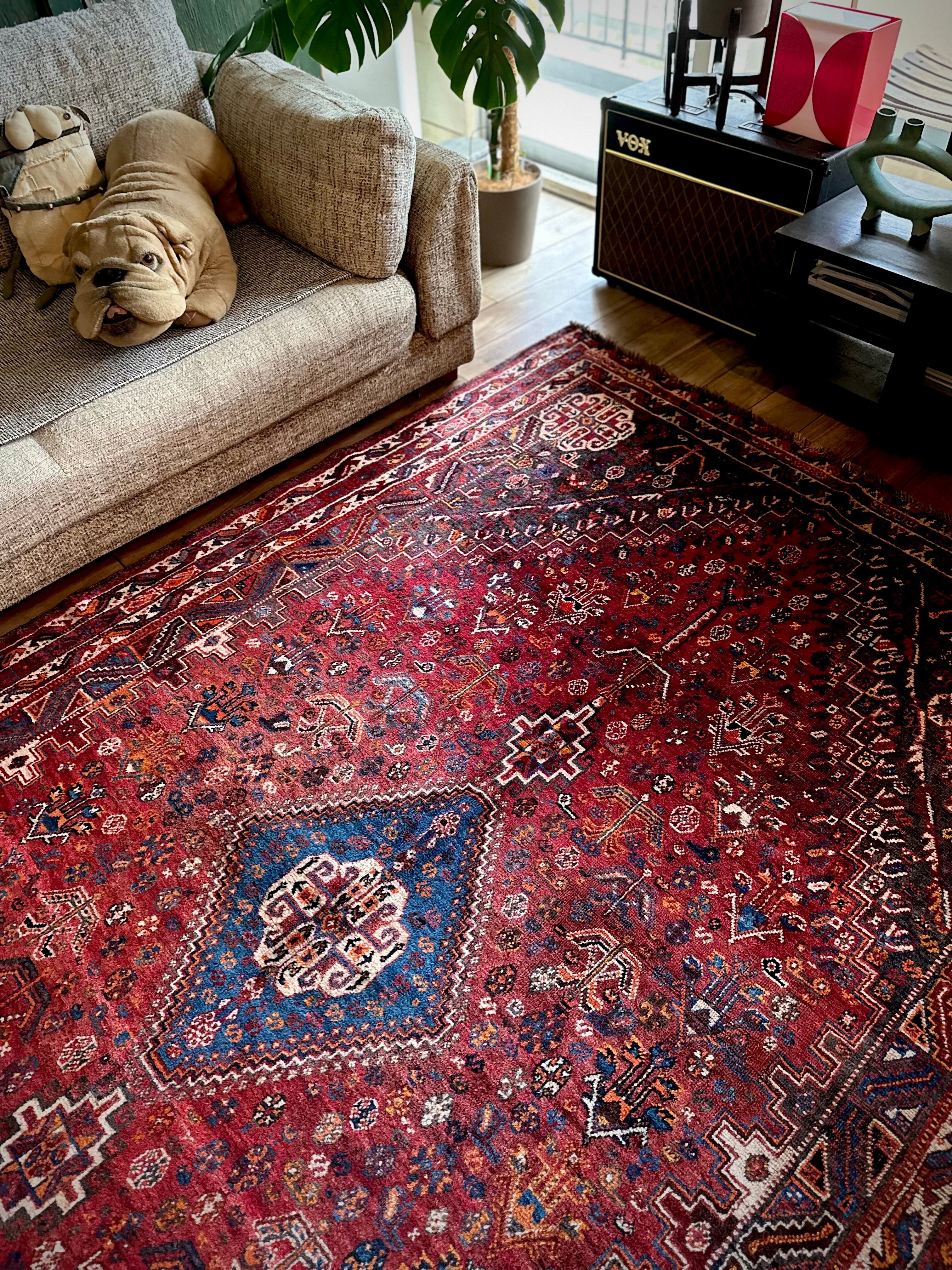 真紅のフィールドに褪せたネイビーのコーナー部、そこに鮮やかなブルーのメダリオンが映えるこちらは、イラン南部にあるシラーズ周辺に居住するカシュガイ族のトライバルラグで、見た目にもリビングを覆い尽くすほどの大判サイズの1枚になります。