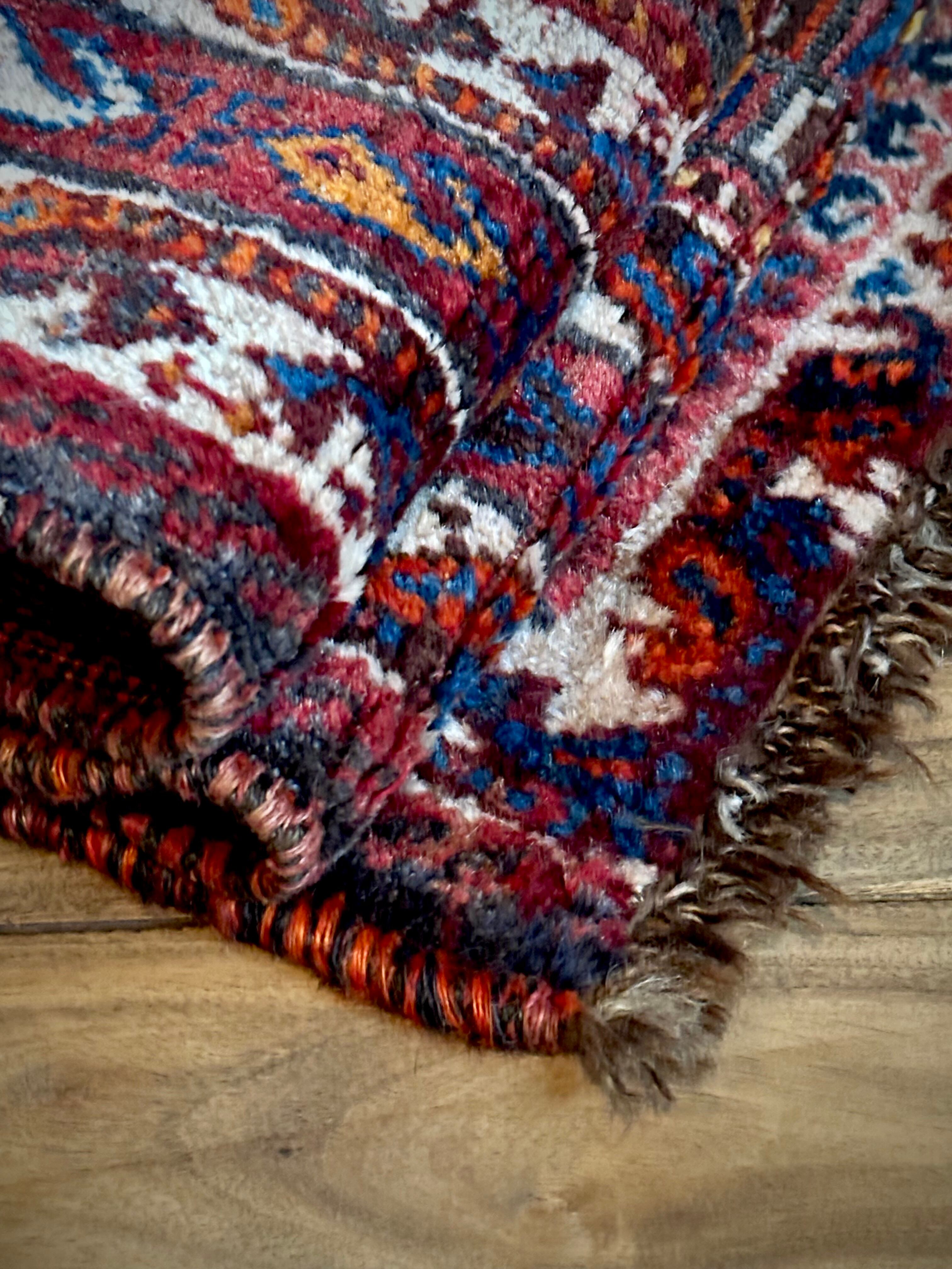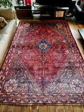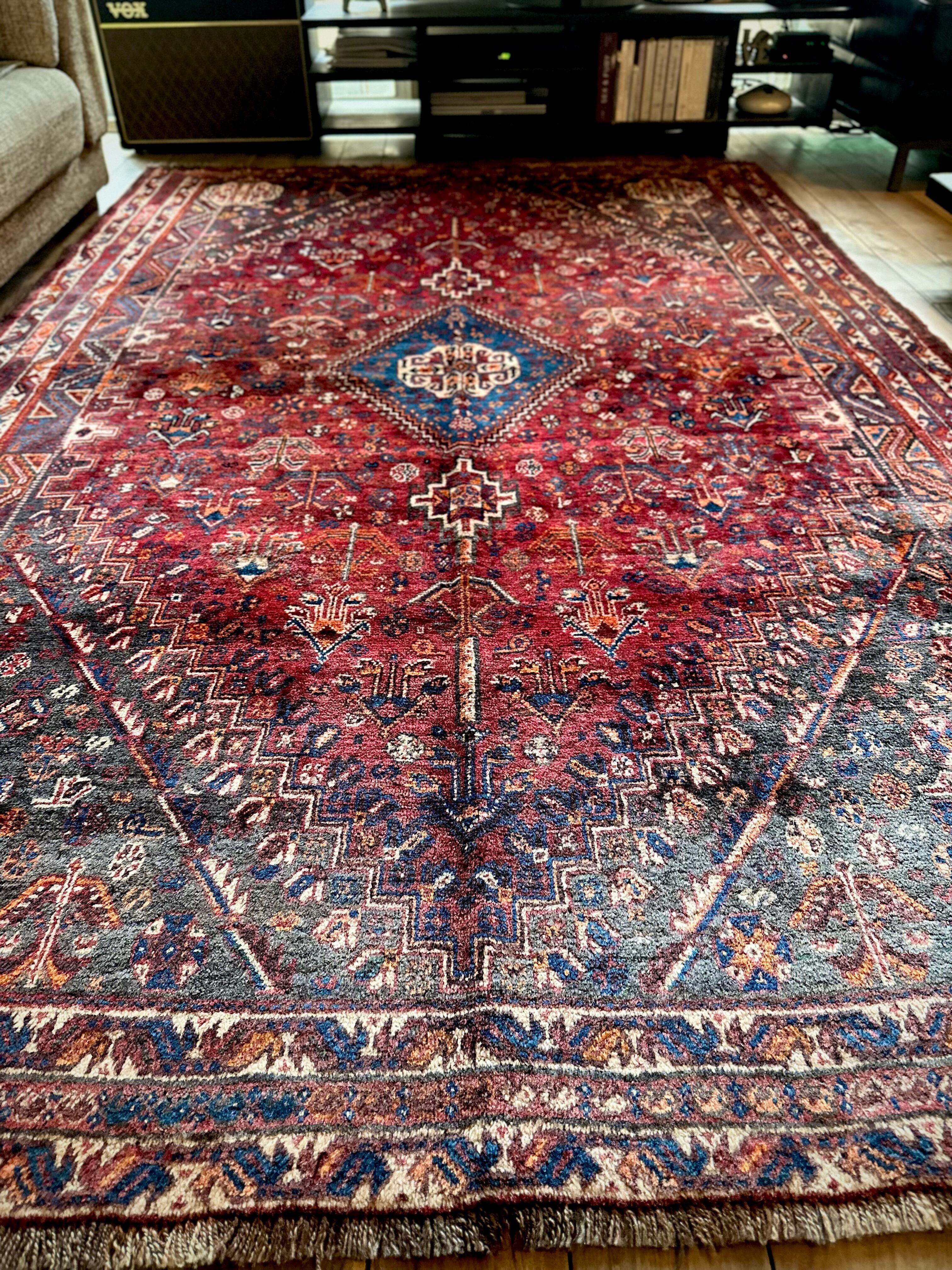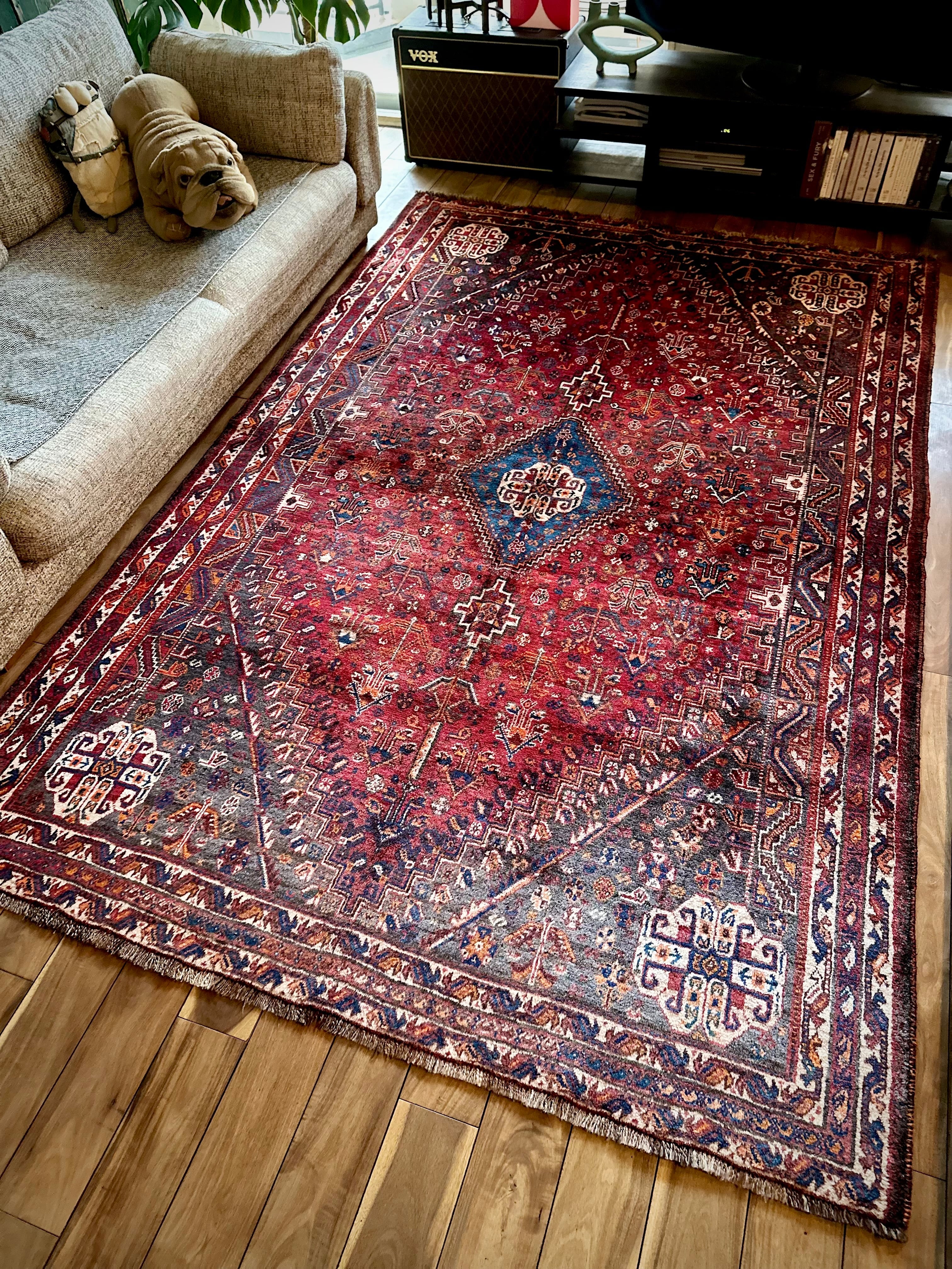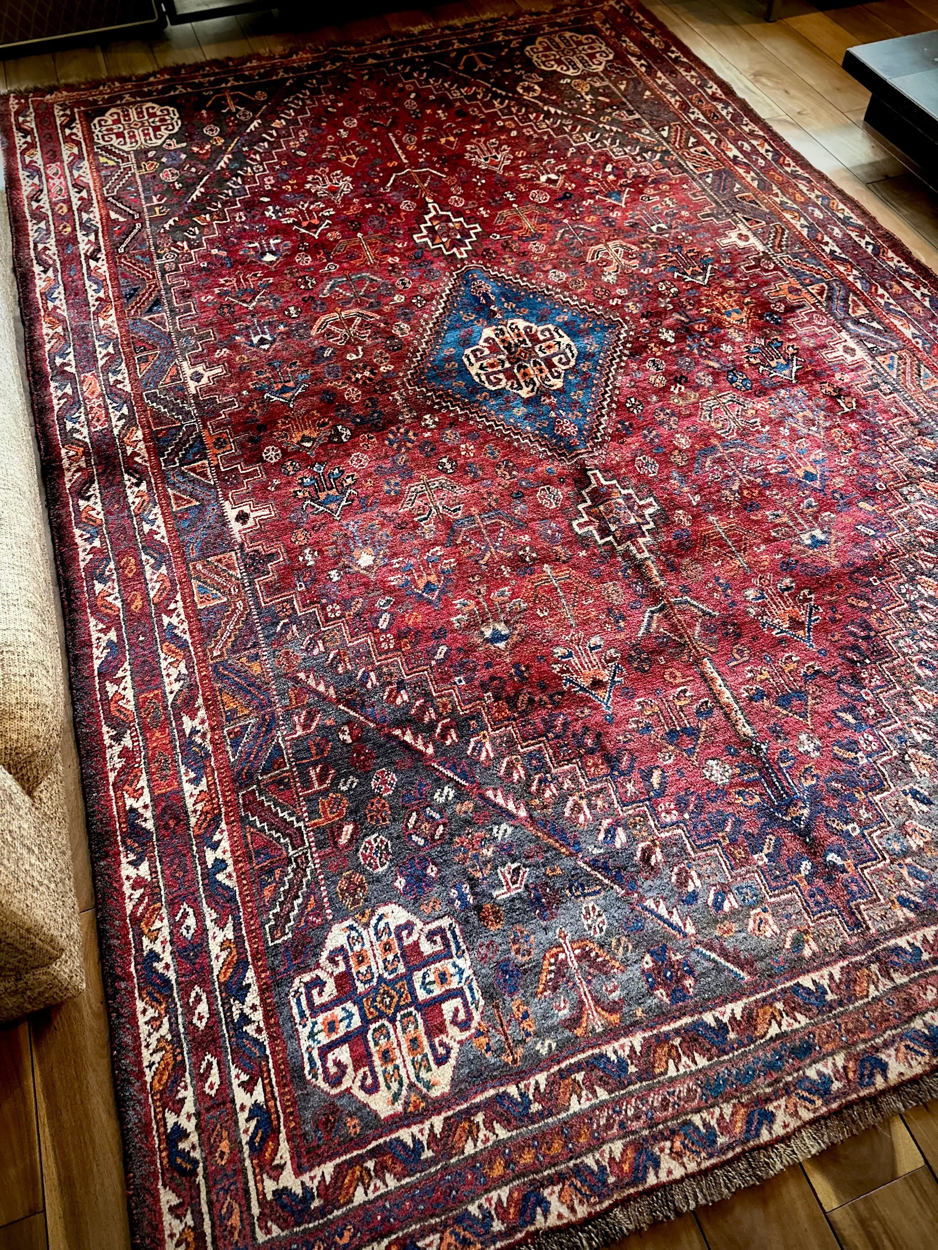真紅のフィールドに褪せたネイビーのコーナー部、そこに鮮やかなブルーのメダリオンが映えるこちらは、イラン南部にあるシラーズ周辺に居住するカシュガイ族のトライバルラグで、見た目にもリビングを覆い尽くすほどの大判サイズの1枚になります。