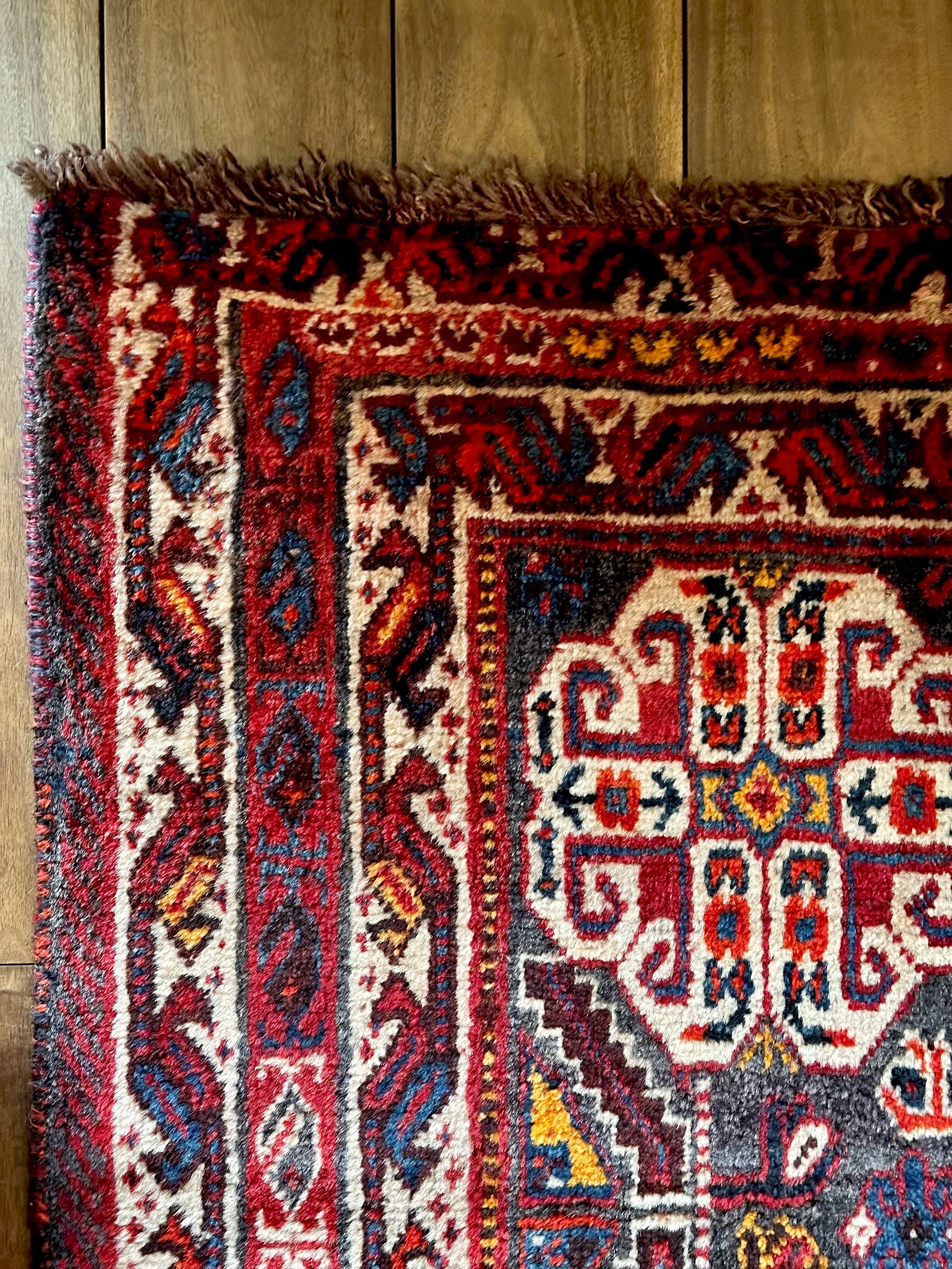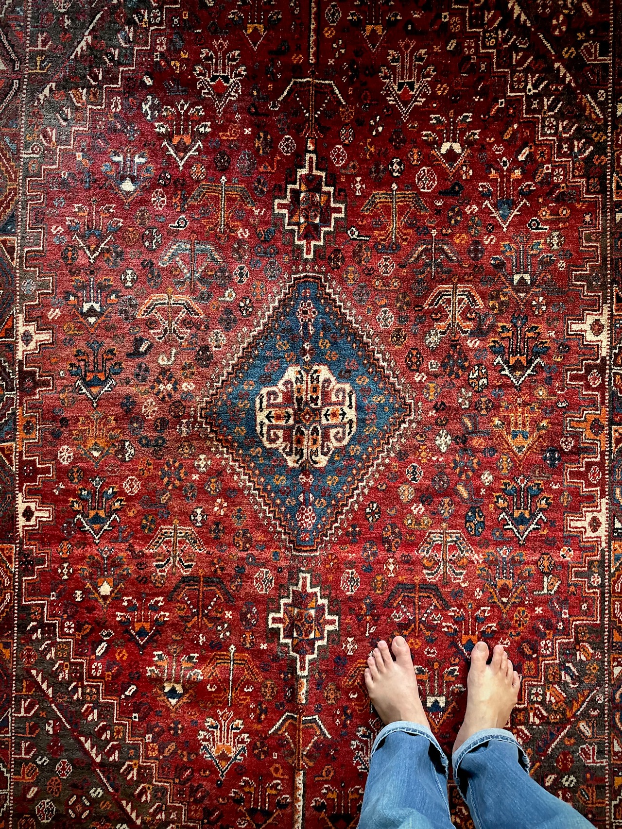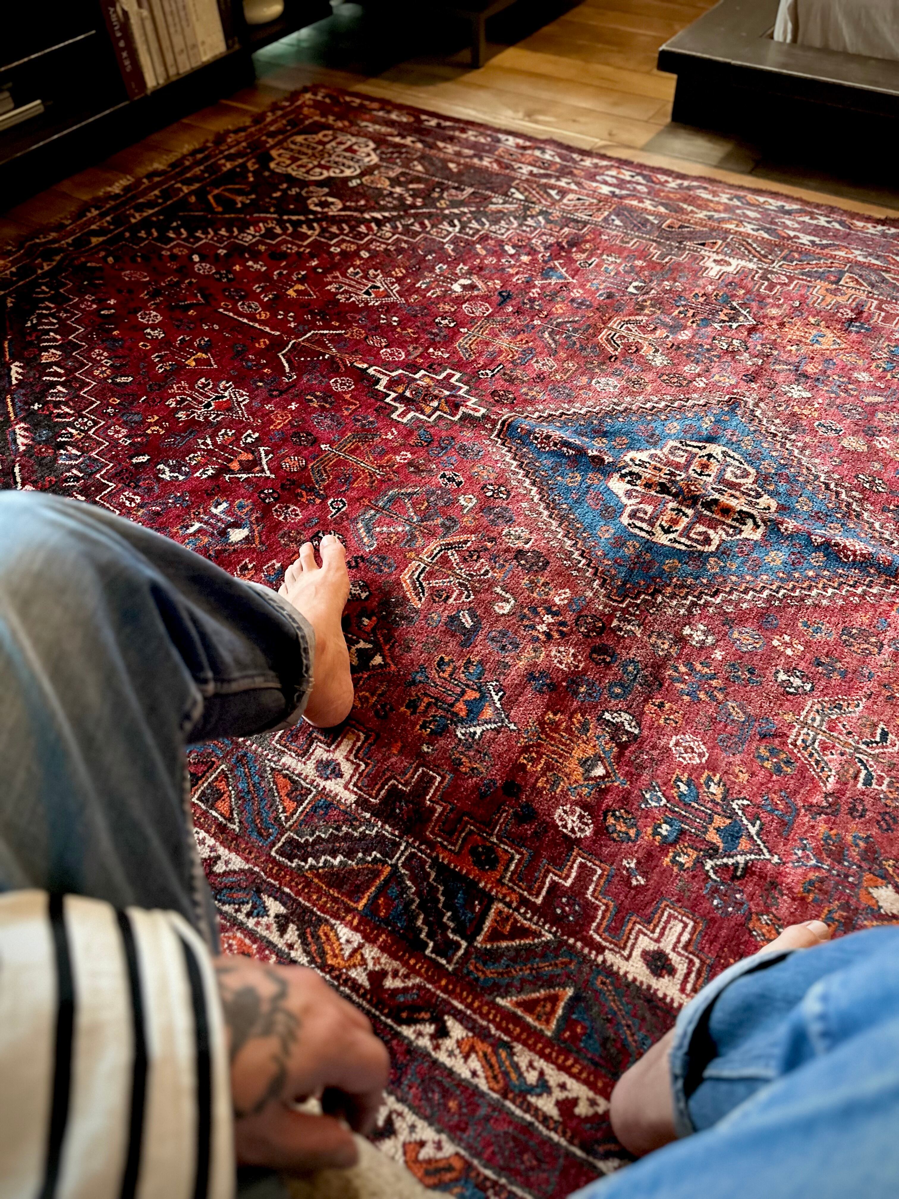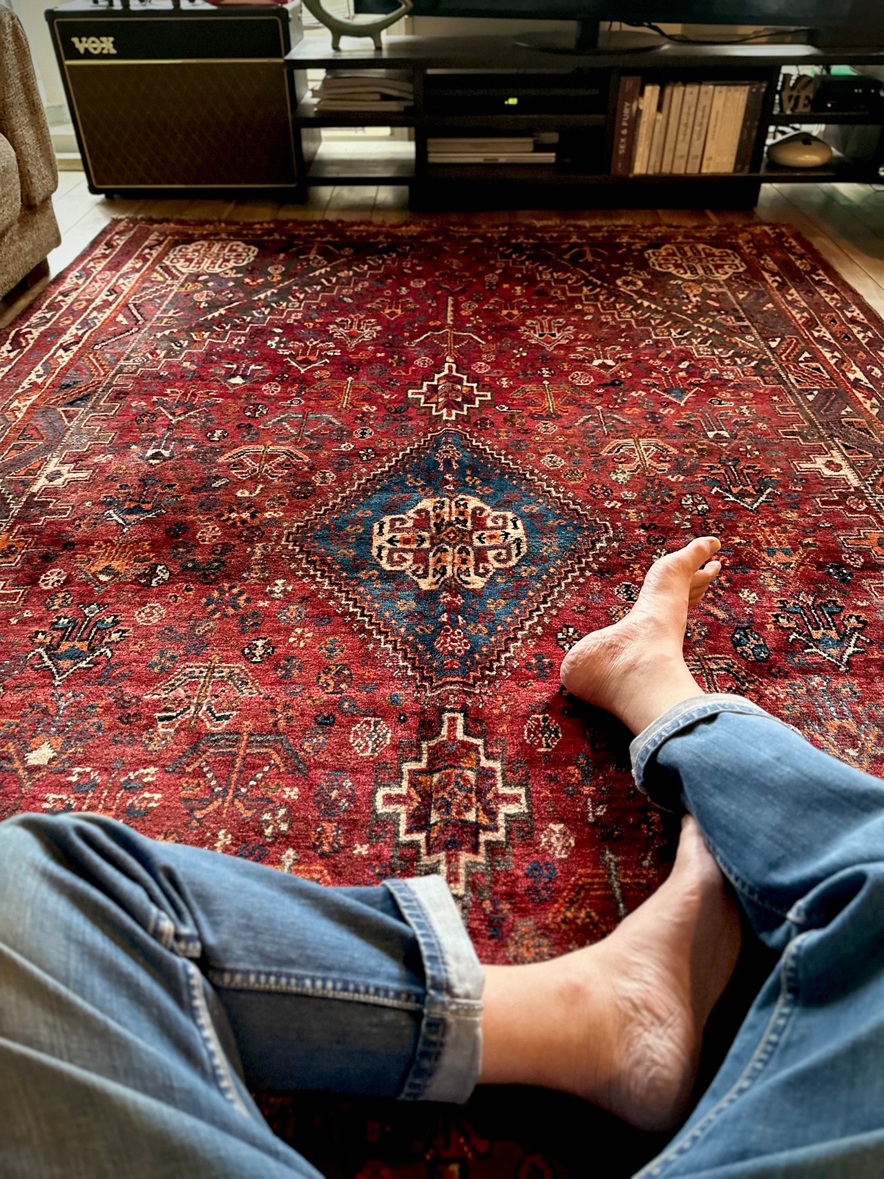 真紅のフィールドに褪せたネイビーのコーナー部、そこに鮮やかなブルーのメダリオンが映えるこちらは、イラン南部にあるシラーズ周辺に居住するカシュガイ族のトライバルラグで、見た目にもリビングを覆い尽くすほどの大判サイズの1枚になります。