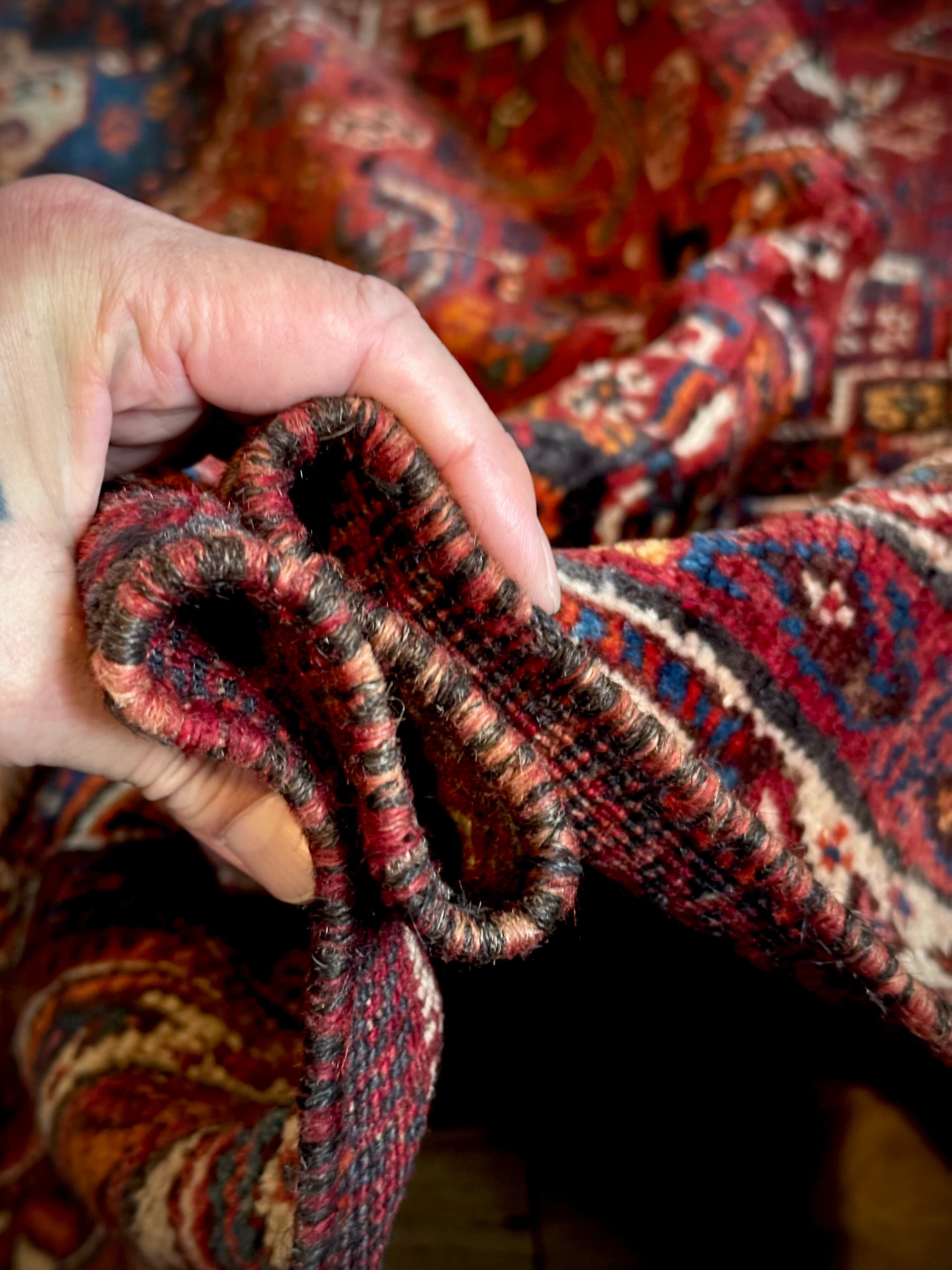 まるで宝石箱をひっくり返したような賑やかで鮮やかなカシュガイ族ならではの絵柄でしょうか。細かく散りばめられた紋様のひとつひとつが見ていて楽しく、色使いの優れたセンスにも魅了されることでしょう。