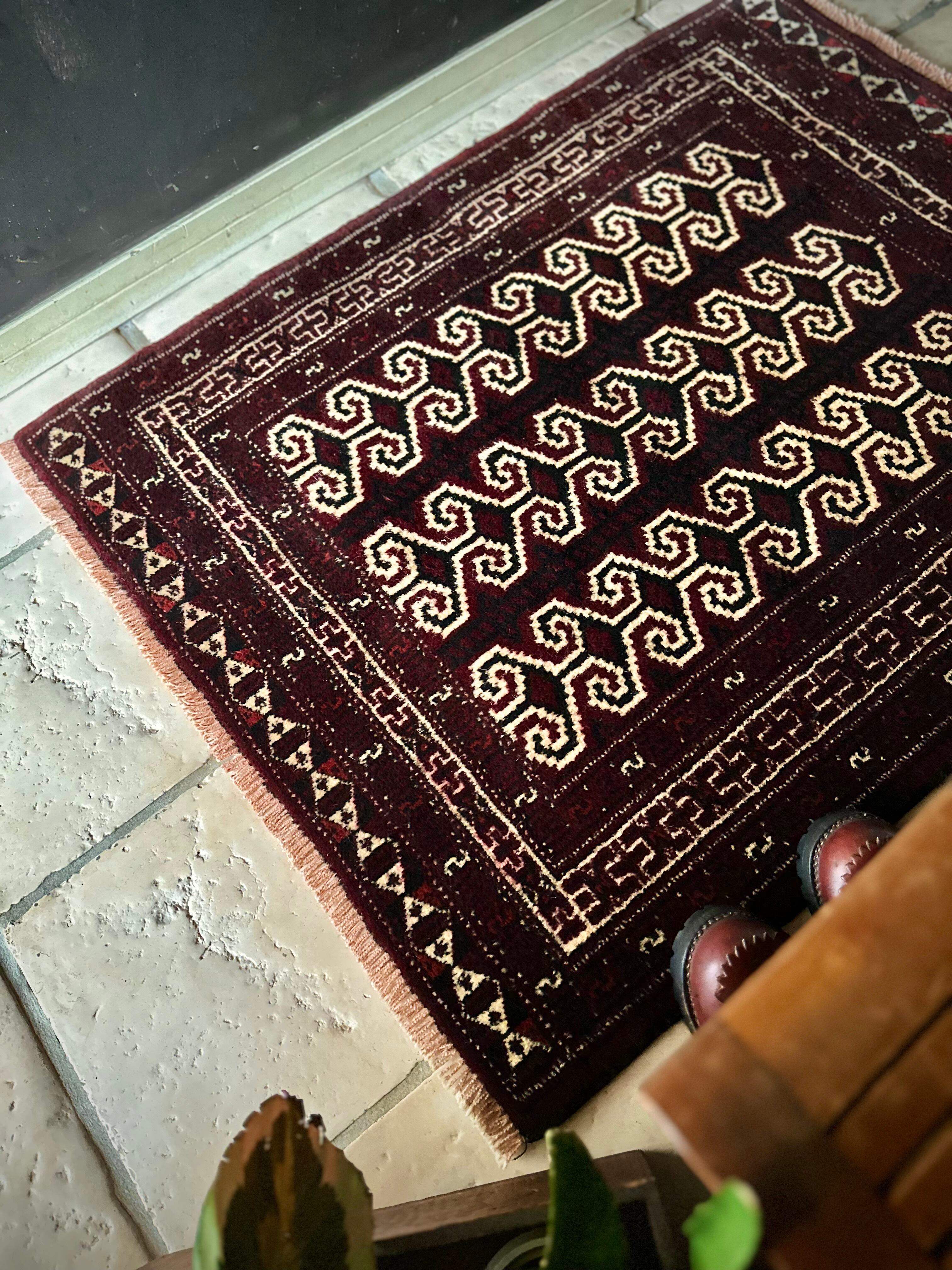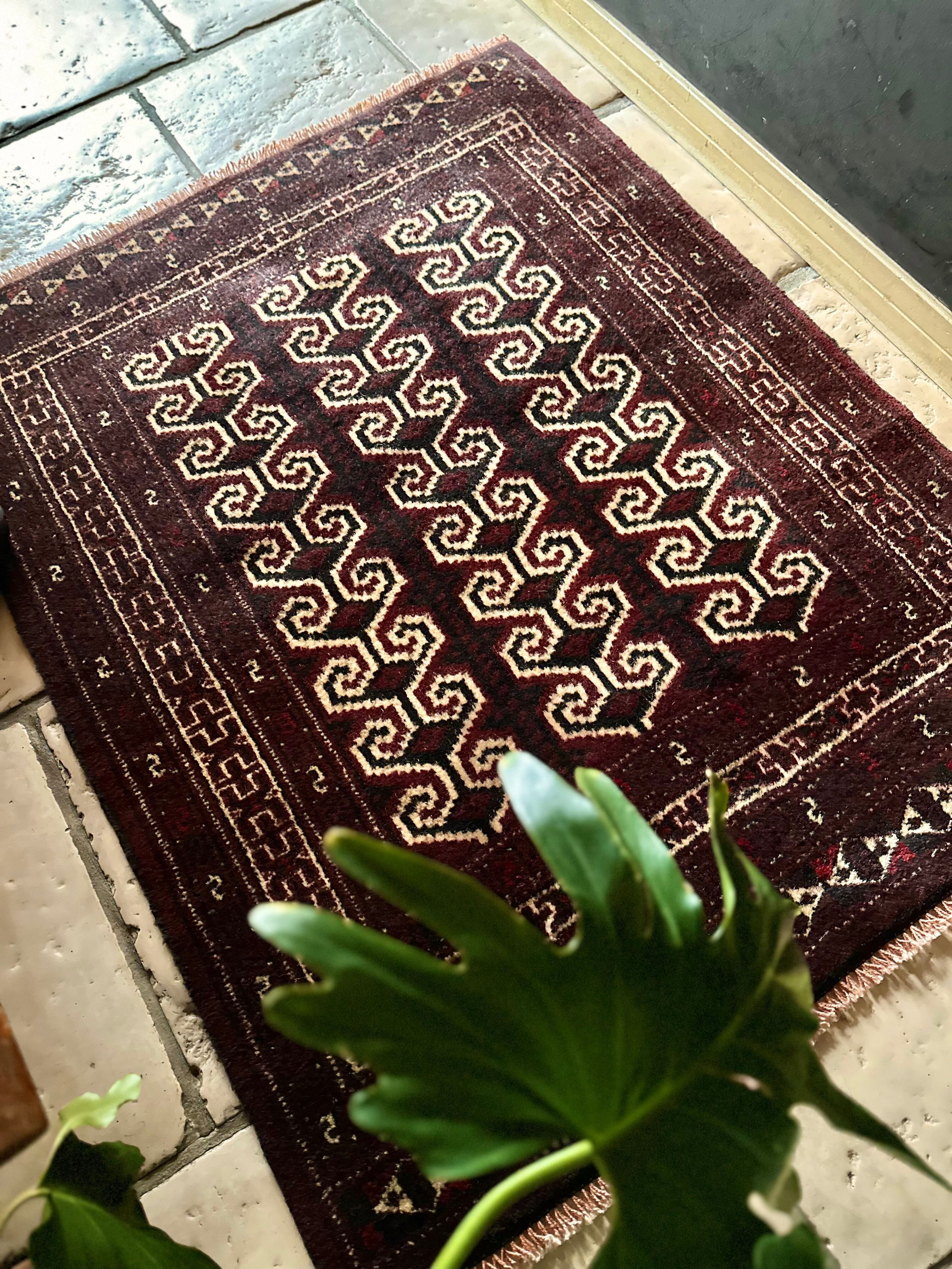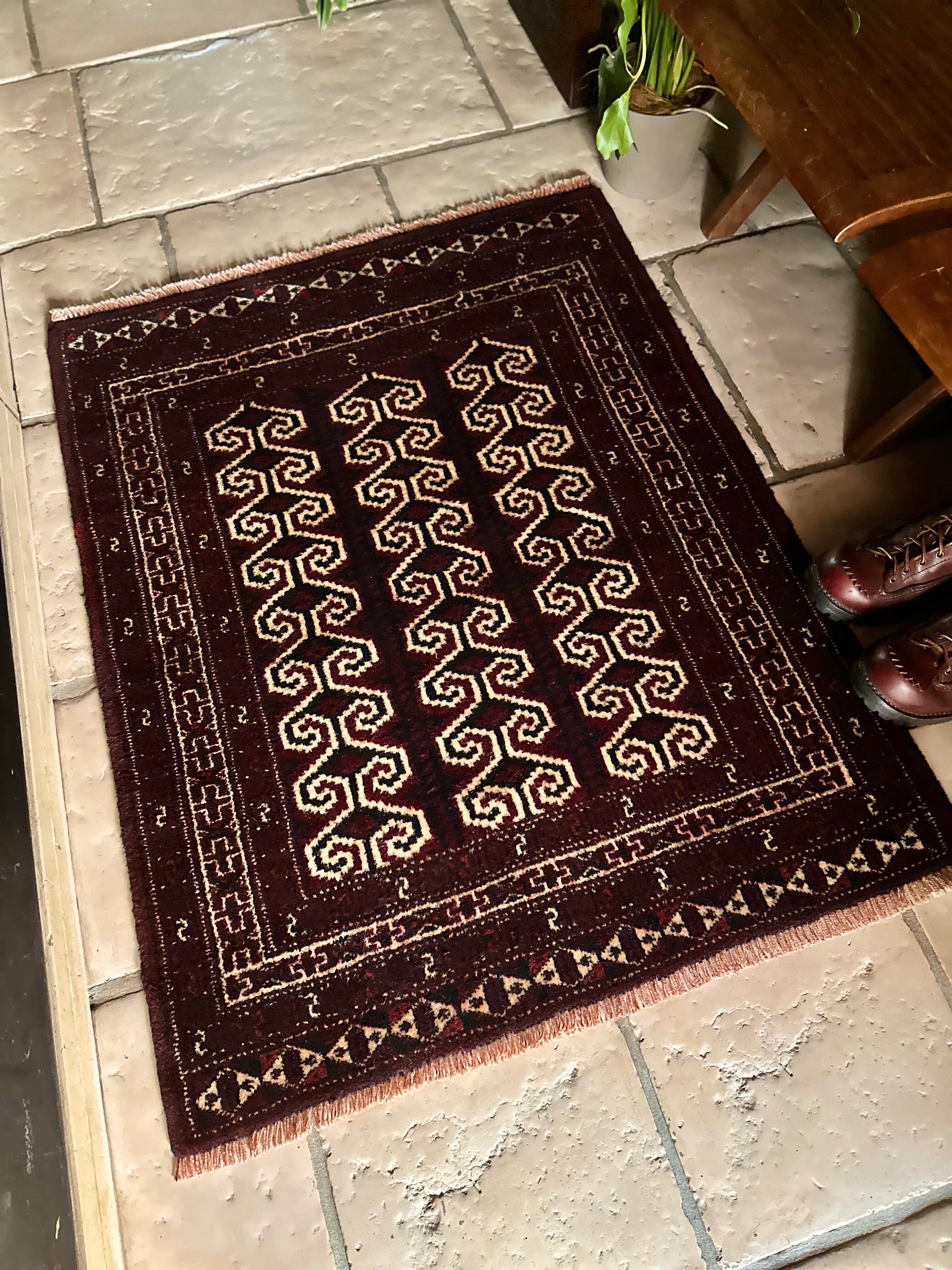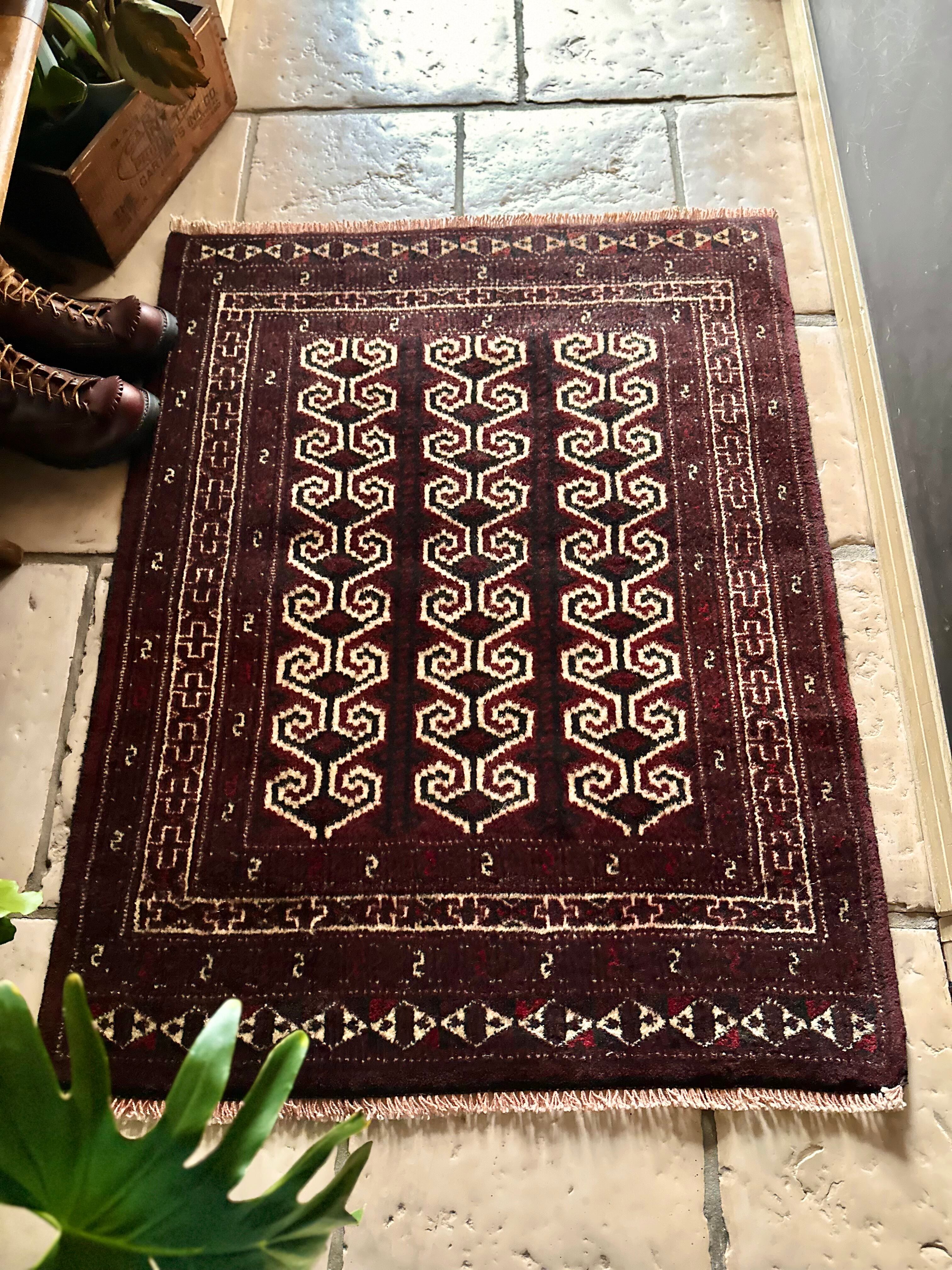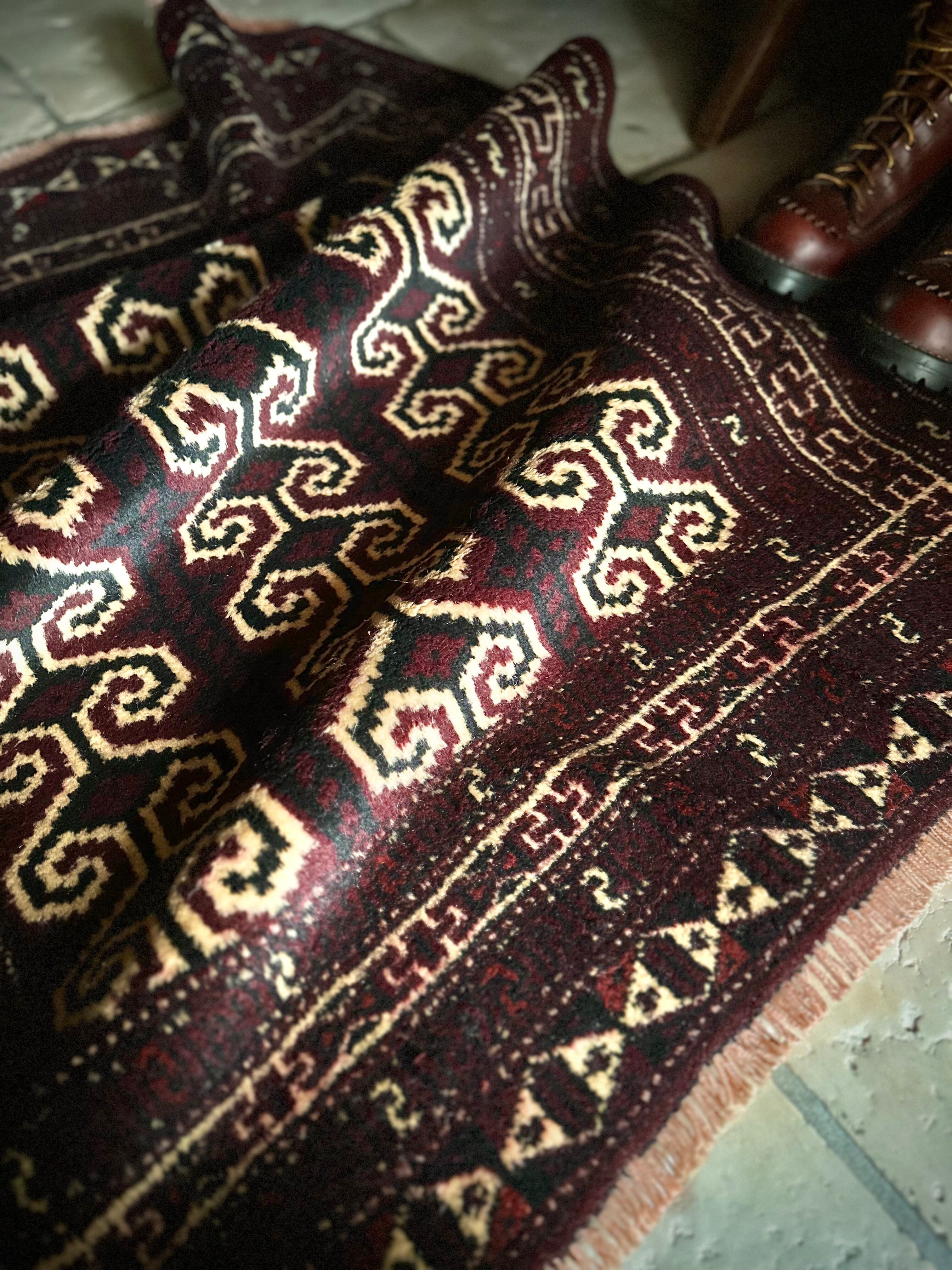 かなりの濃い濃いなバーガンディに羊の角をモチーフにした連続紋様がインパクトのあるこちらは、イラン北東部に居住するトルクメン族のトライバルラグで、初めてのイラン買付での仕入れ以来の入荷になります。