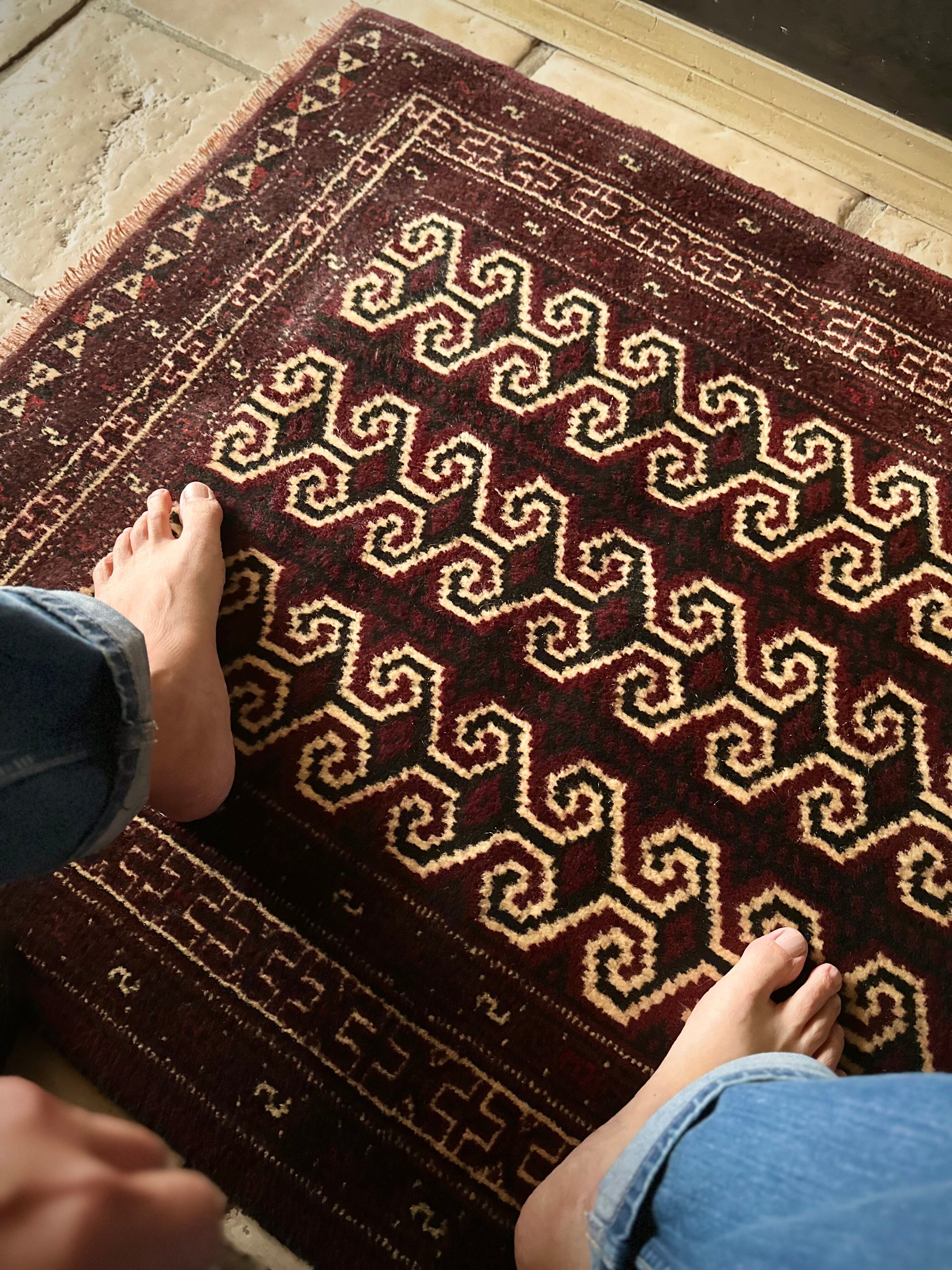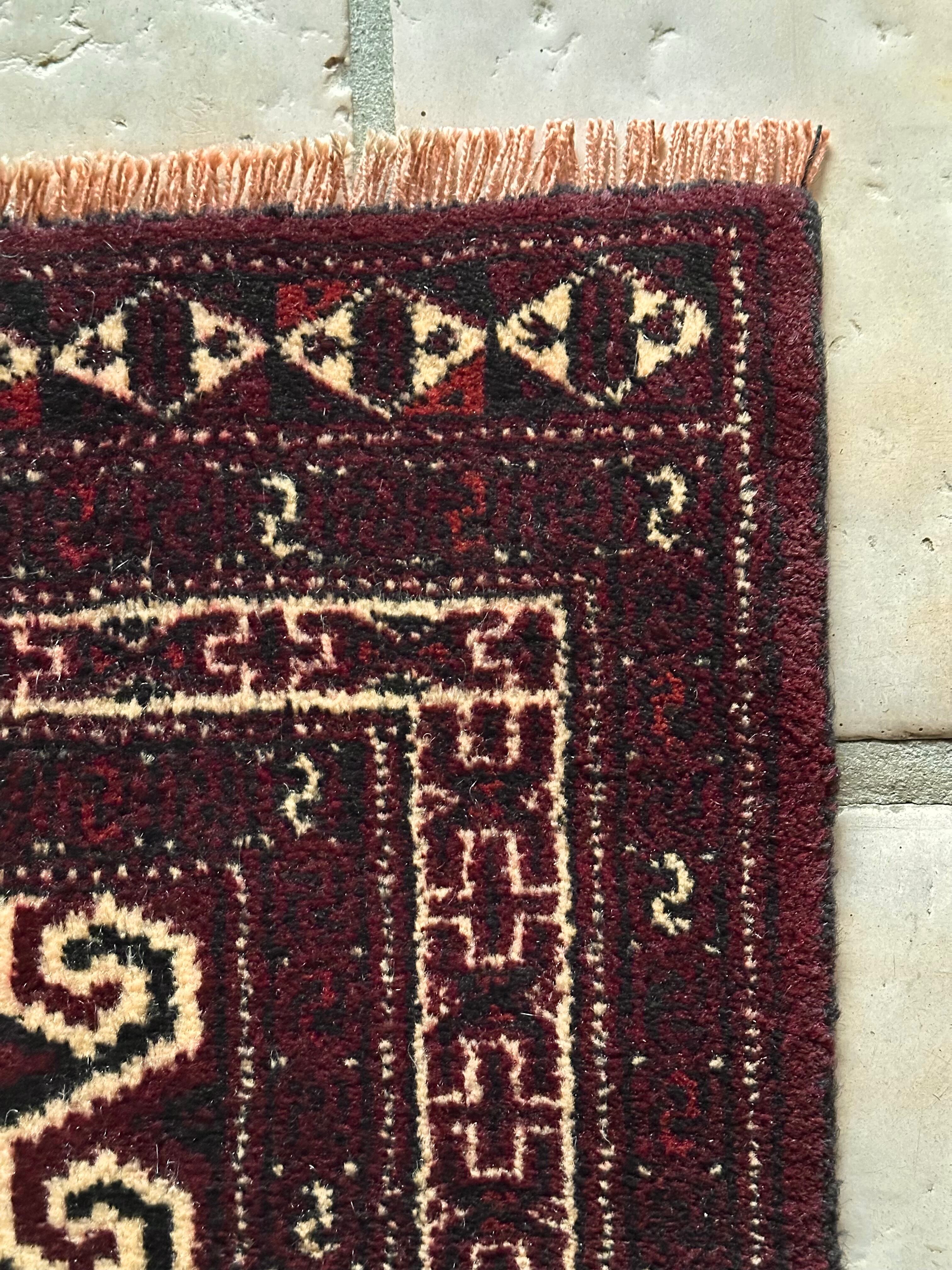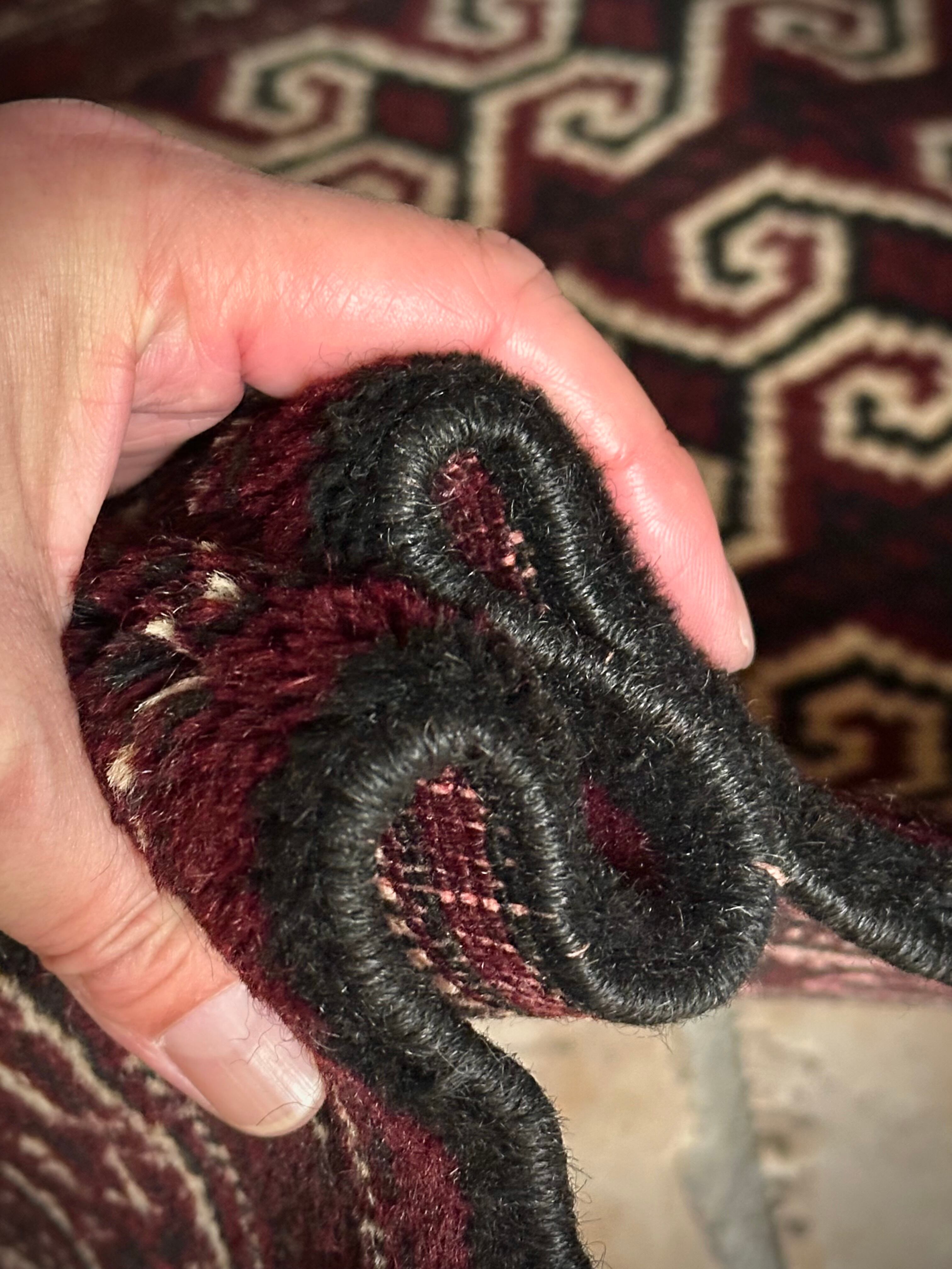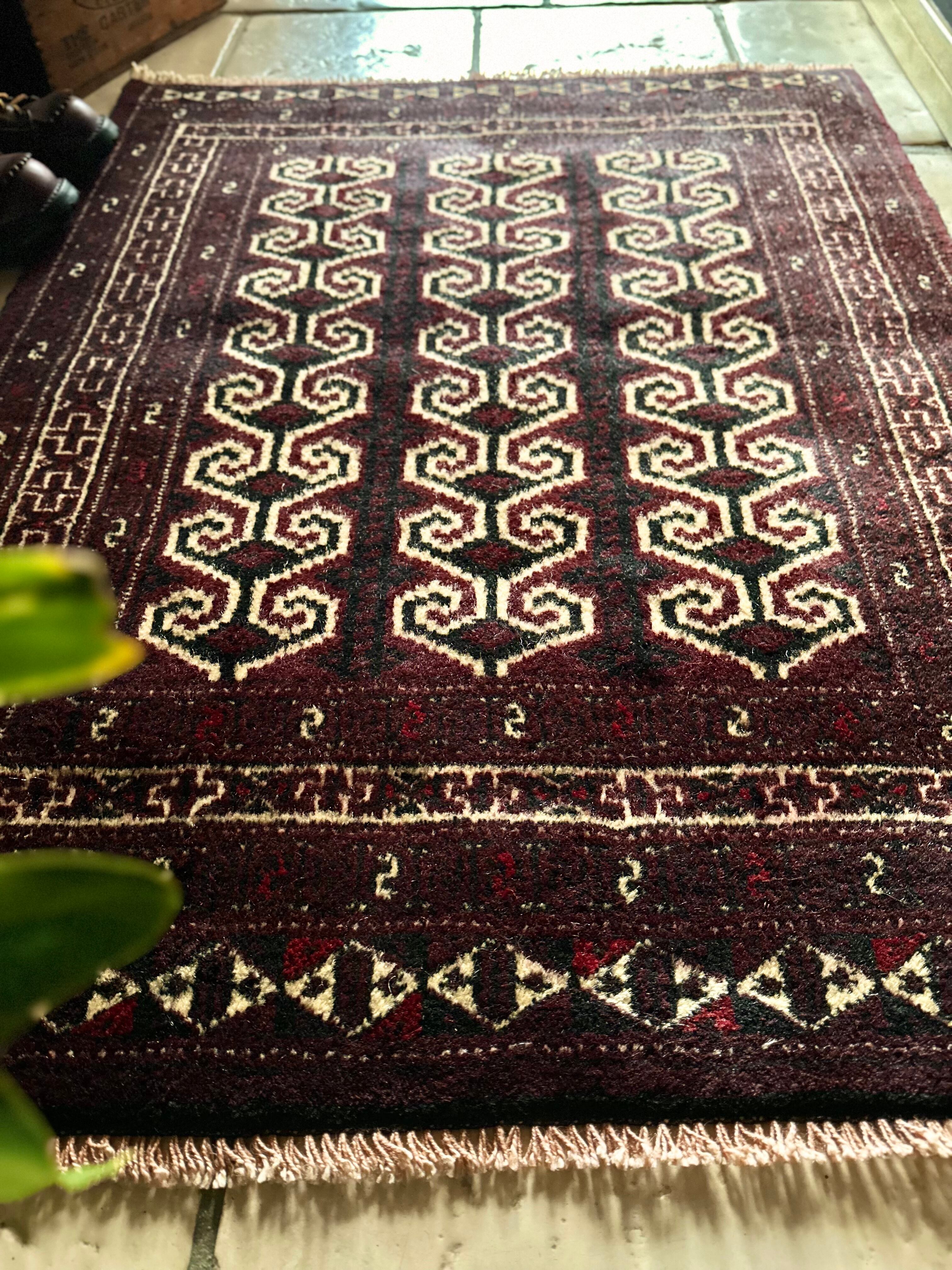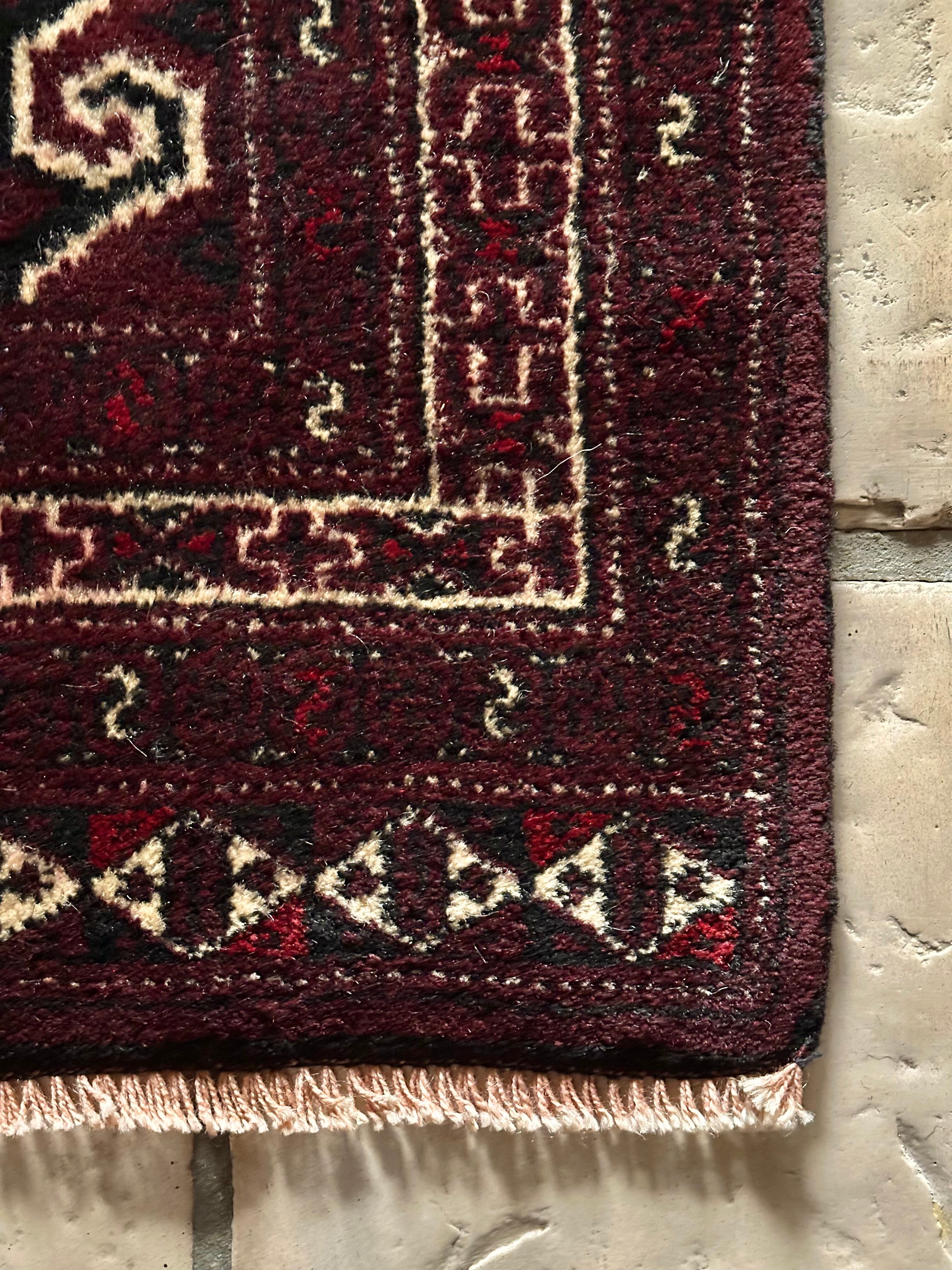 かなりの濃い濃いなバーガンディに羊の角をモチーフにした連続紋様がインパクトのあるこちらは、イラン北東部に居住するトルクメン族のトライバルラグで、初めてのイラン買付での仕入れ以来の入荷になります。