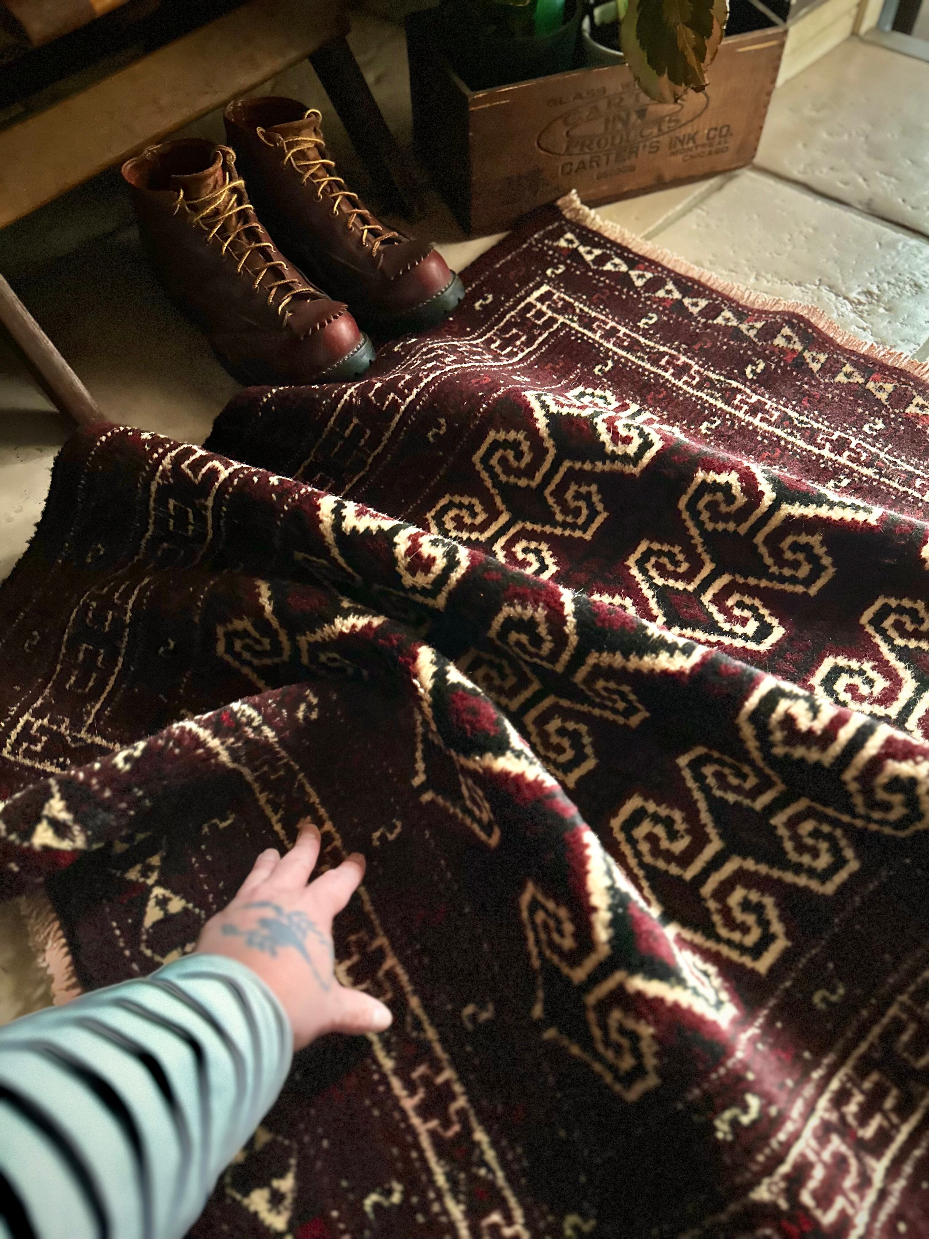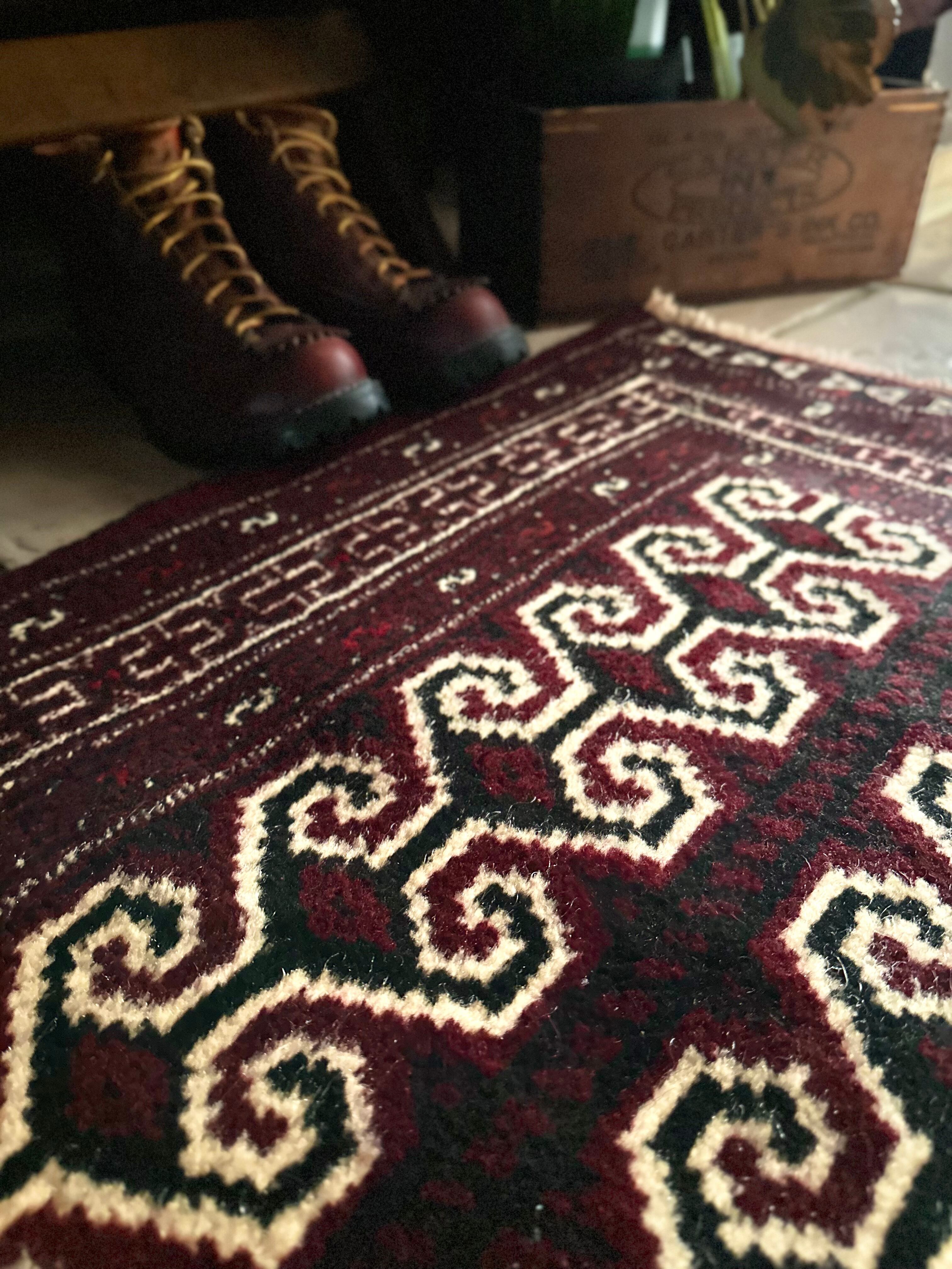 最後にラグそのものに関しては羊毛特有の匂いがあり、採寸は中央付近で計測していますが、手織りならではの歪みによる誤差や水洗いクリーニングによる縮み、また草木染めによる経年劣化の色ムラなどがありますが、それもまたヴィンテージラグの魅力かとご理解ください。