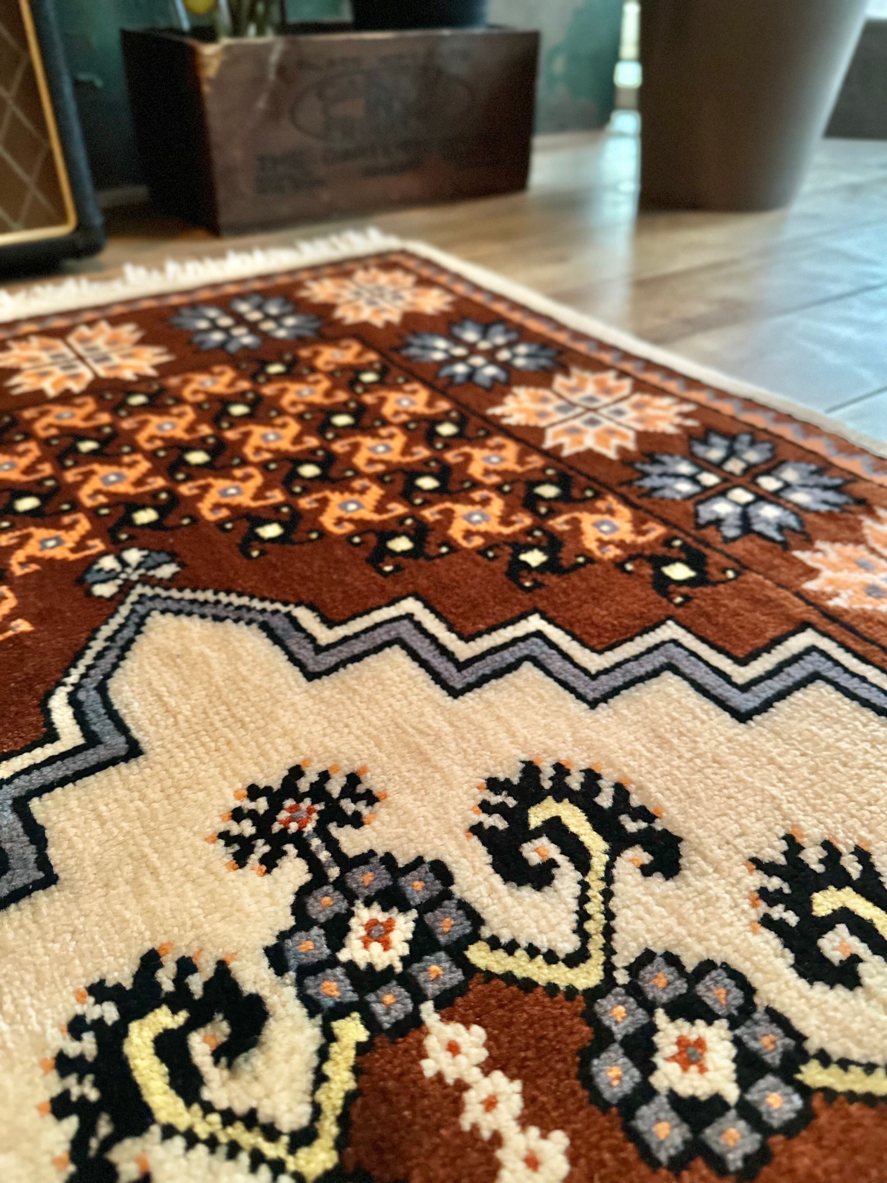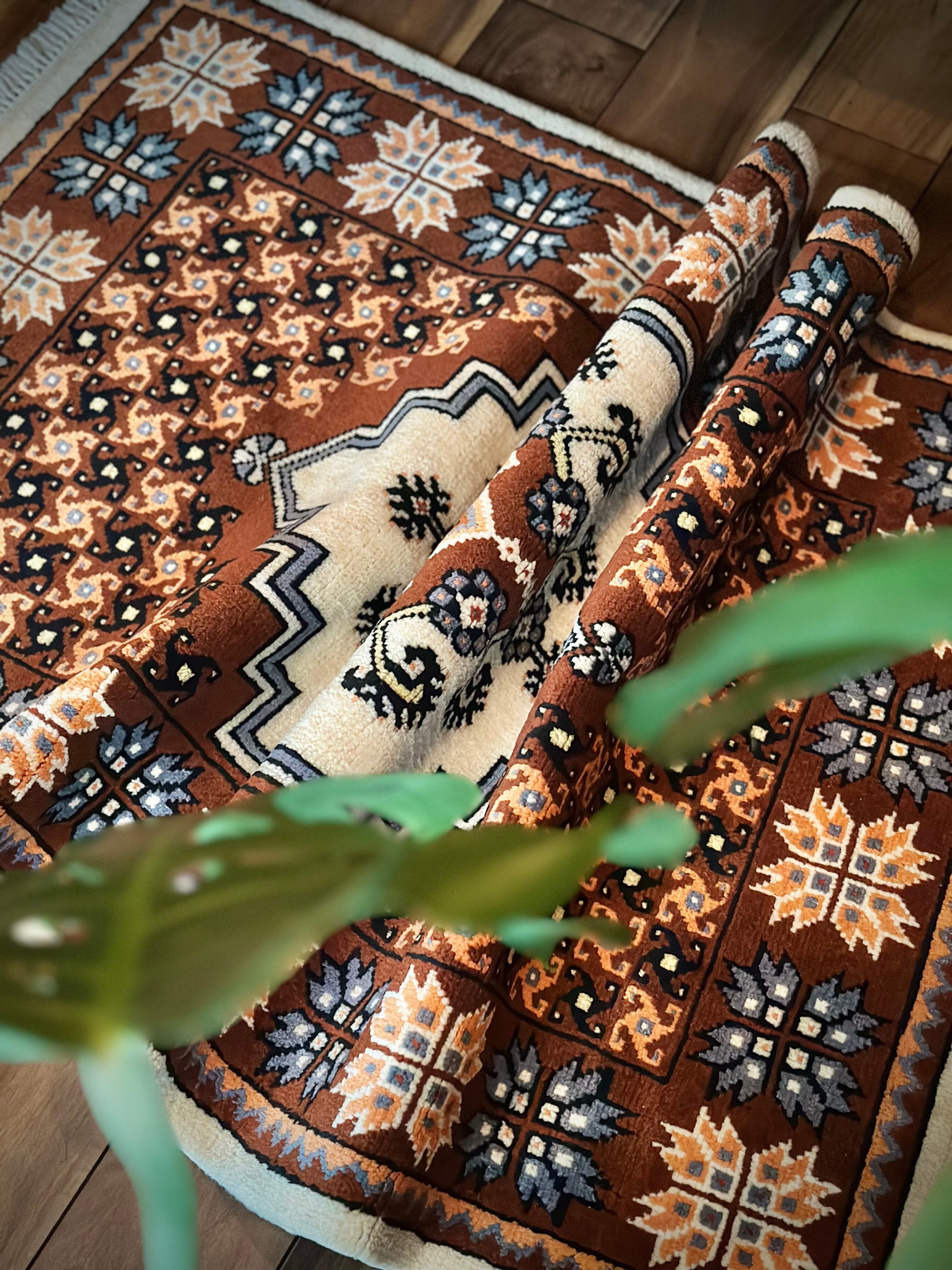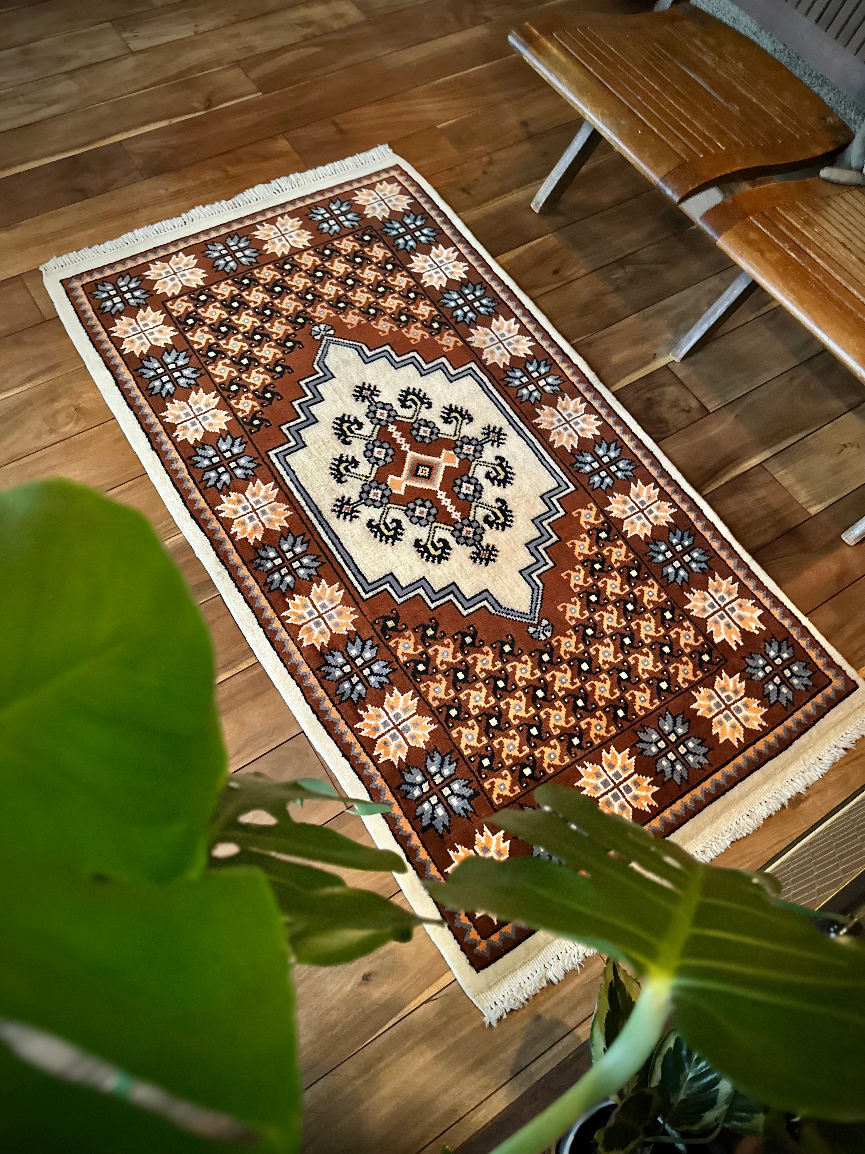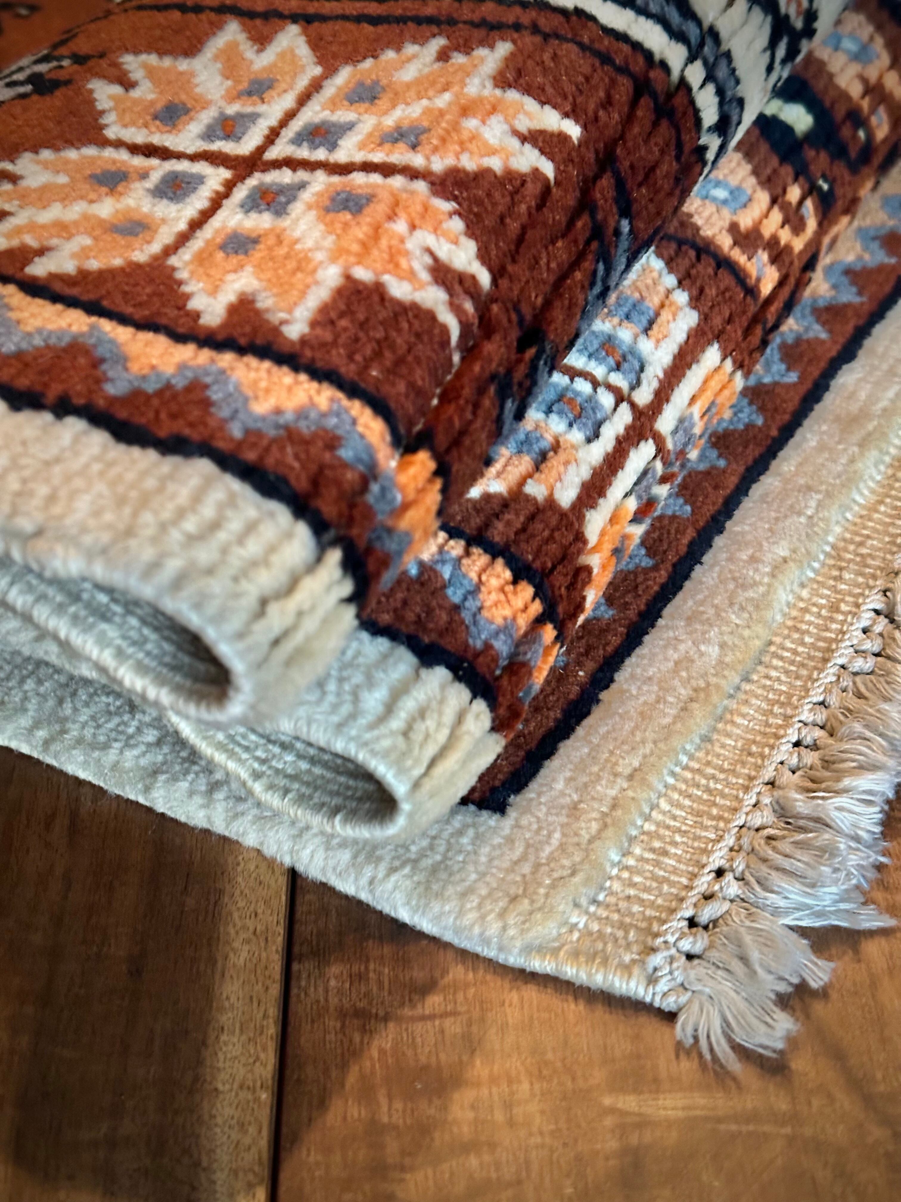 最後にラグそのものに関しては羊毛特有の匂いがあり、採寸は中央付近で計測していますが、手織りならではの歪みによる誤差や水洗いクリーニングによる縮み、また草木染めによる経年劣化の色ムラなどがありますが、それもまたヴィンテージラグの魅力かとご理解ください。