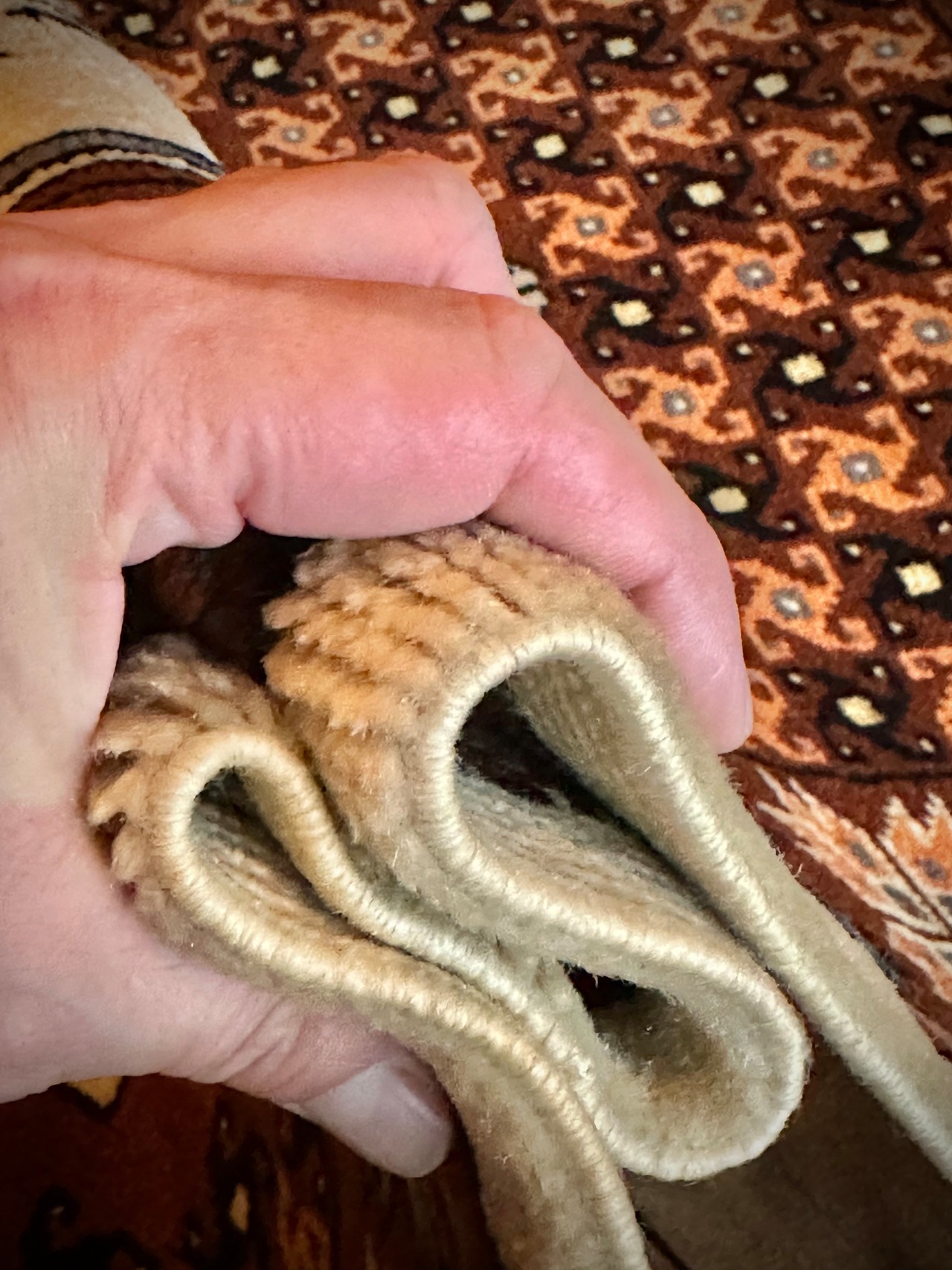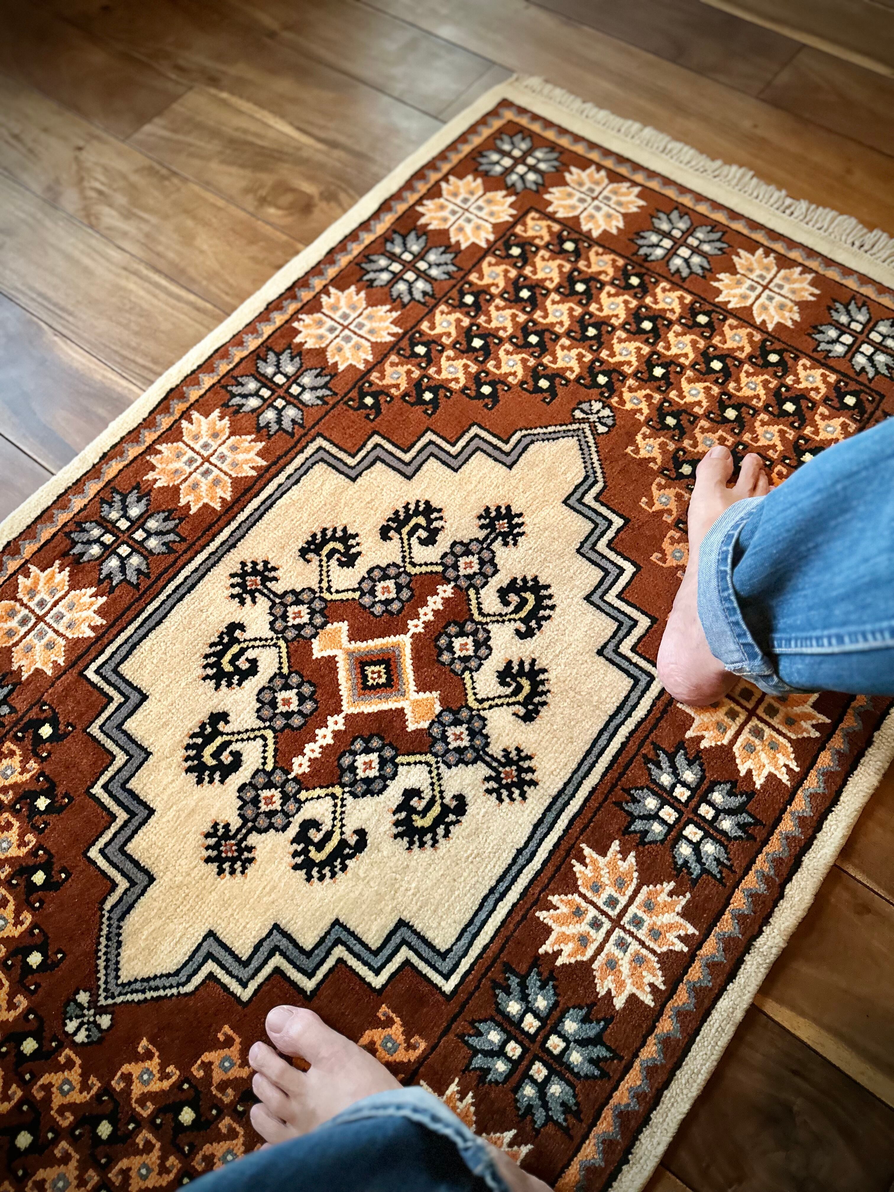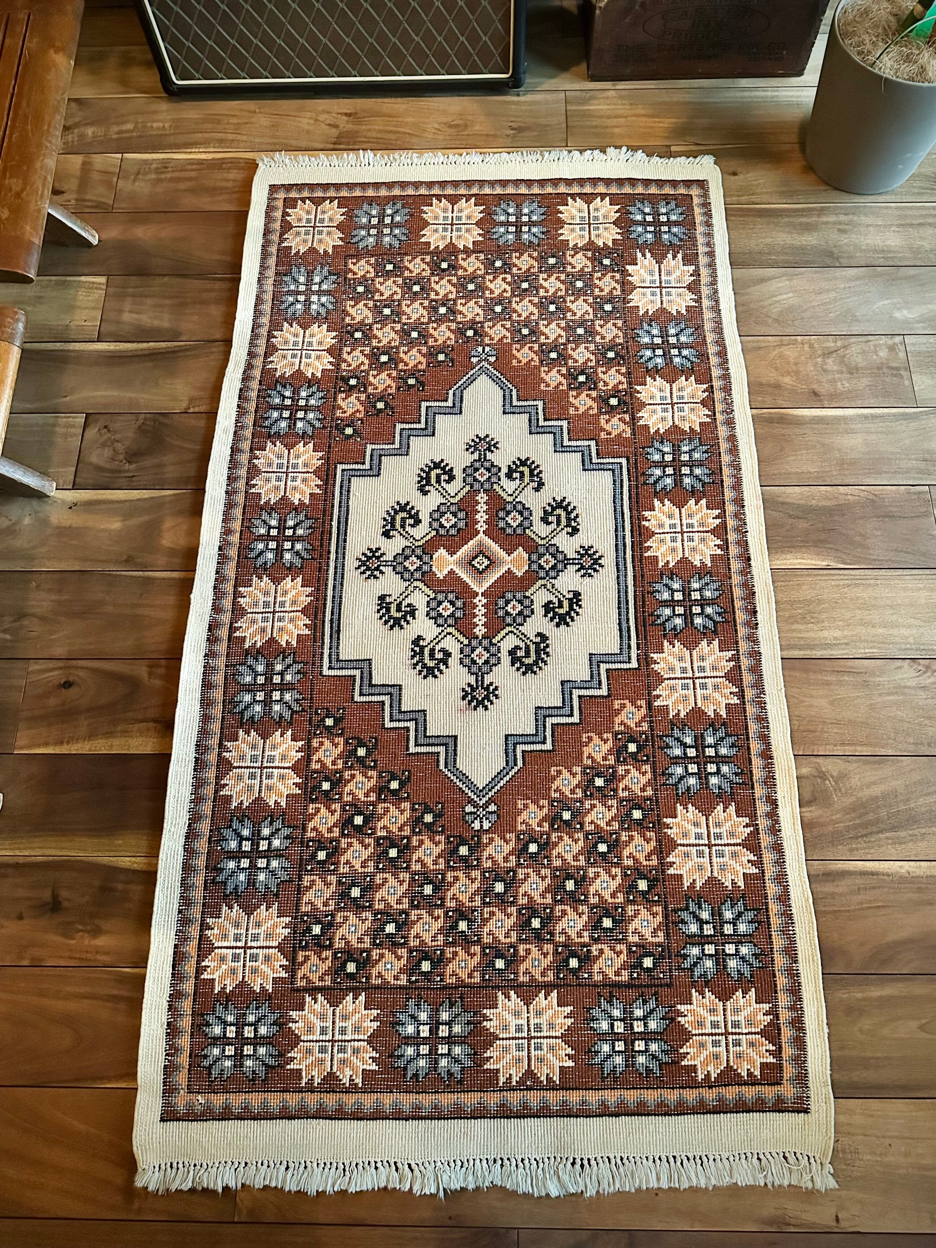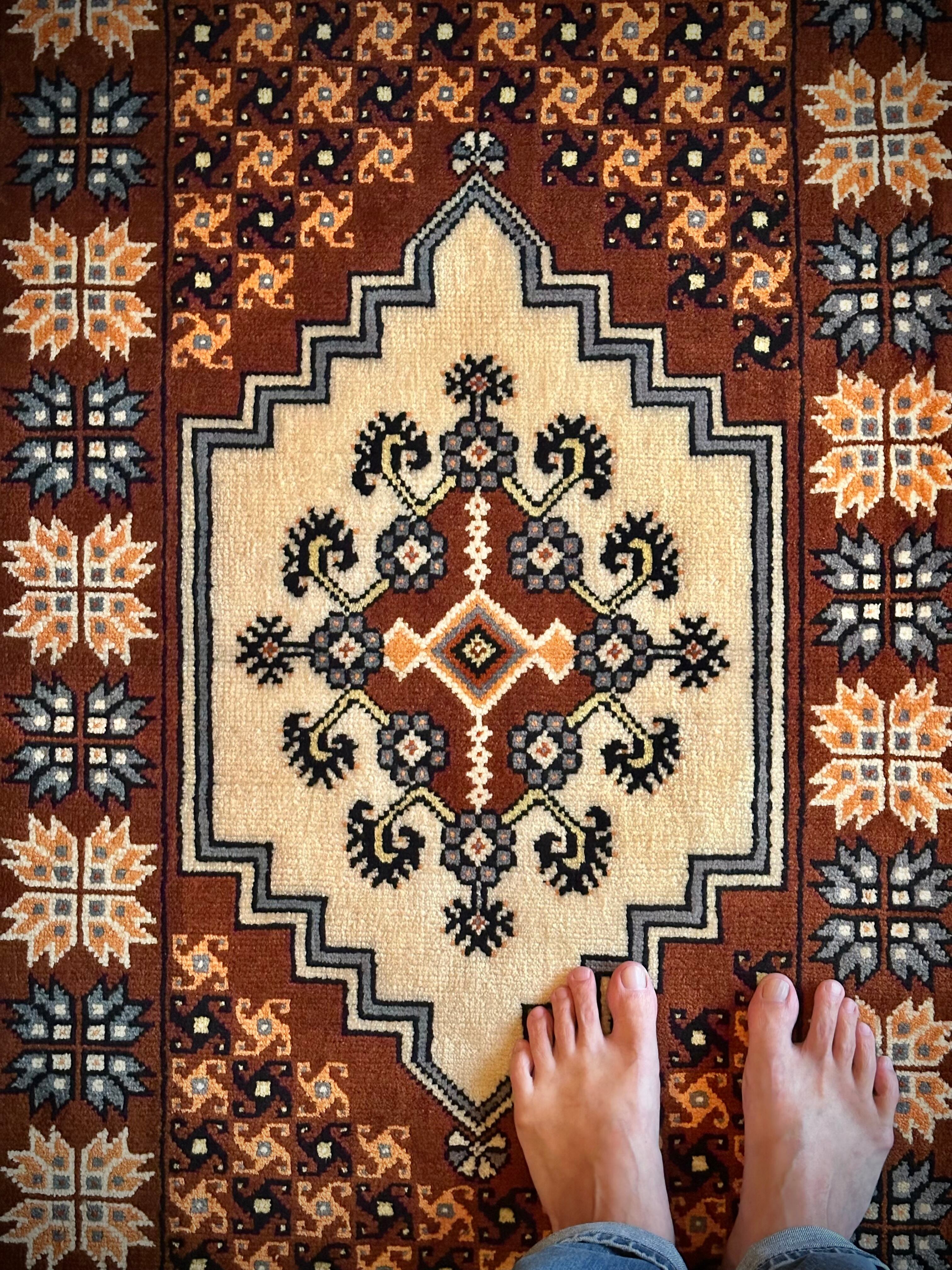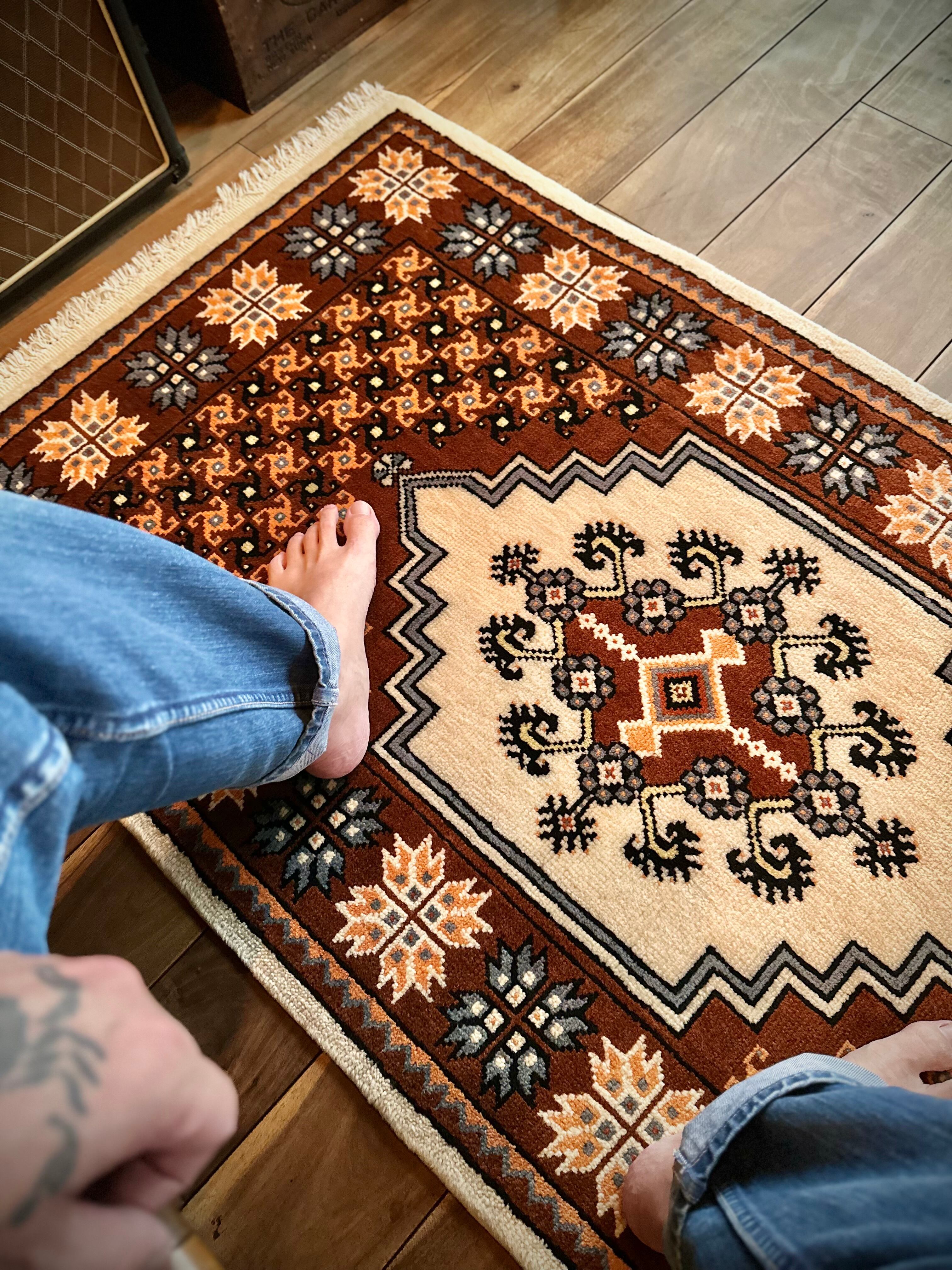最後にラグそのものに関しては羊毛特有の匂いがあり、採寸は中央付近で計測していますが、手織りならではの歪みによる誤差や水洗いクリーニングによる縮み、また草木染めによる経年劣化の色ムラなどがありますが、それもまたヴィンテージラグの魅力かとご理解ください。