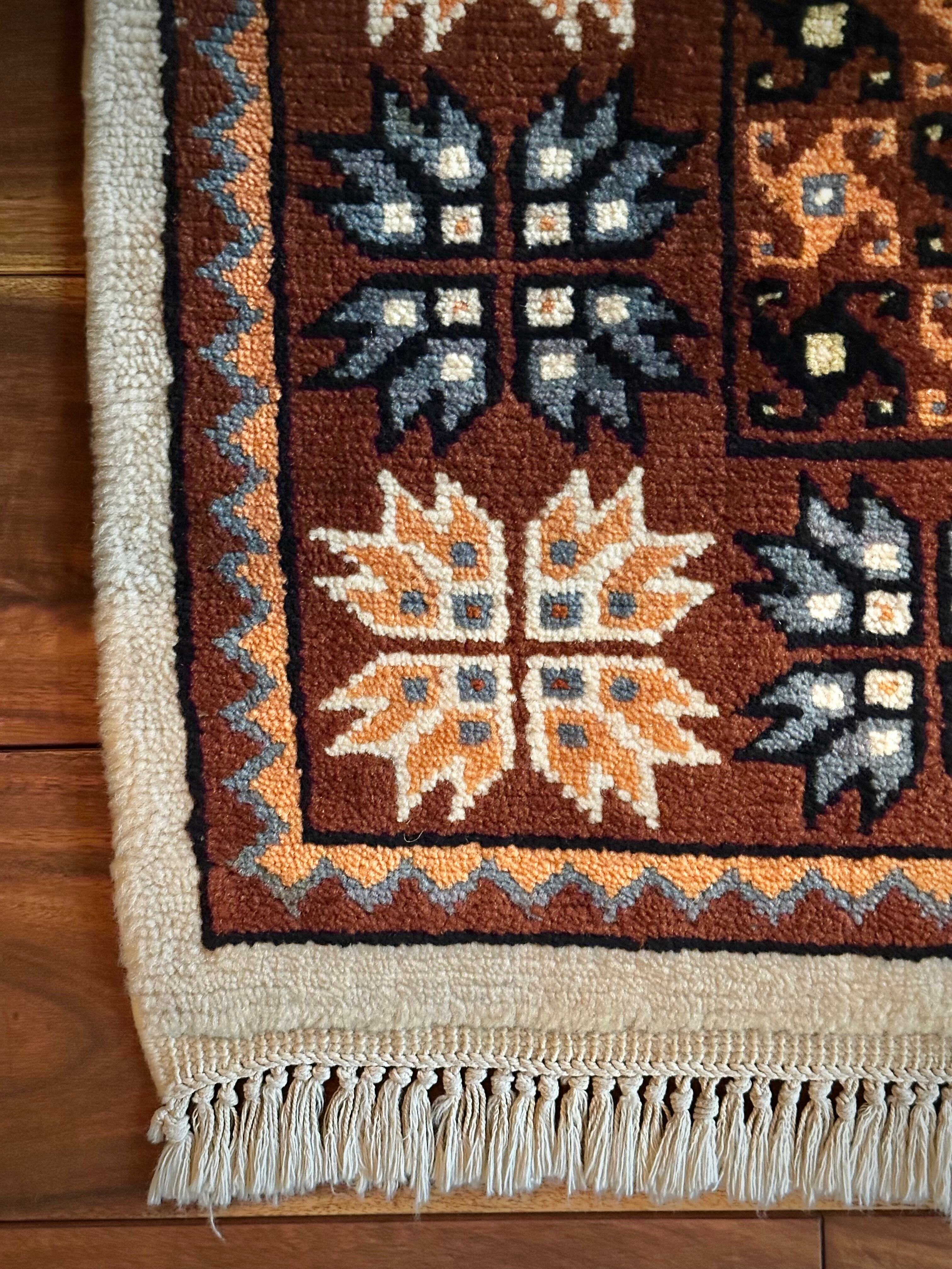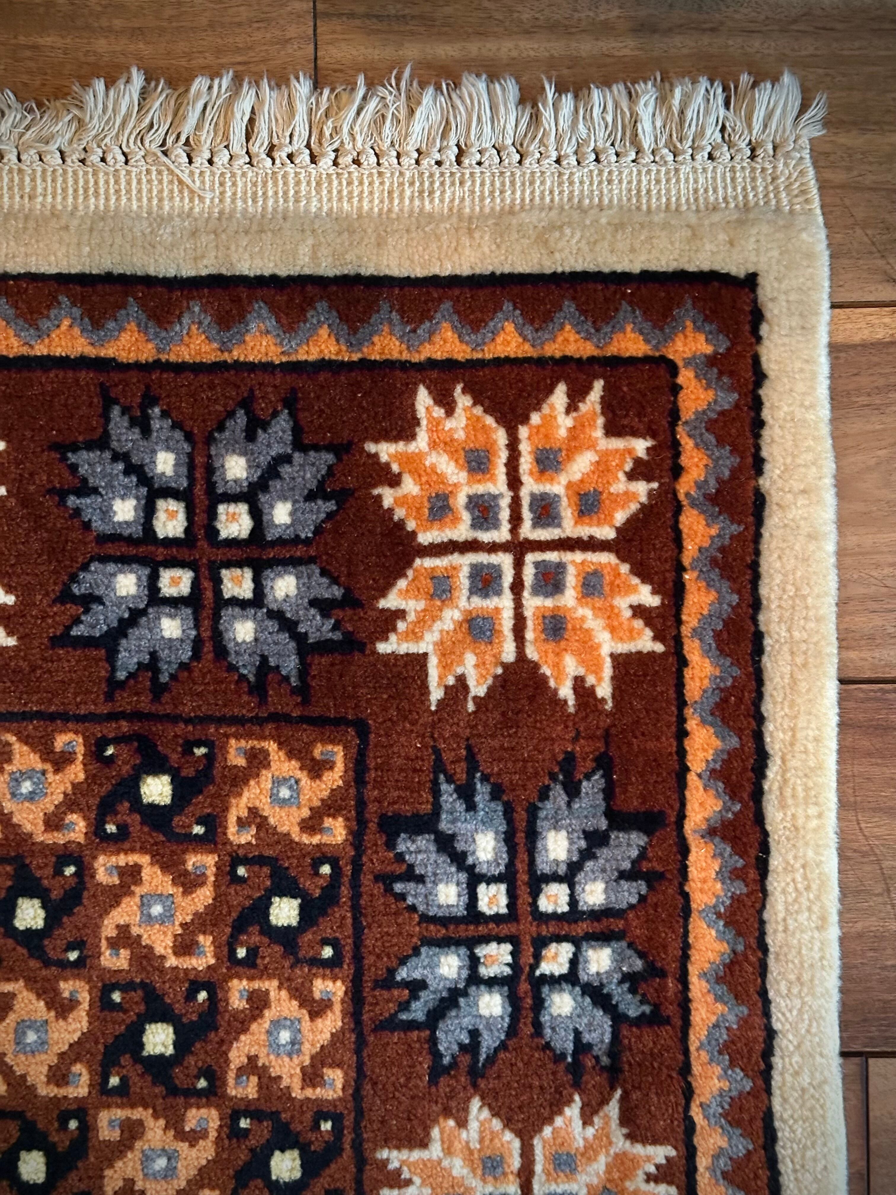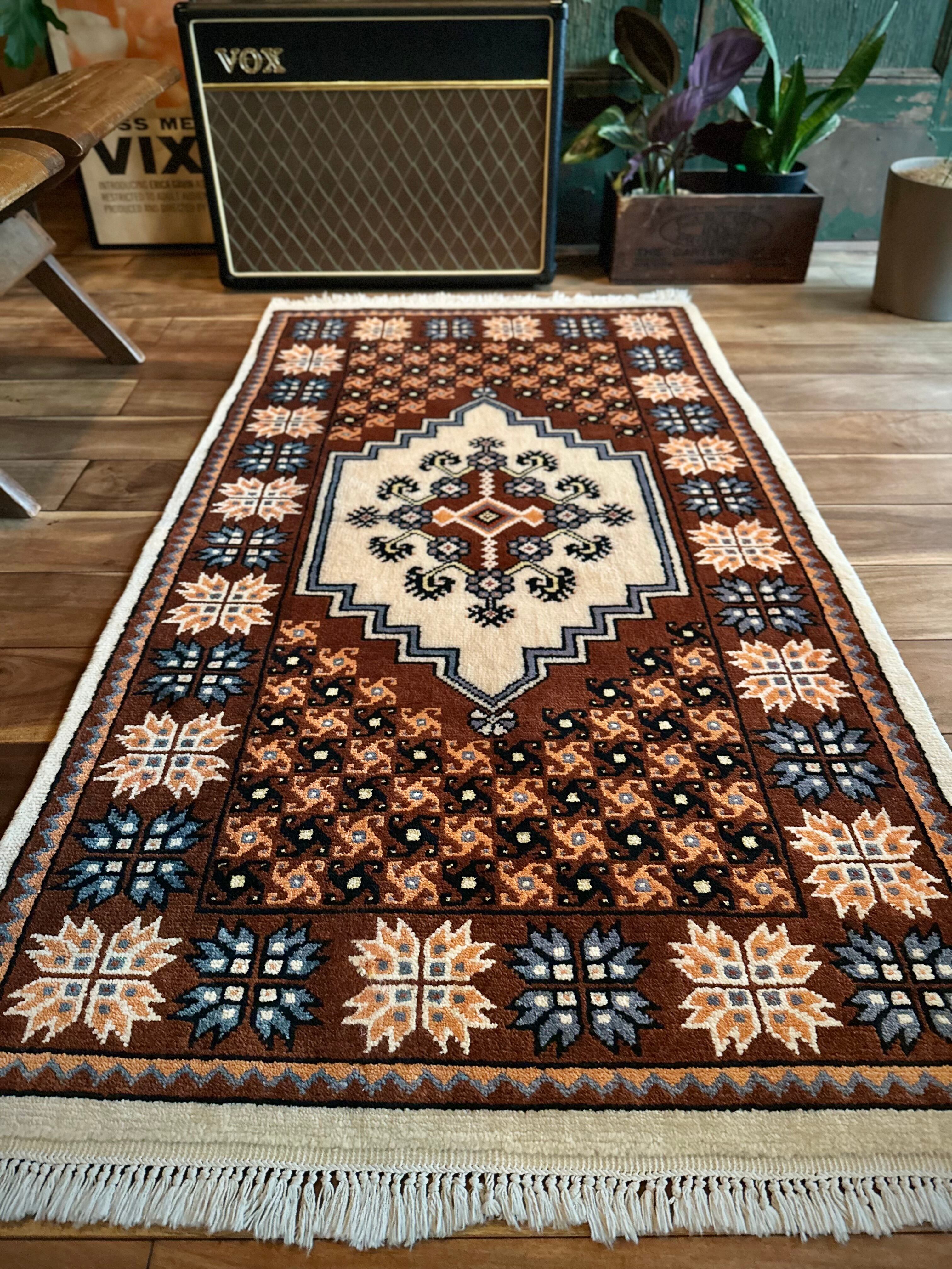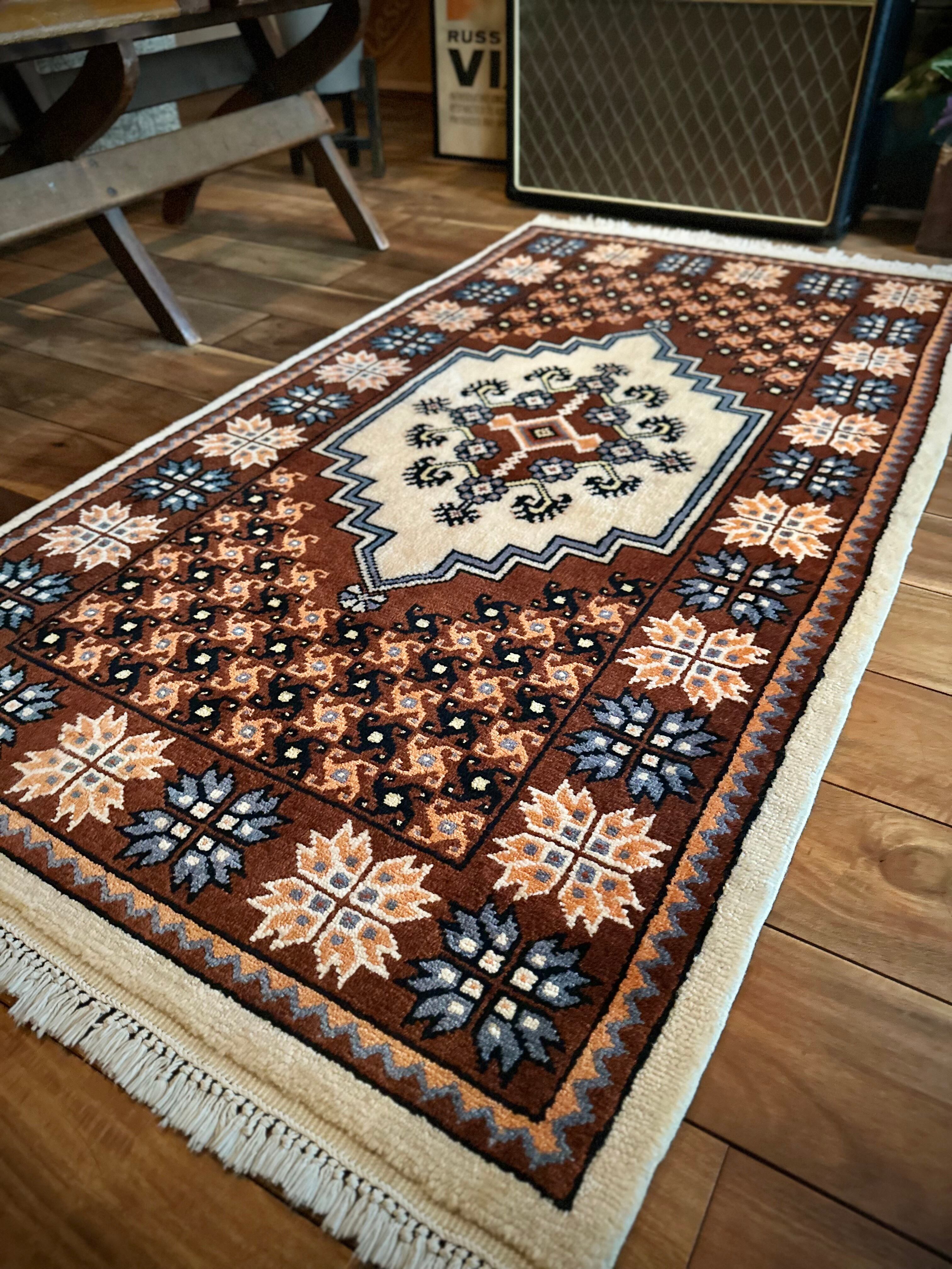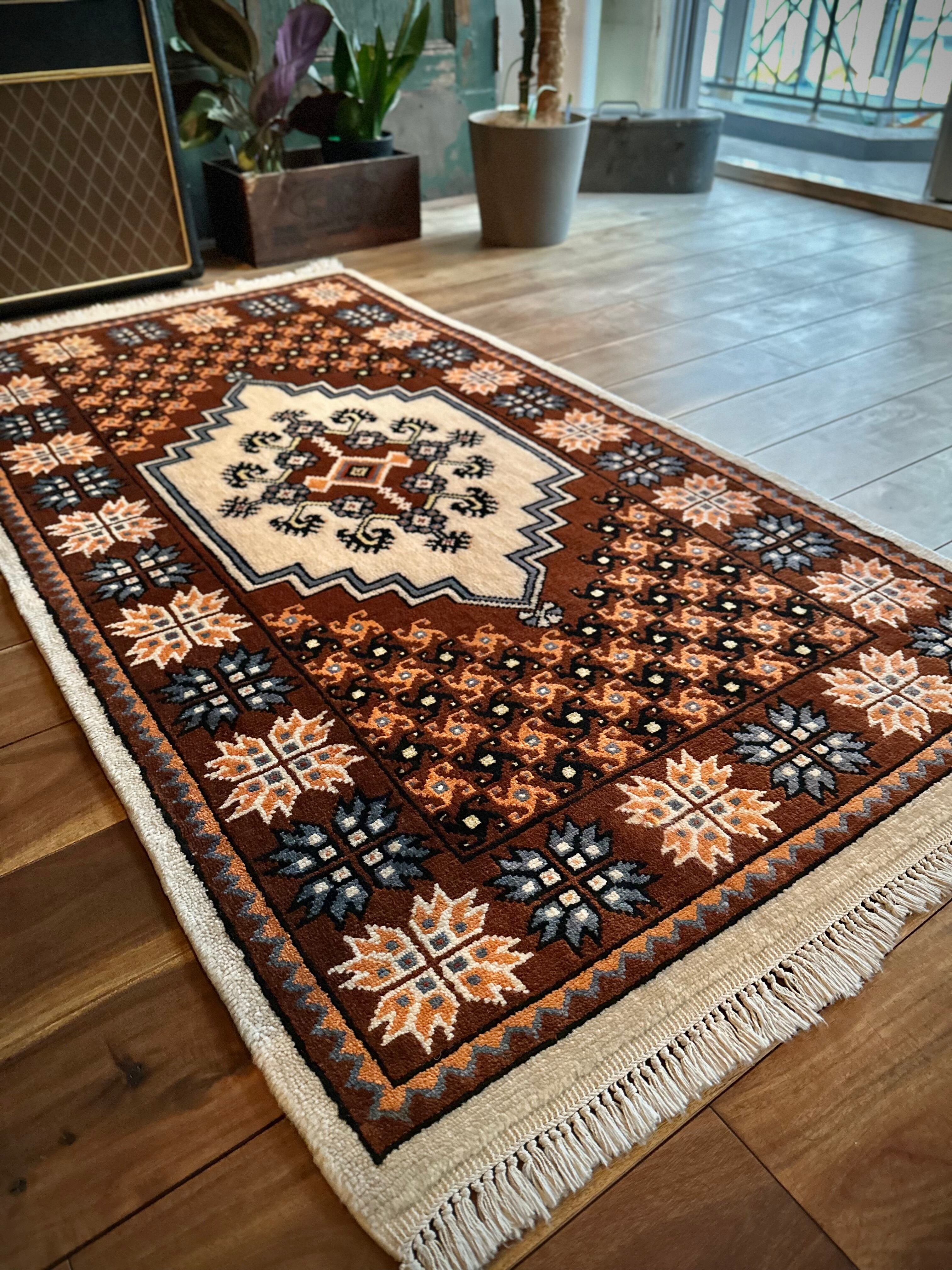 お部屋に合わせやすいブラウンベースにアイボリーとペールオレンジの色合いがほど良く、シンプルなメダリオン紋様がオリエンタルなこちらは、トルコとイランに跨るコーカサス地方で手織りされたクルド系のトライバルラグになります。
