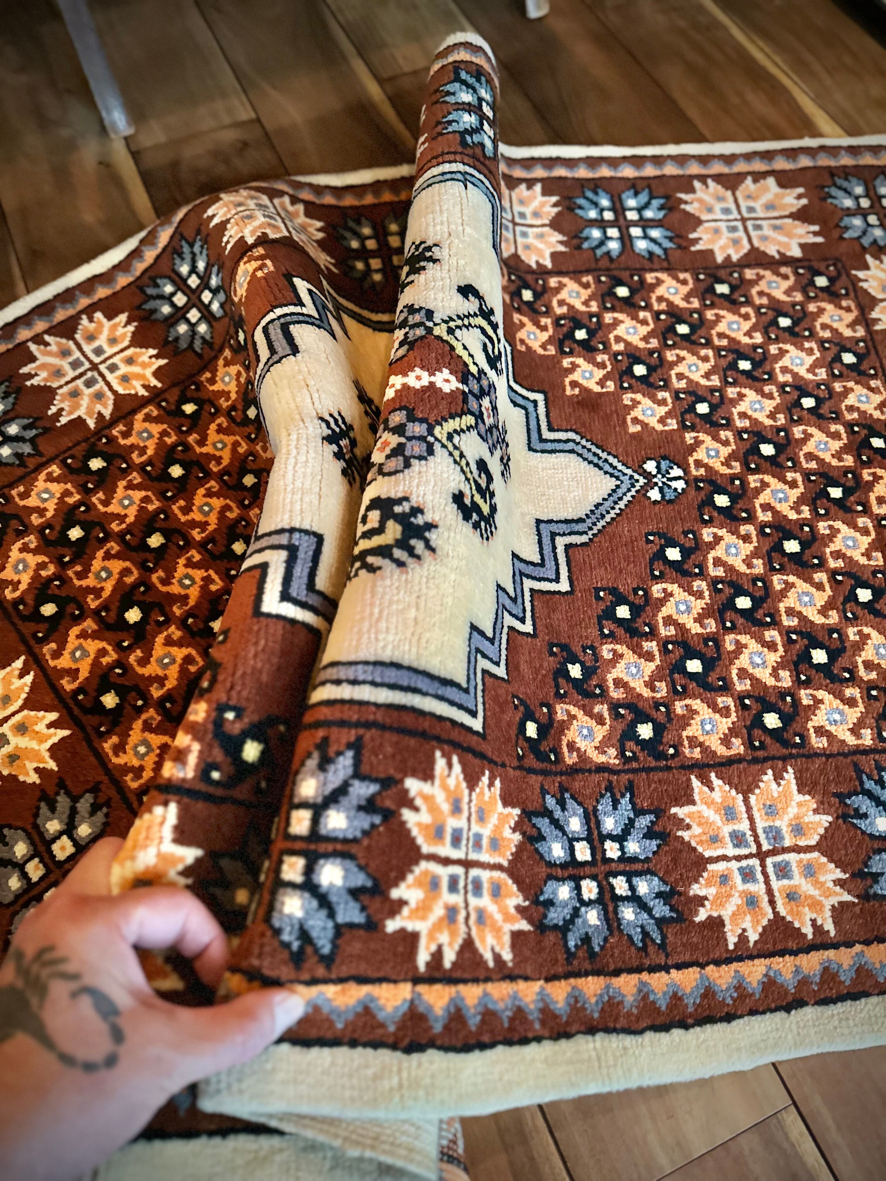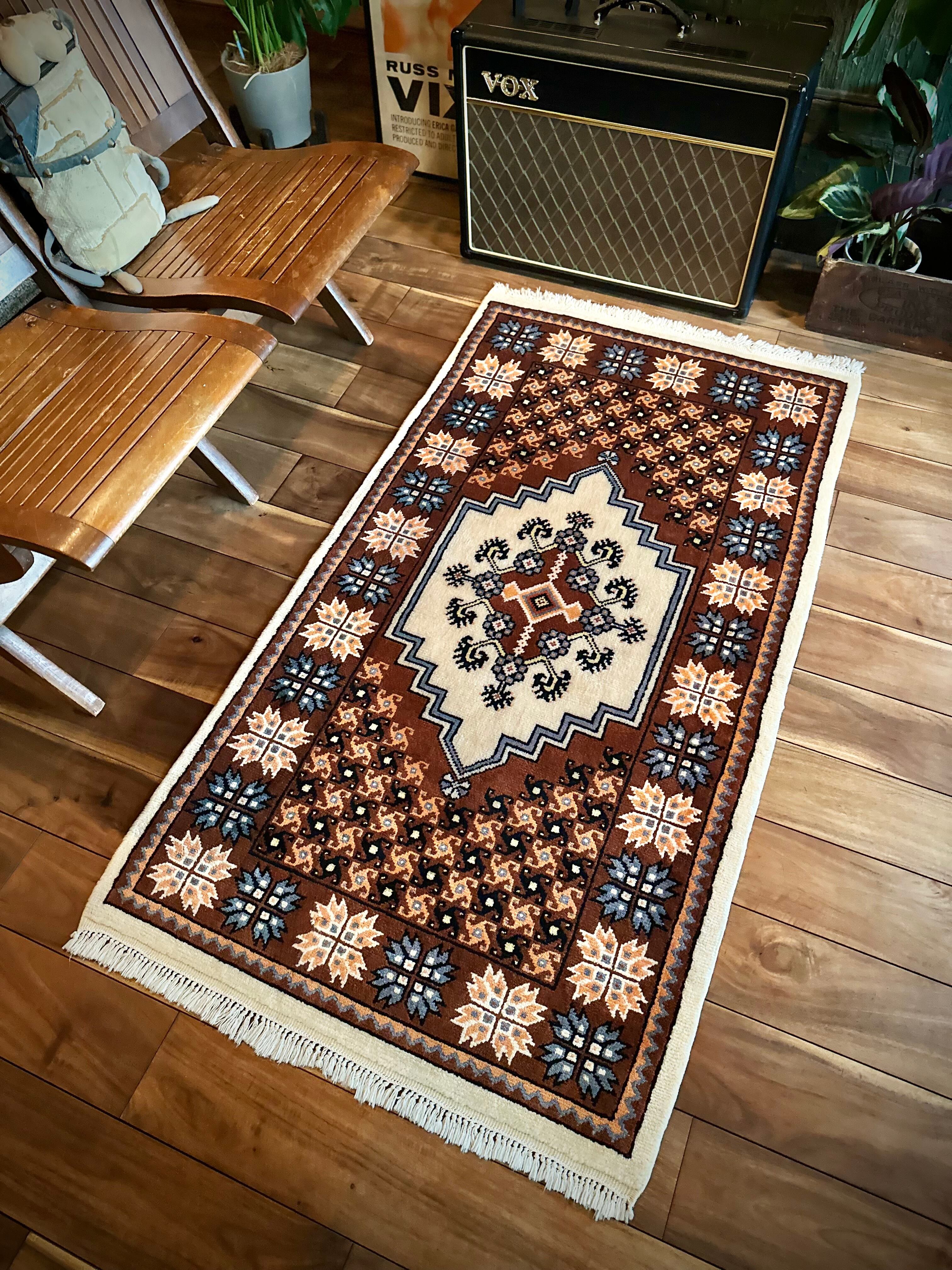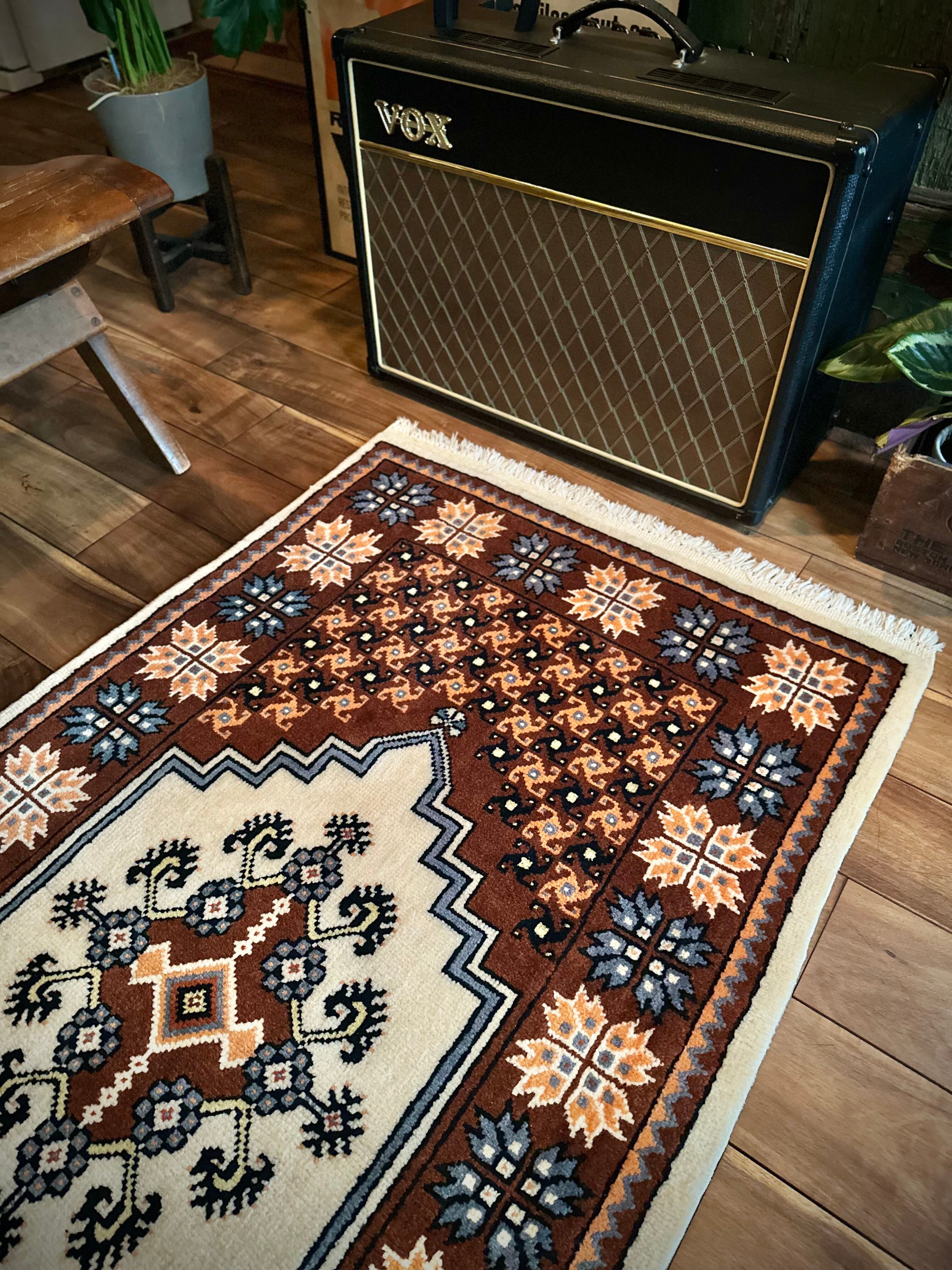 経年としては50年のヴィンテージラグとなりますが、それほどの使用感もなく目立つ汚れやダメージは見当たらないミントなコンディションで、パイル自体も長めのしっとりとした肌触りに足裏も喜ぶことでしょう。