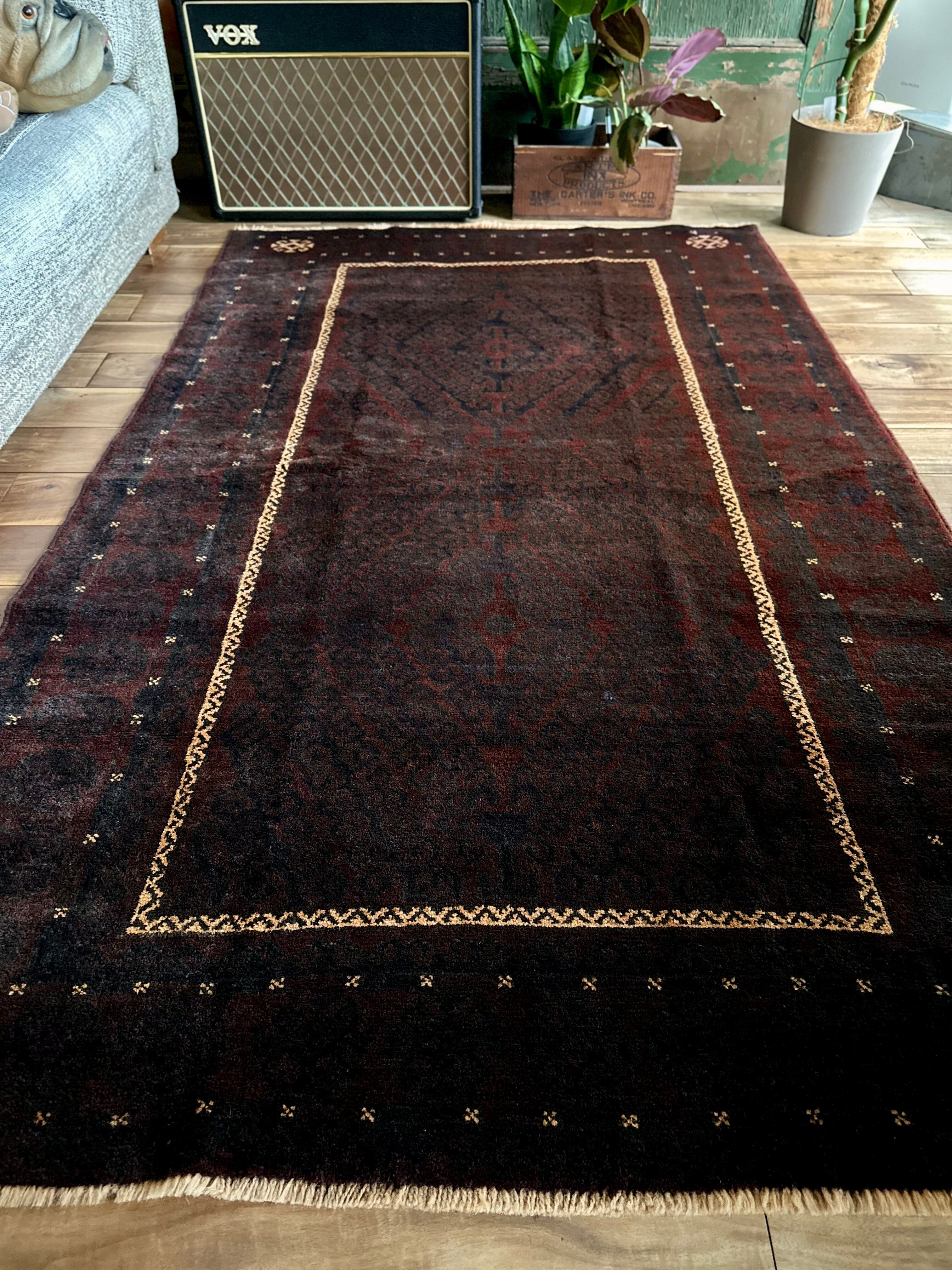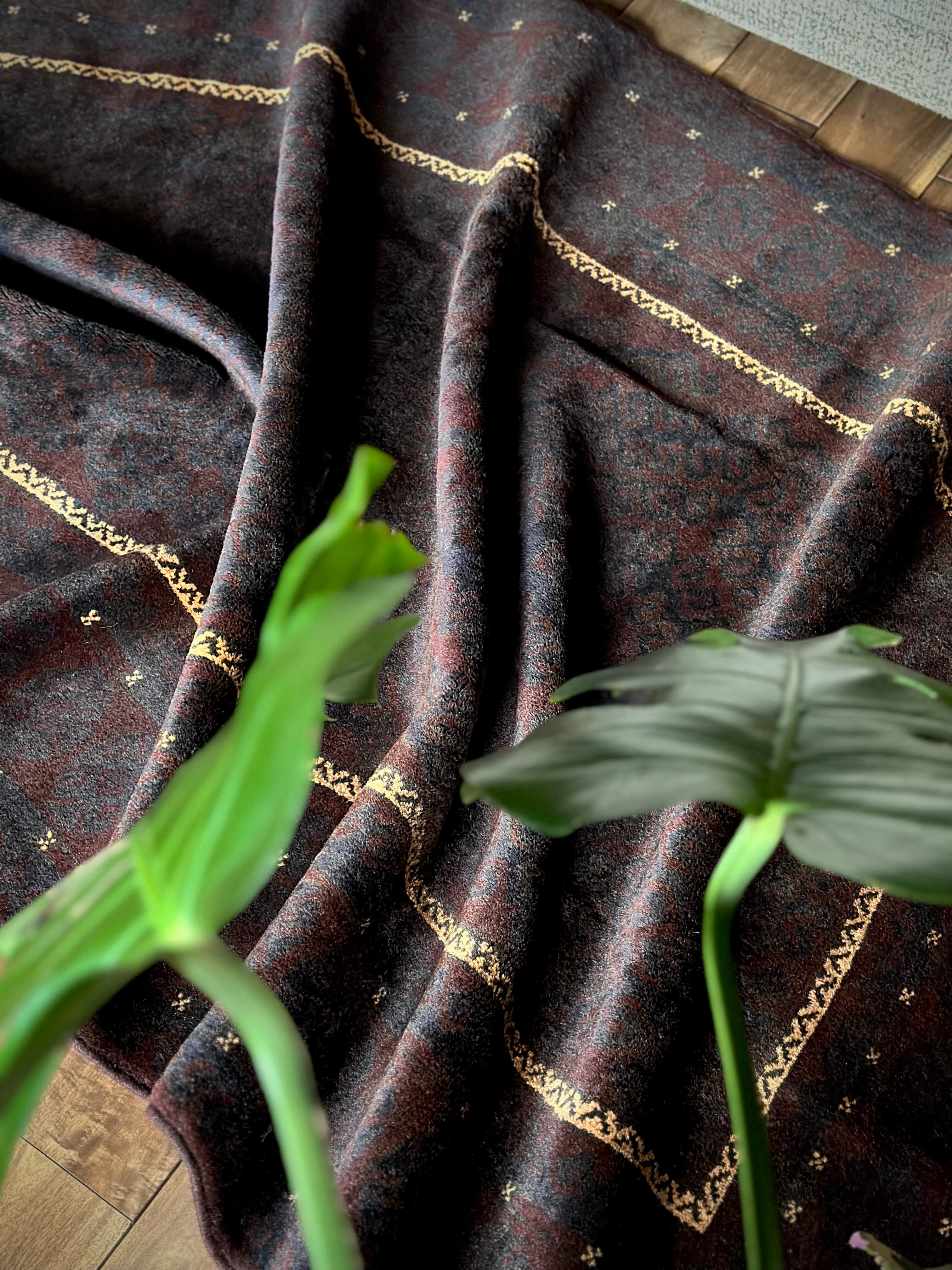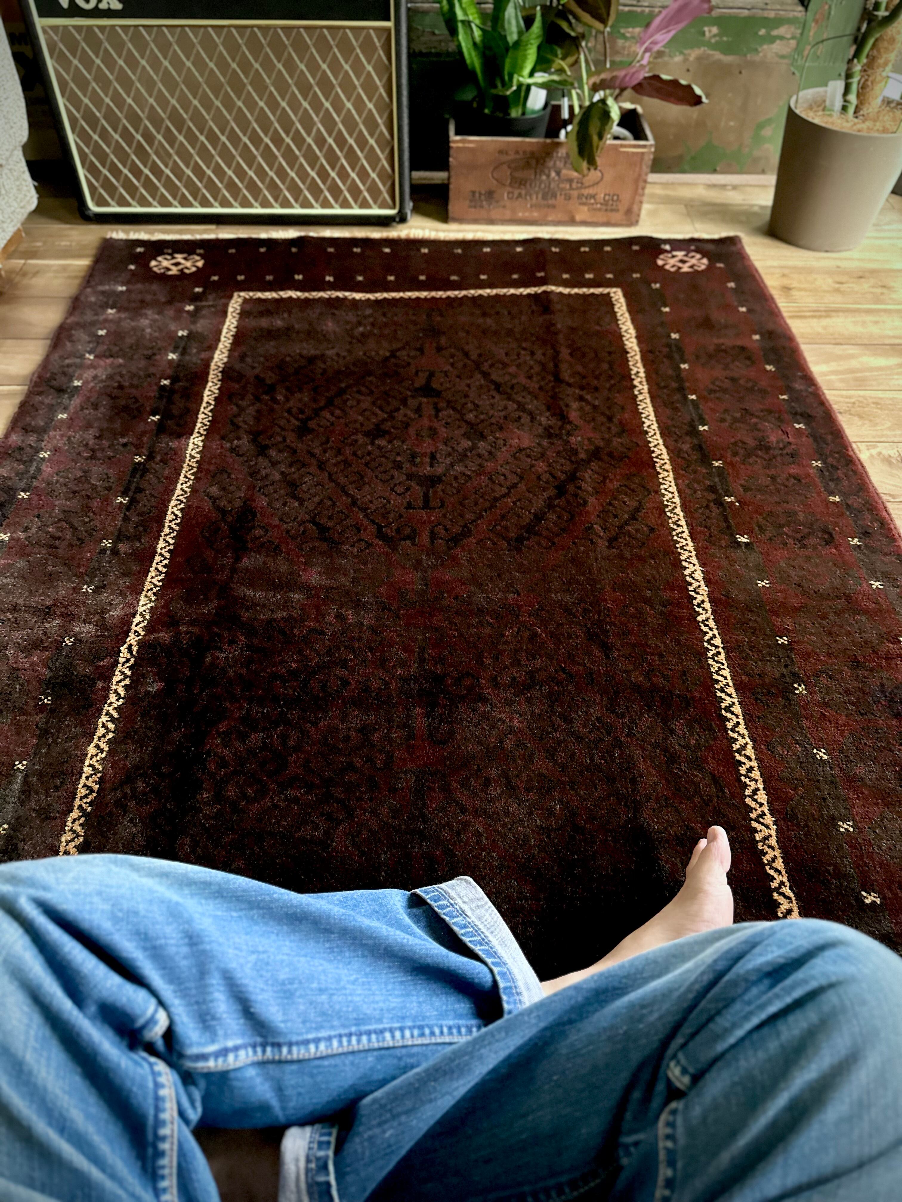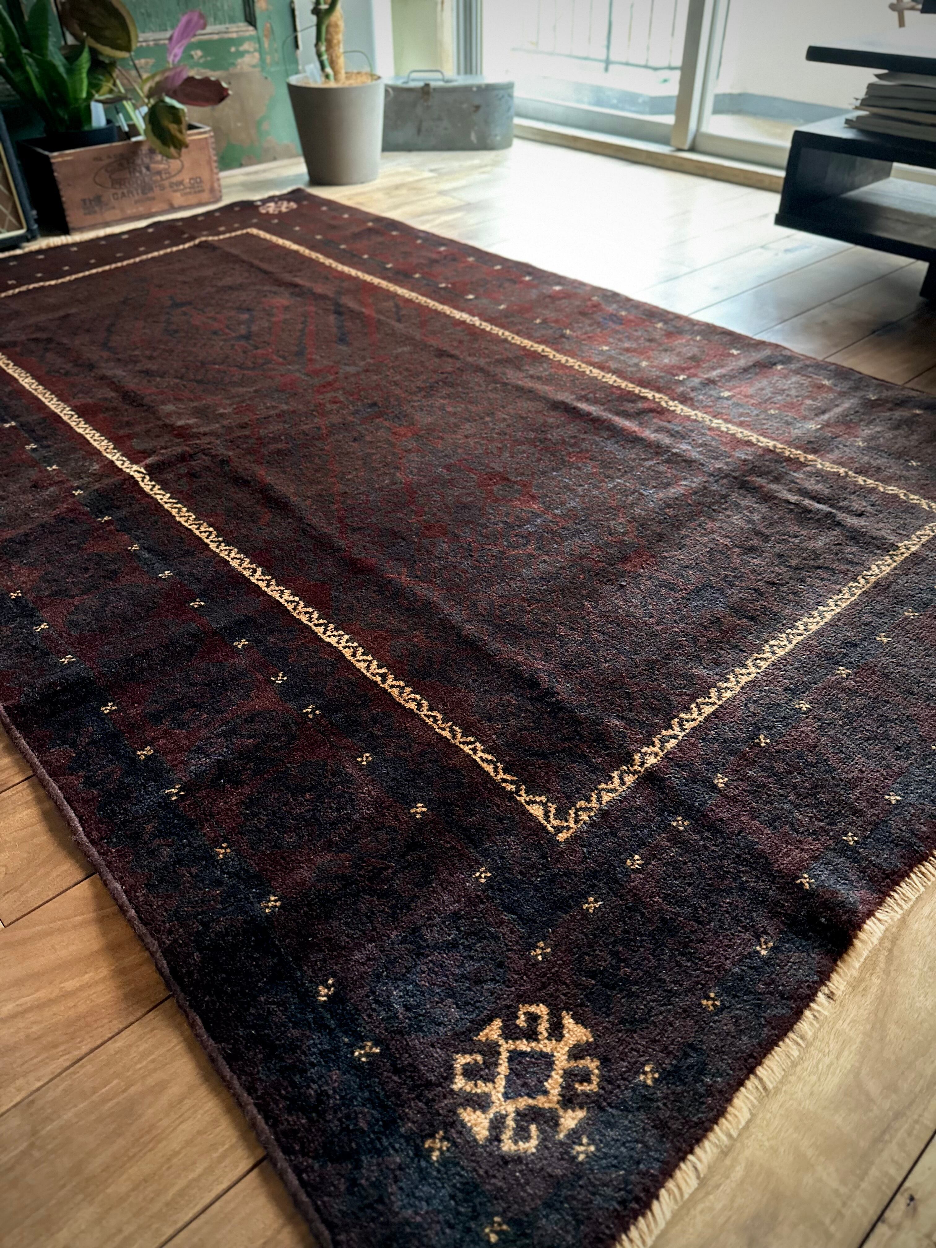 限りなく黒に近いネイビーに深みのあるバーガンディの色合いがかっこいい、アフガニスタンはヘラート州に居住するバルーチ族のトライバルラグで、室内では真っ黒に見えてしまいますが、陽に当たると見違える表情がバルーチらしい1枚になります。