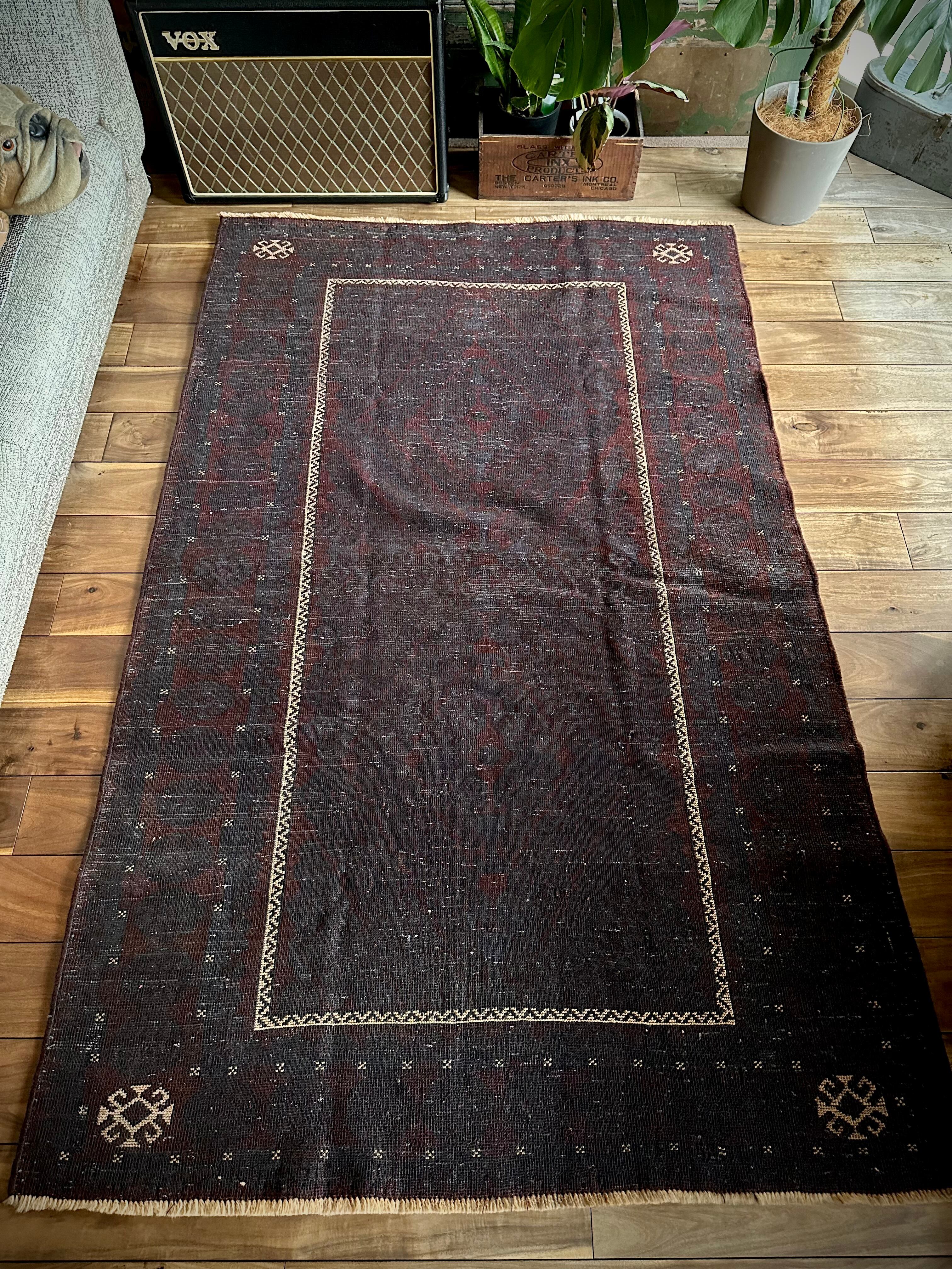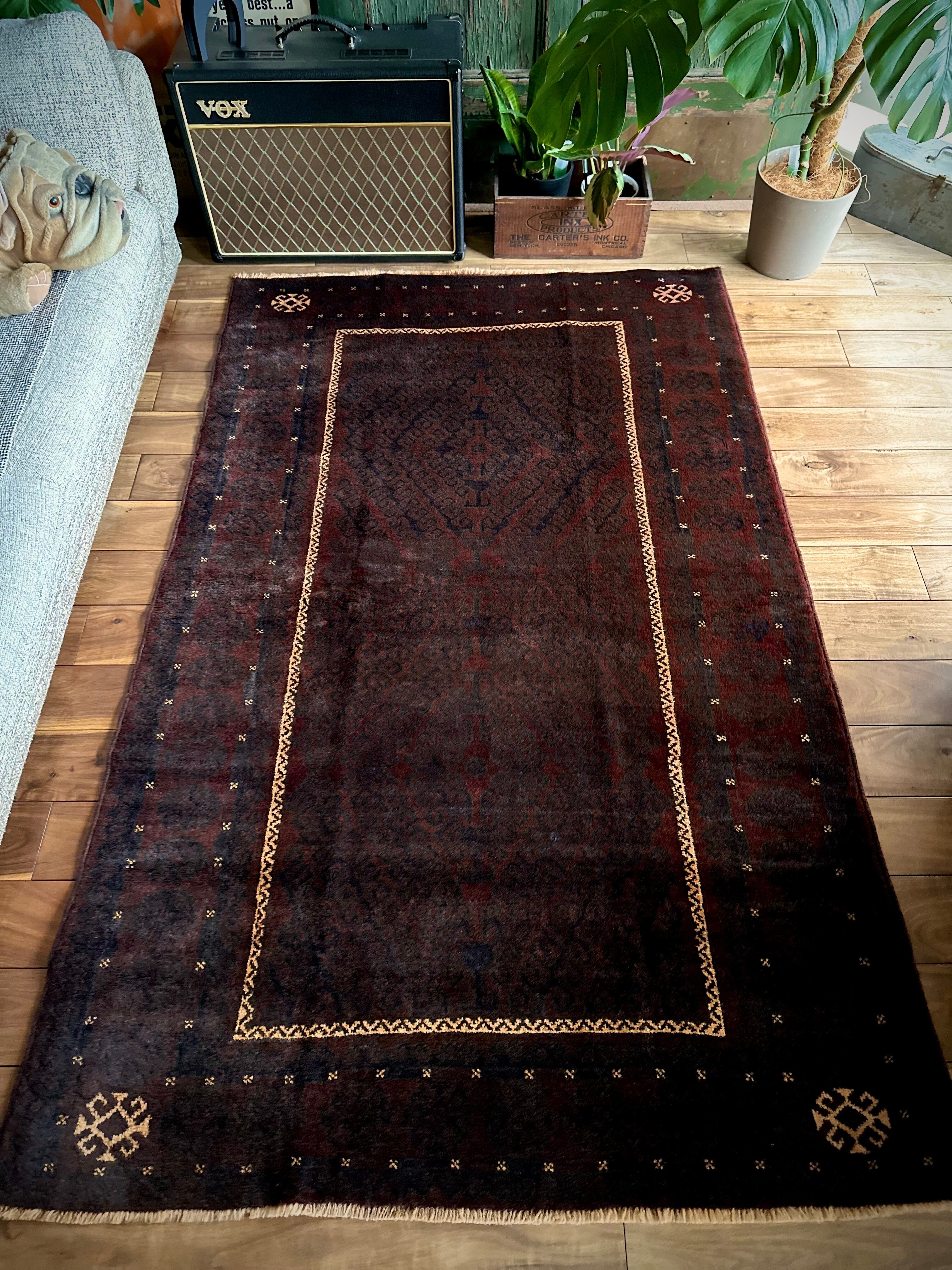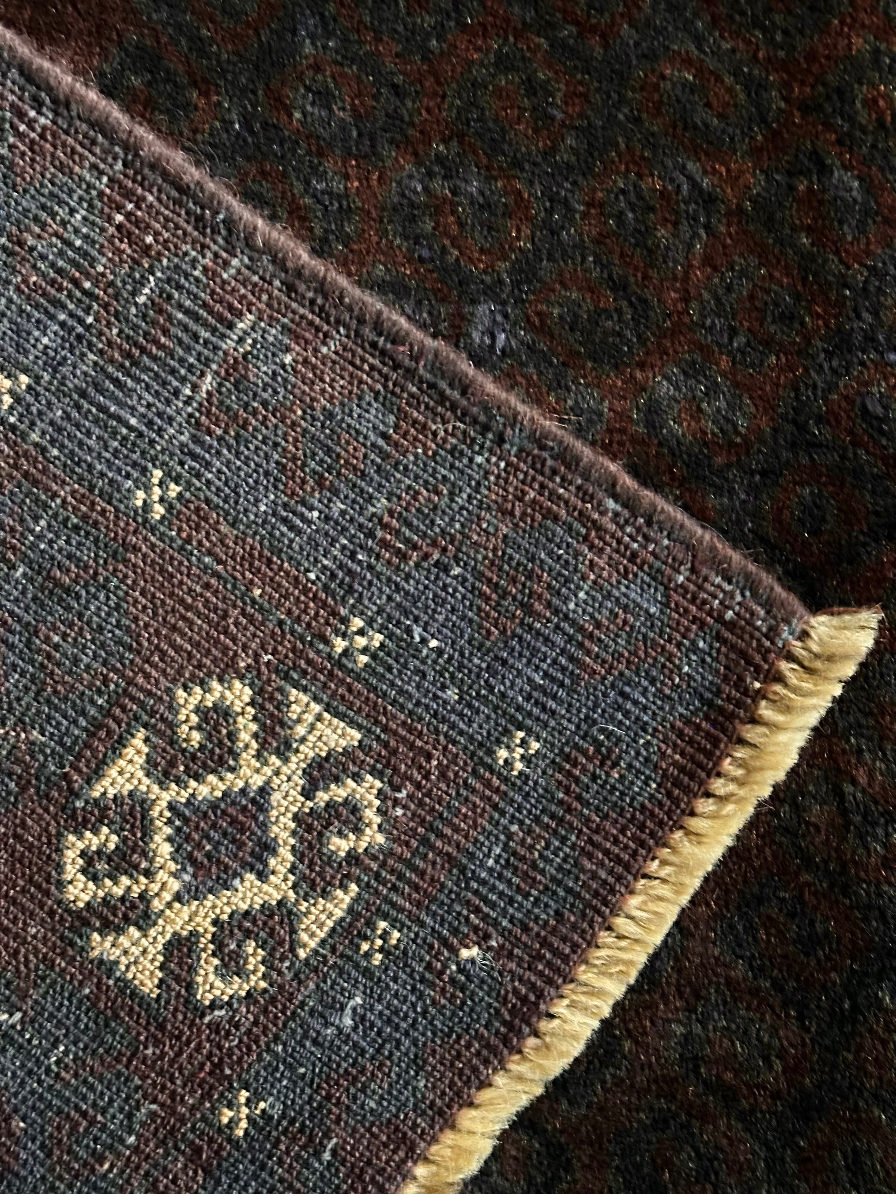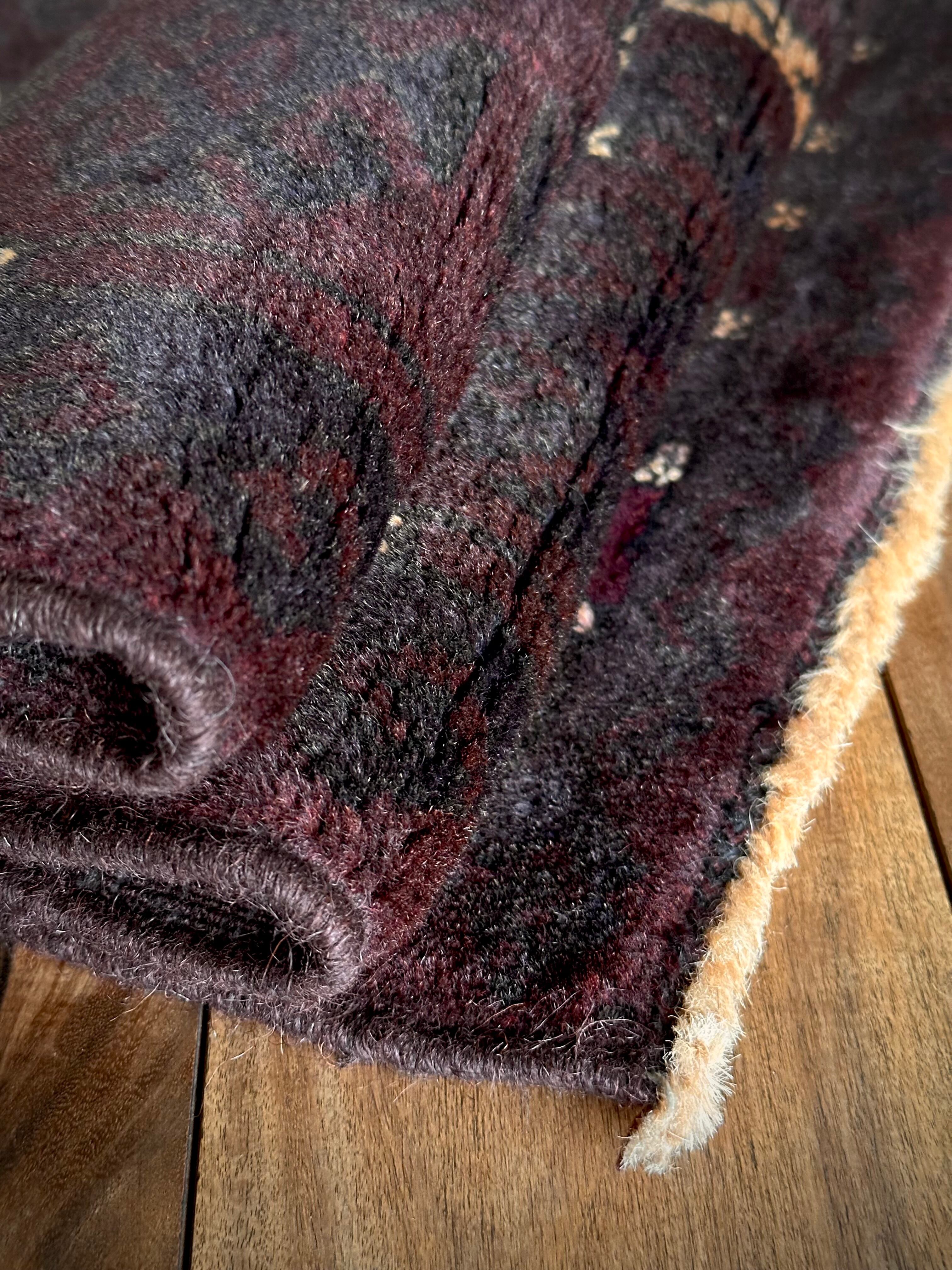 限りなく黒に近いネイビーに深みのあるバーガンディの色合いがかっこいい、アフガニスタンはヘラート州に居住するバルーチ族のトライバルラグで、室内では真っ黒に見えてしまいますが、陽に当たると見違える表情がバルーチらしい1枚になります。