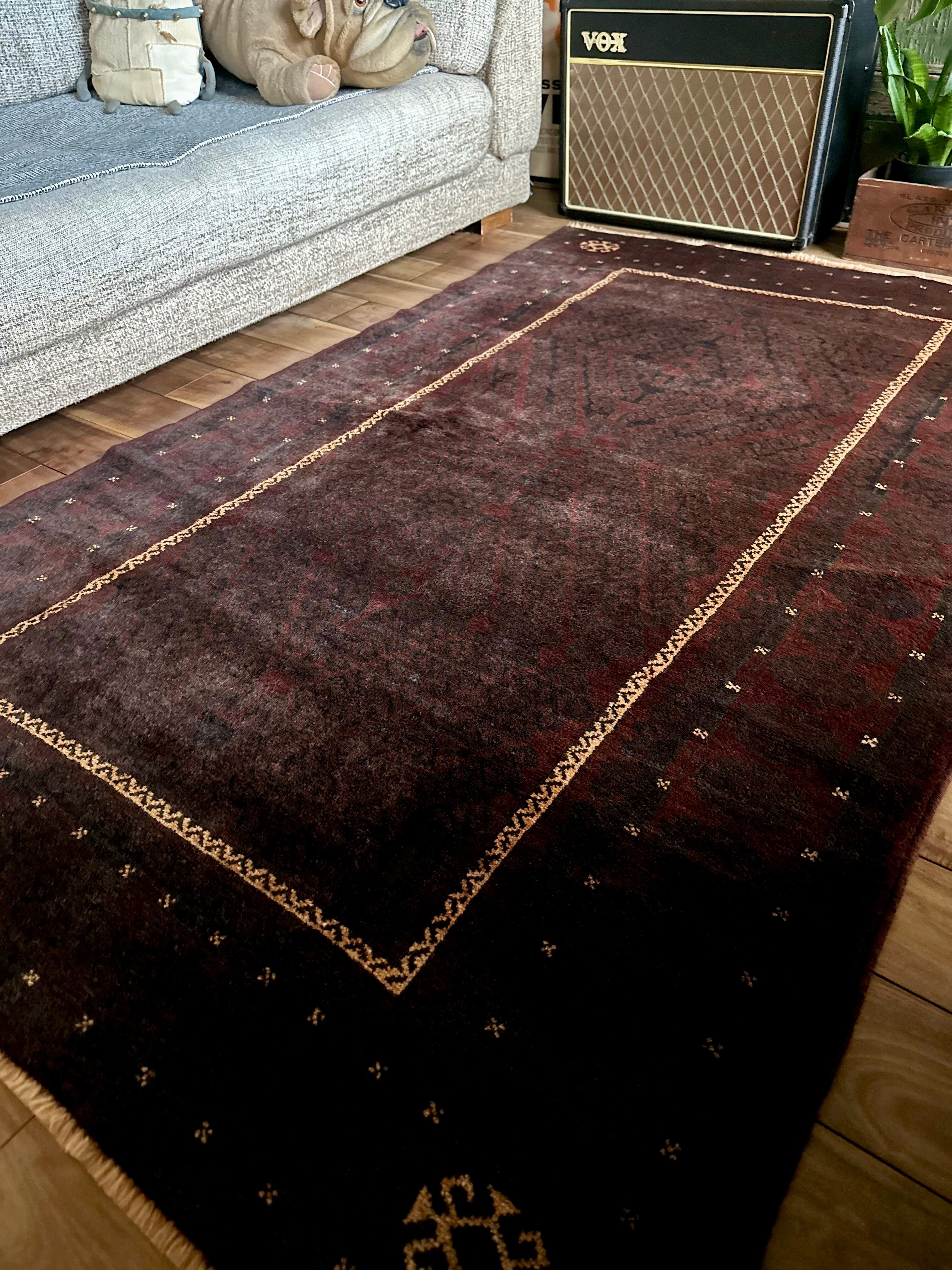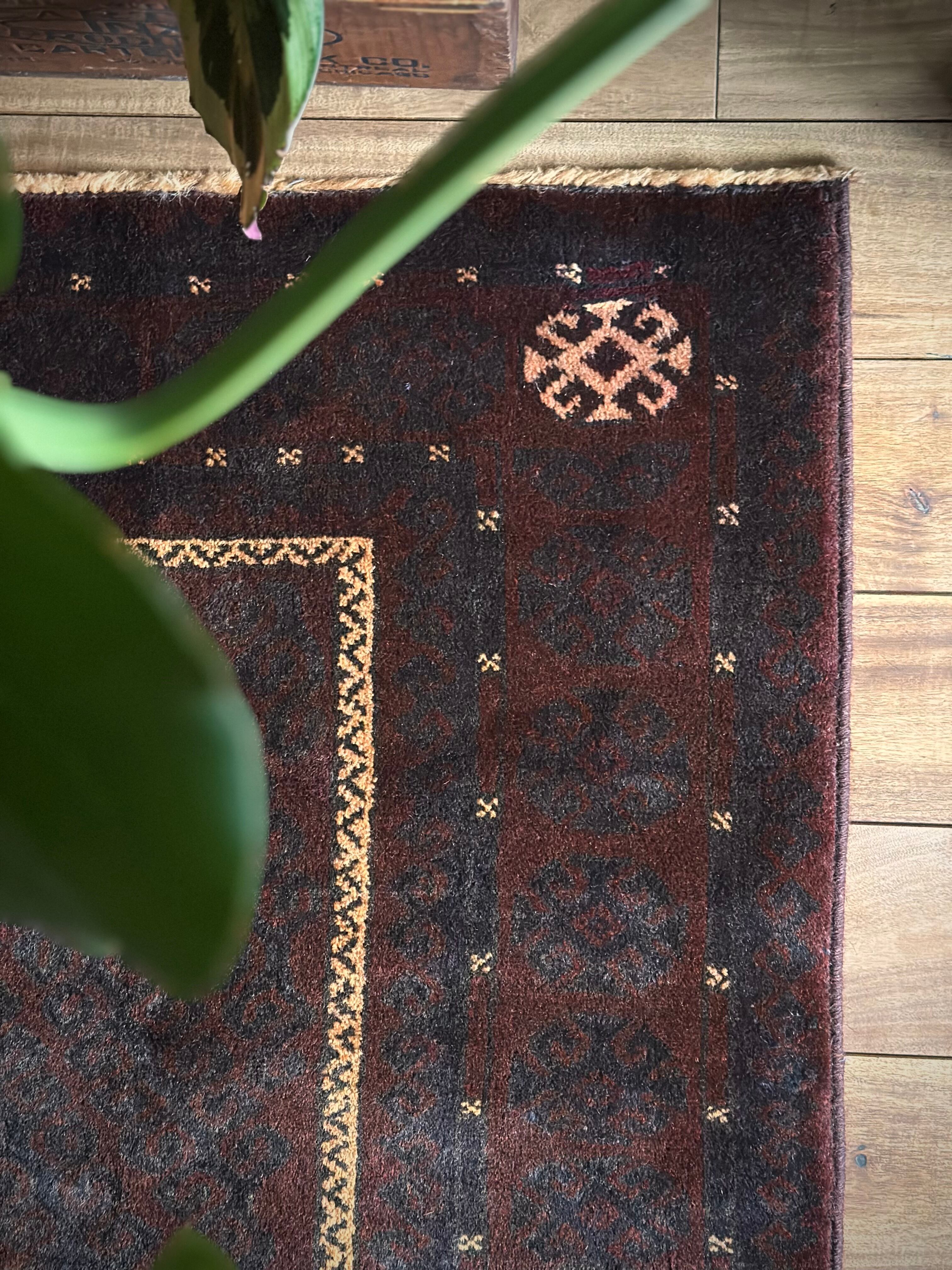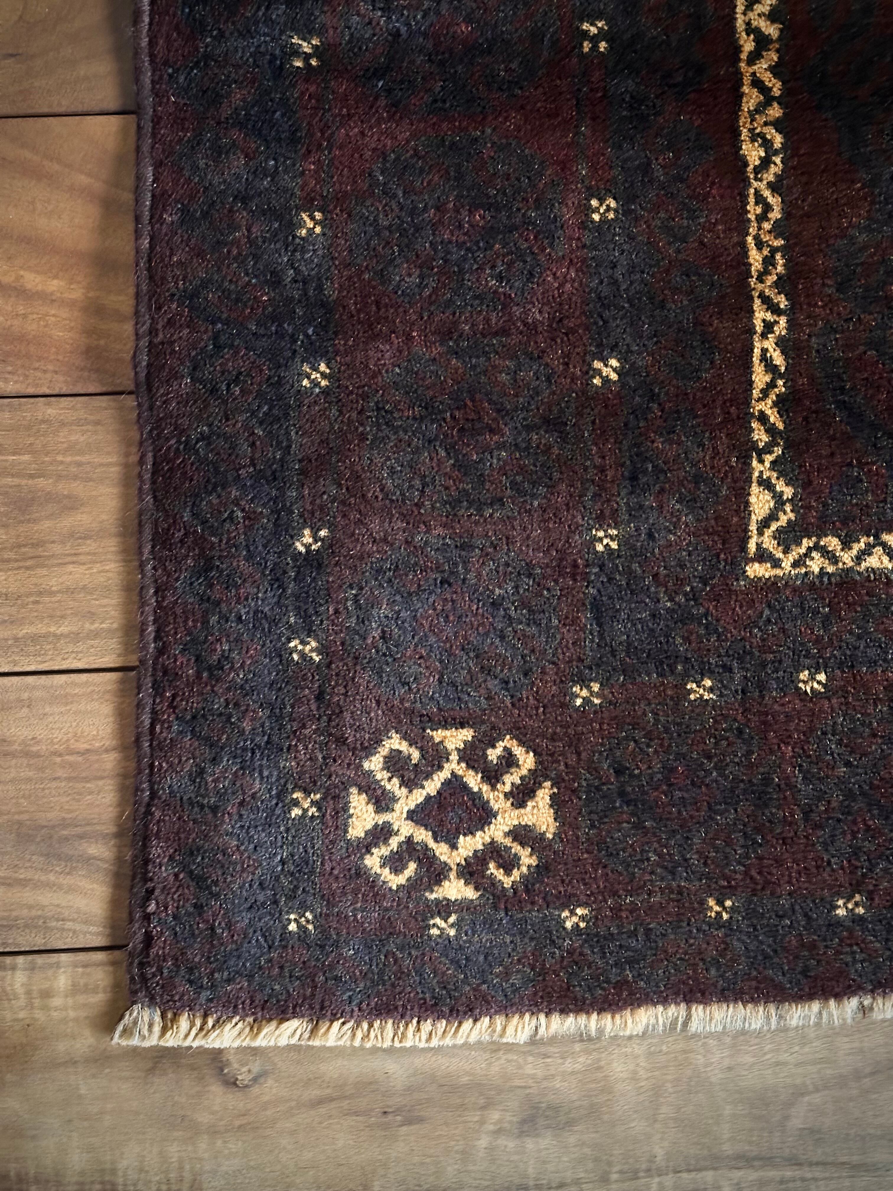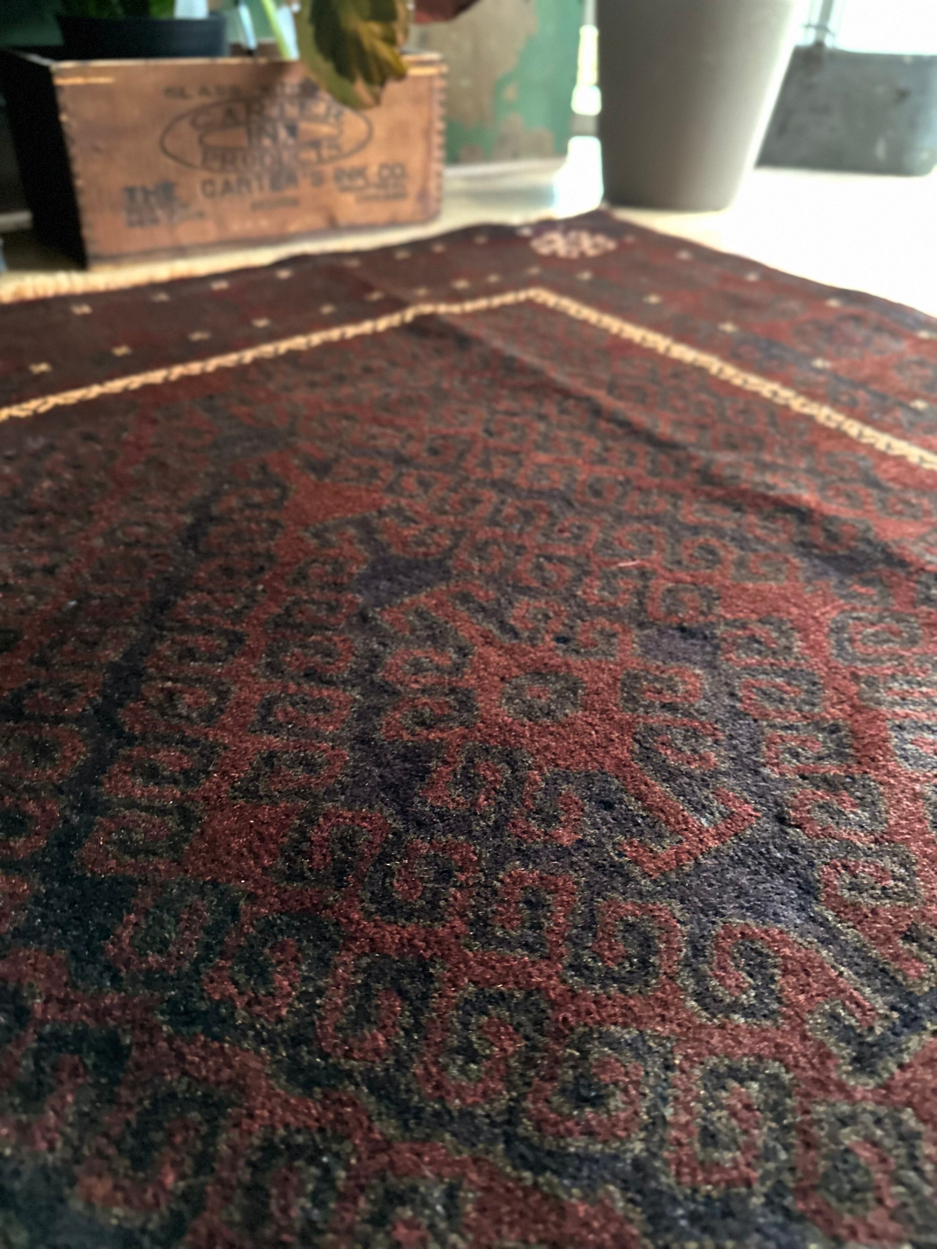 限りなく黒に近いネイビーに深みのあるバーガンディの色合いがかっこいい、アフガニスタンはヘラート州に居住するバルーチ族のトライバルラグで、室内では真っ黒に見えてしまいますが、陽に当たると見違える表情がバルーチらしい1枚になります。