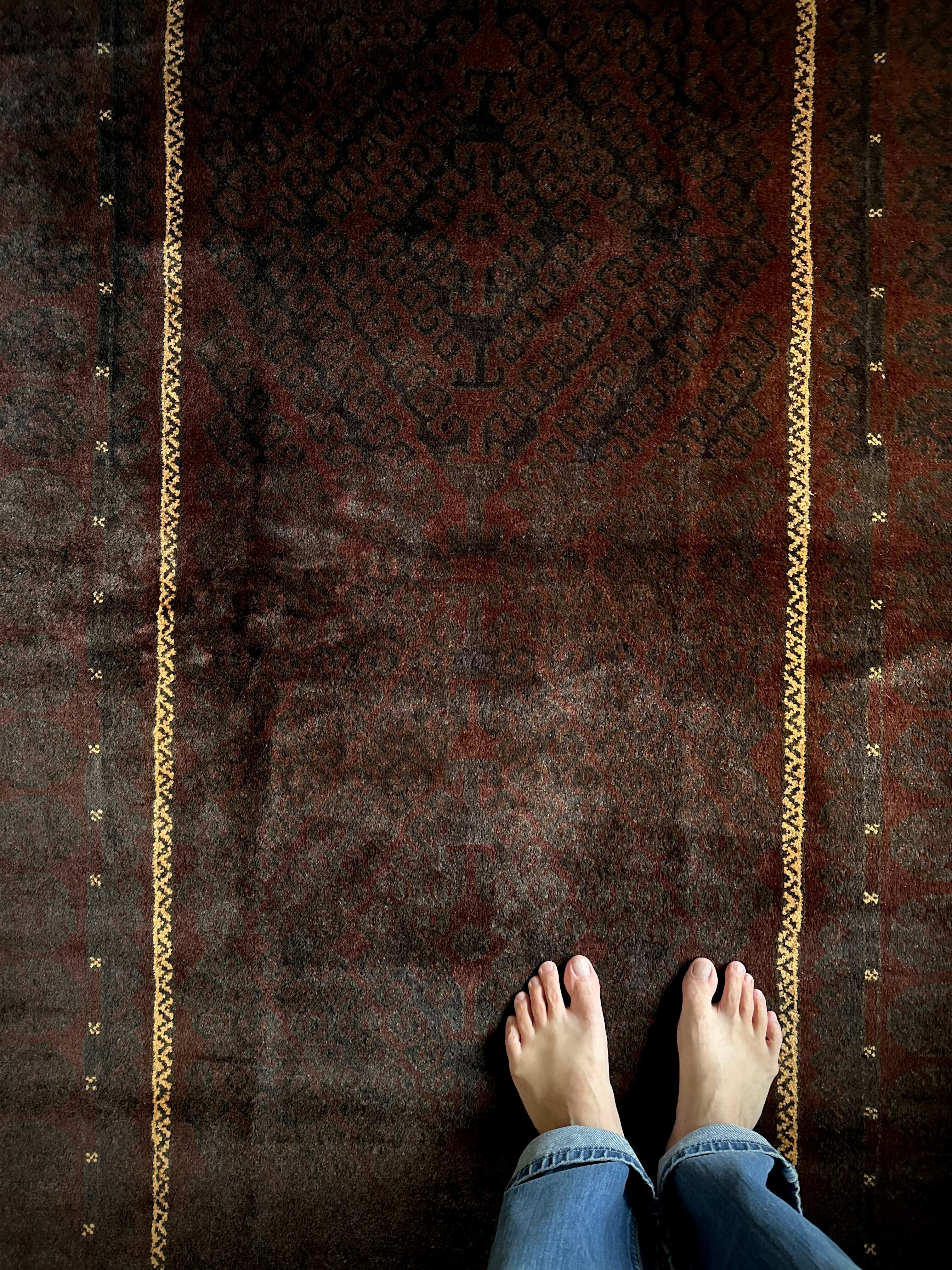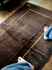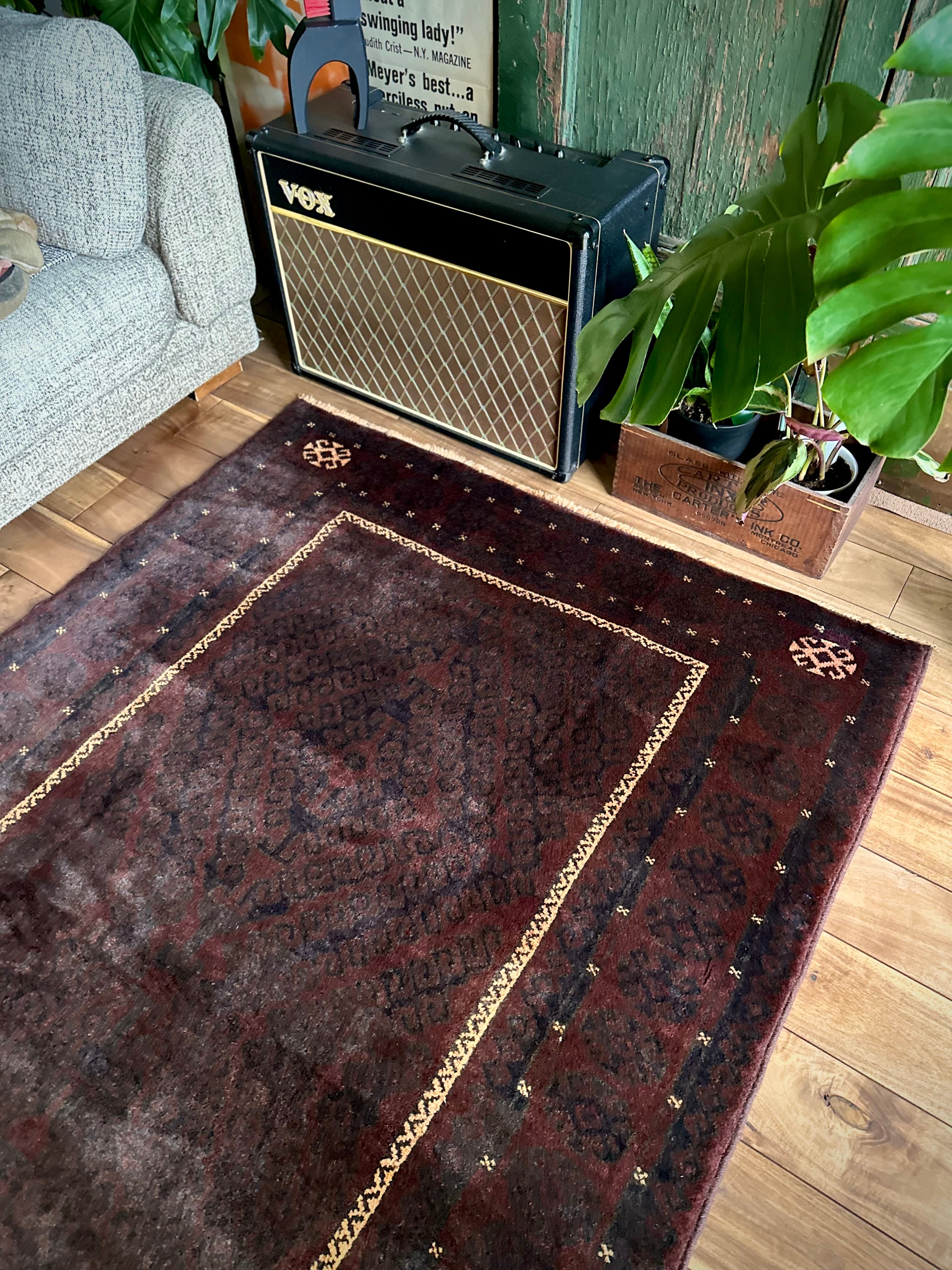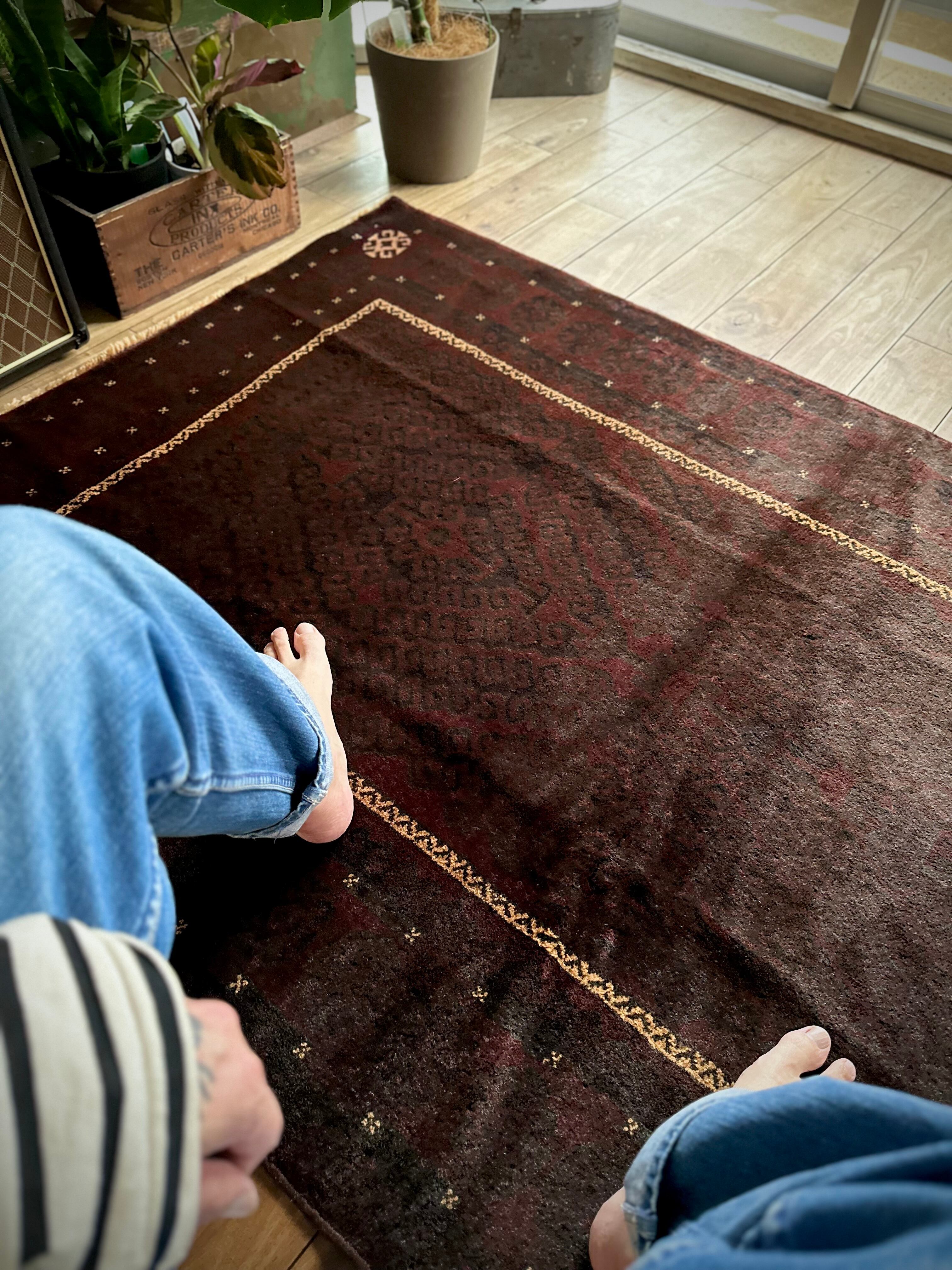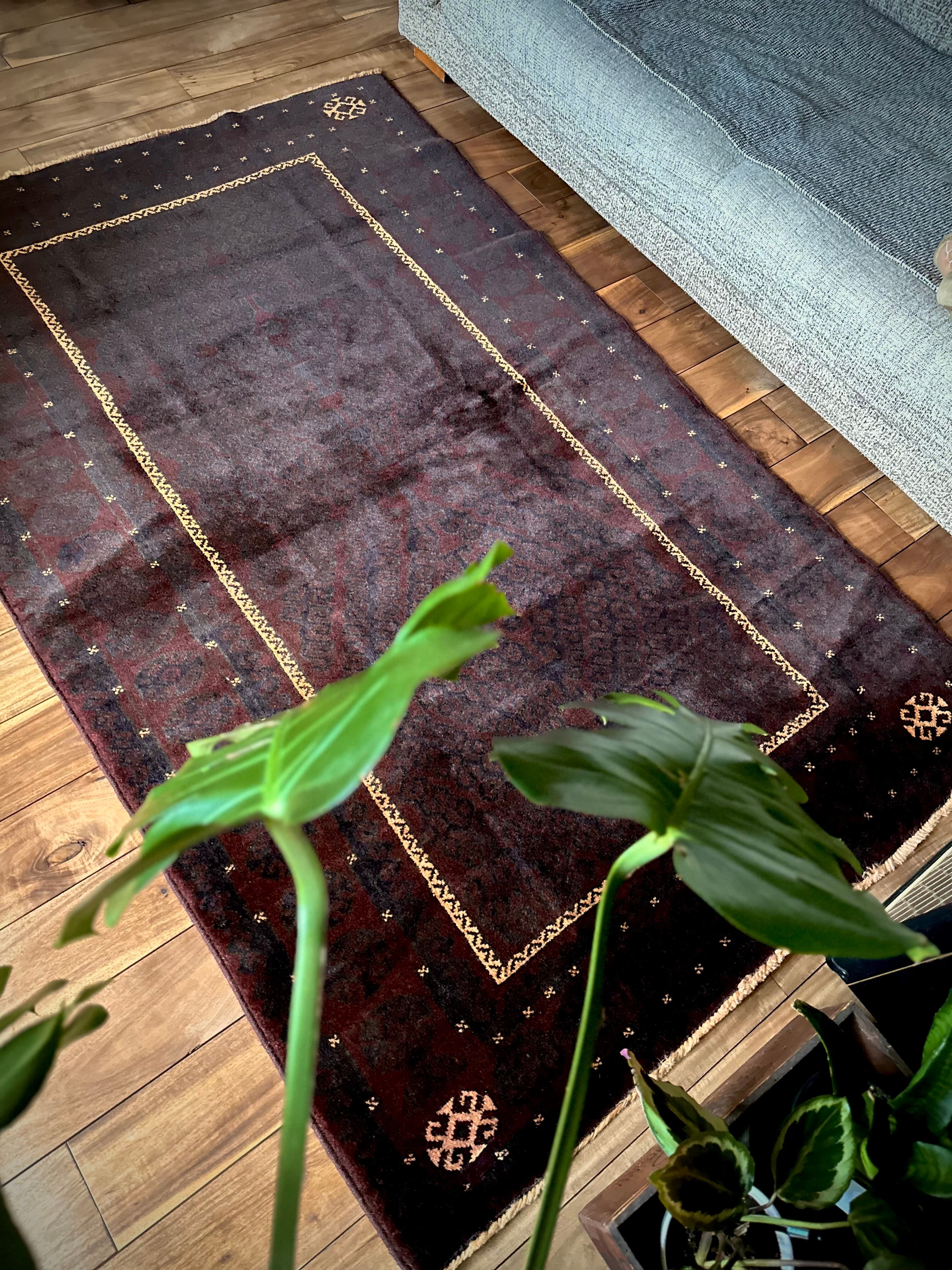 限りなく黒に近いネイビーに深みのあるバーガンディの色合いがかっこいい、アフガニスタンはヘラート州に居住するバルーチ族のトライバルラグで、室内では真っ黒に見えてしまいますが、陽に当たると見違える表情がバルーチらしい1枚になります。