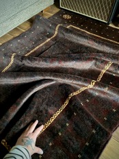 アフガン系バルーチによく見られる”Zanjir gul”と呼ばれる紋様に、漆黒の中に浮き上がるホワイトラインが「闇夜に光るダイヤモンド」と言われるバルーチらしい技法で、色飛びしてしまうほどの艶やかなパイルに惚れ惚れしてしまいます。