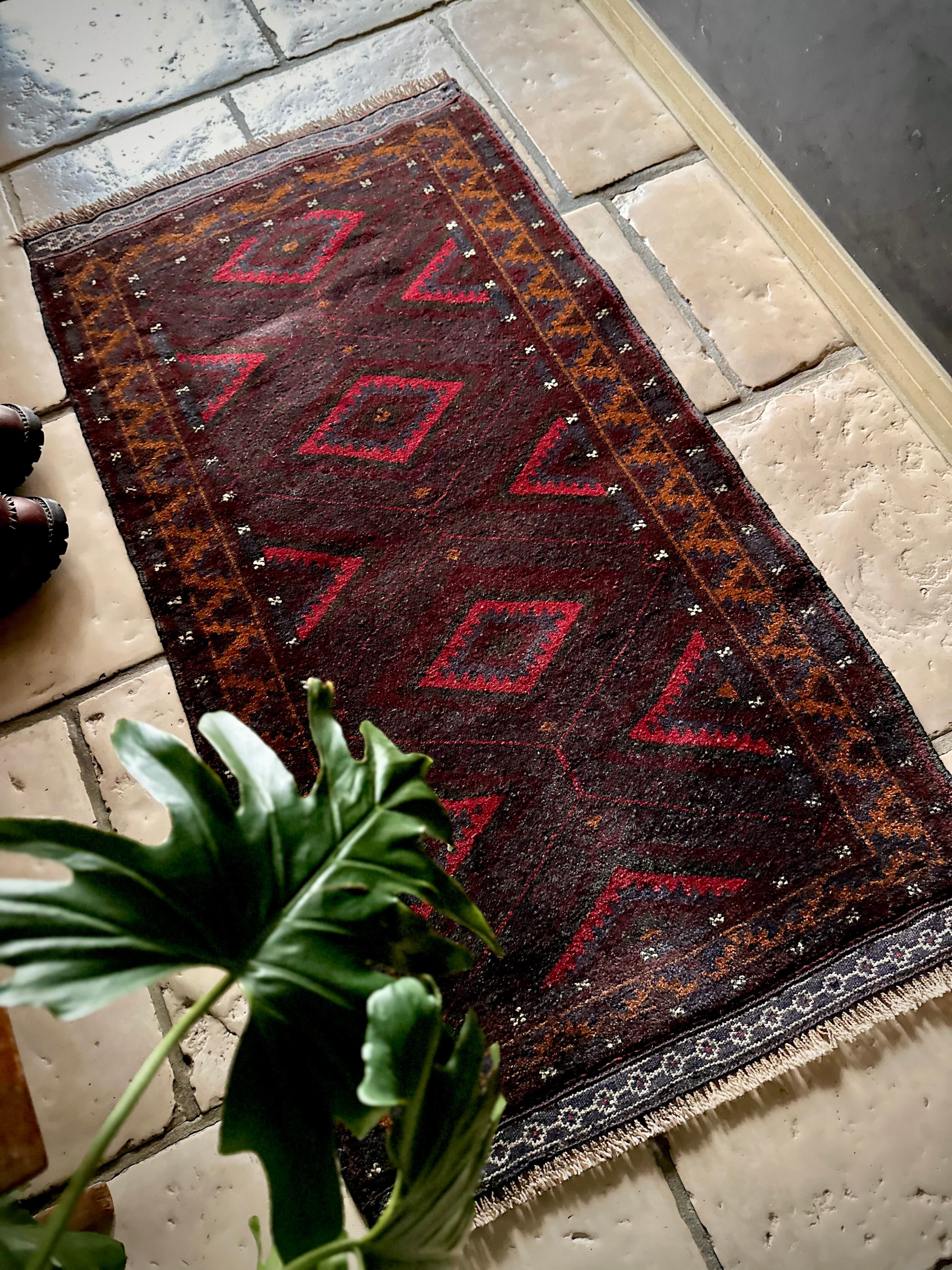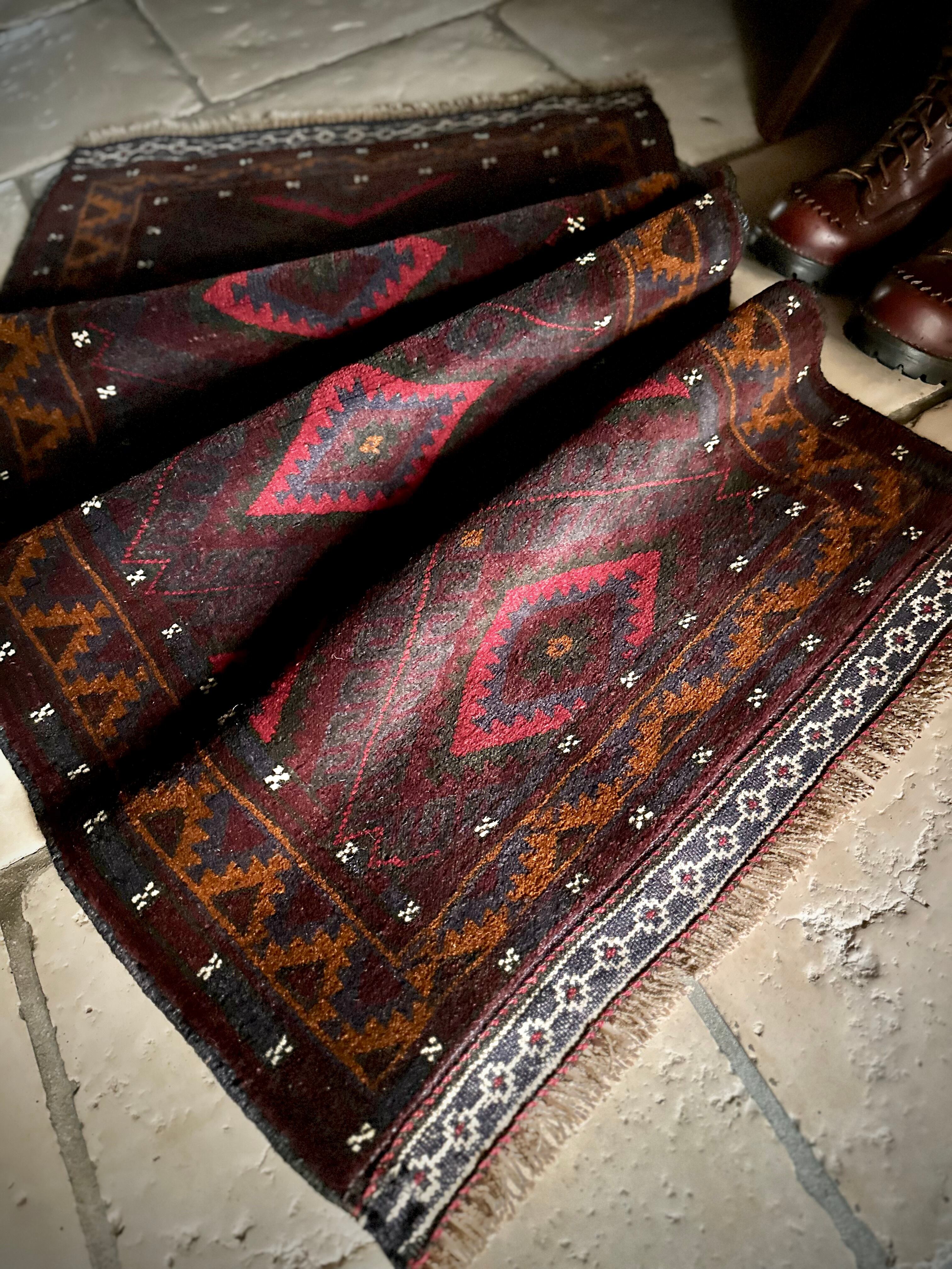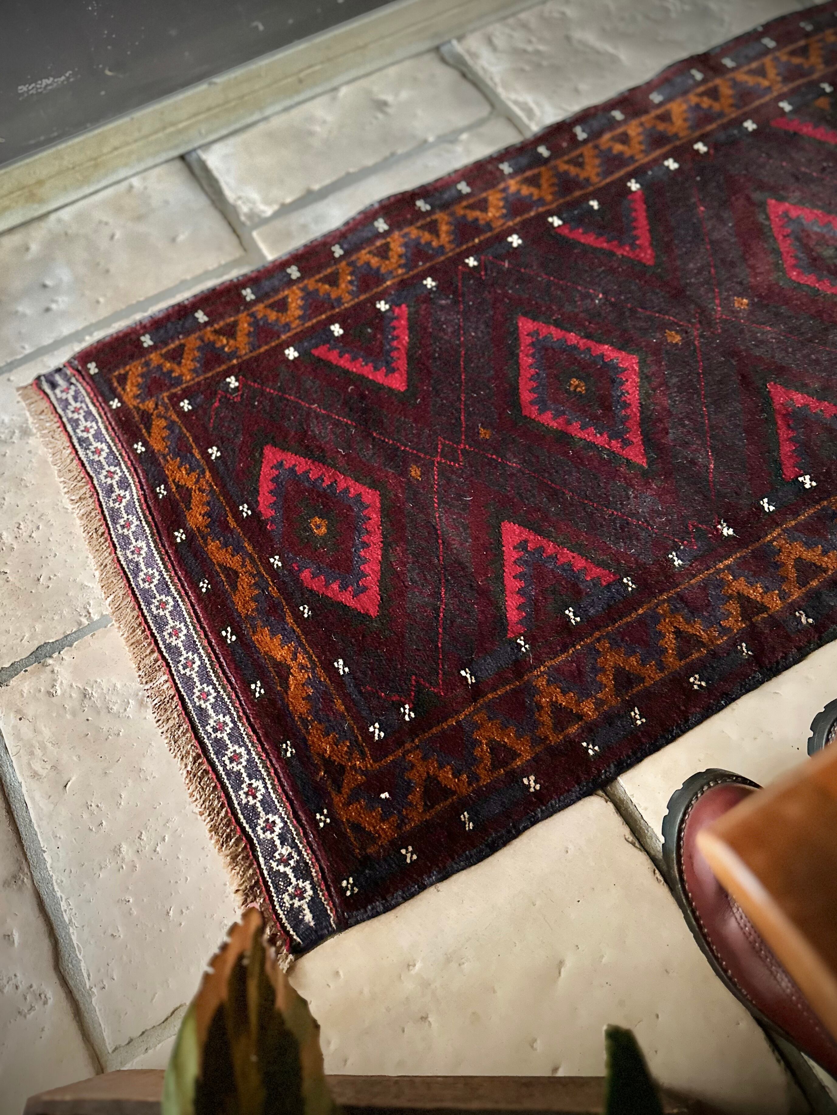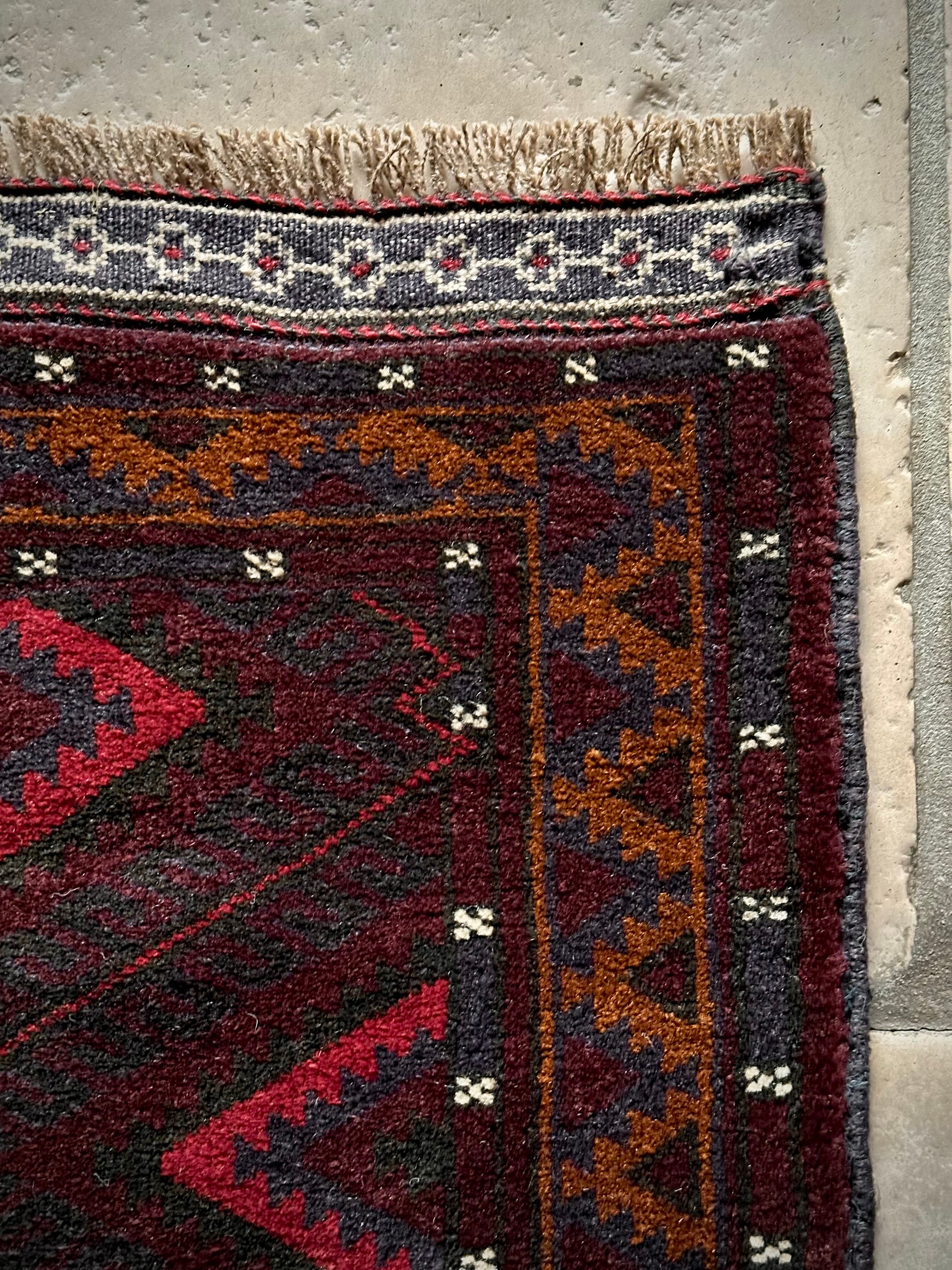 深みのあるボルドーとブラックの判別し辛いコンビネーションに、レッドとテラコッタでアクセントをつけたこちらは、アフガニスタンはヘラート州に居住するバルーチ族のトライバルラグで、元は家財道具を収納したりクッションとして使用されるバーリシトという袋状の表皮をラグに仕立て直してもらったモノになります。