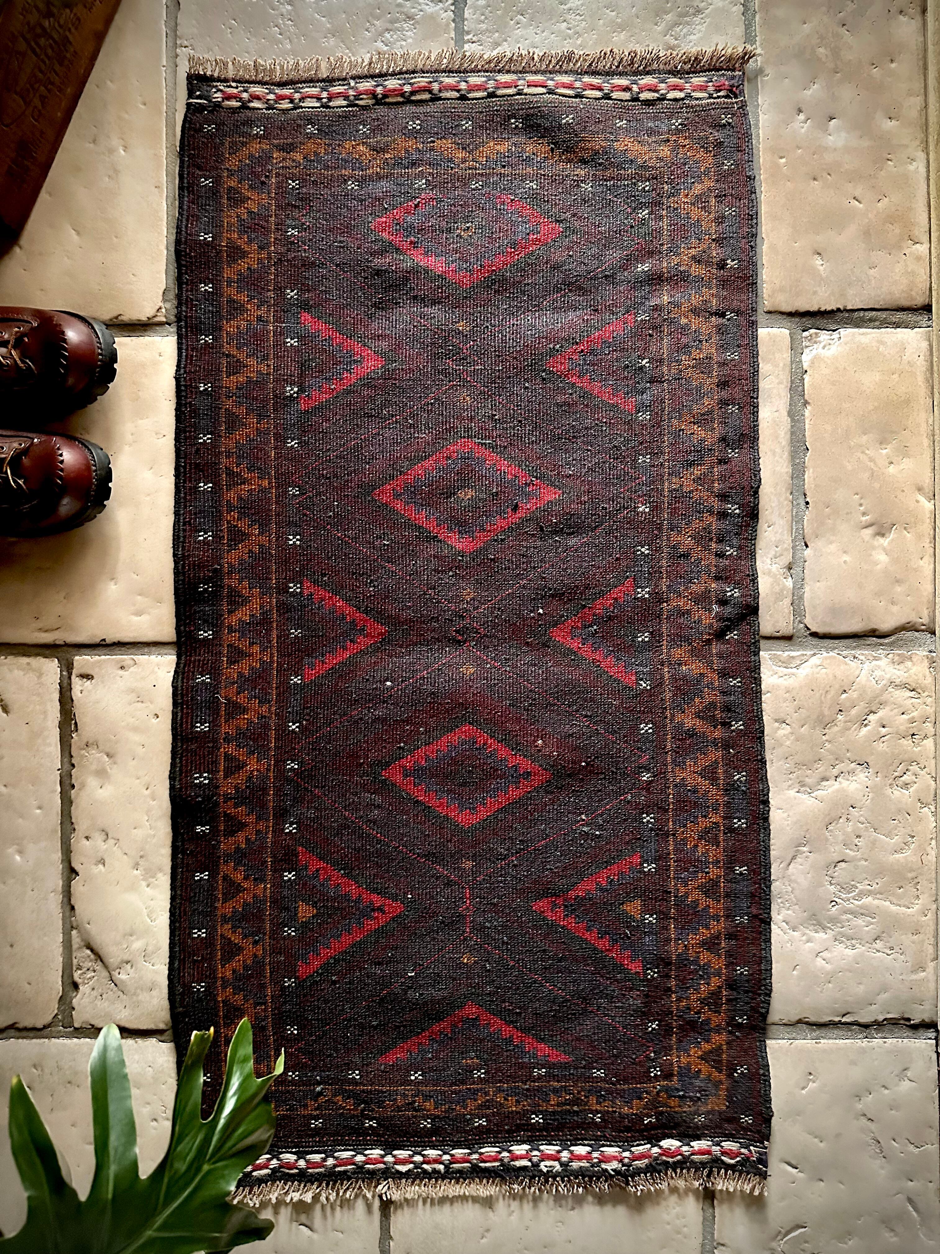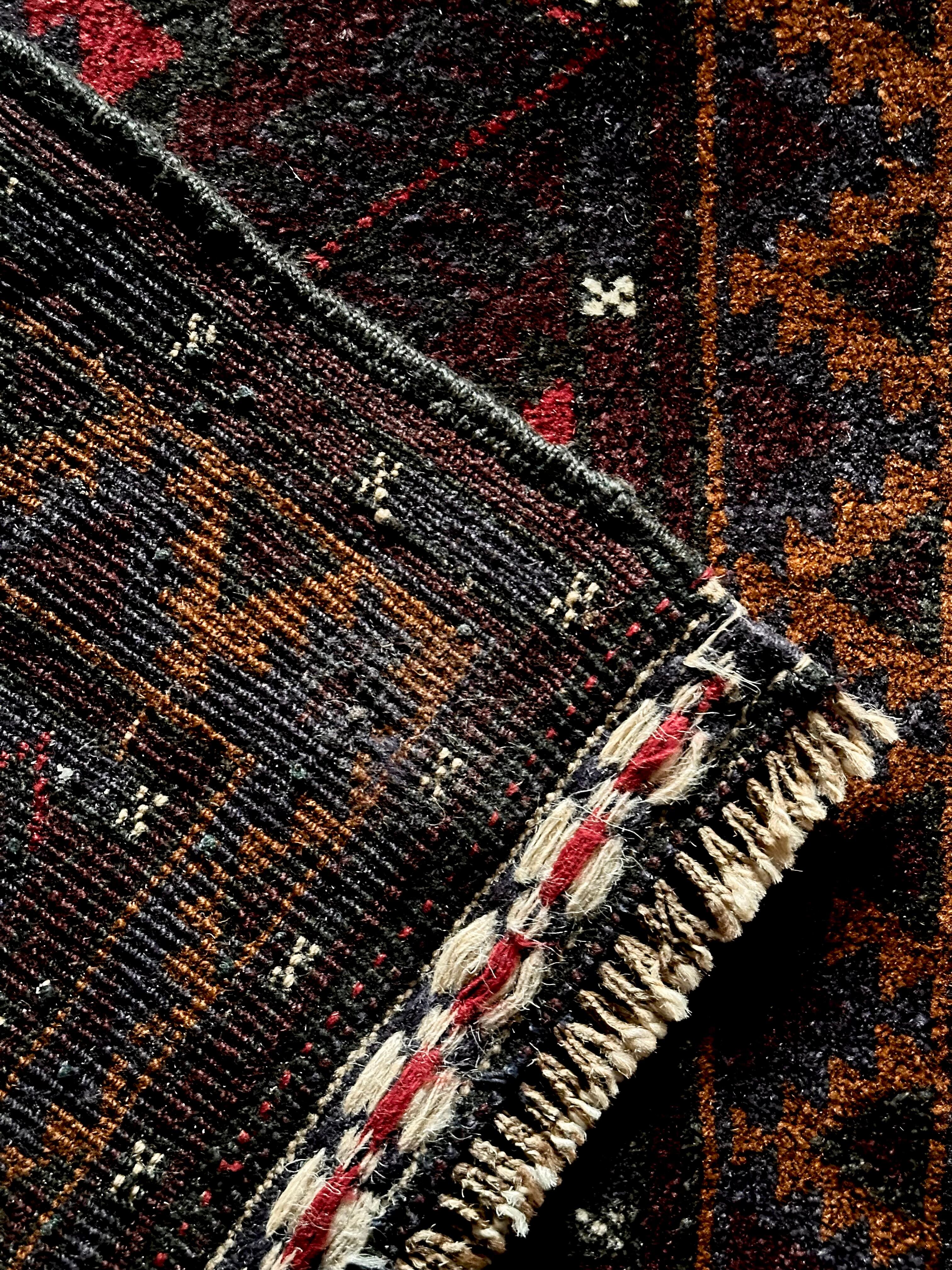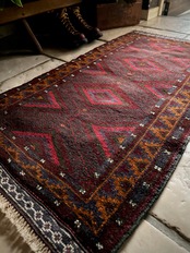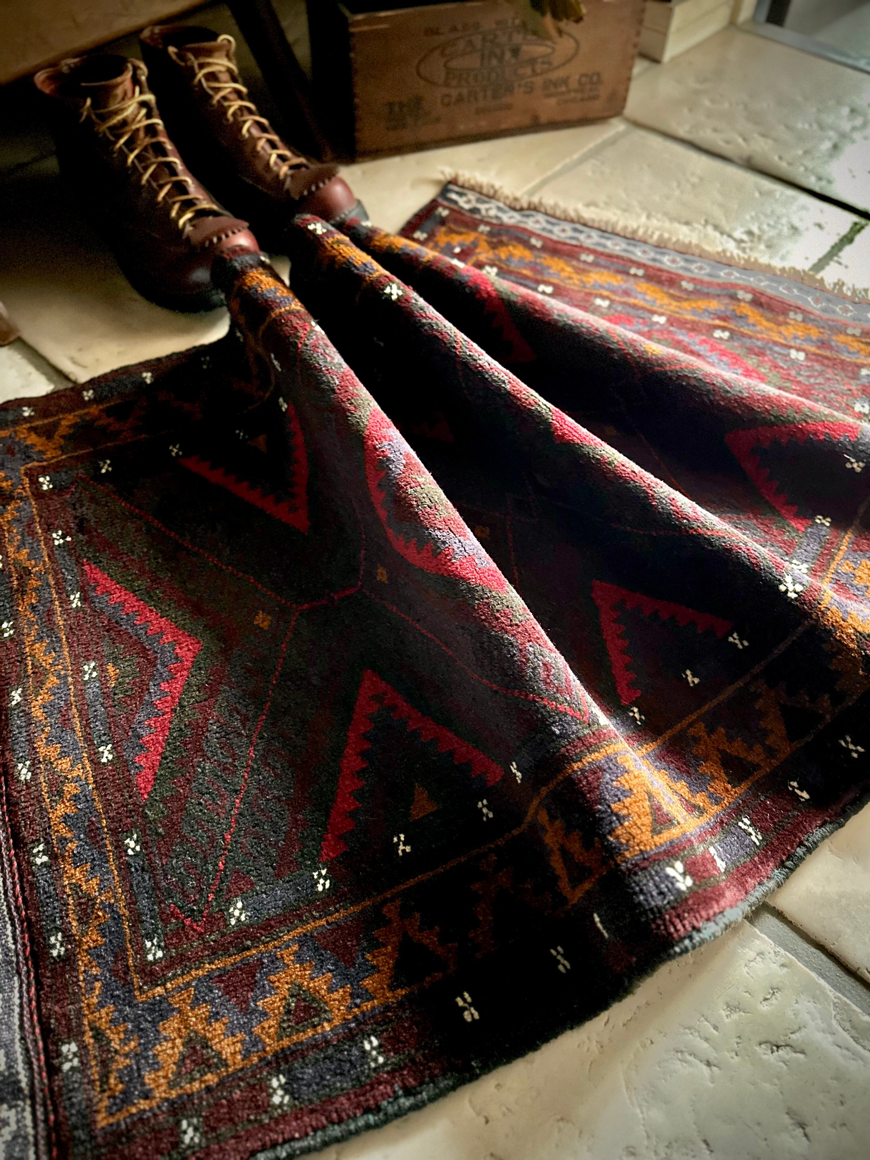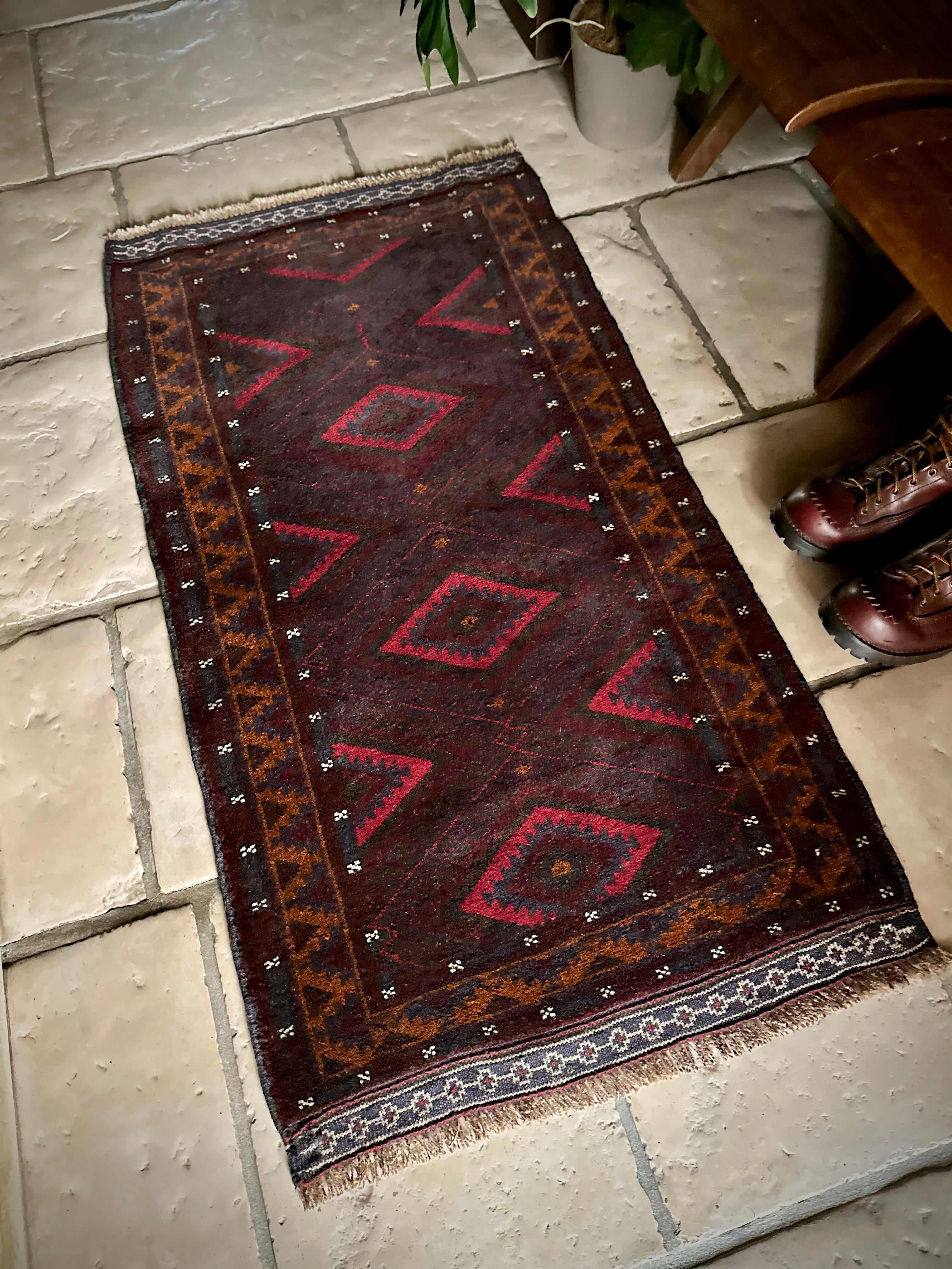 深みのあるボルドーとブラックの判別し辛いコンビネーションに、レッドとテラコッタでアクセントをつけたこちらは、アフガニスタンはヘラート州に居住するバルーチ族のトライバルラグで、元は家財道具を収納したりクッションとして使用されるバーリシトという袋状の表皮をラグに仕立て直してもらったモノになります。