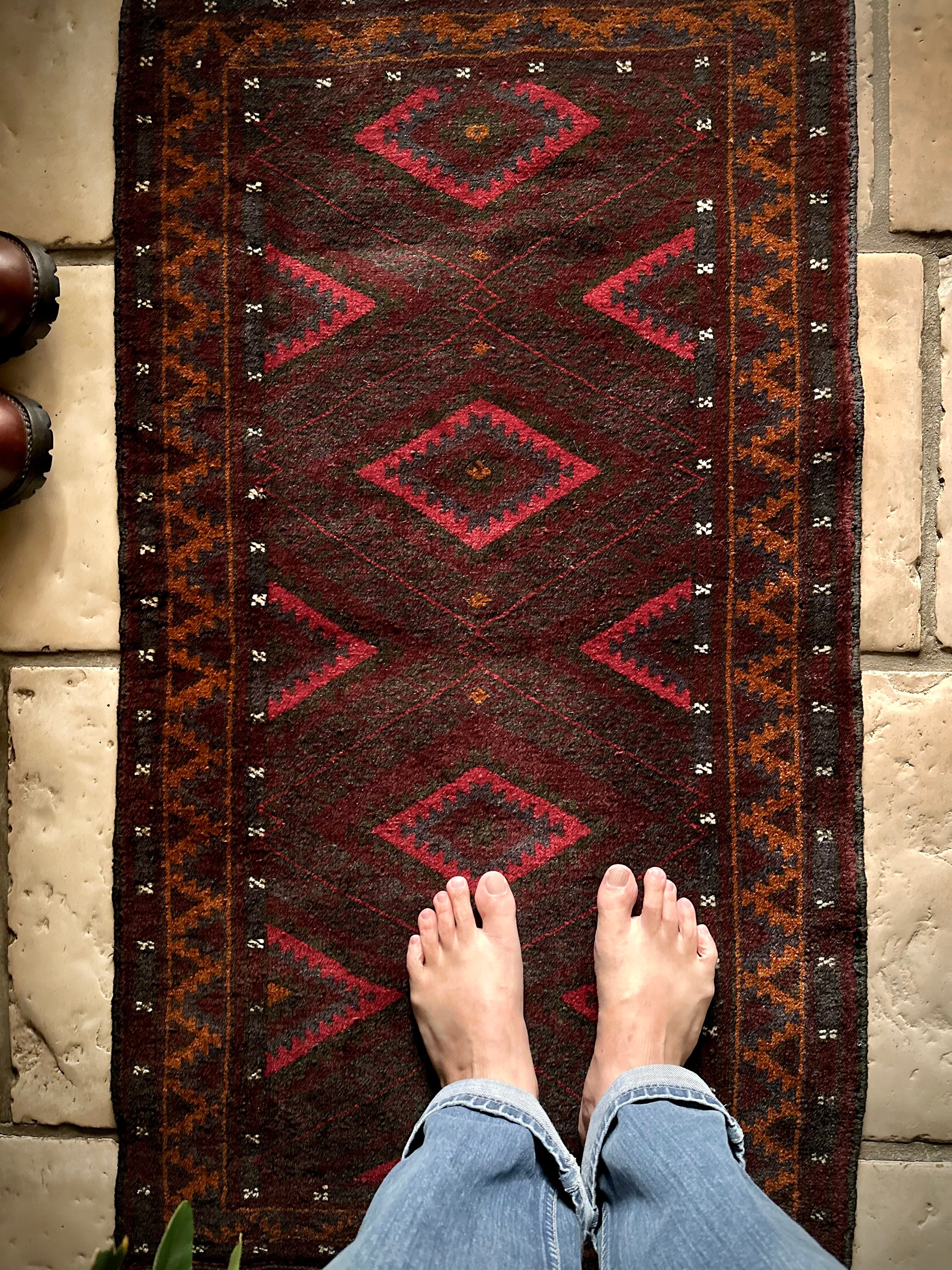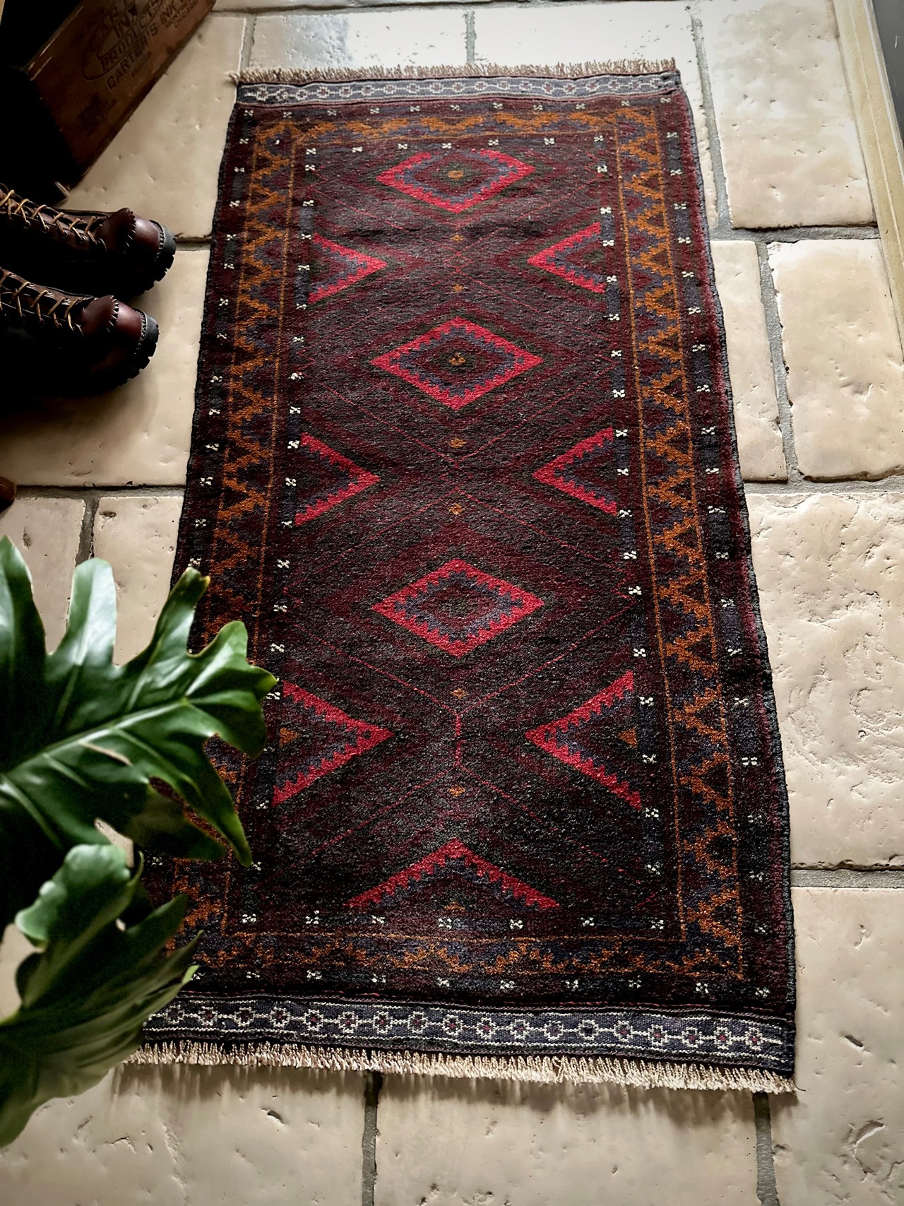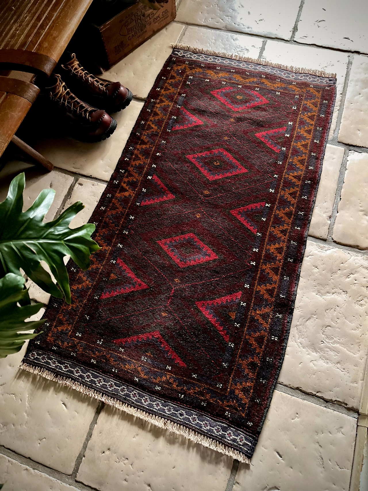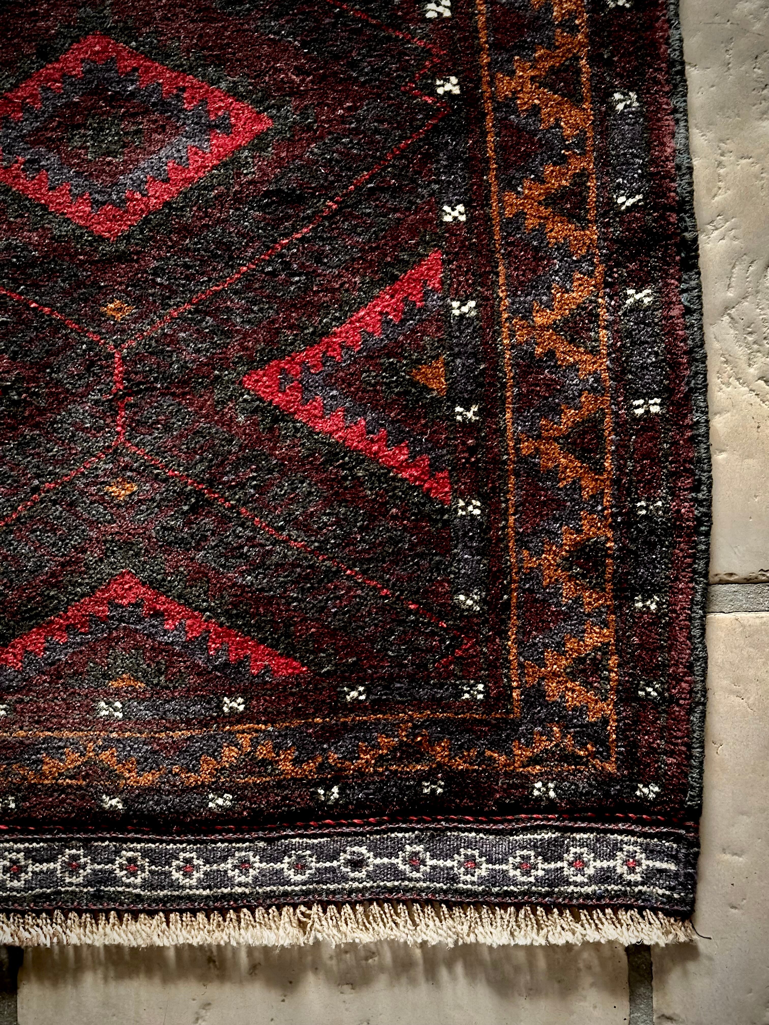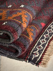 深みのあるボルドーとブラックの判別し辛いコンビネーションに、レッドとテラコッタでアクセントをつけたこちらは、アフガニスタンはヘラート州に居住するバルーチ族のトライバルラグで、元は家財道具を収納したりクッションとして使用されるバーリシトという袋状の表皮をラグに仕立て直してもらったモノになります。