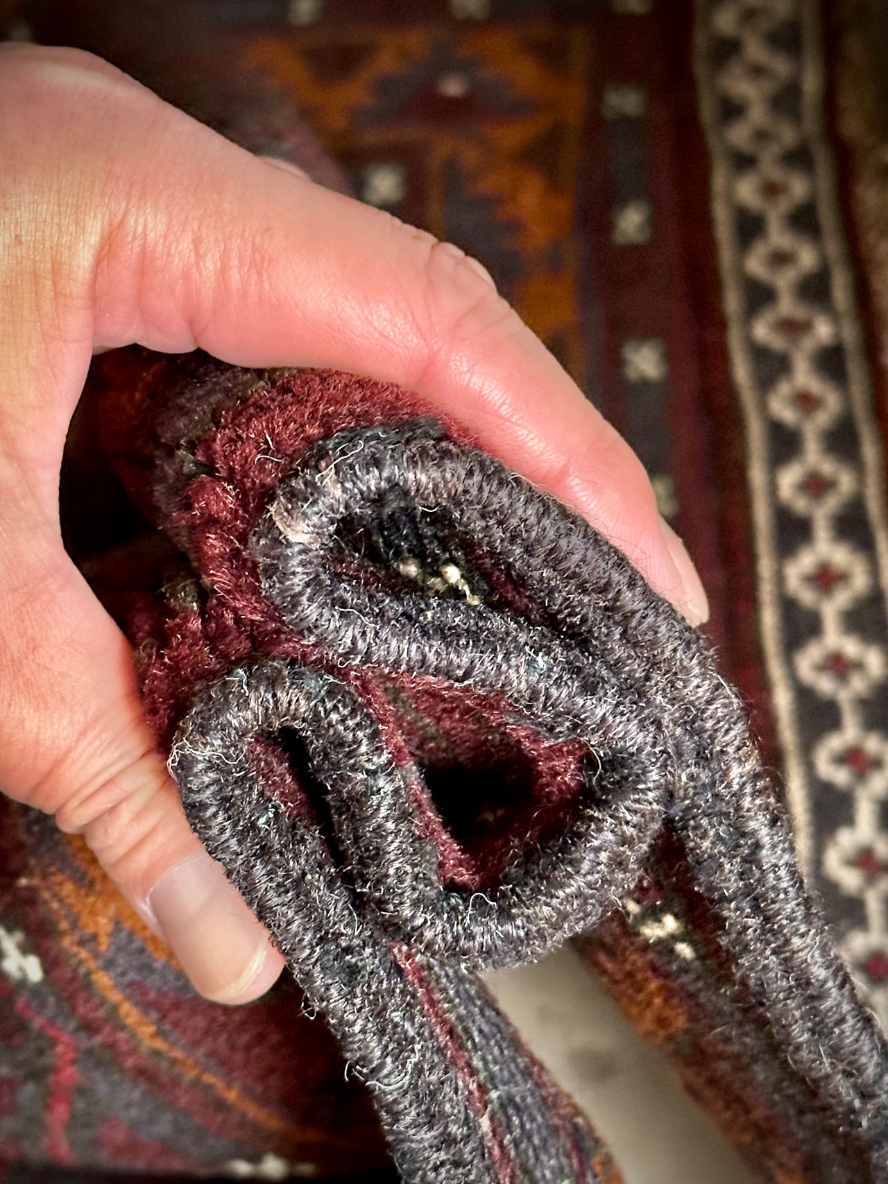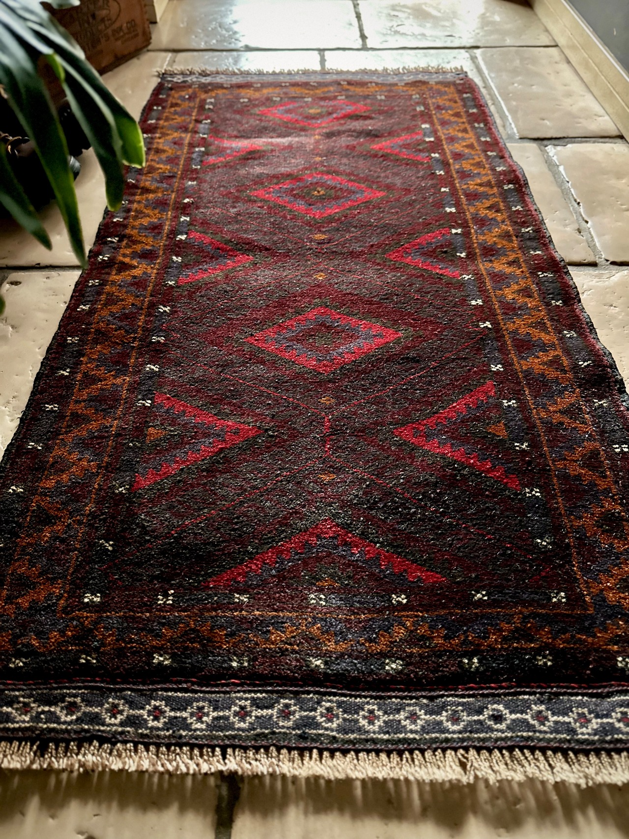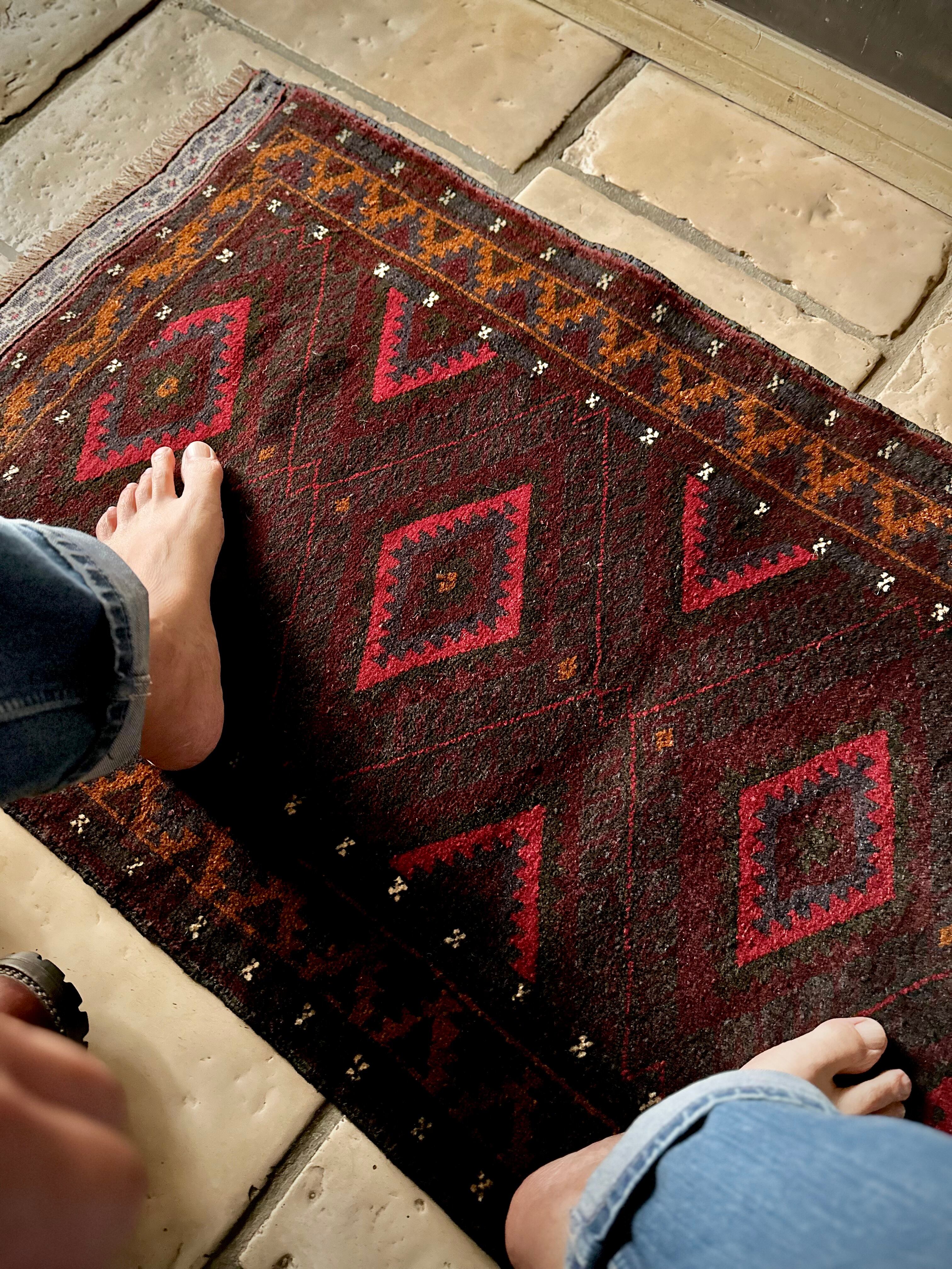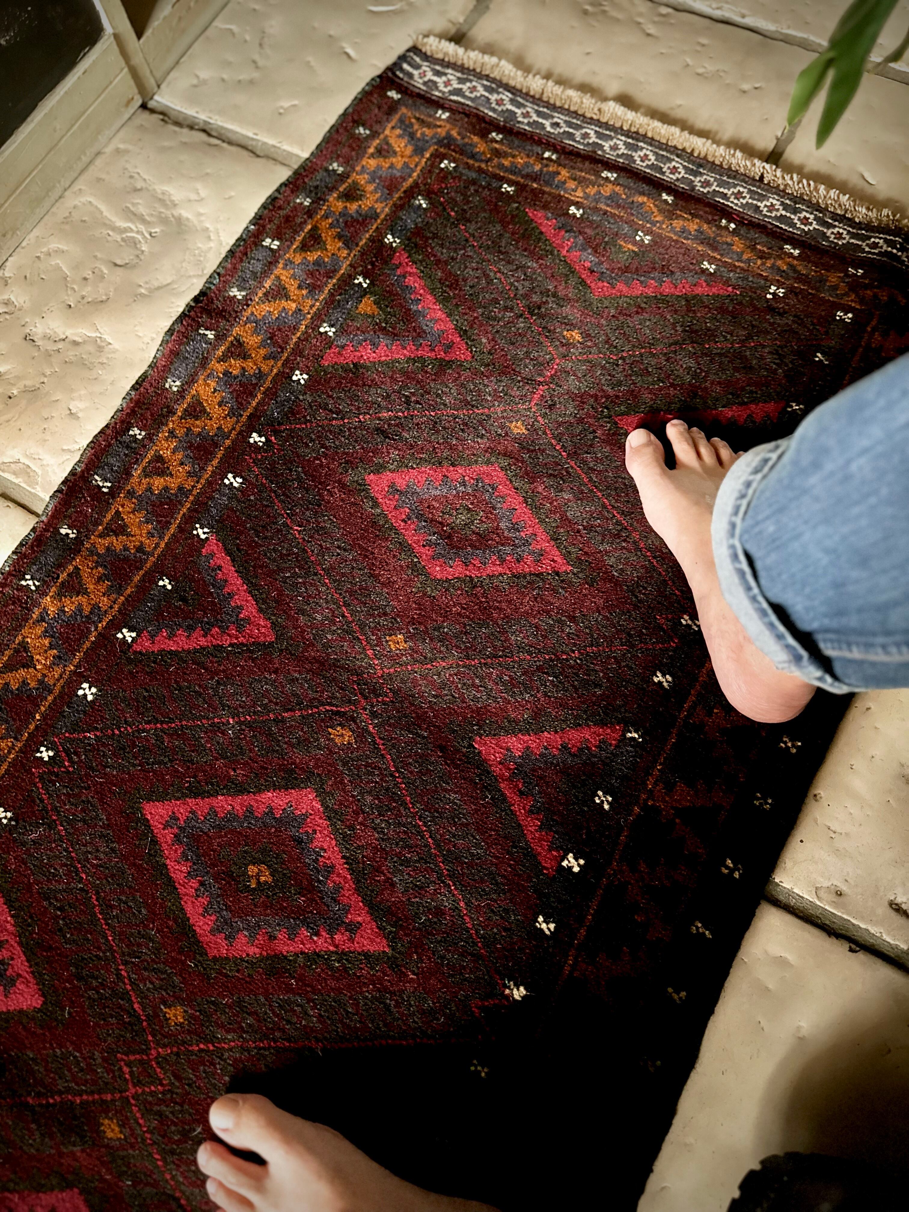 深みのあるボルドーとブラックの判別し辛いコンビネーションに、レッドとテラコッタでアクセントをつけたこちらは、アフガニスタンはヘラート州に居住するバルーチ族のトライバルラグで、元は家財道具を収納したりクッションとして使用されるバーリシトという袋状の表皮をラグに仕立て直してもらったモノになります。