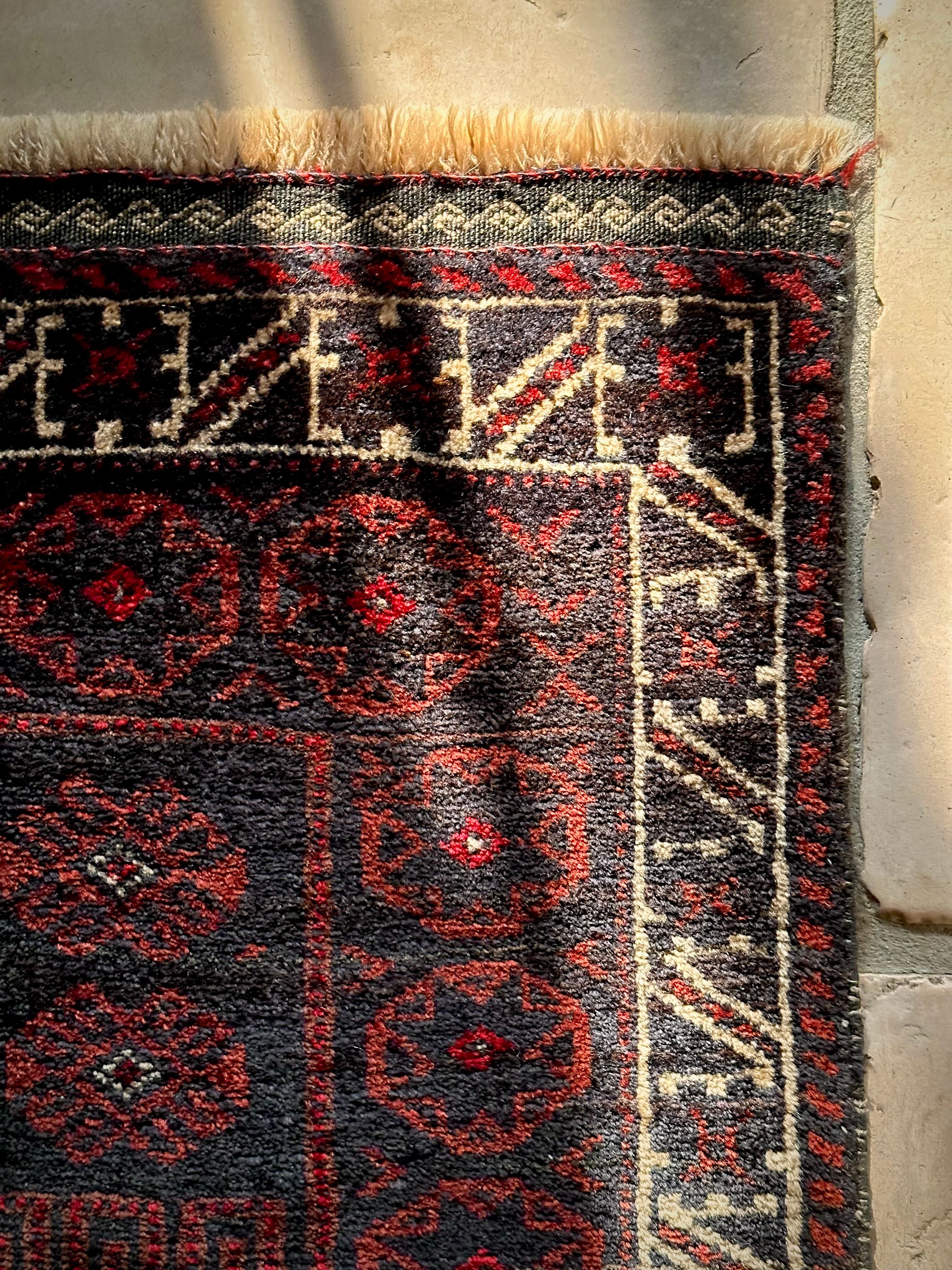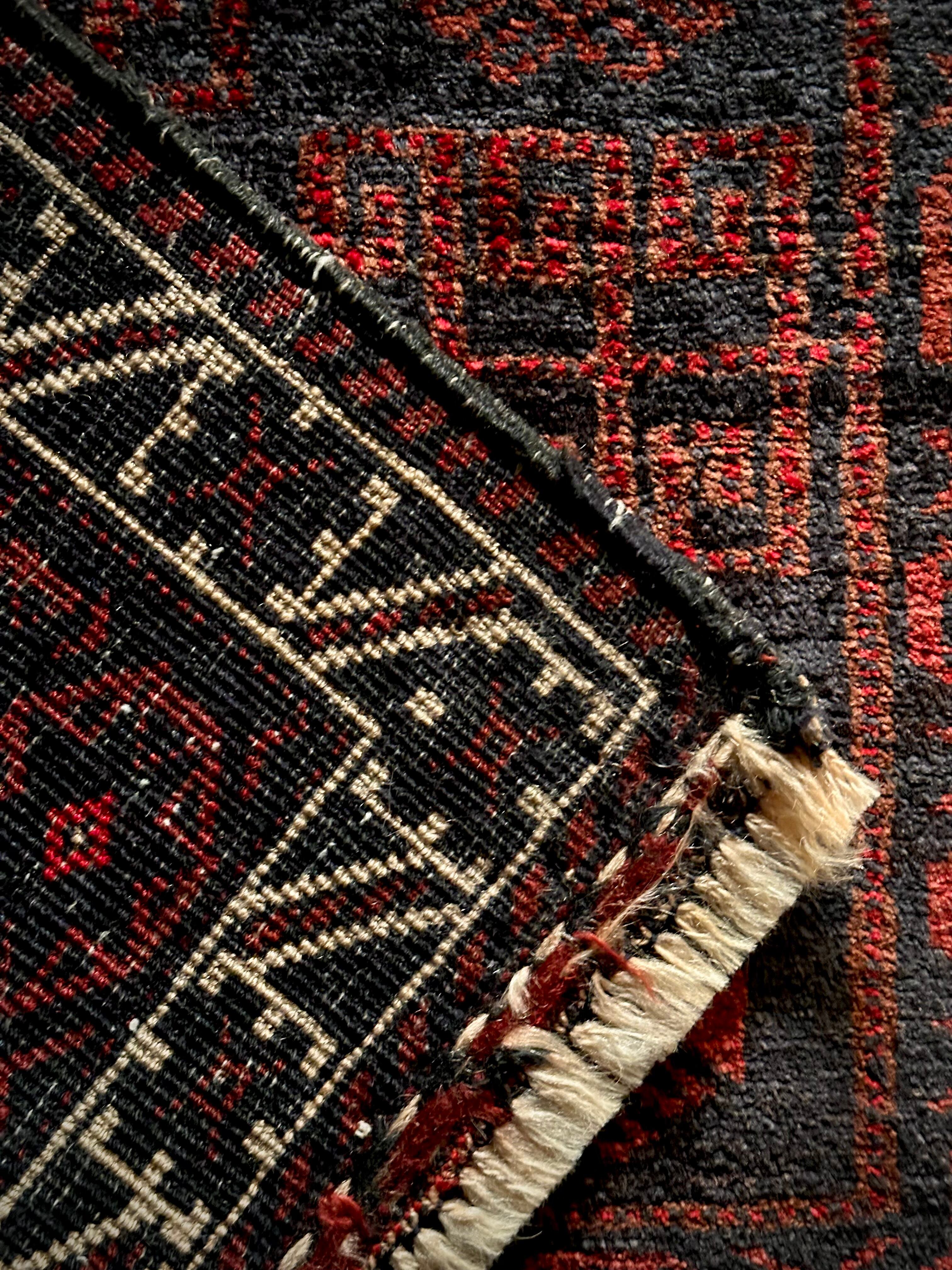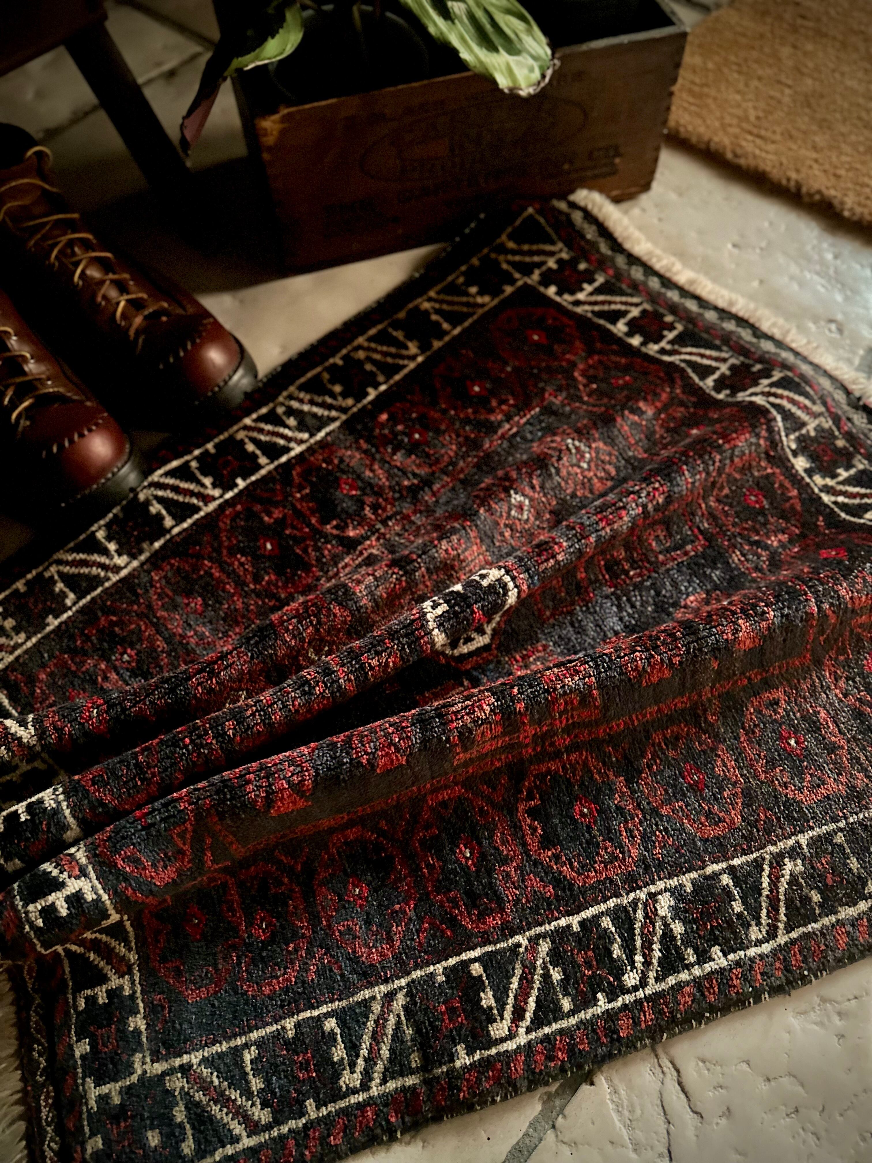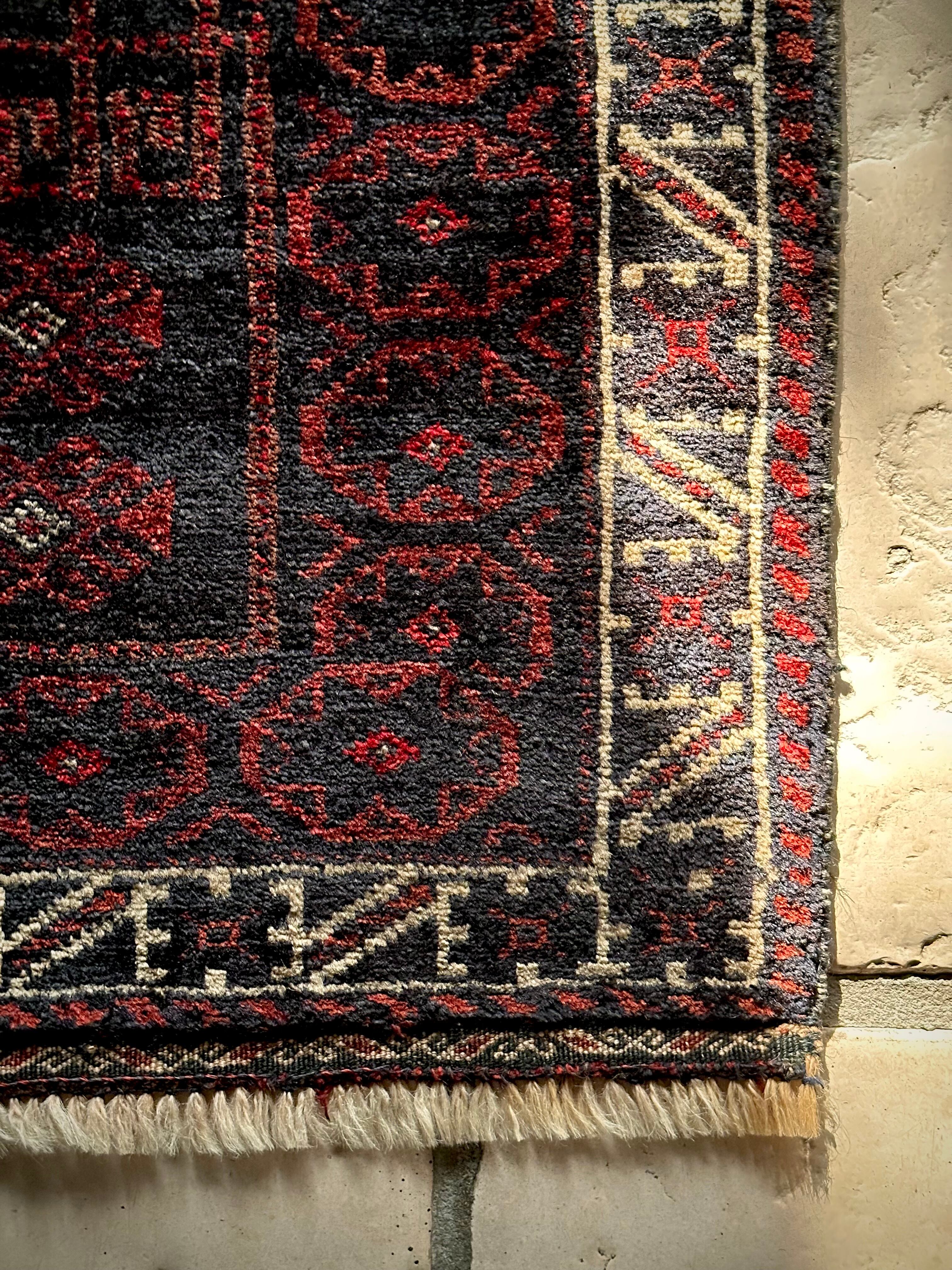ブラックに近いネイビーのベースに赤と白でシンプルな紋様が織り込まれたこちらは、アフガニスタンはヘラート州に居住するバルーチ族のトライバルラグで、ロバやラクダに跨がせるホルジンと呼ばれるサドルバッグの表皮をラグに仕立て直したモノになり、通常のバッグフェイスよりもひと回り大きなサイズ感が希少ではあります。