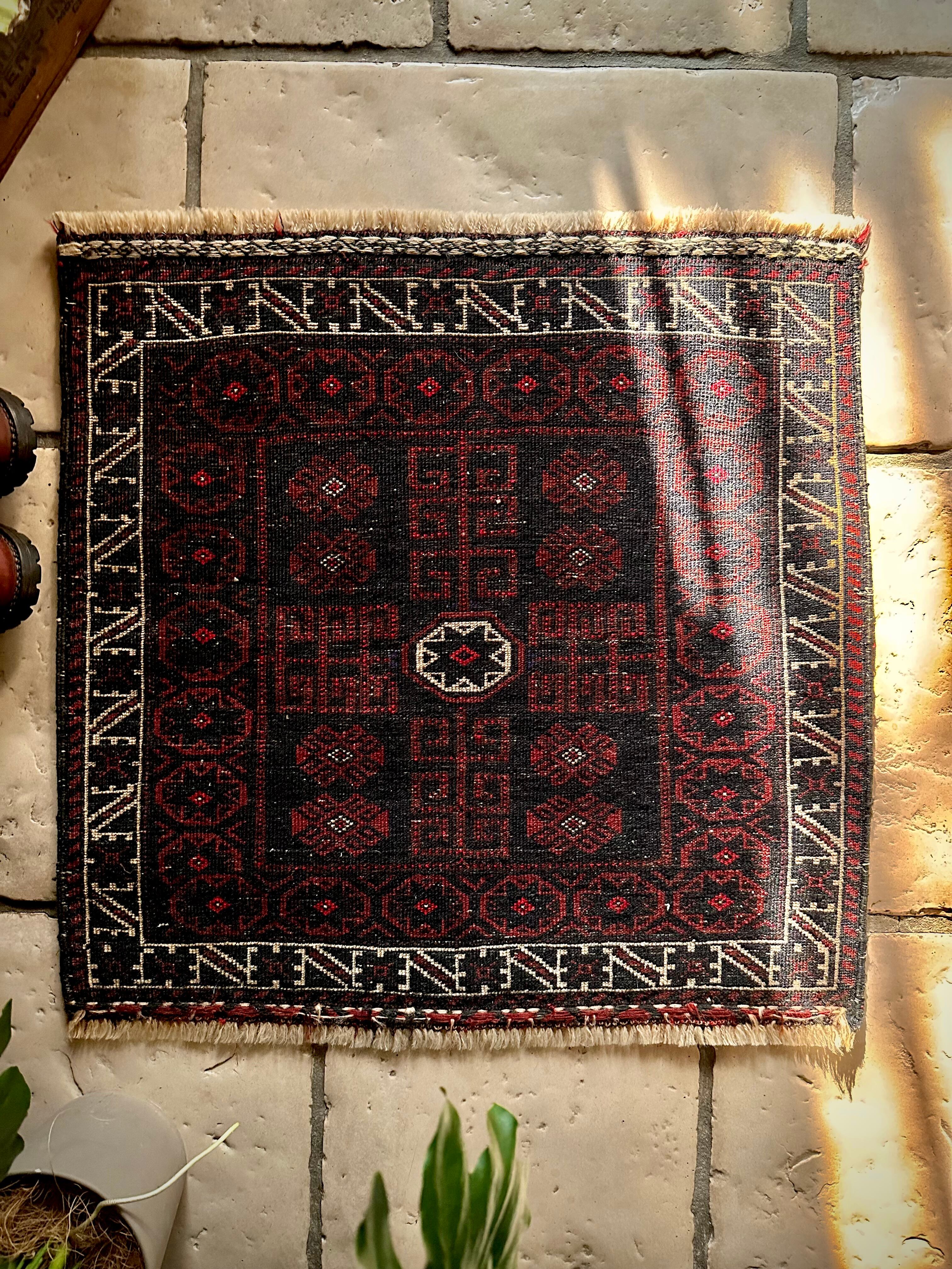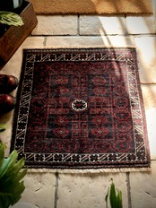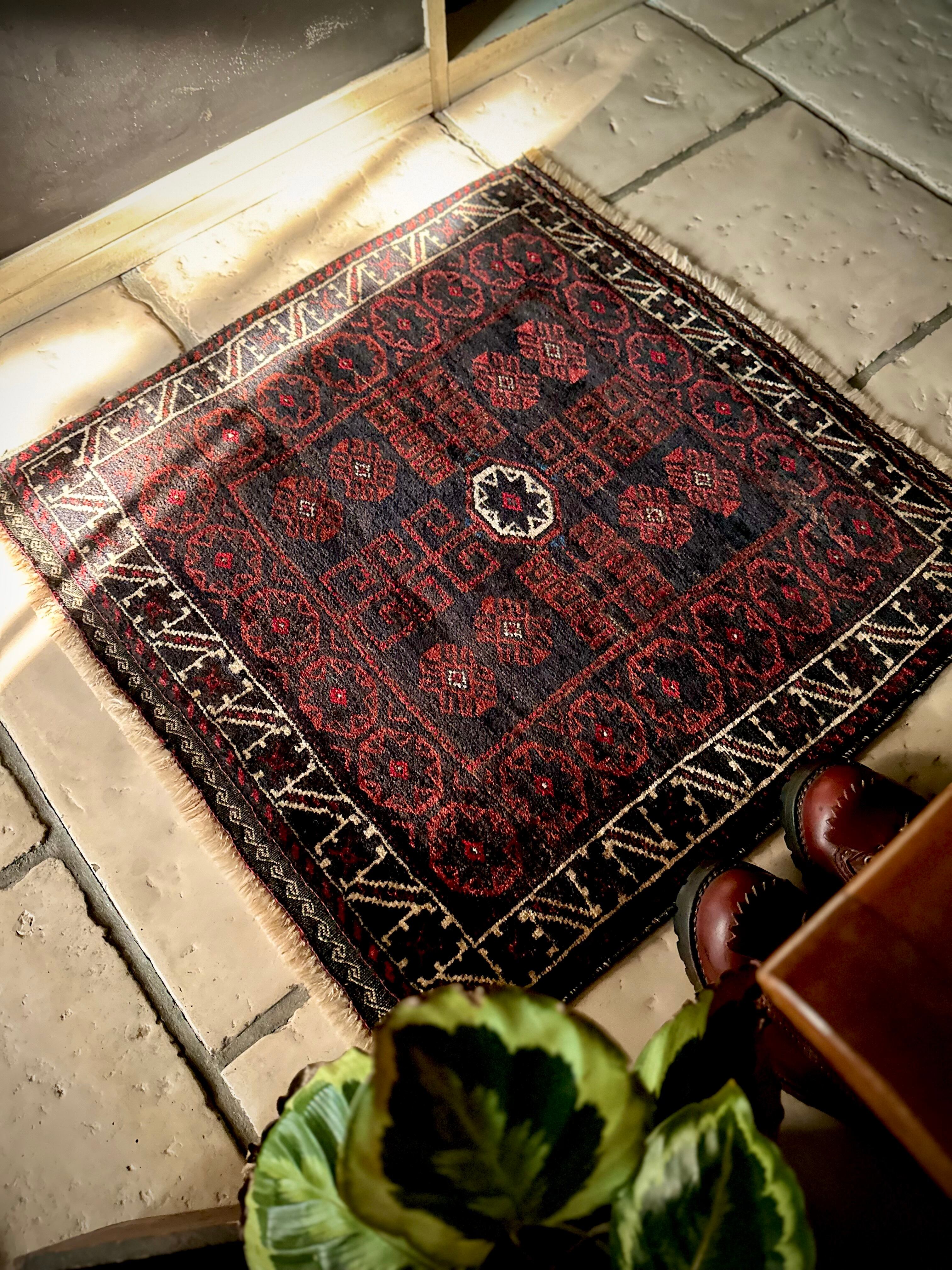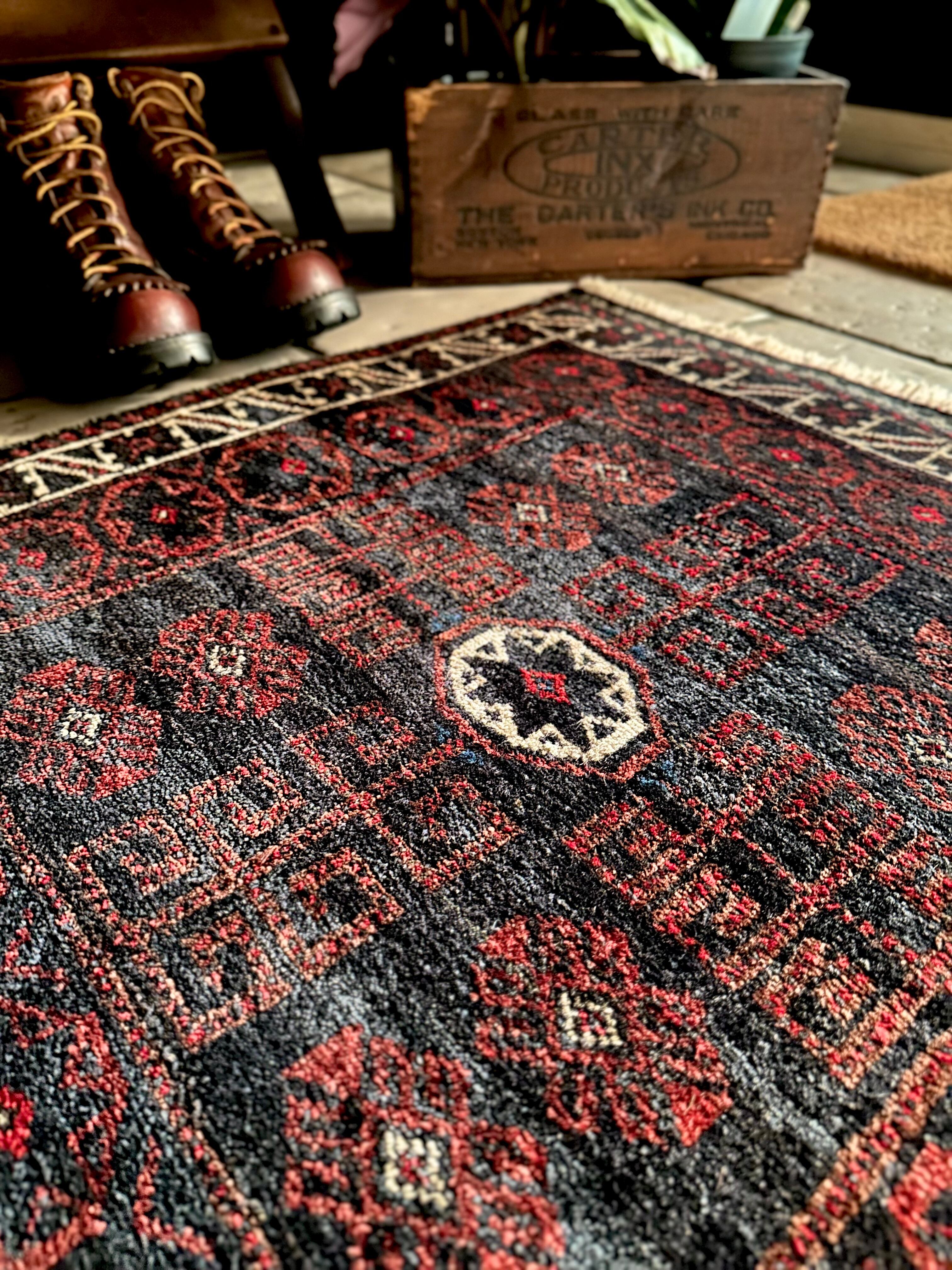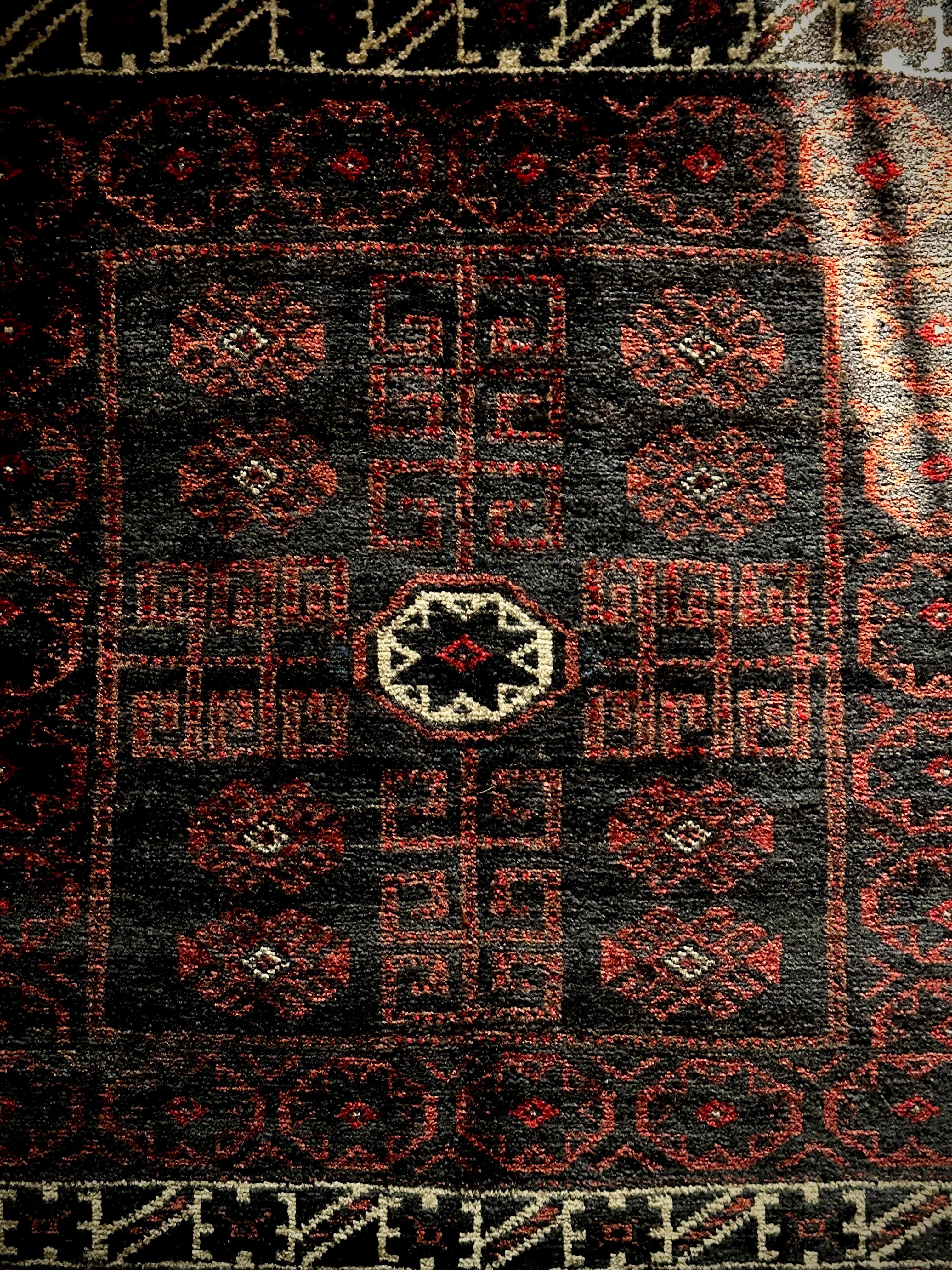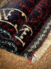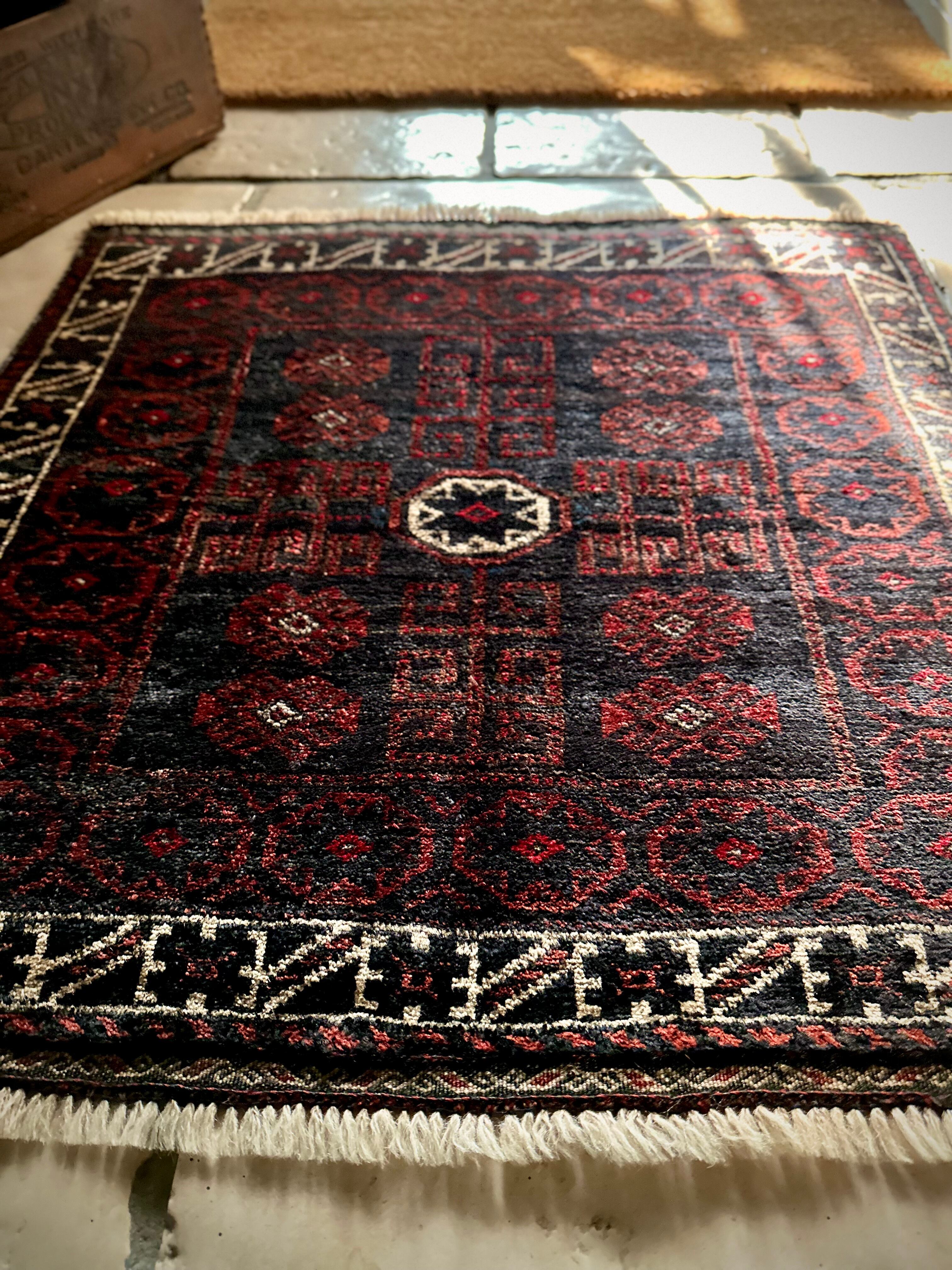ブラックに近いネイビーのベースに赤と白でシンプルな紋様が織り込まれたこちらは、アフガニスタンはヘラート州に居住するバルーチ族のトライバルラグで、ロバやラクダに跨がせるホルジンと呼ばれるサドルバッグの表皮をラグに仕立て直したモノになり、通常のバッグフェイスよりもひと回り大きなサイズ感が希少ではあります。