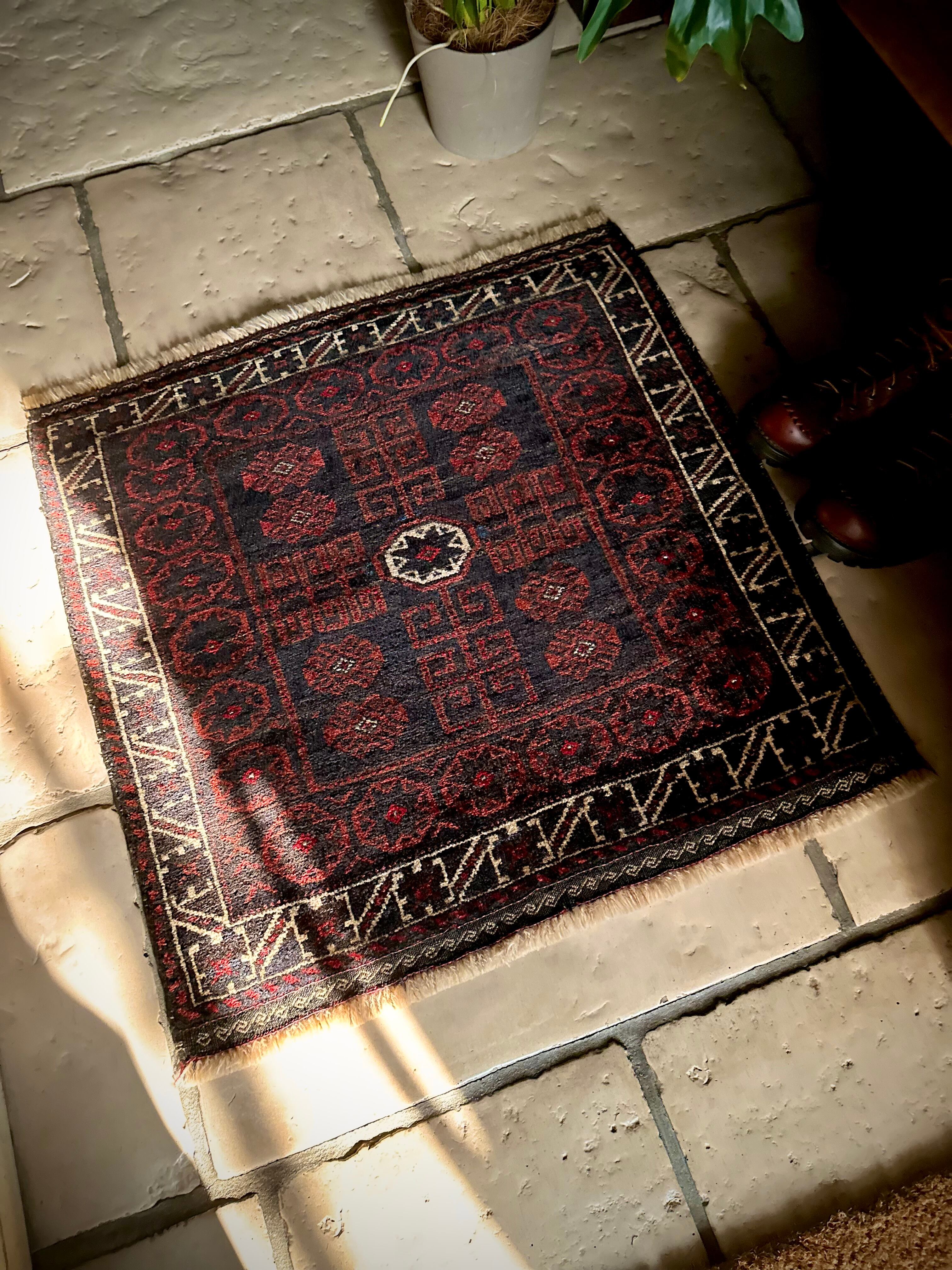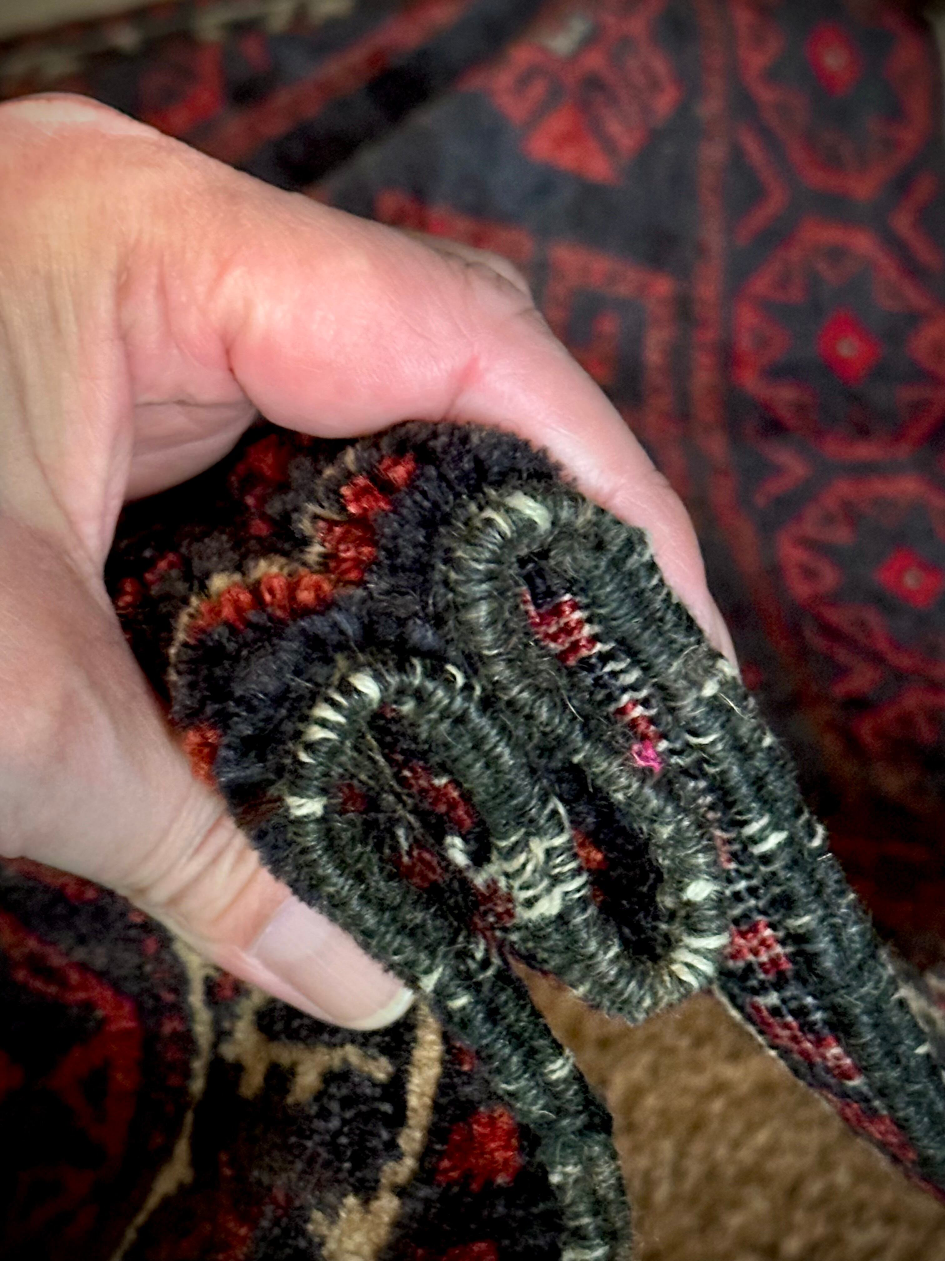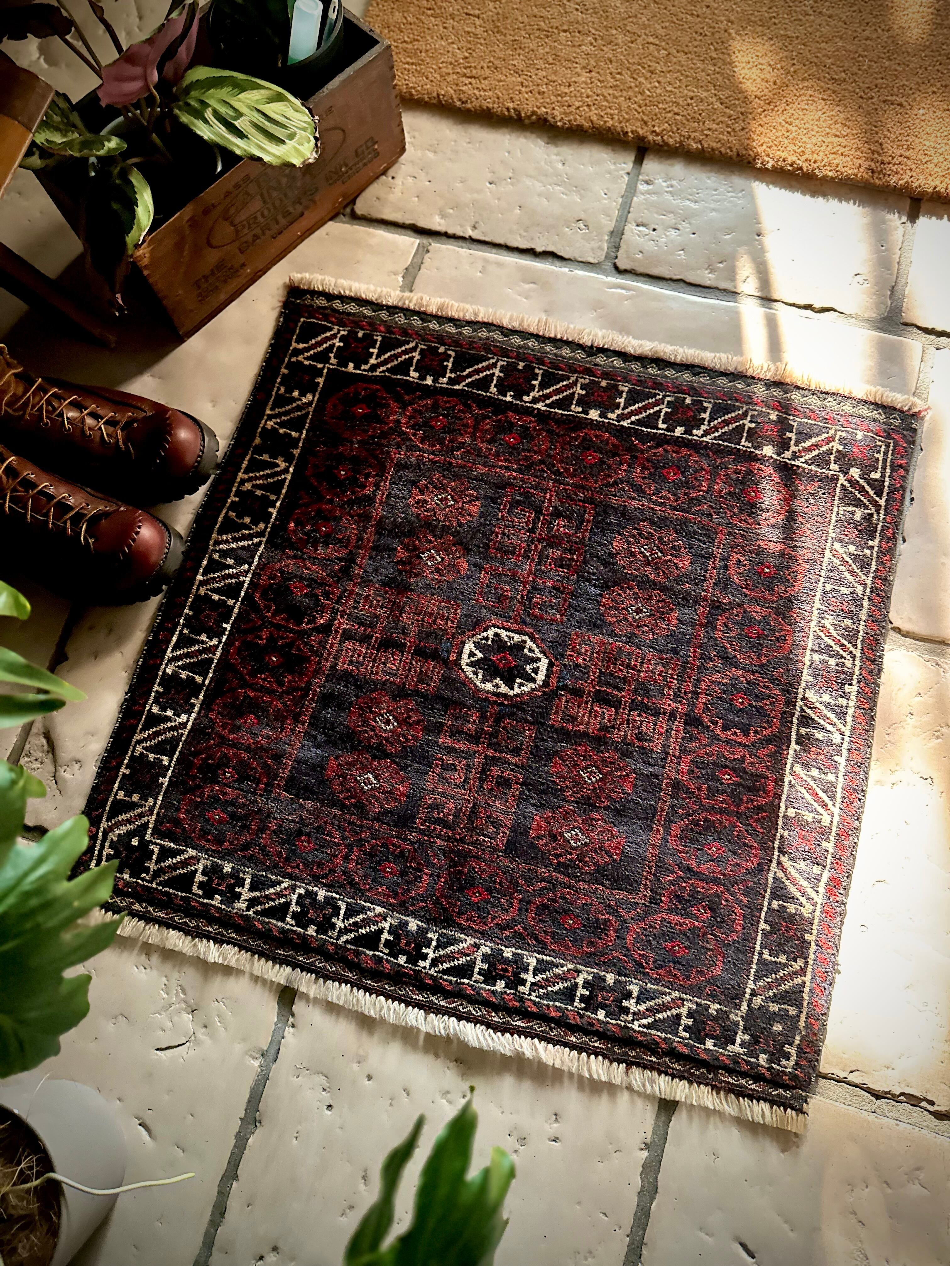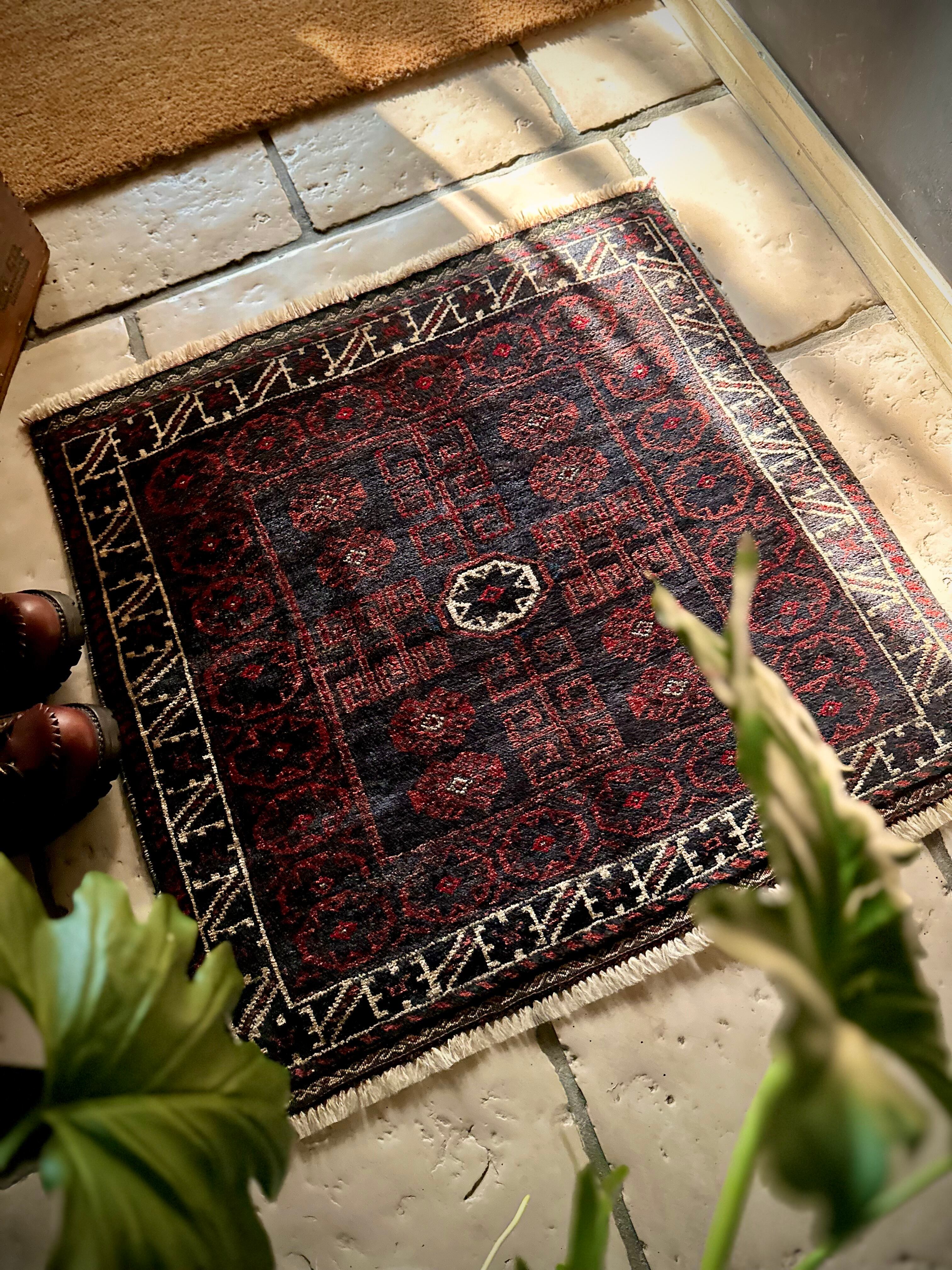 ブラックに近いネイビーのベースに赤と白でシンプルな紋様が織り込まれたこちらは、アフガニスタンはヘラート州に居住するバルーチ族のトライバルラグで、ロバやラクダに跨がせるホルジンと呼ばれるサドルバッグの表皮をラグに仕立て直したモノになり、通常のバッグフェイスよりもひと回り大きなサイズ感が希少ではあります。