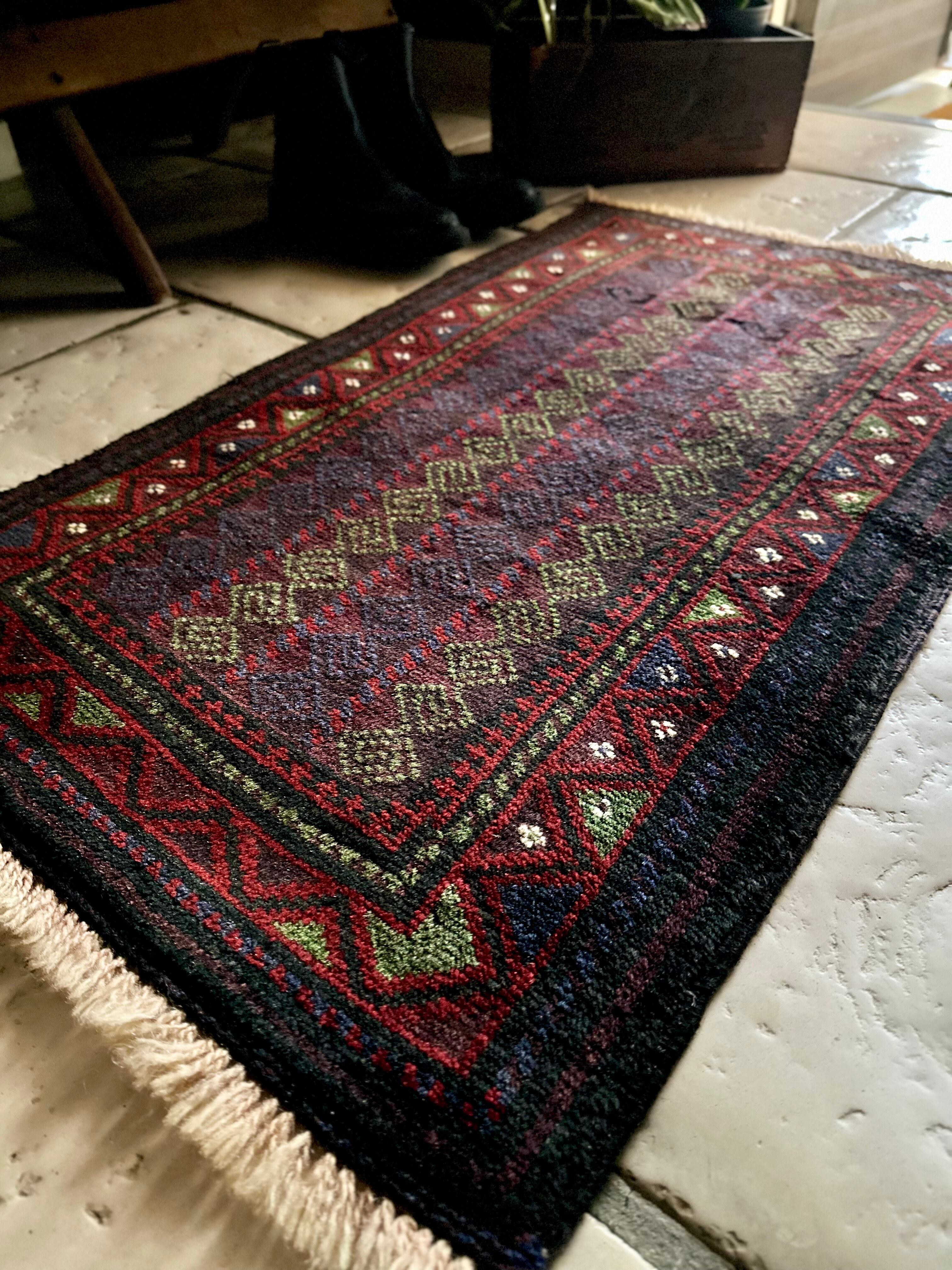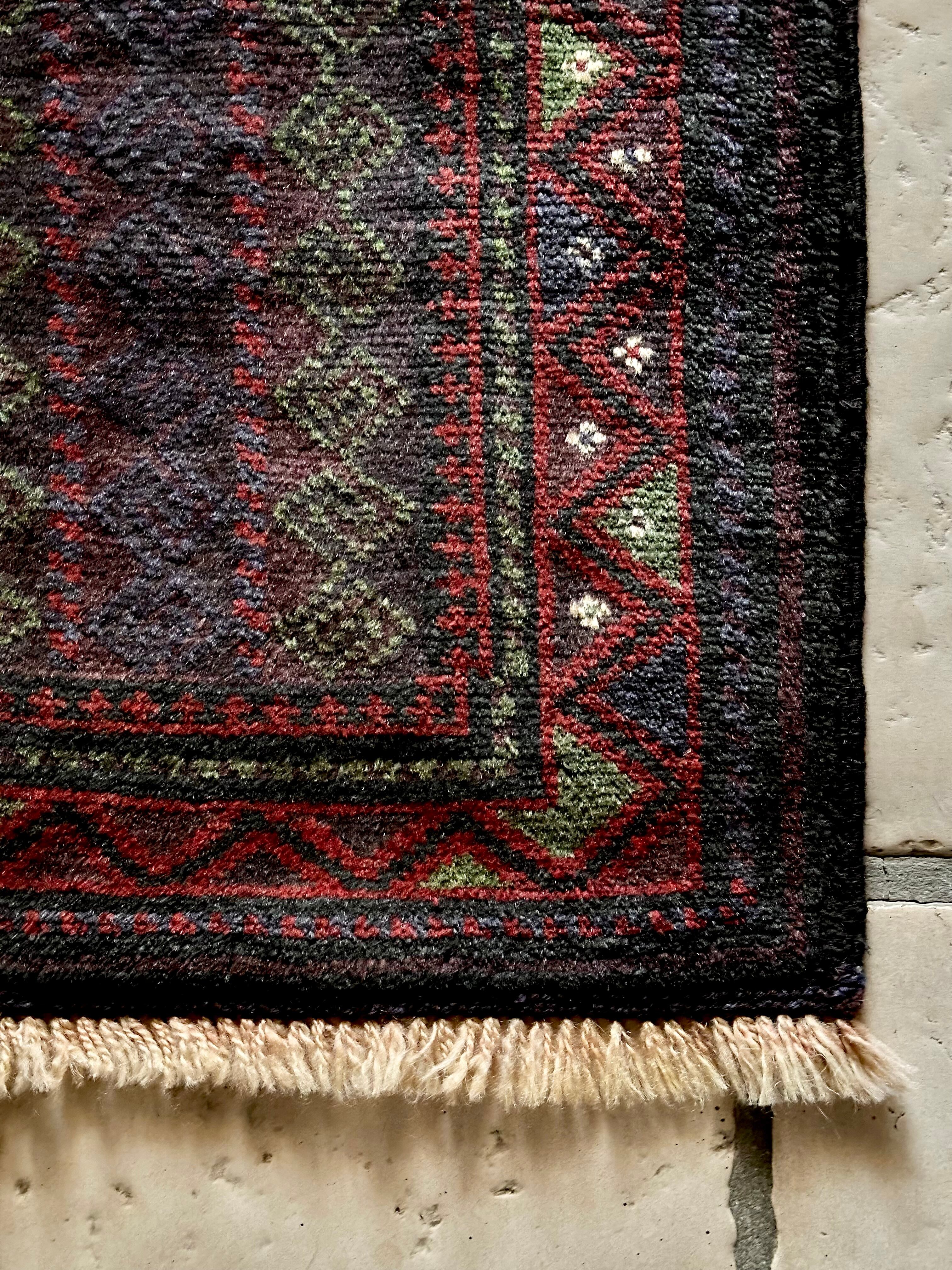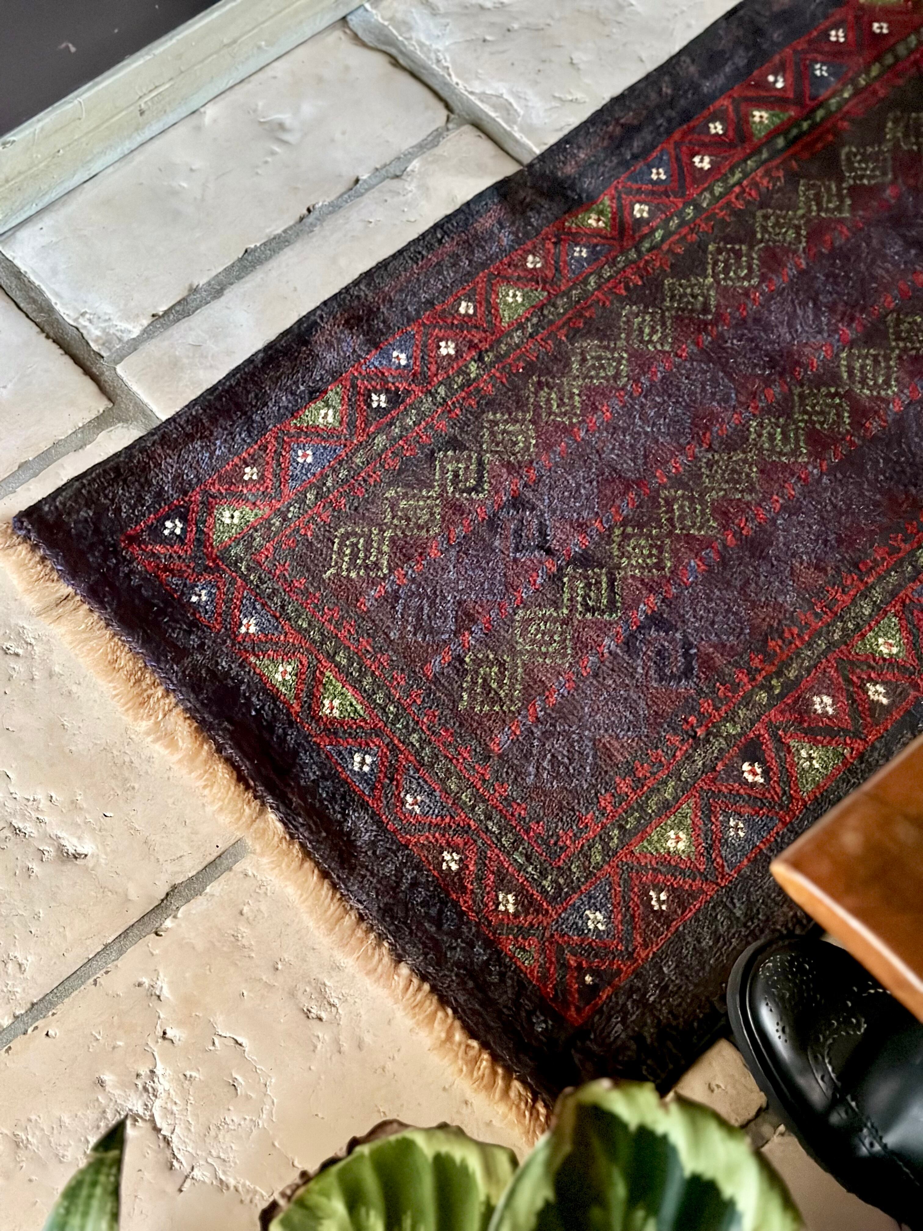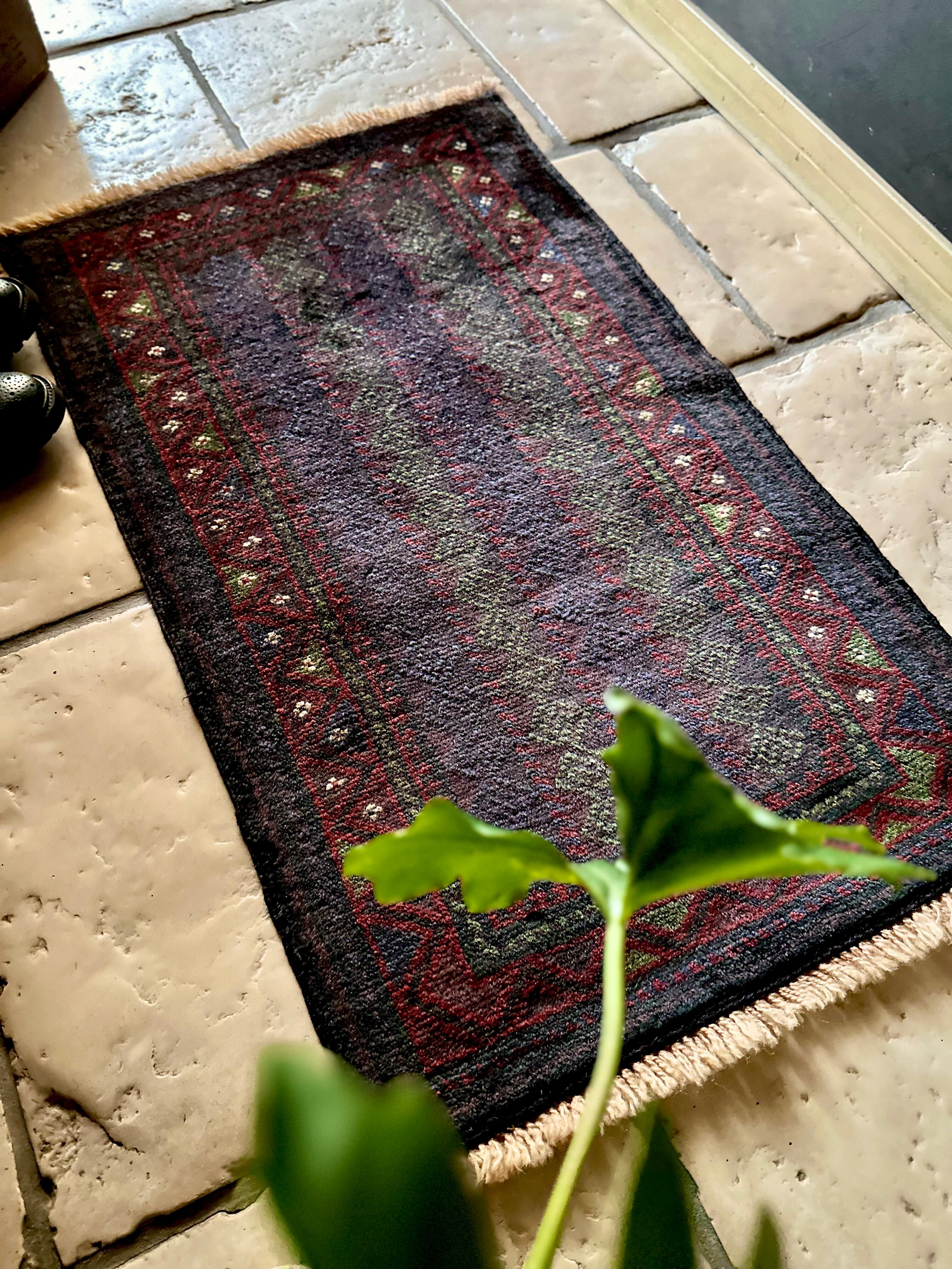 ブラックにボルドー、ネイビーにバーガンディのダークカラーにグリーンのアクセントが小粋なこちらは、アフガニスタンはヘラート州に居住するバルーチ族のトライバルラグで、元はバーリシトと呼ばれる袋状の表皮をラグに仕立て直したモノになります。