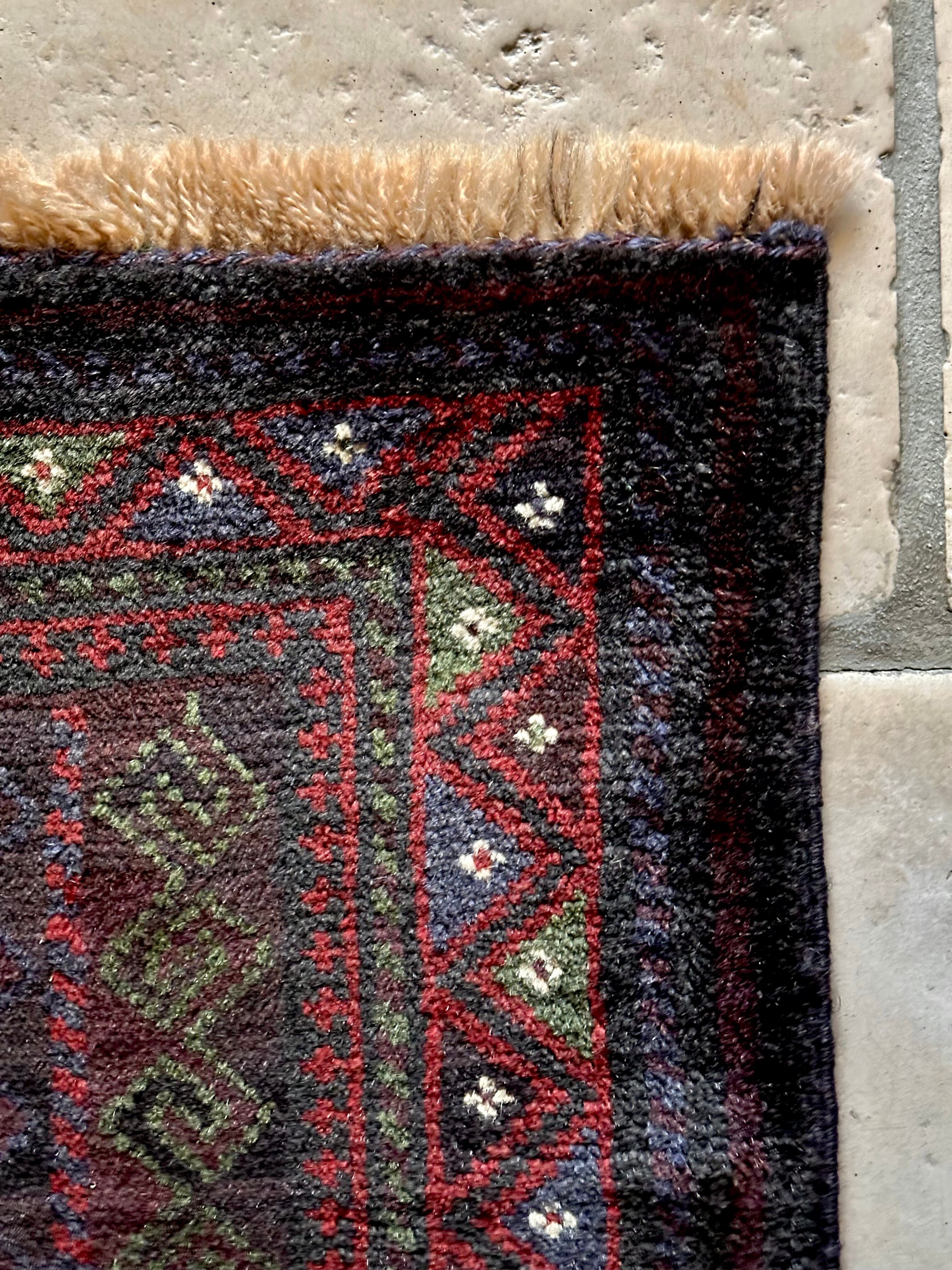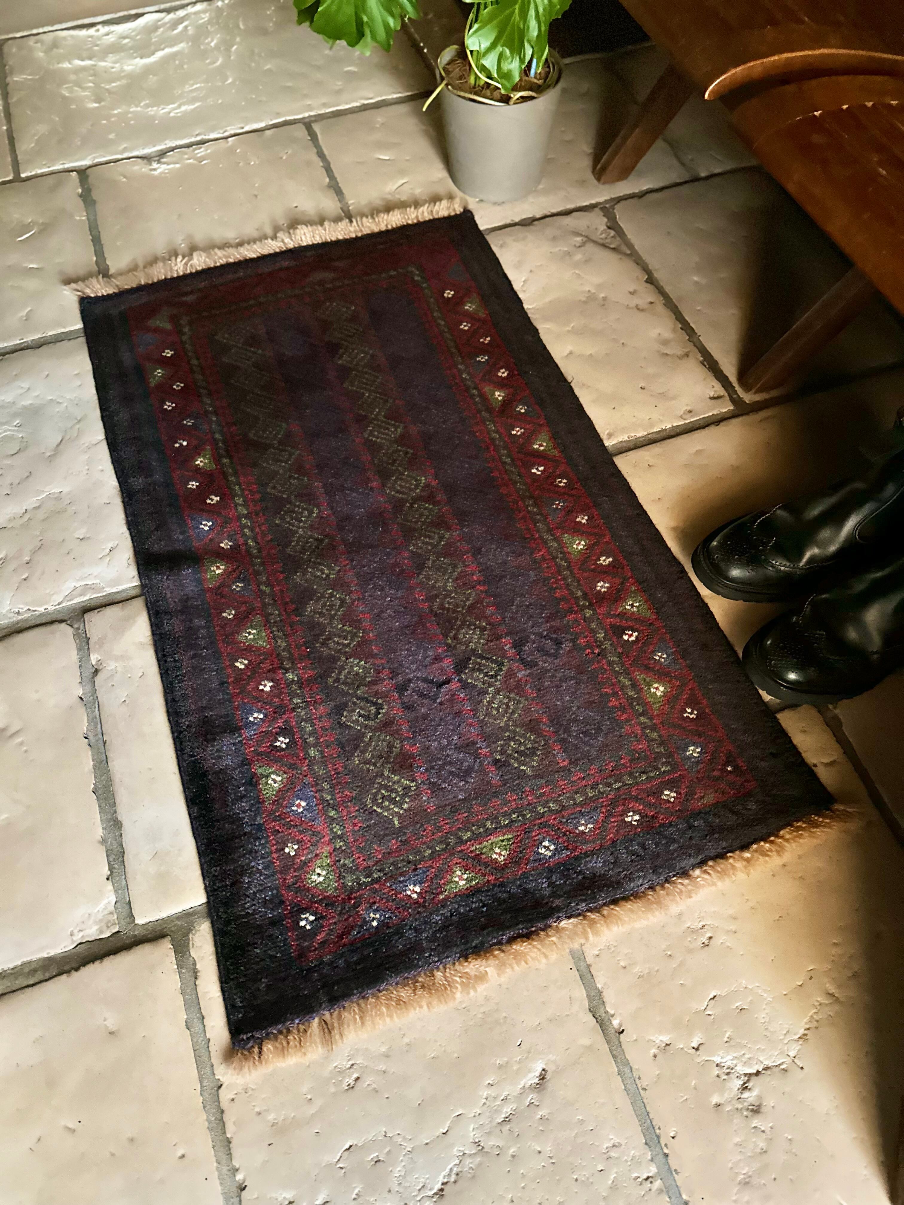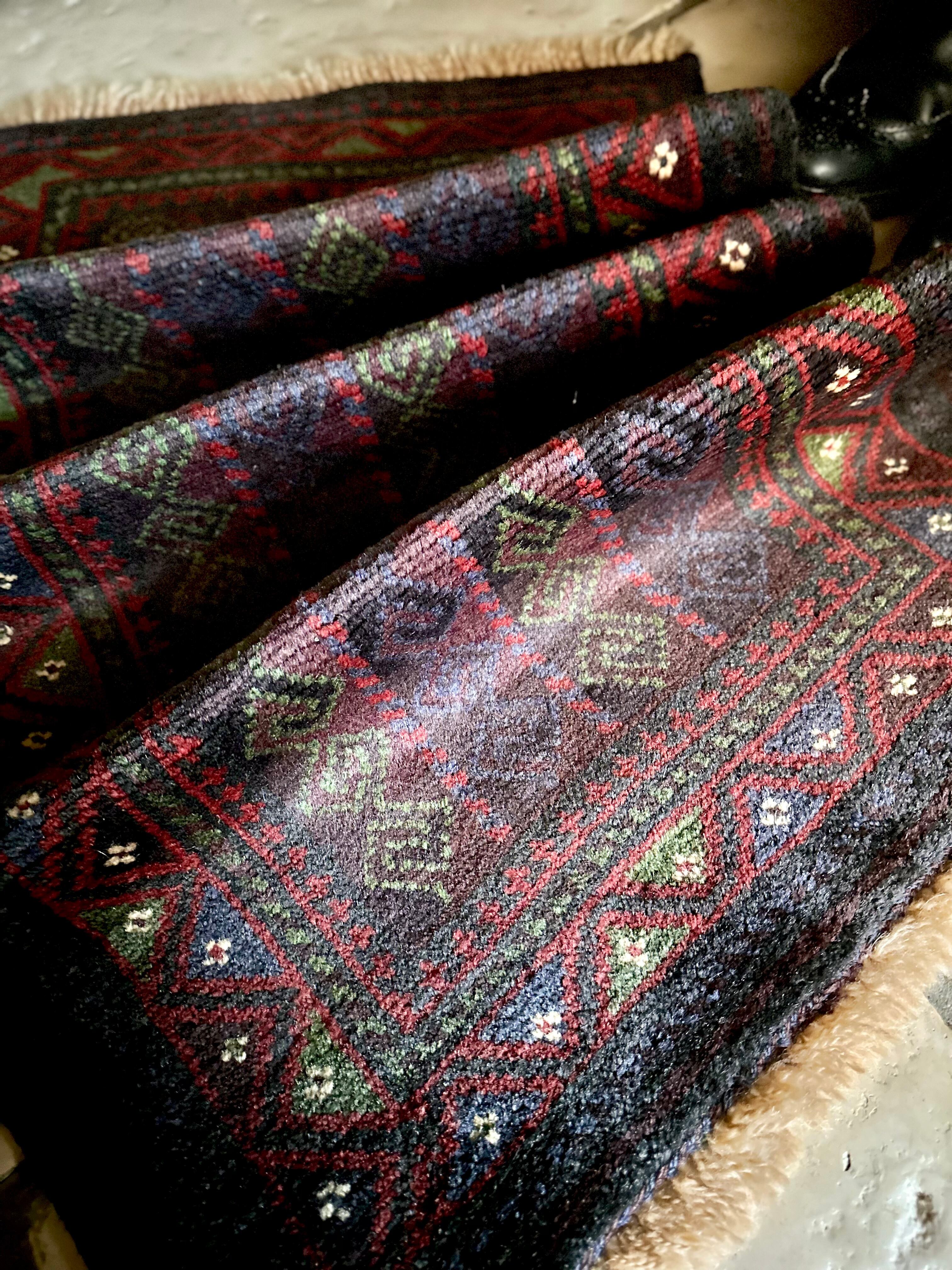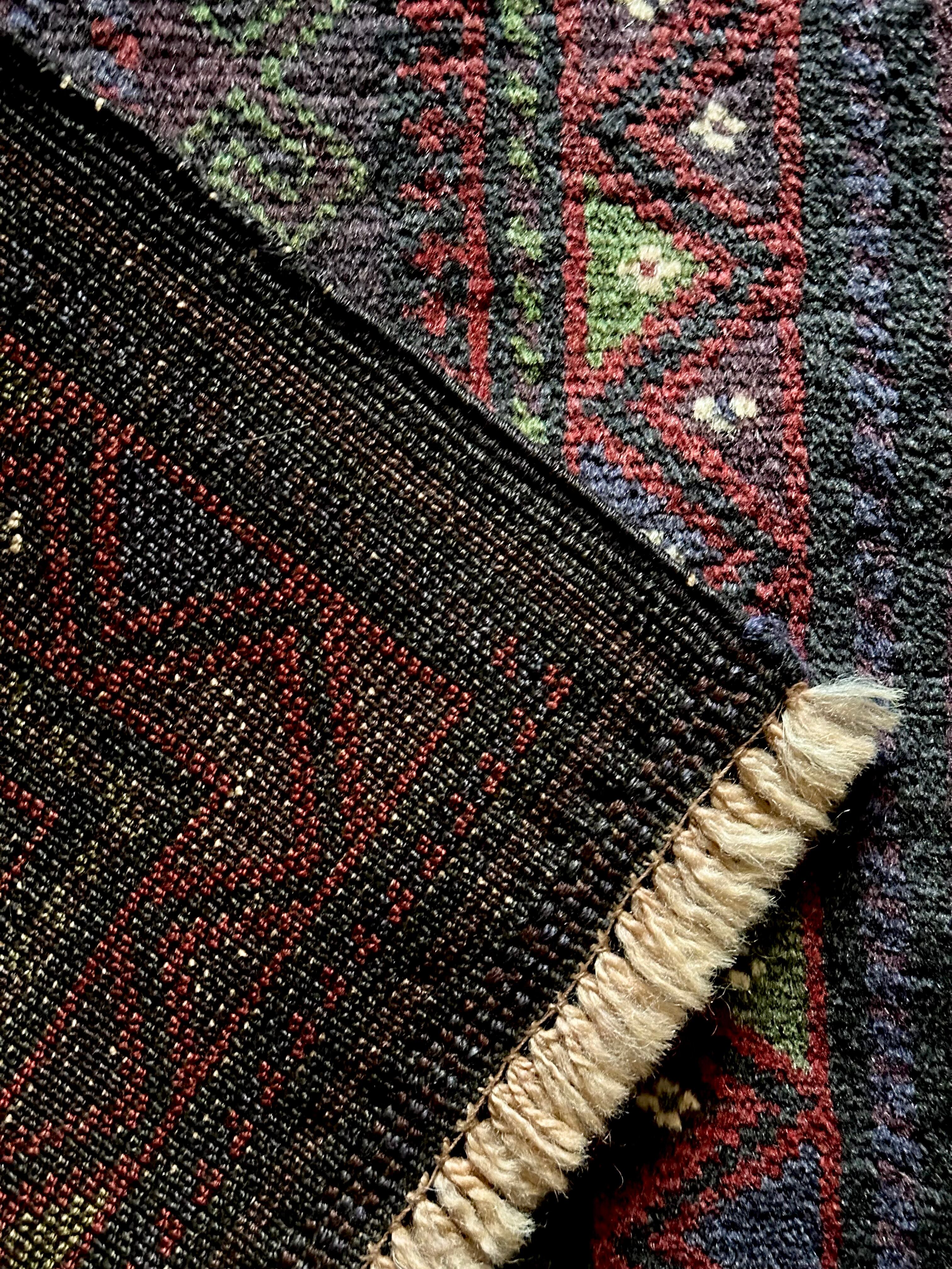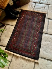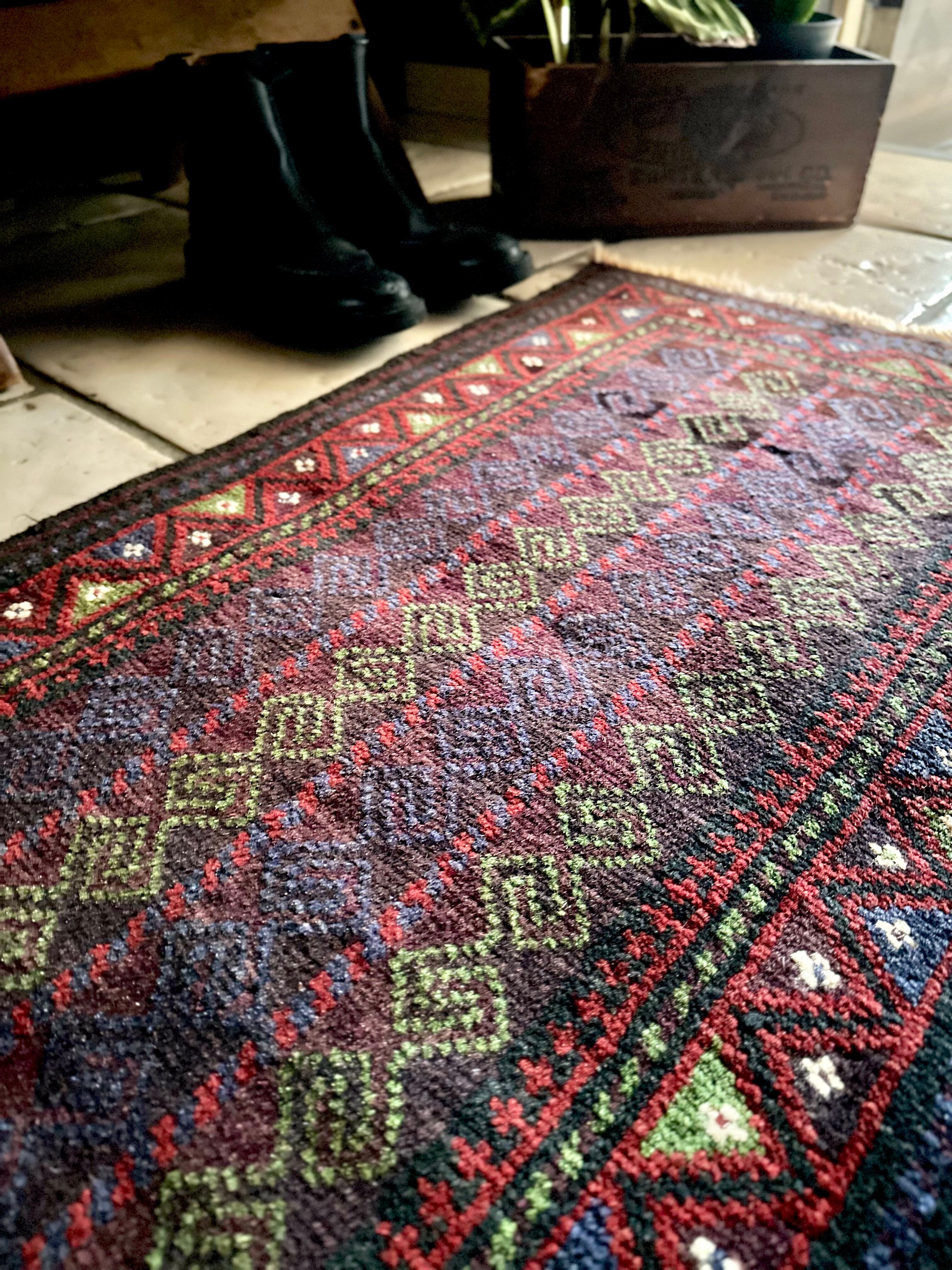 ブラックにボルドー、ネイビーにバーガンディのダークカラーにグリーンのアクセントが小粋なこちらは、アフガニスタンはヘラート州に居住するバルーチ族のトライバルラグで、元はバーリシトと呼ばれる袋状の表皮をラグに仕立て直したモノになります。