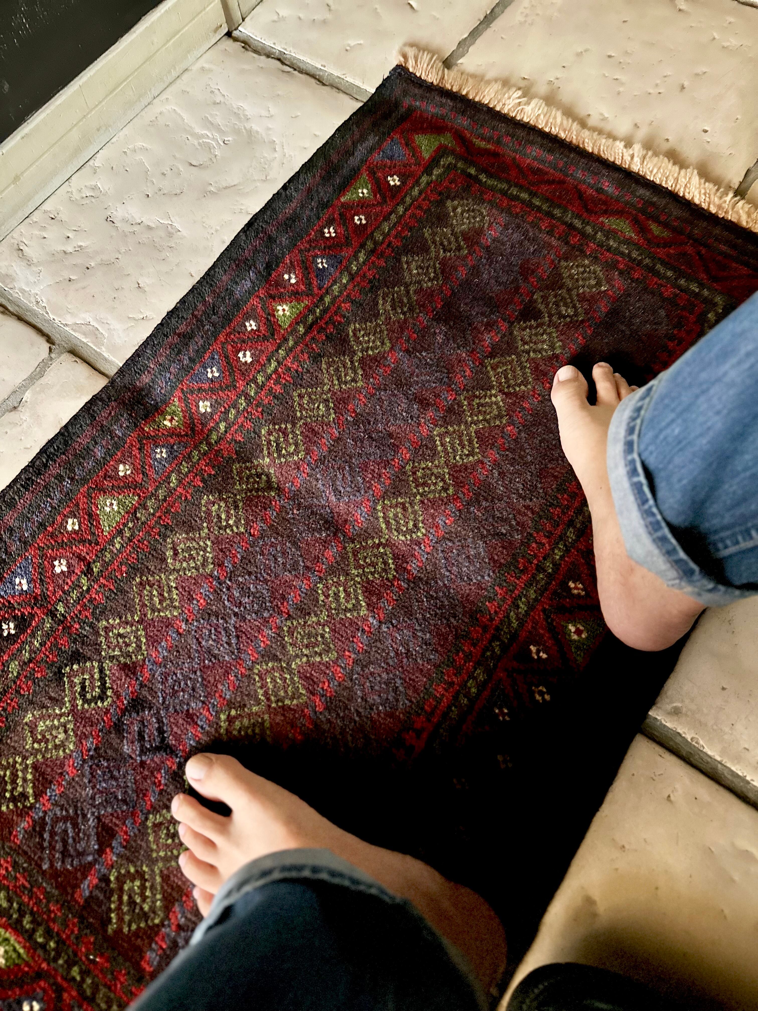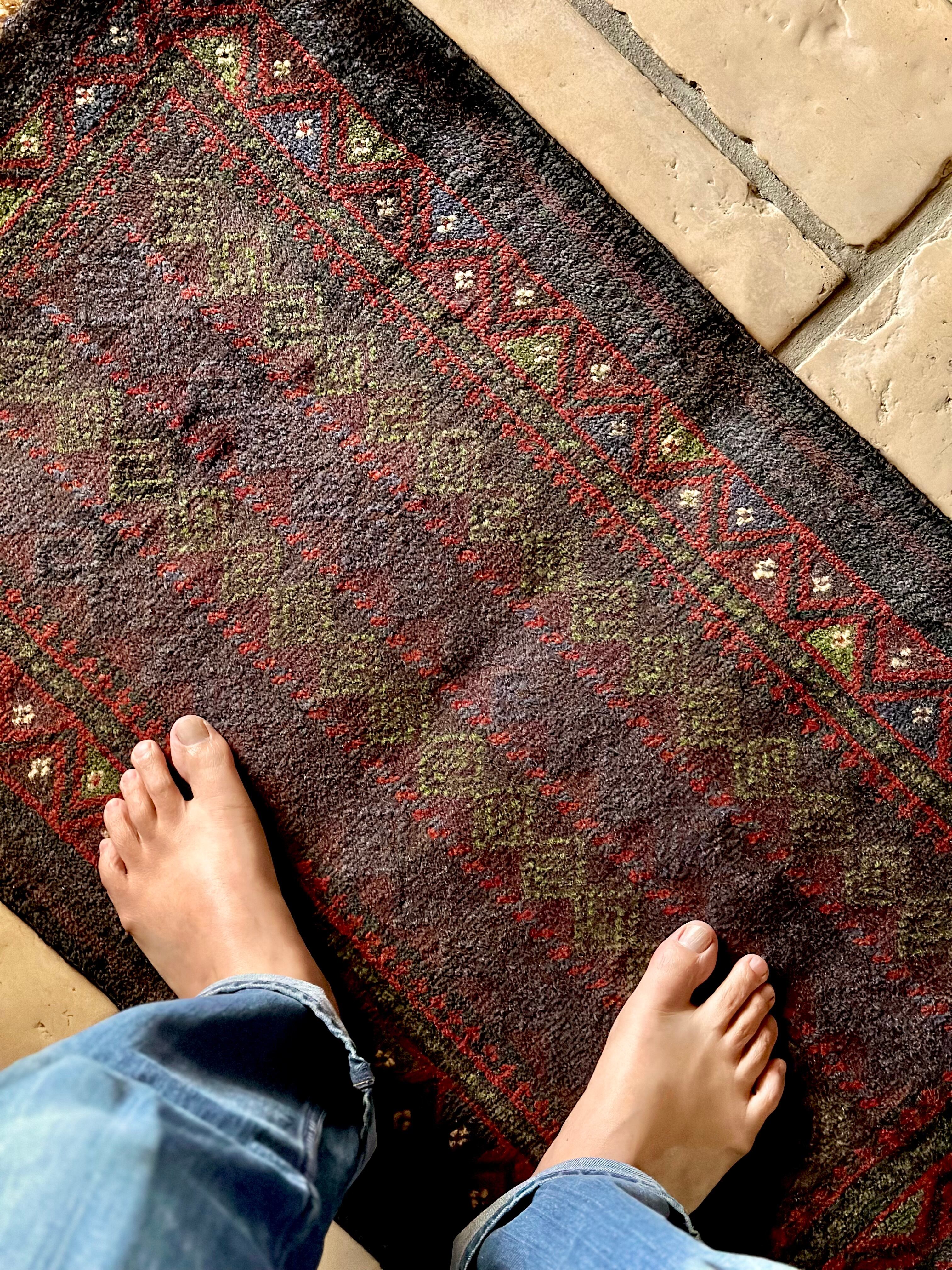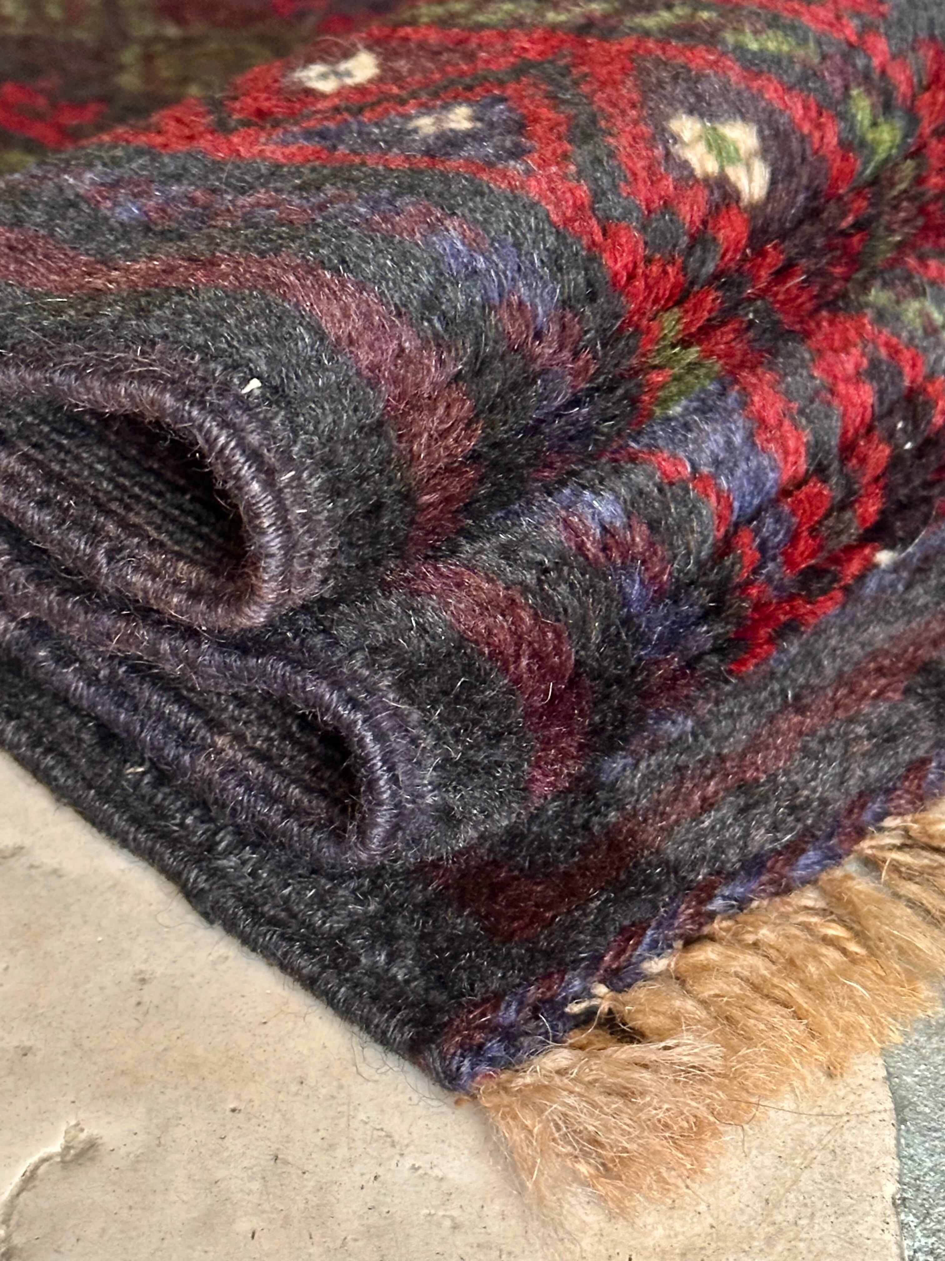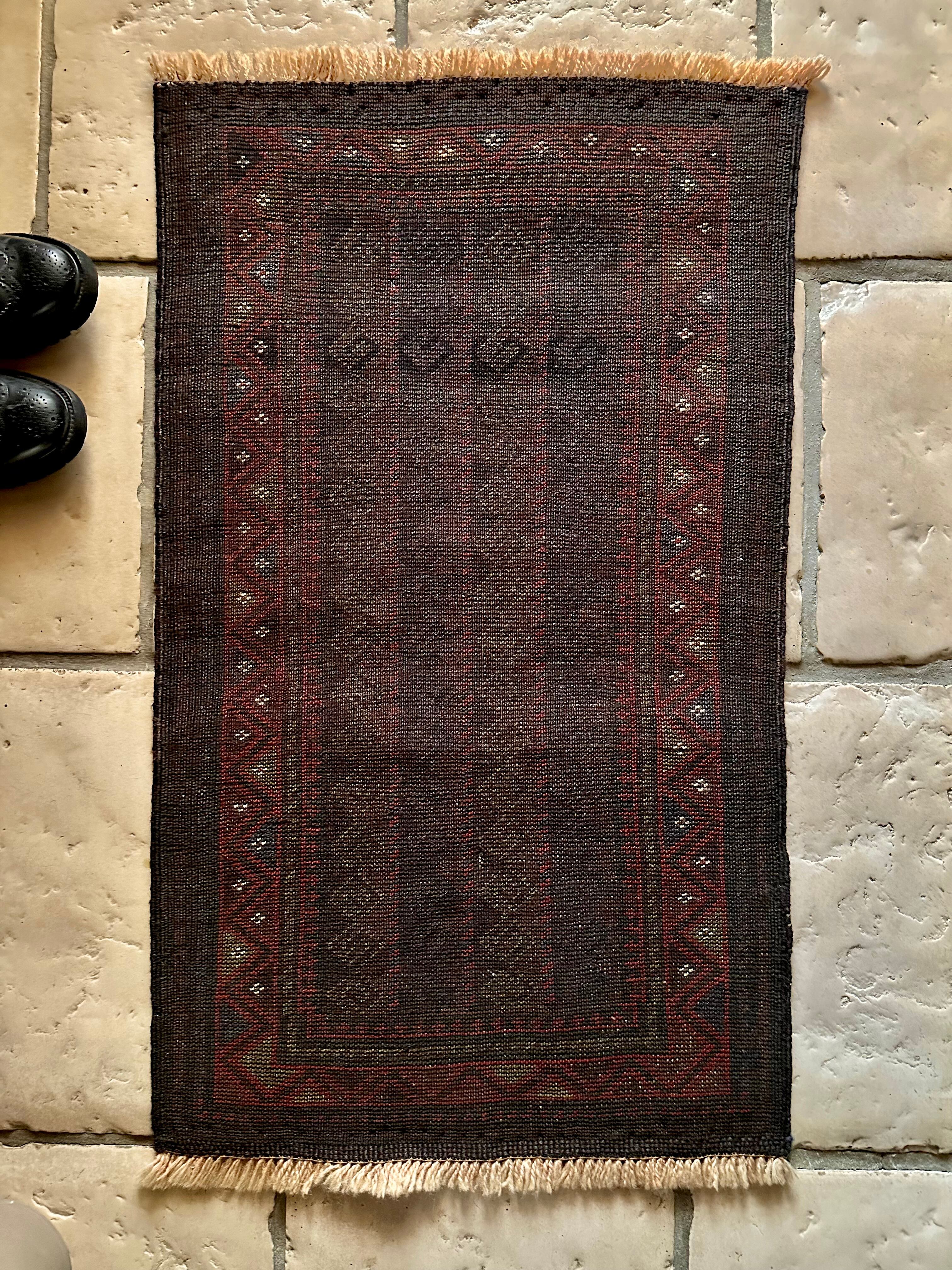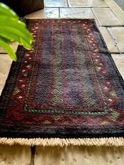 ブラックにボルドー、ネイビーにバーガンディのダークカラーにグリーンのアクセントが小粋なこちらは、アフガニスタンはヘラート州に居住するバルーチ族のトライバルラグで、元はバーリシトと呼ばれる袋状の表皮をラグに仕立て直したモノになります。