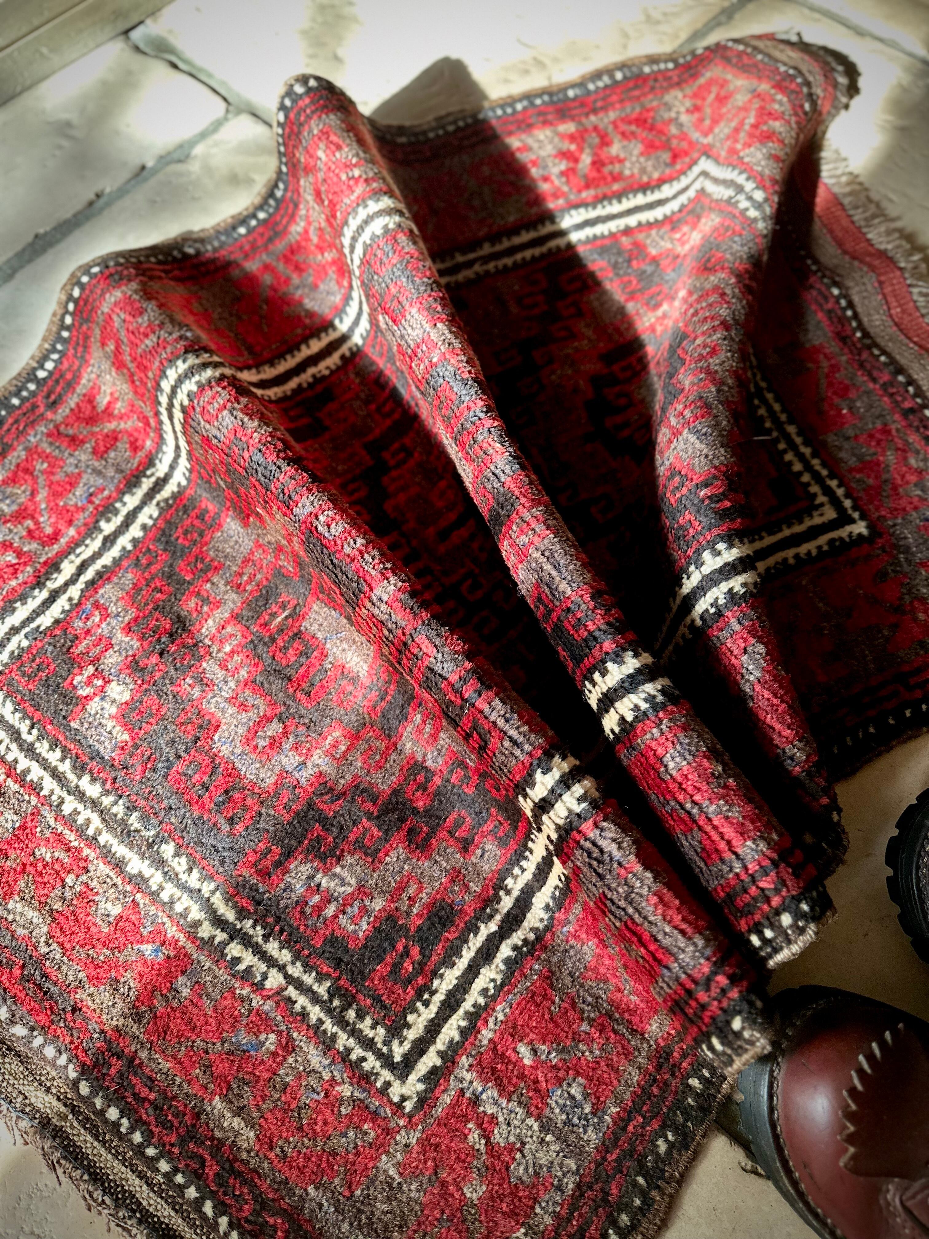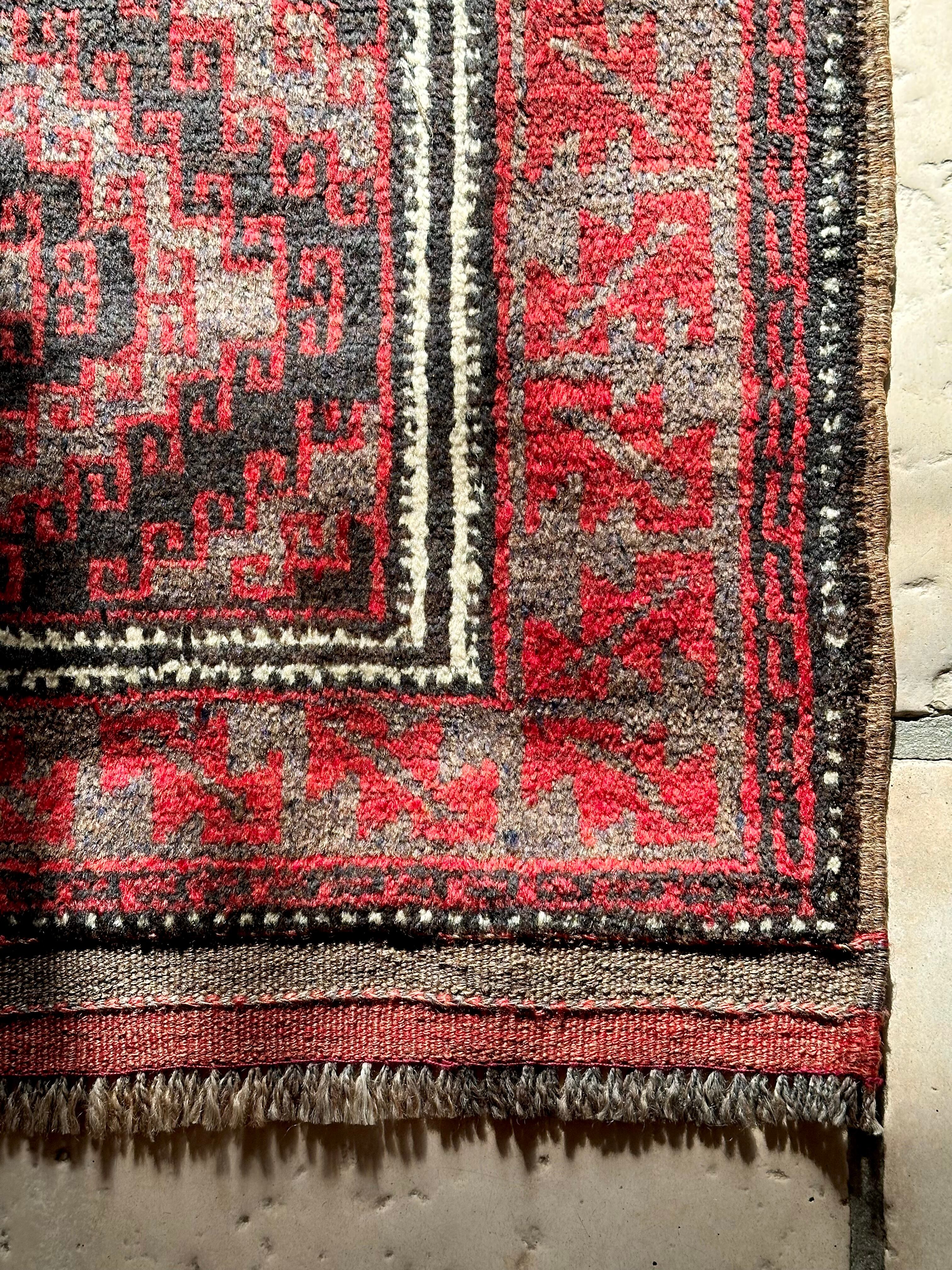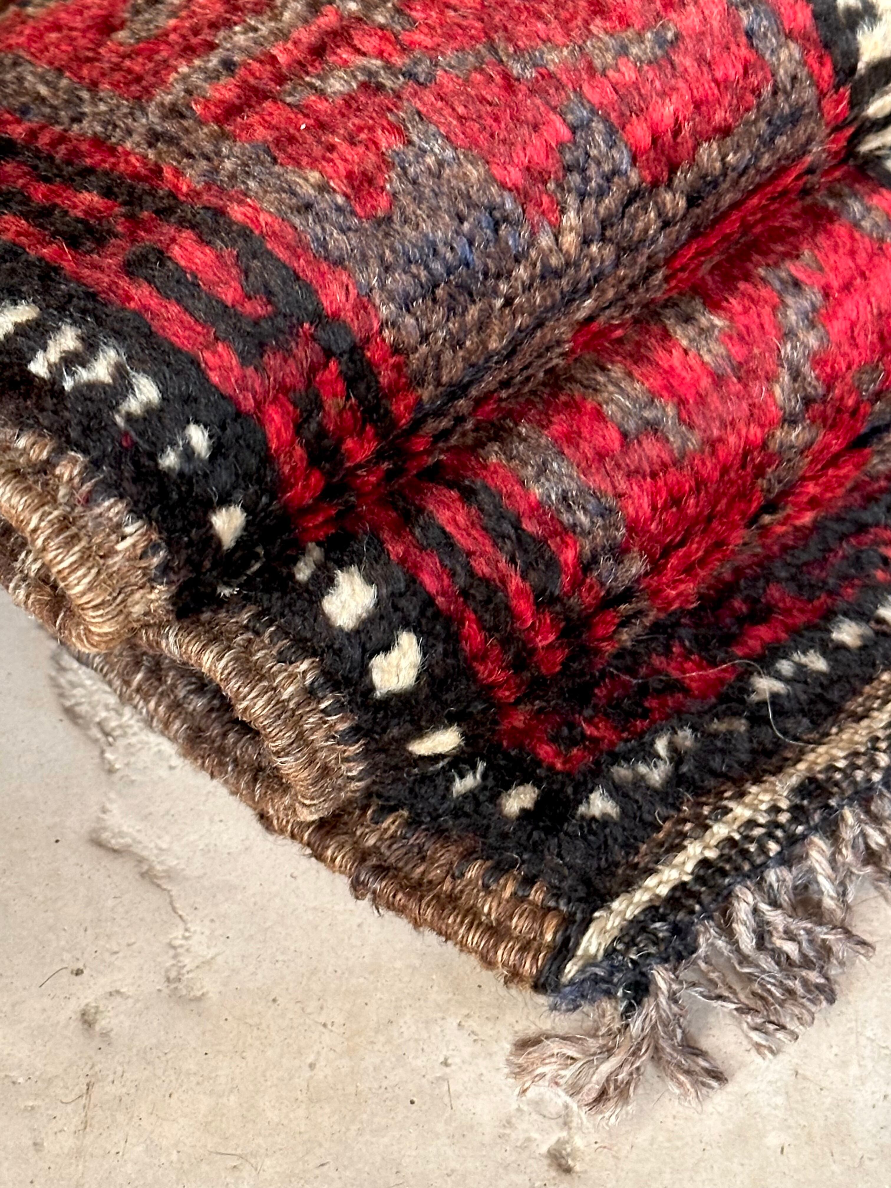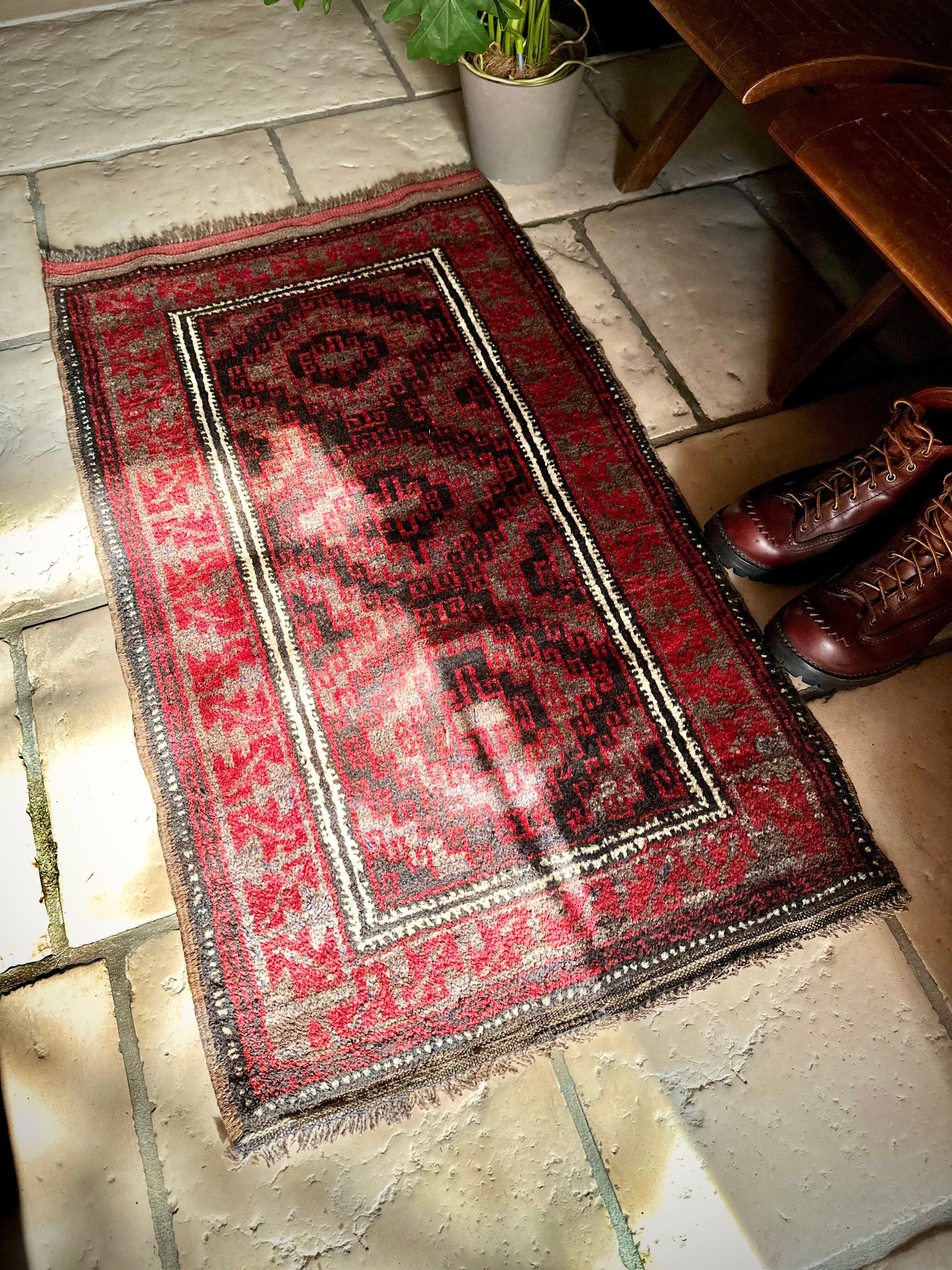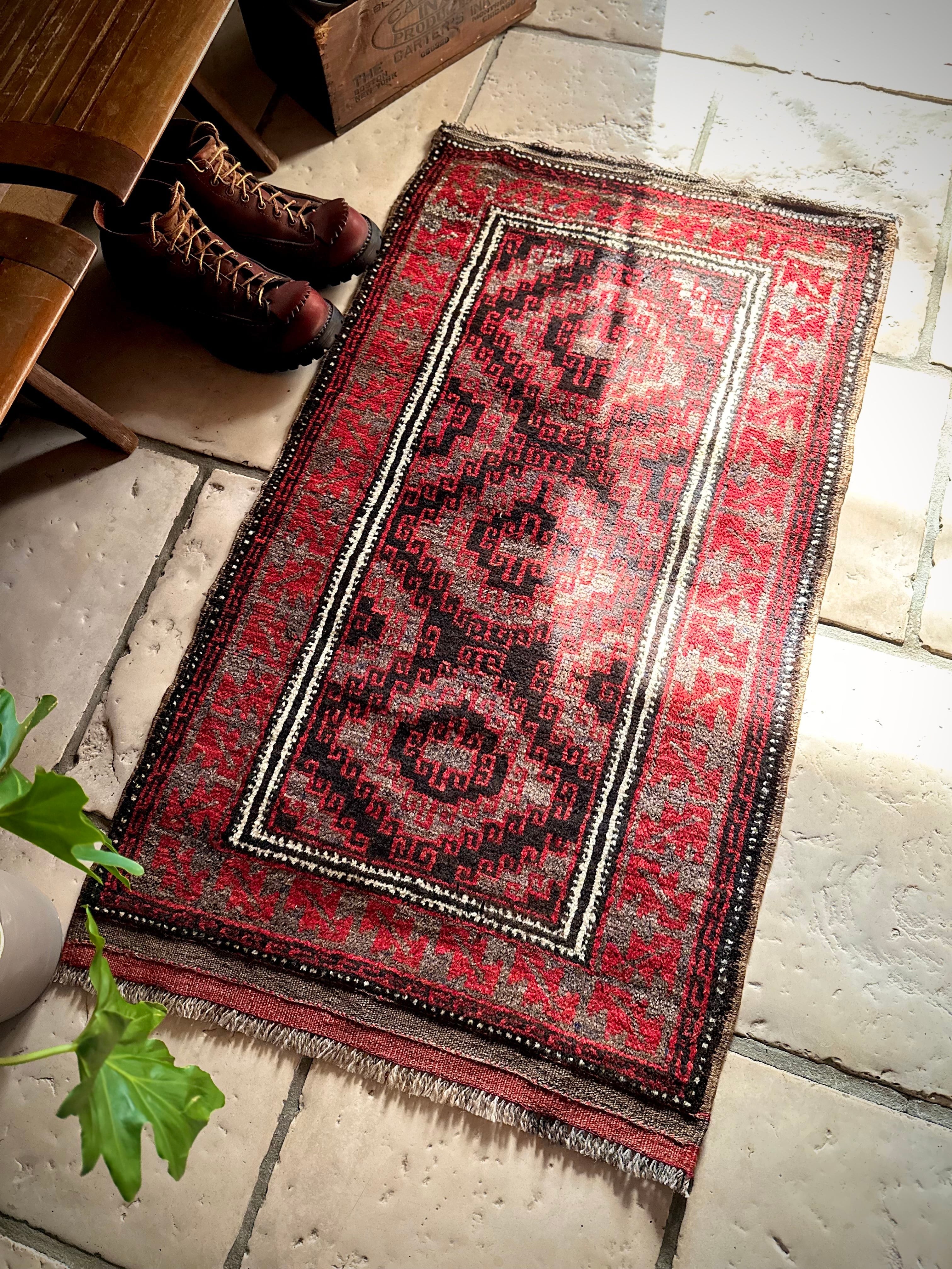ブラック&レッドにグレーの差し色がクールな印象を与えるこちらは、アフガニスタンはヘラート州に居住するバルーチ族のトライバルラグで、元は家財道具の収納や室内ではクッションとして使用されるバーリシトと呼ばれる袋状の表皮をラグに仕立て直したモノになります。