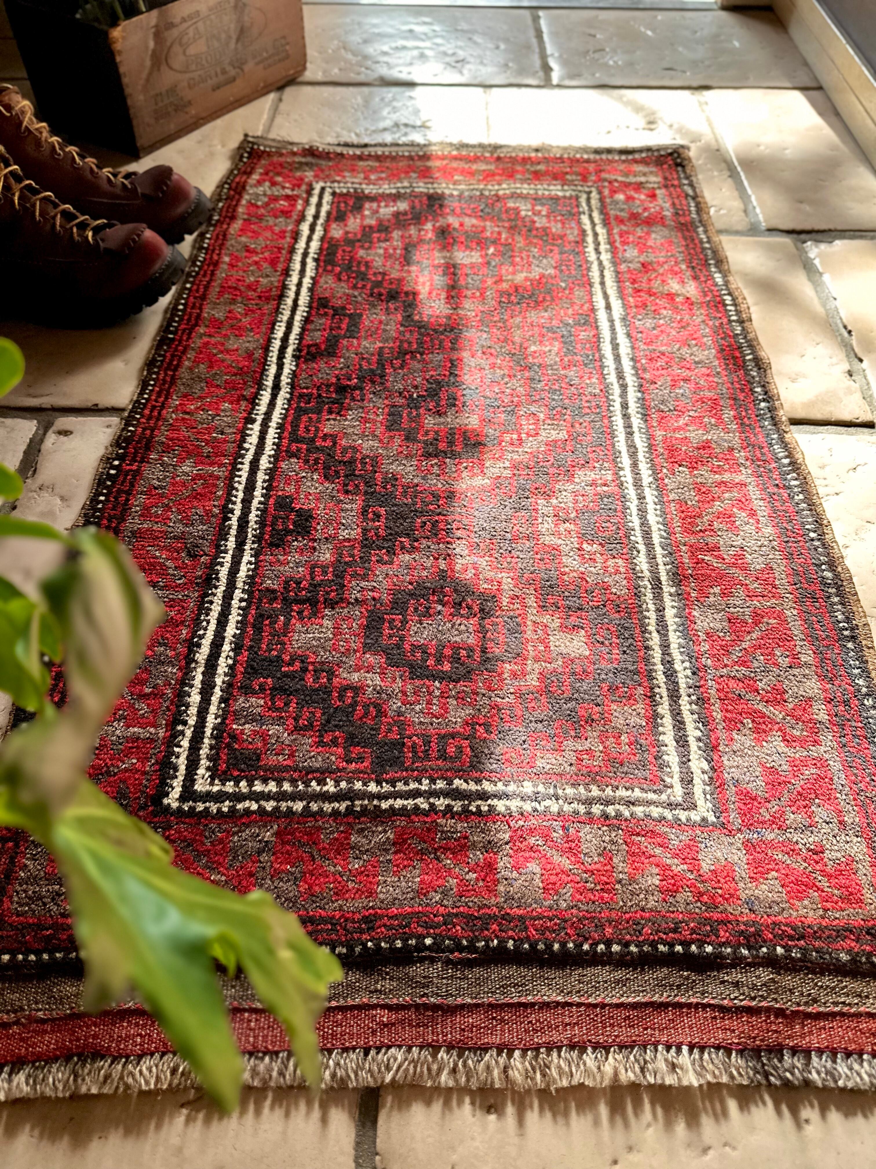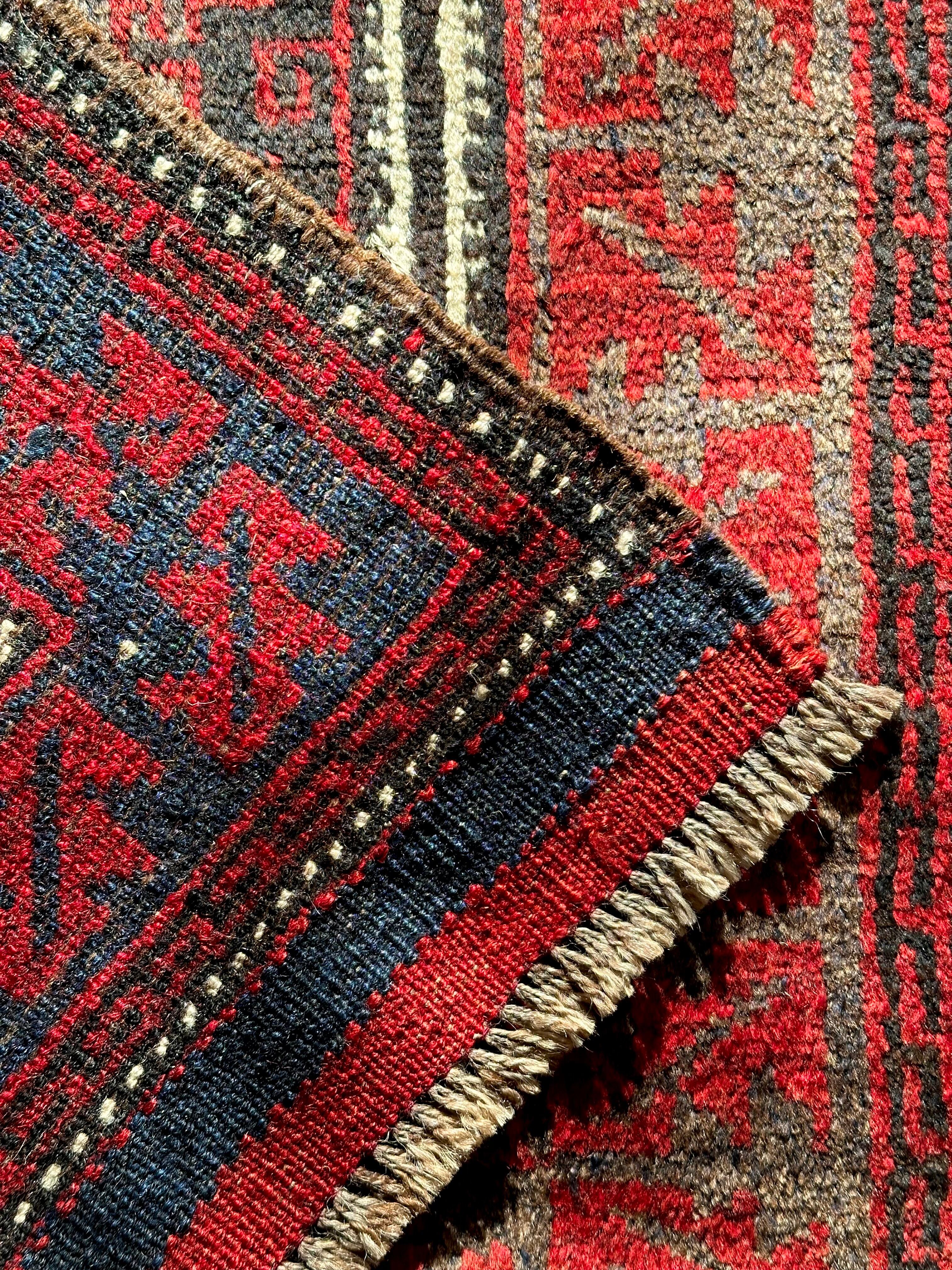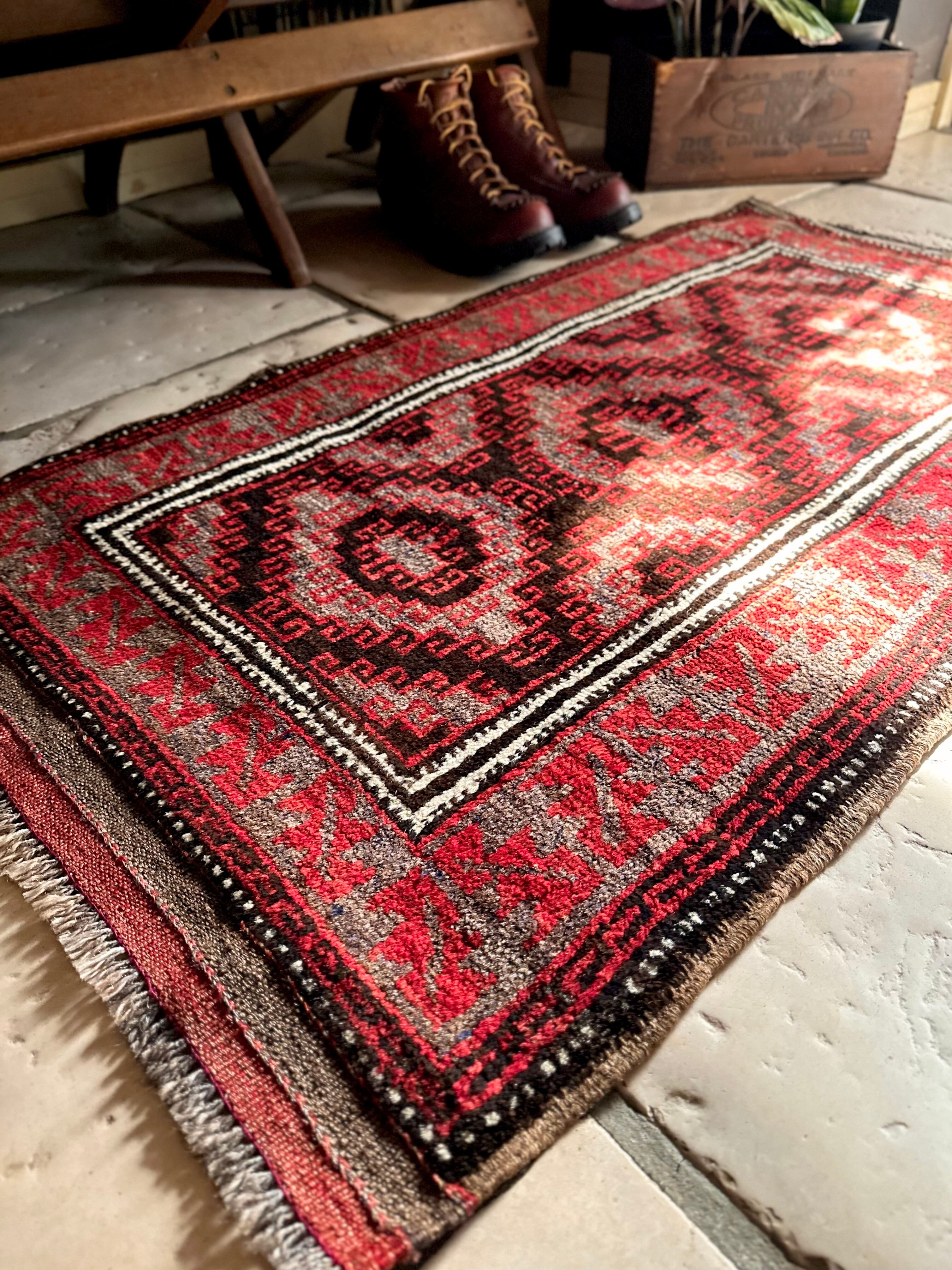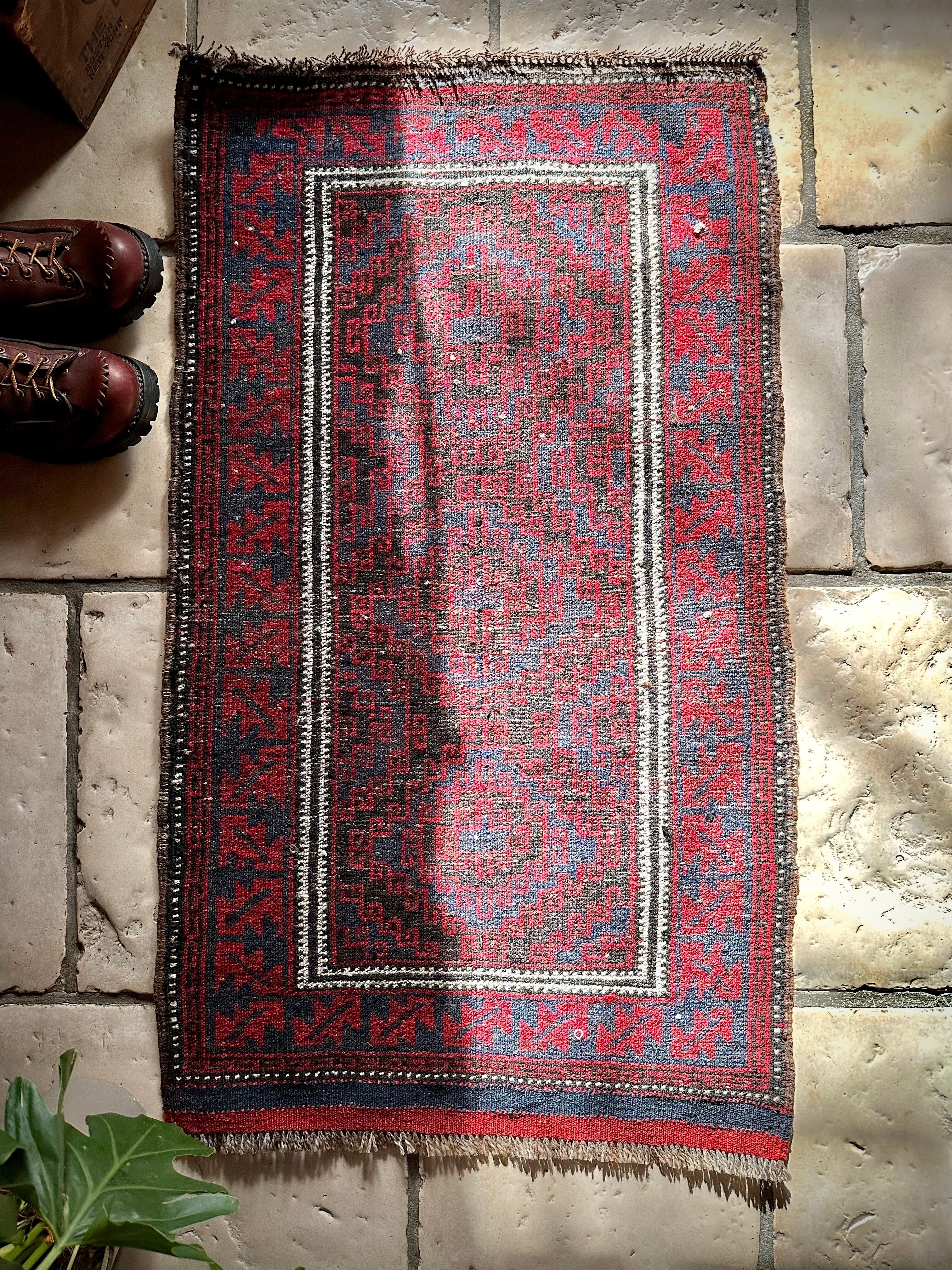 ブラック&レッドにグレーの差し色がクールな印象を与えるこちらは、アフガニスタンはヘラート州に居住するバルーチ族のトライバルラグで、元は家財道具の収納や室内ではクッションとして使用されるバーリシトと呼ばれる袋状の表皮をラグに仕立て直したモノになります。