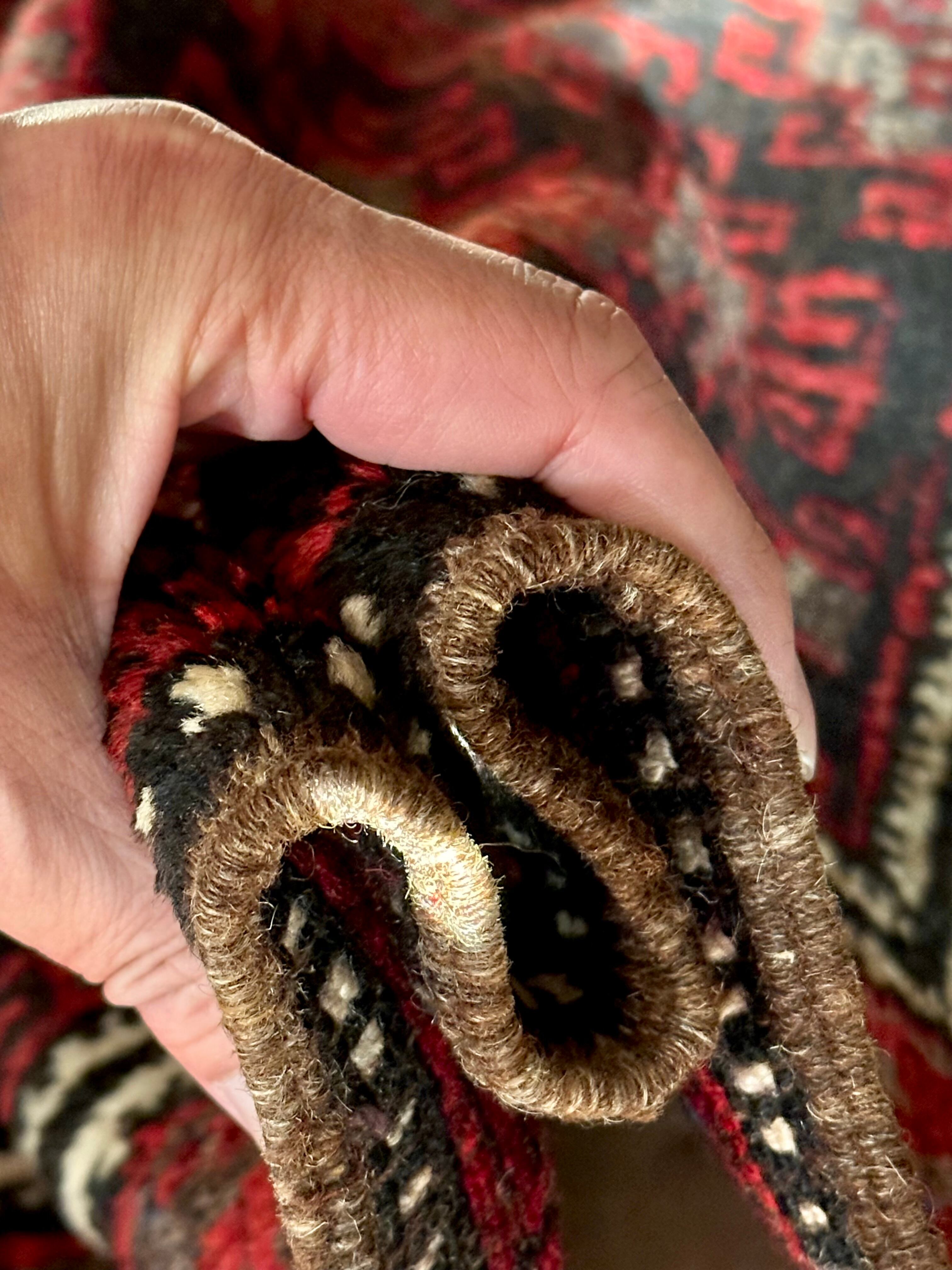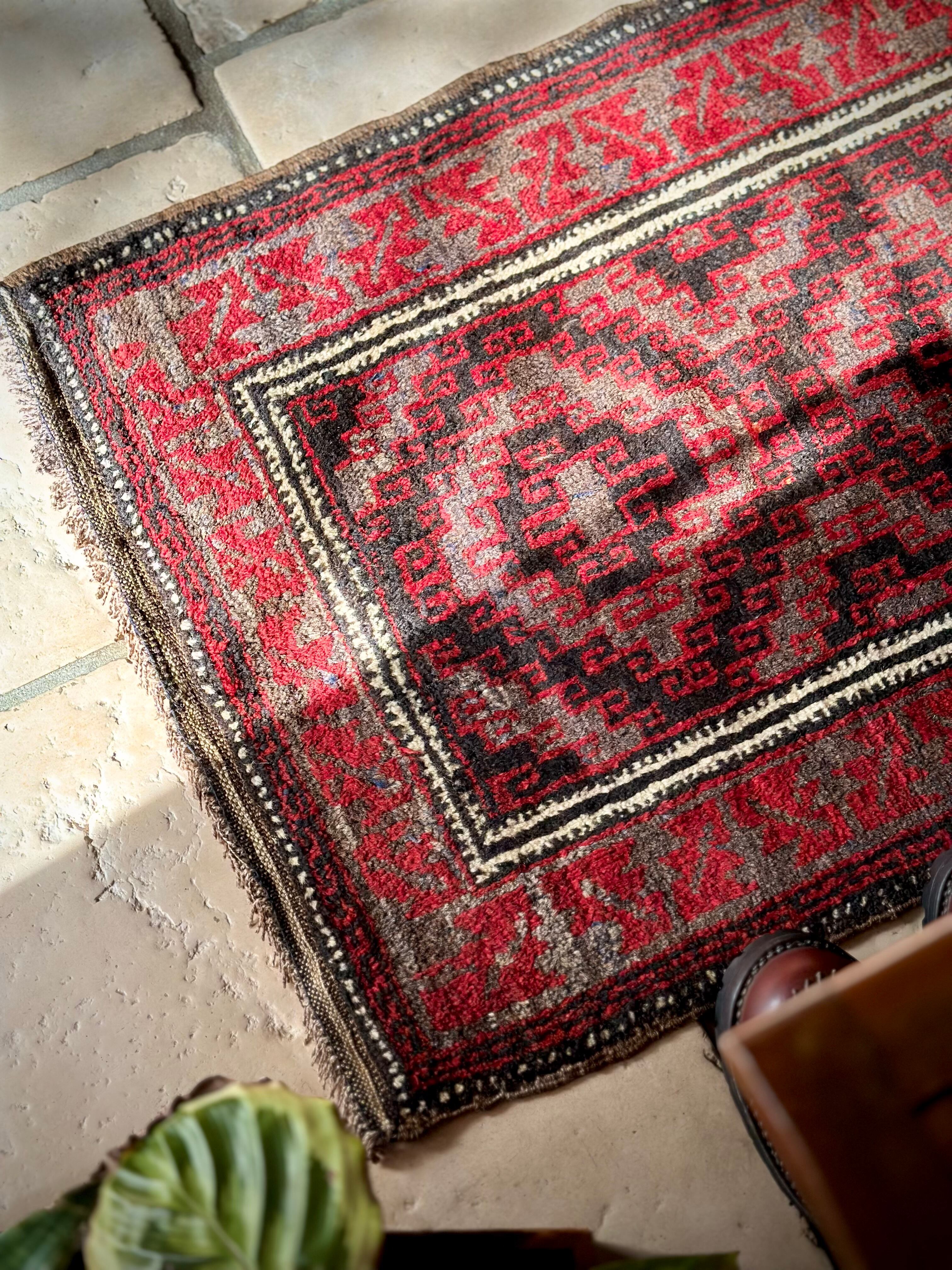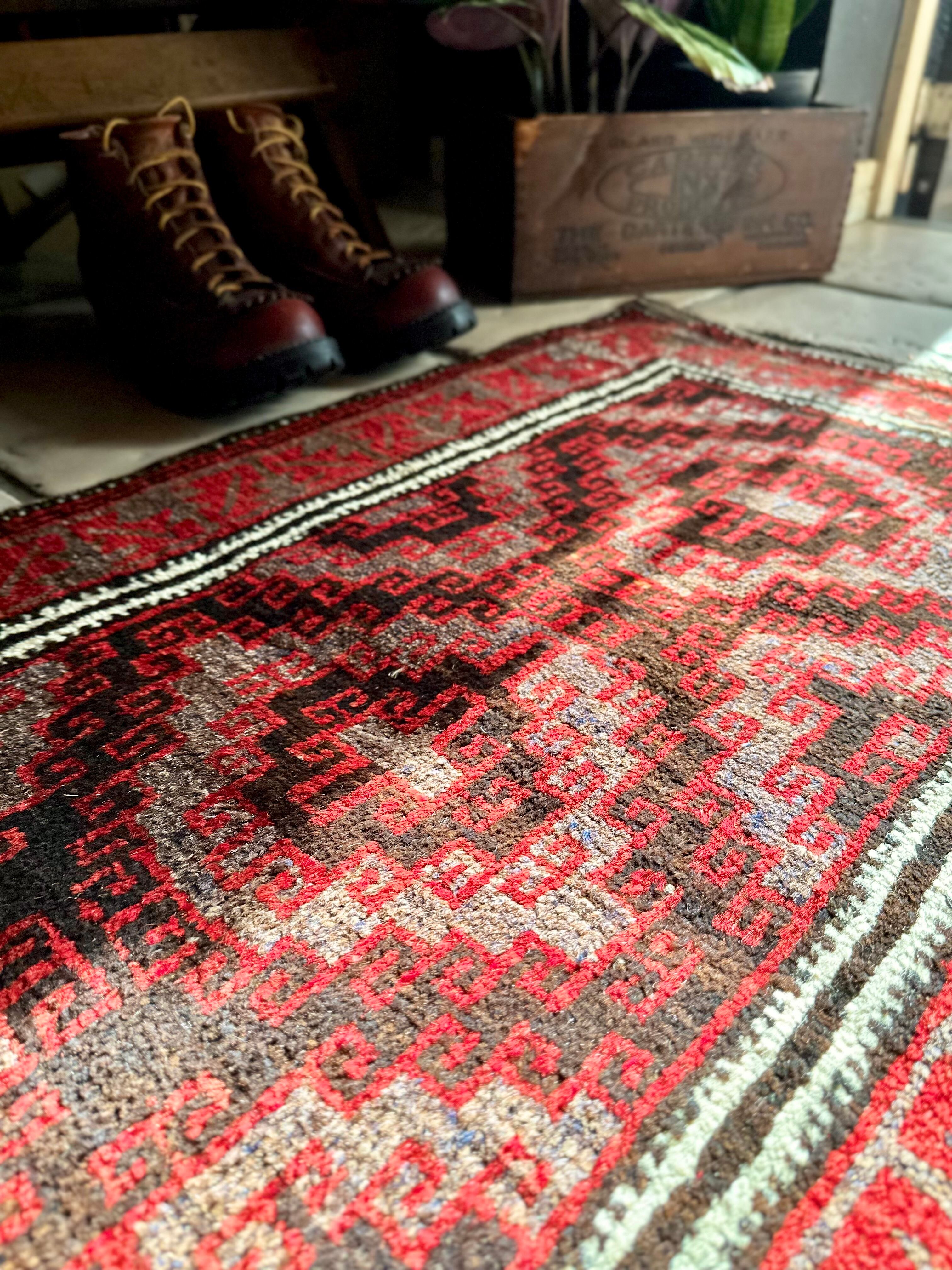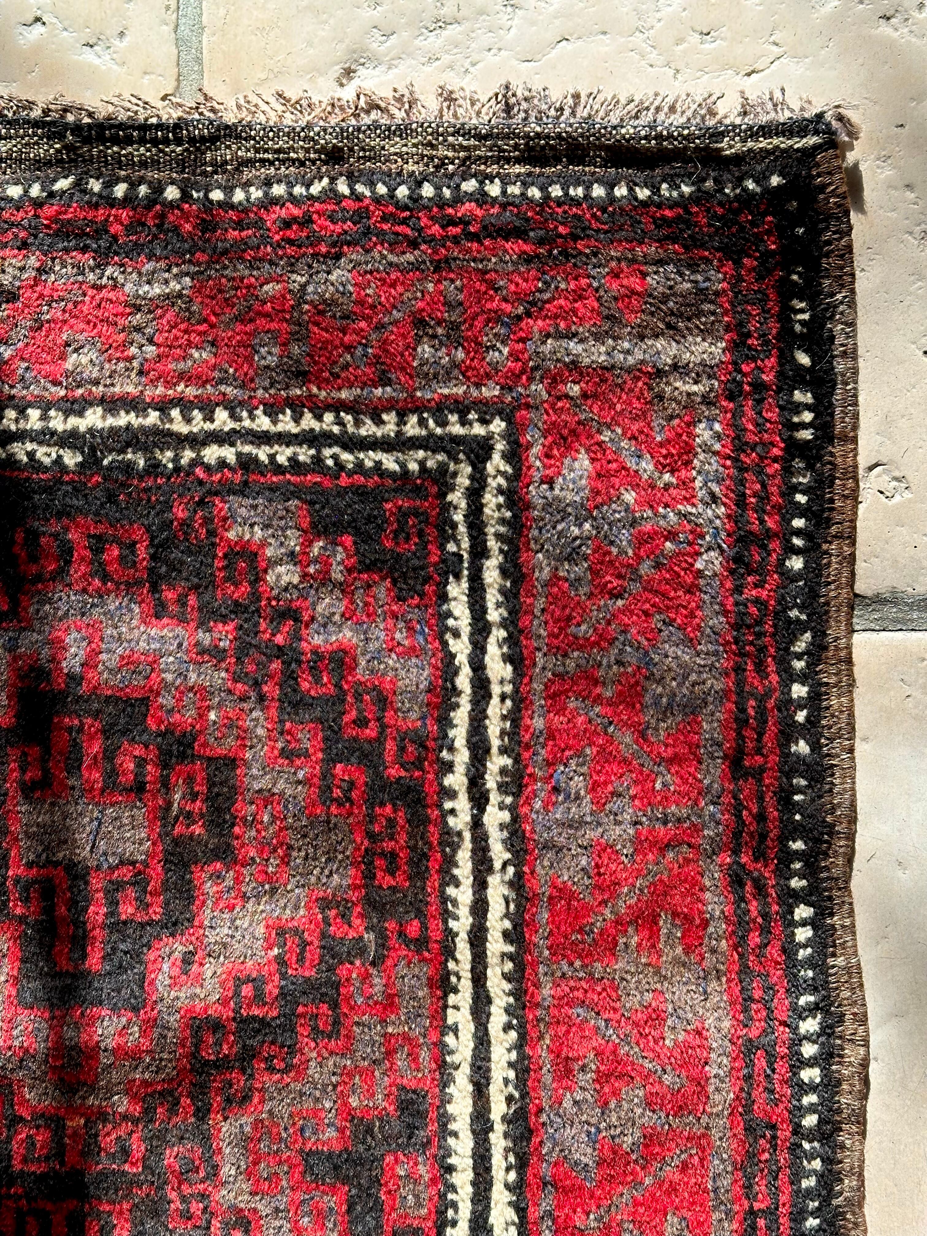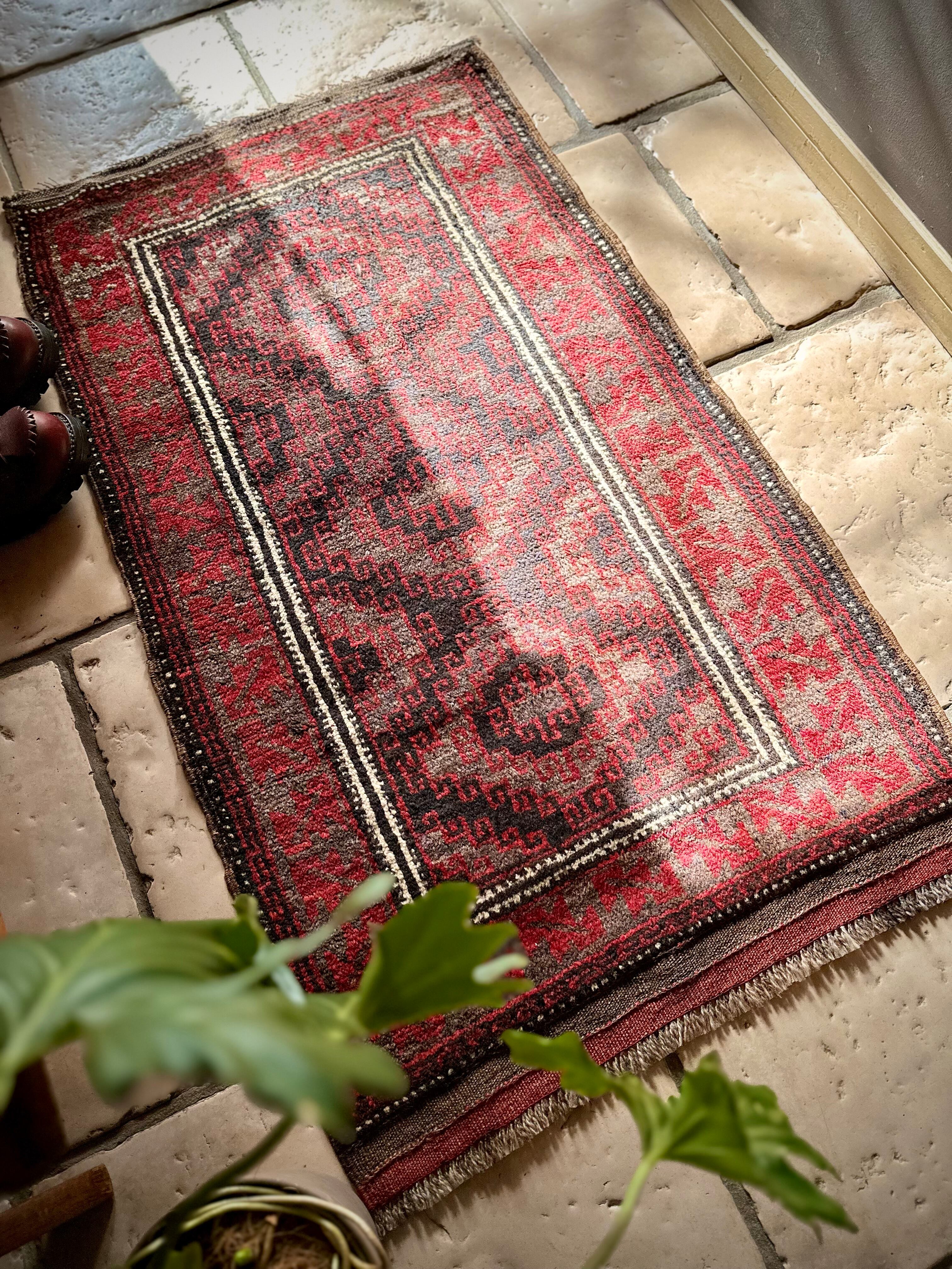ブラック&レッドにグレーの差し色がクールな印象を与えるこちらは、アフガニスタンはヘラート州に居住するバルーチ族のトライバルラグで、元は家財道具の収納や室内ではクッションとして使用されるバーリシトと呼ばれる袋状の表皮をラグに仕立て直したモノになります。