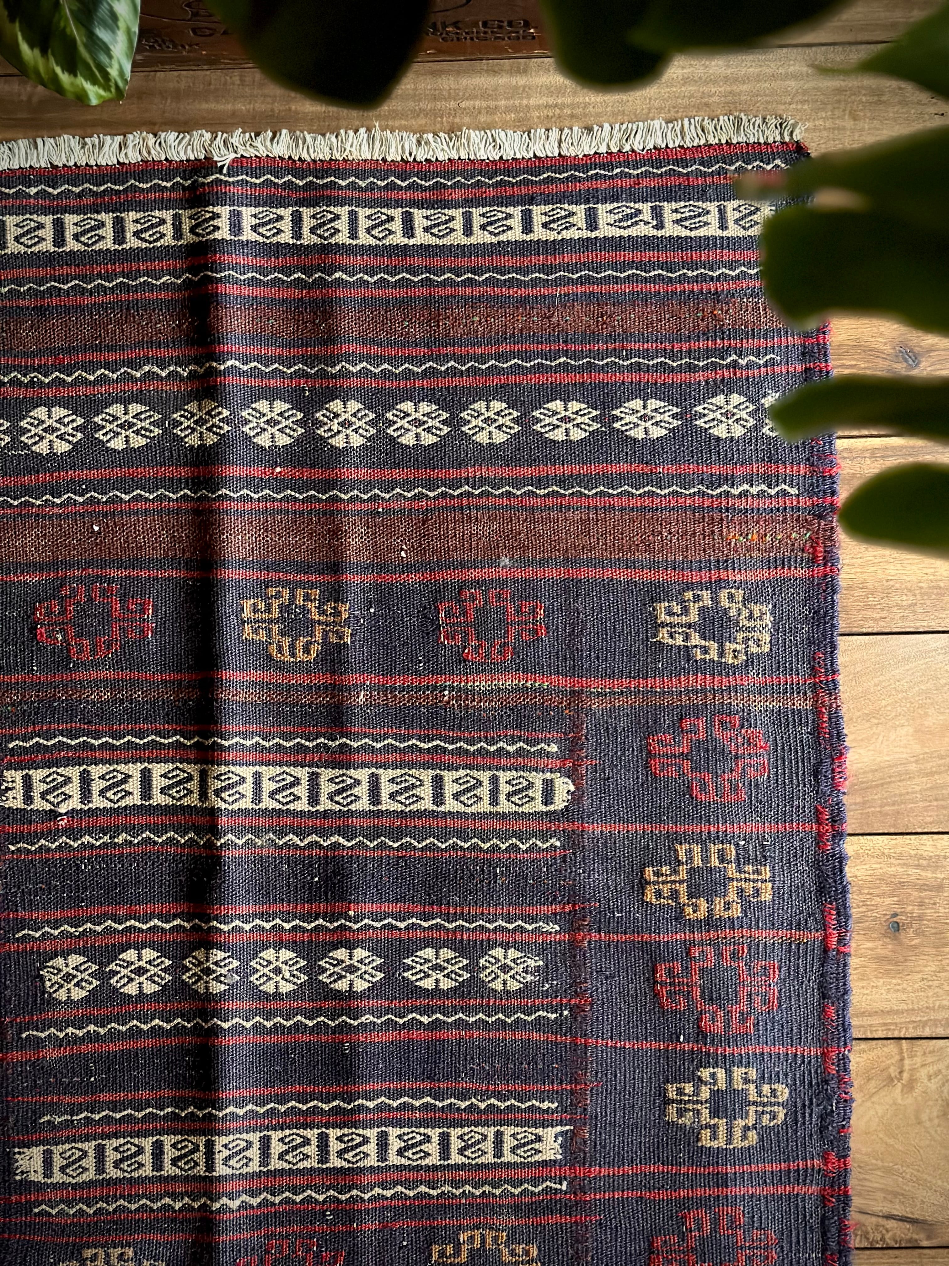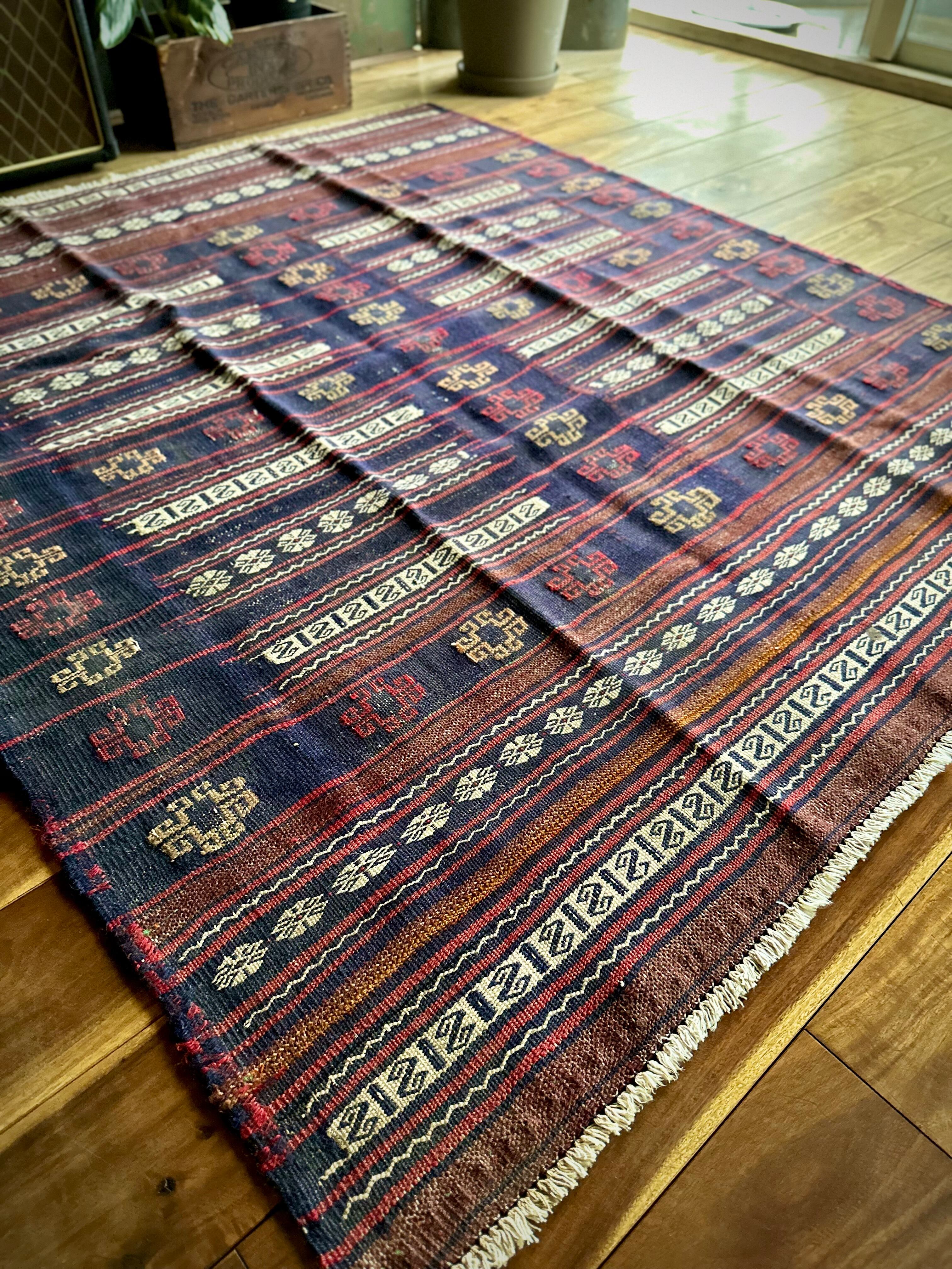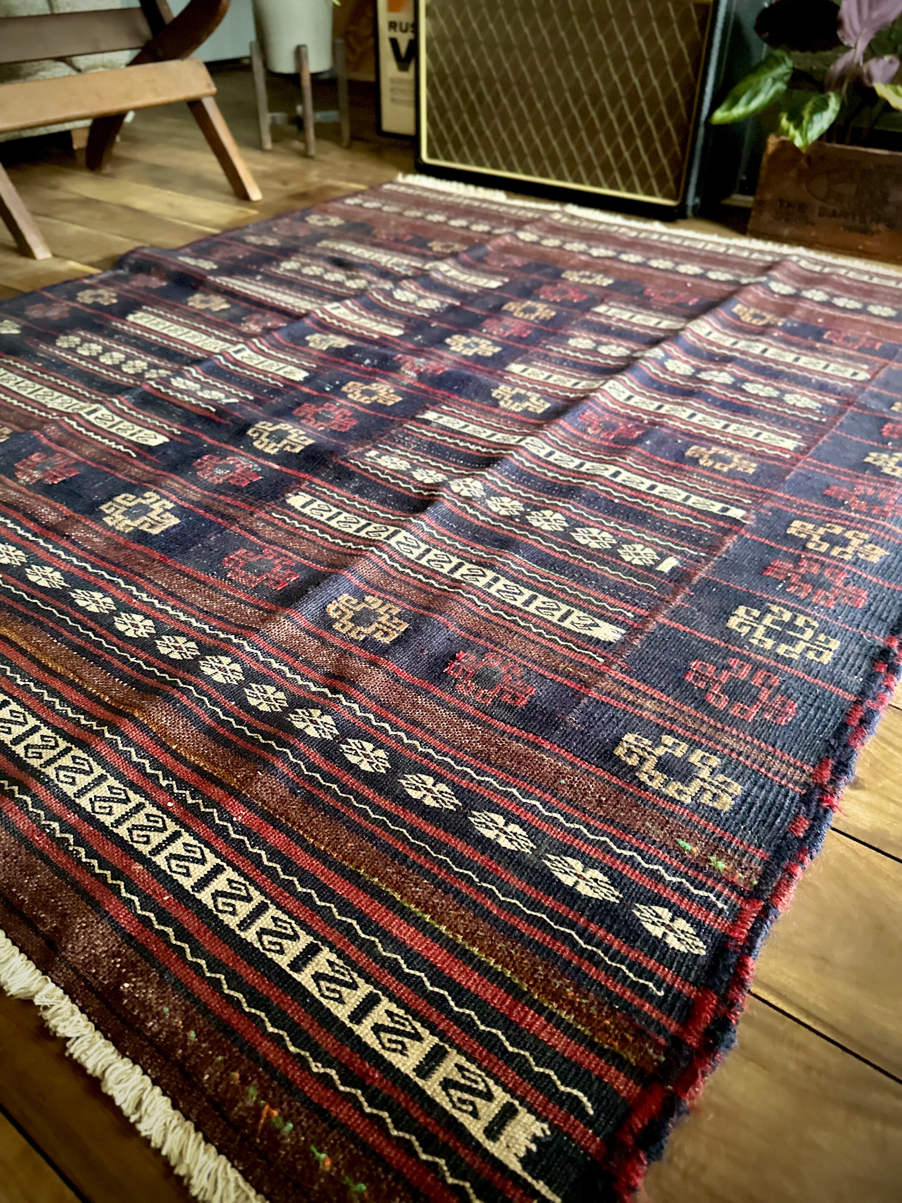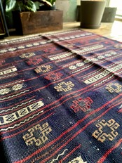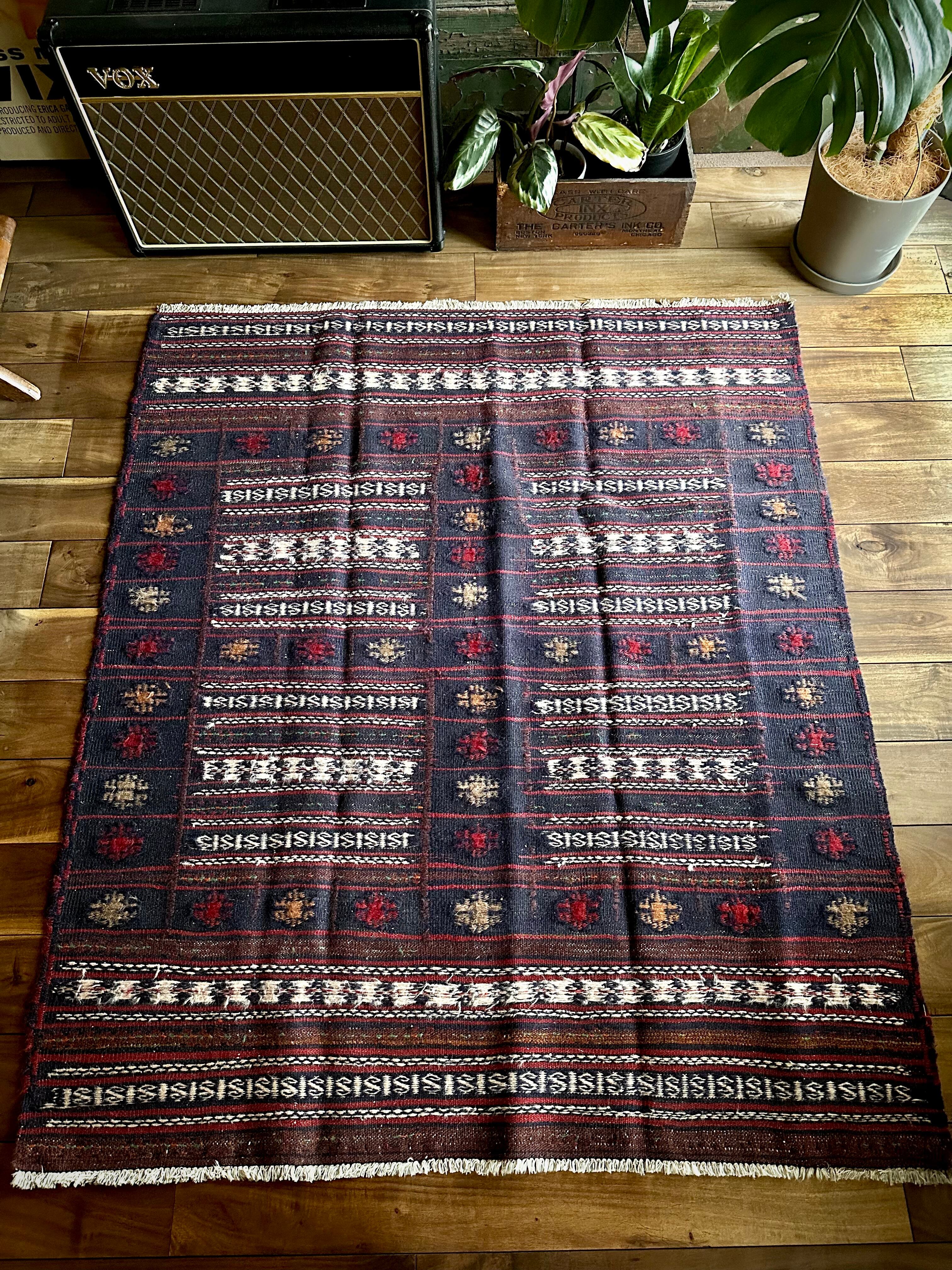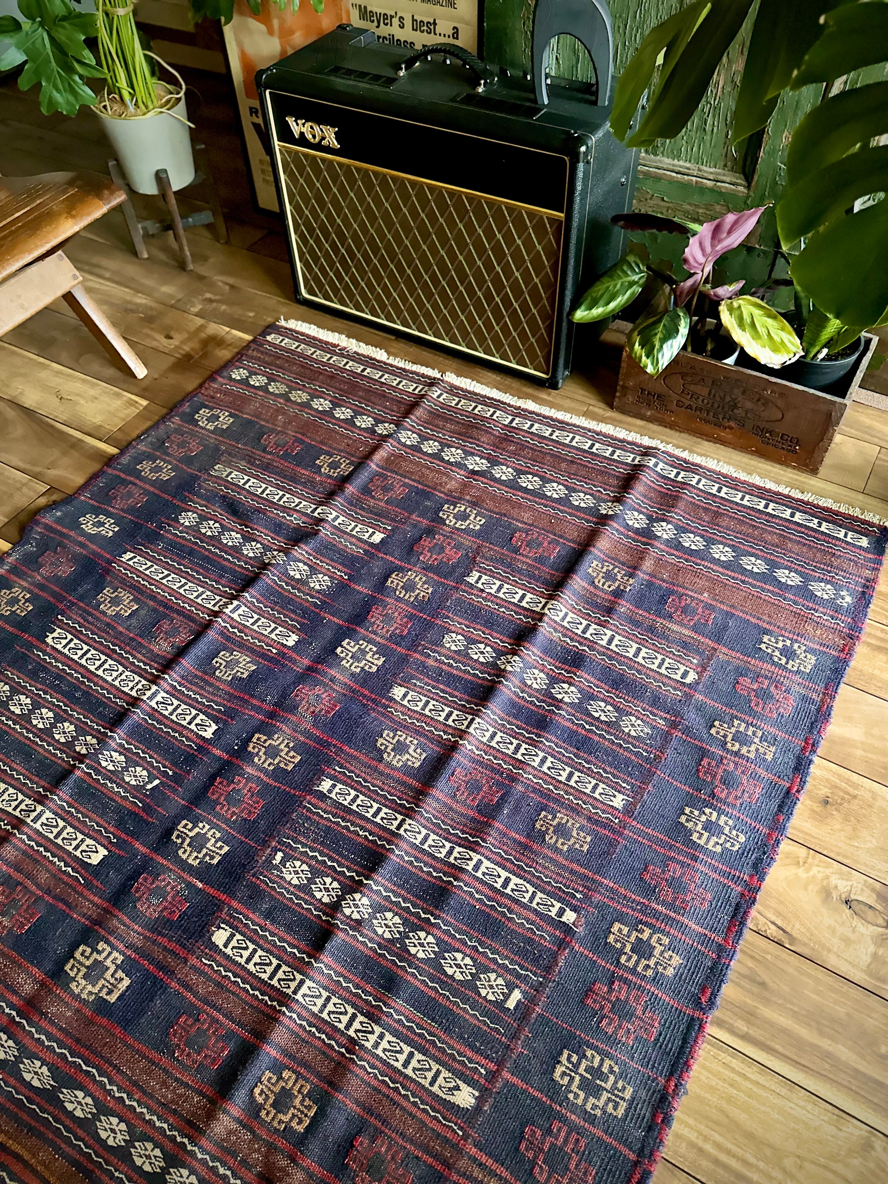 ネイビーのベースに赤と白のラインが映えるアフガニスタンに住むバルーチ族のキリムラグで、日常生活には欠かせないパンやナンを包んで運ぶソフレと呼ばれる食卓布になります。