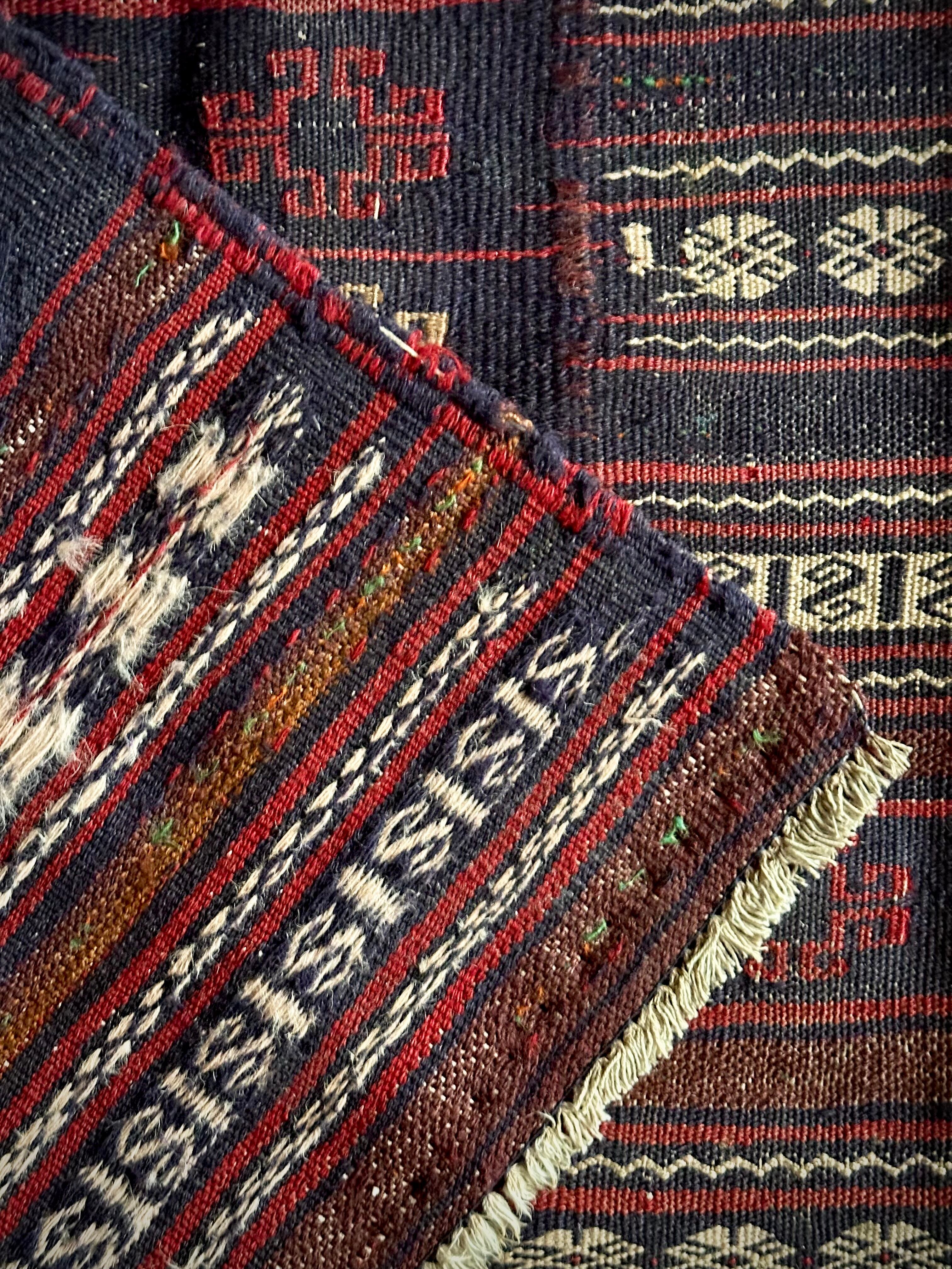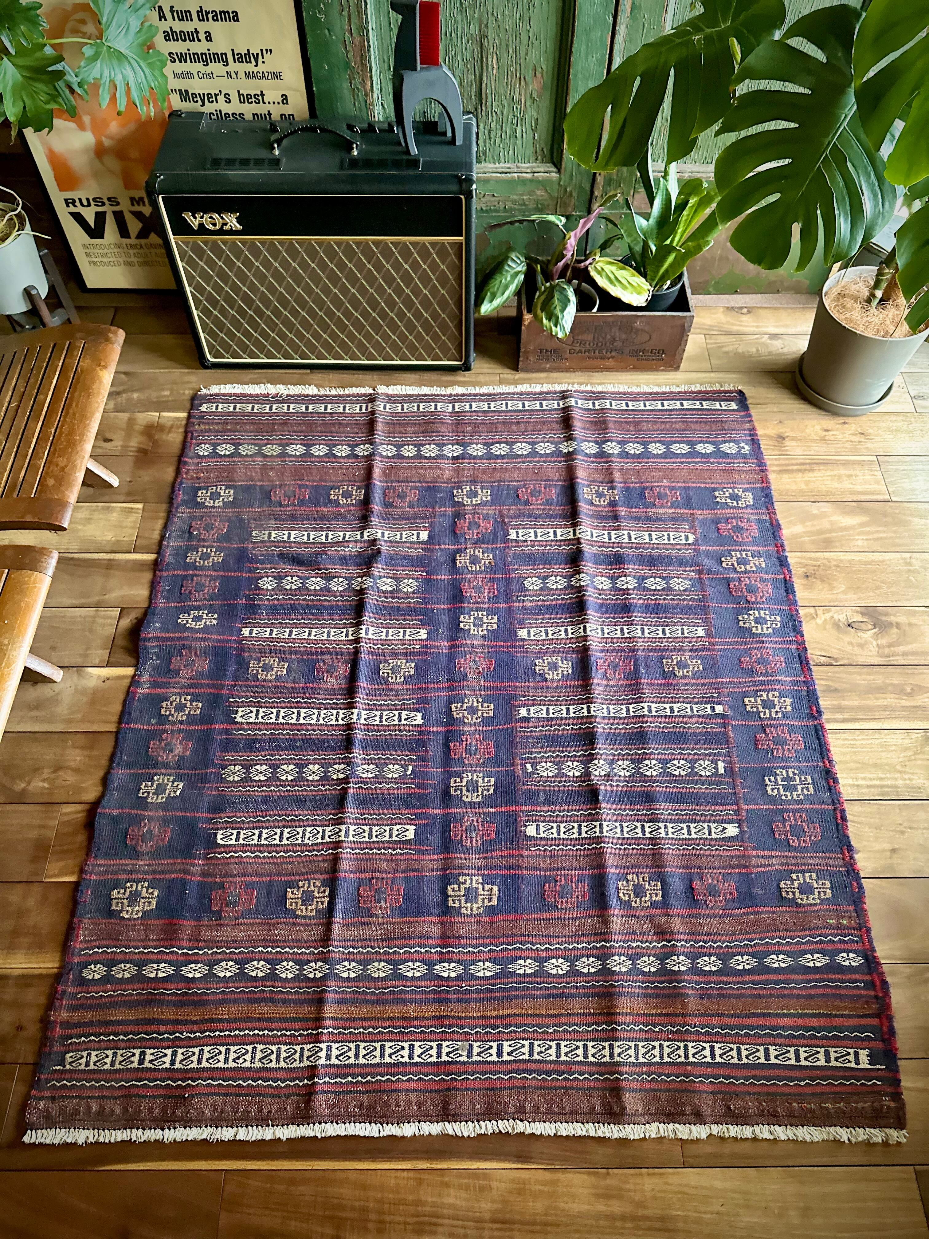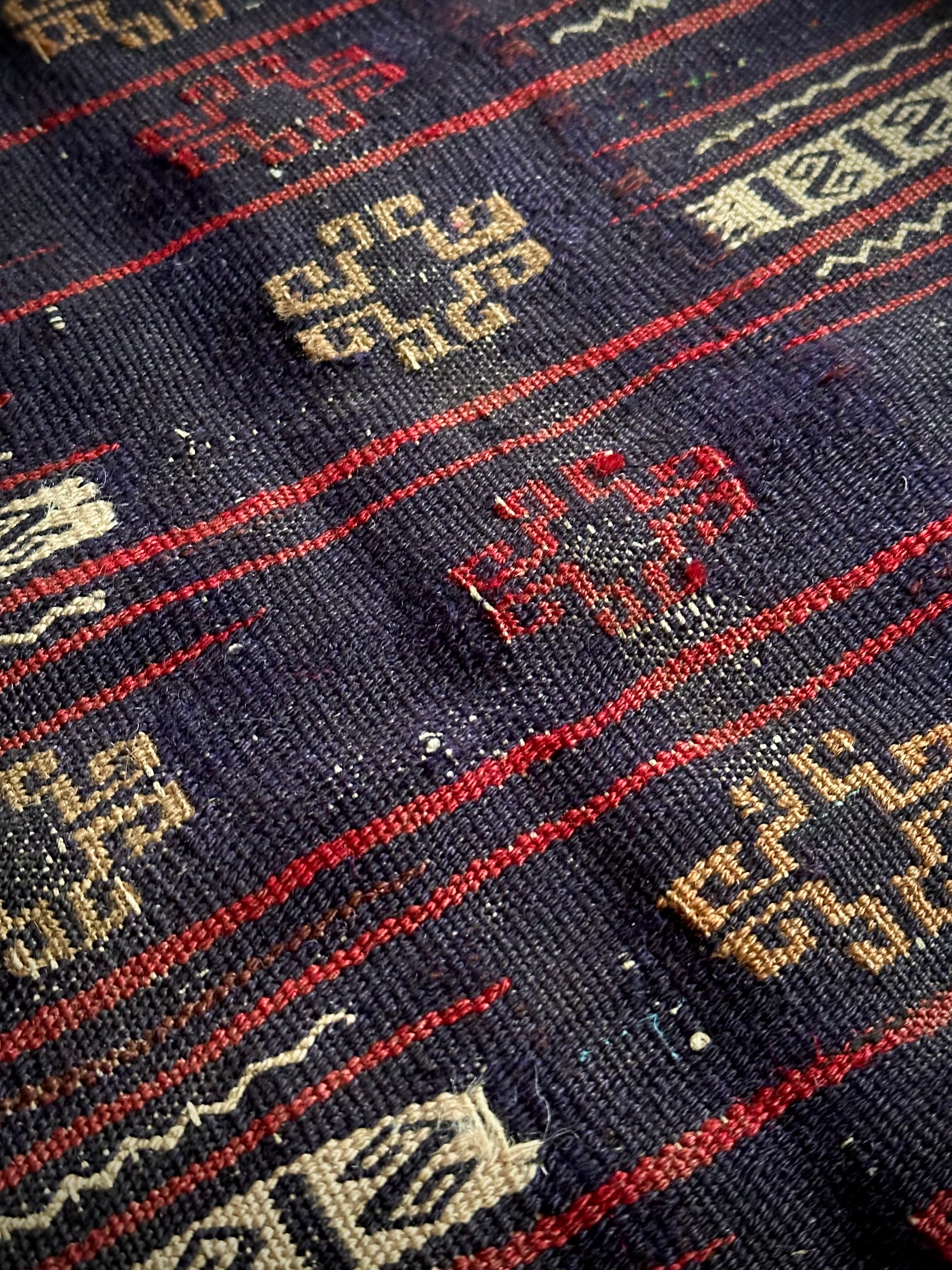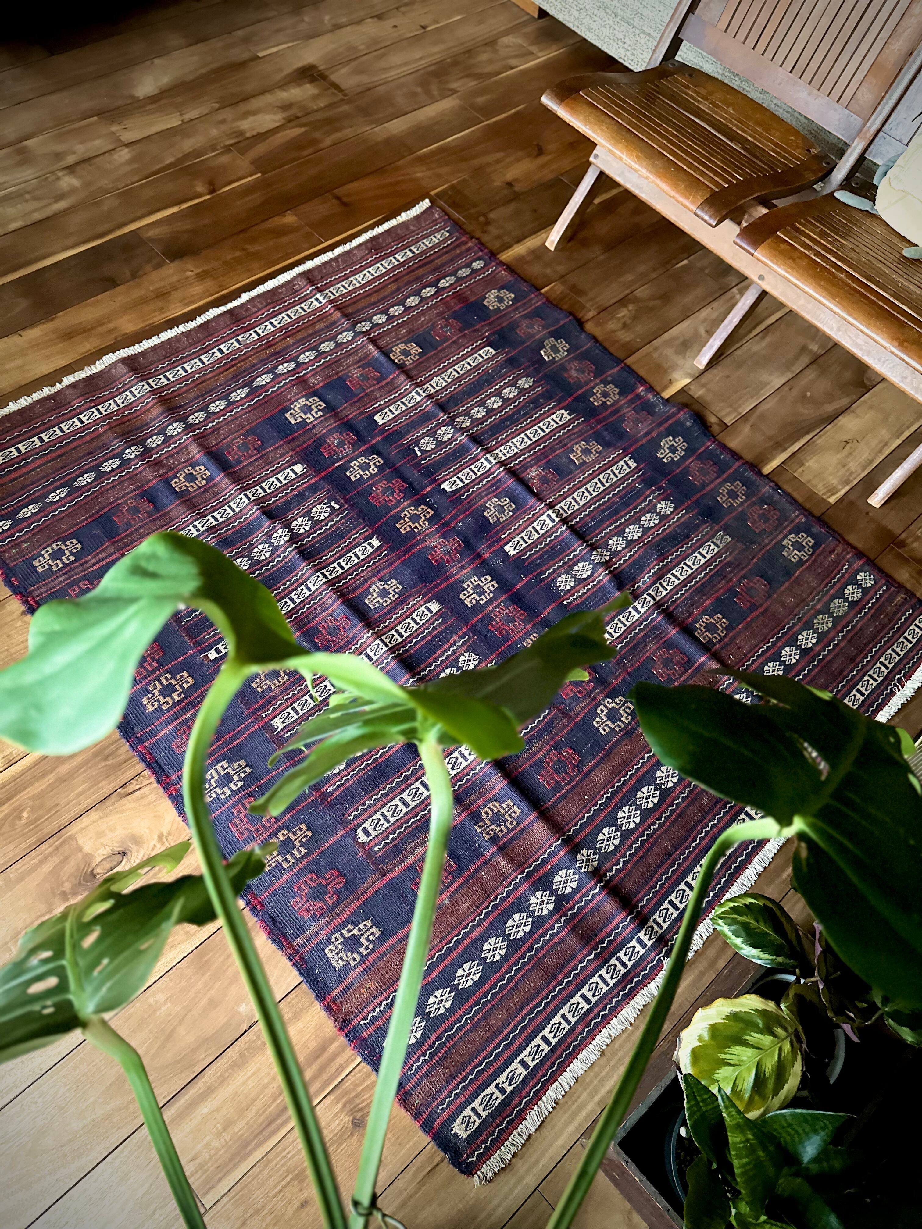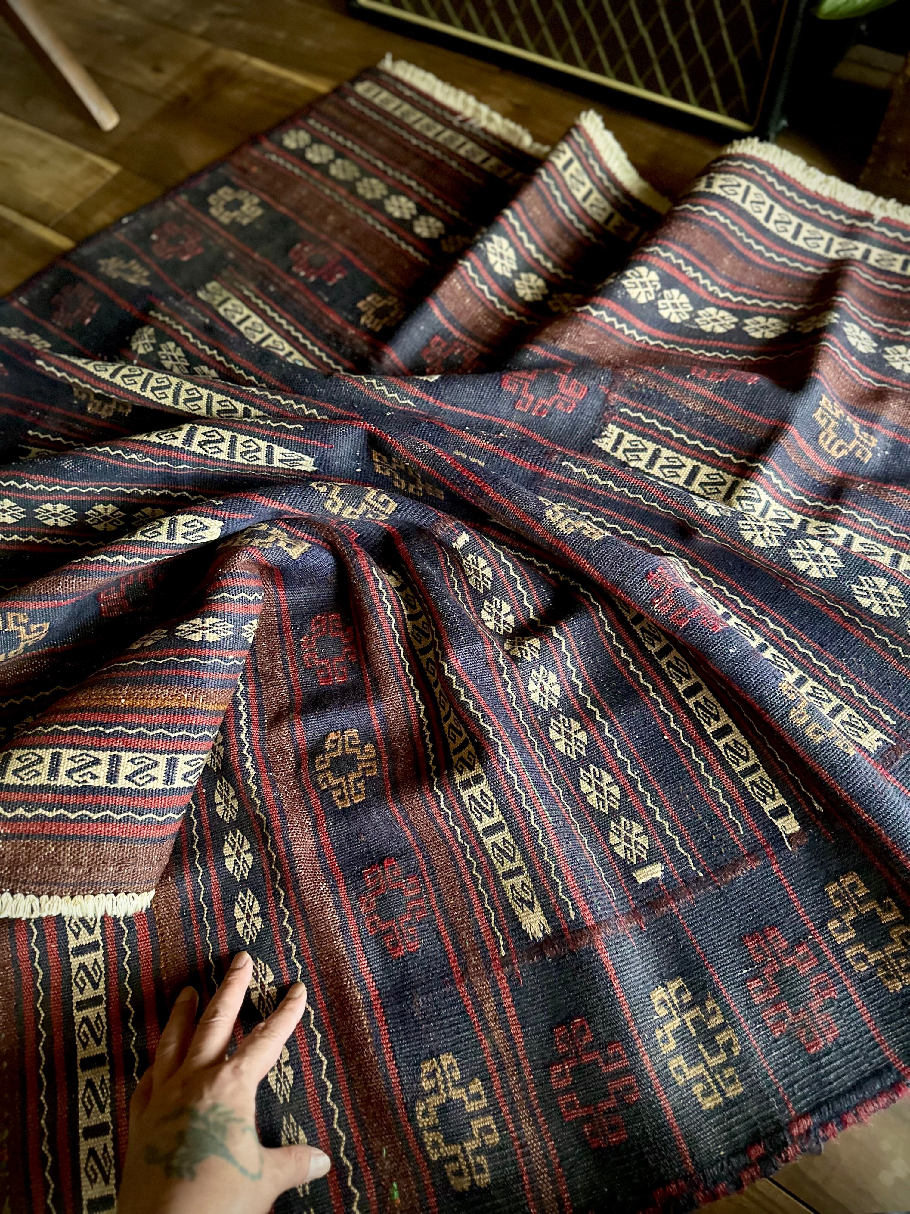 ネイビーのベースに赤と白のラインが映えるアフガニスタンに住むバルーチ族のキリムラグで、日常生活には欠かせないパンやナンを包んで運ぶソフレと呼ばれる食卓布になります。
