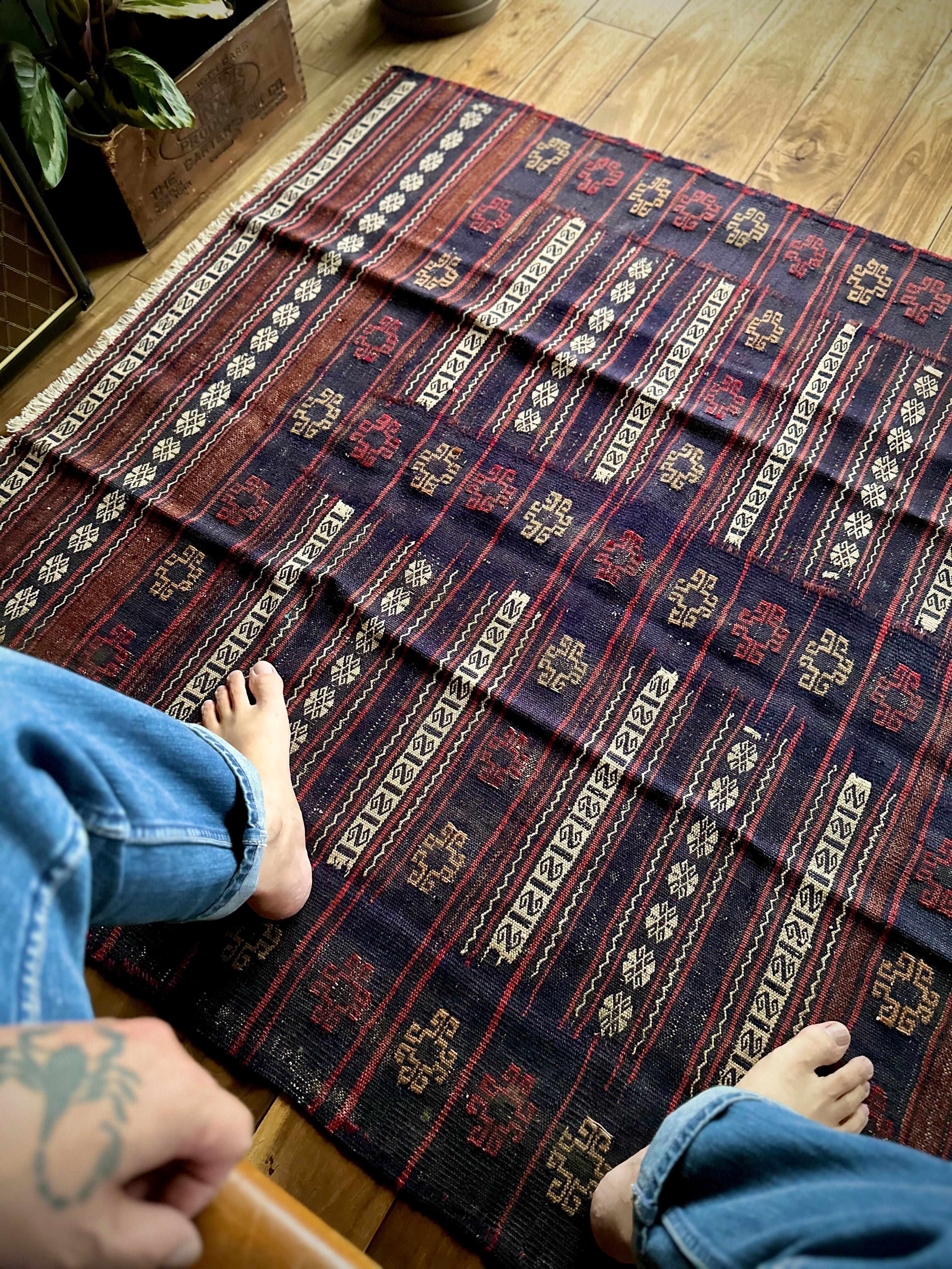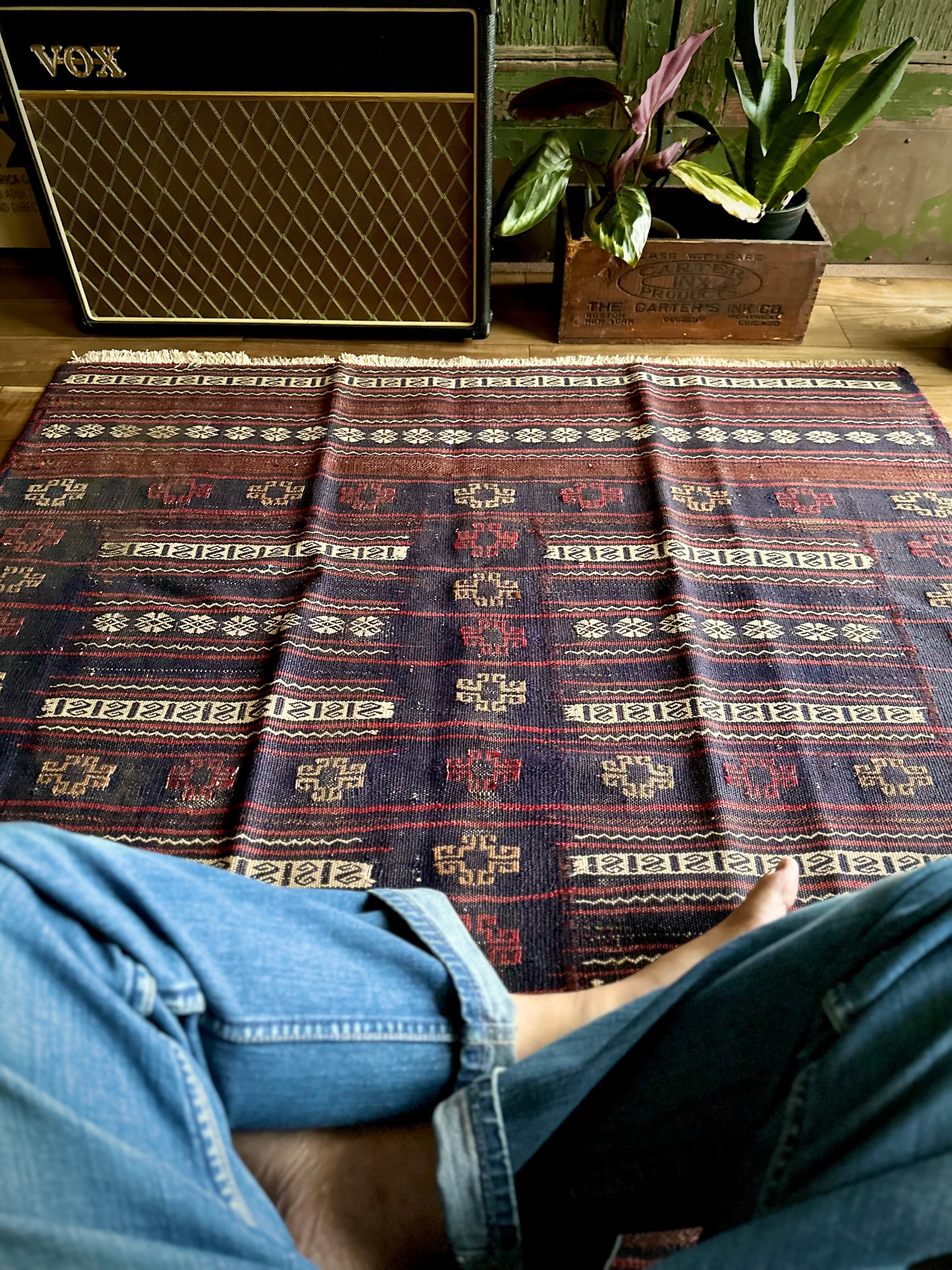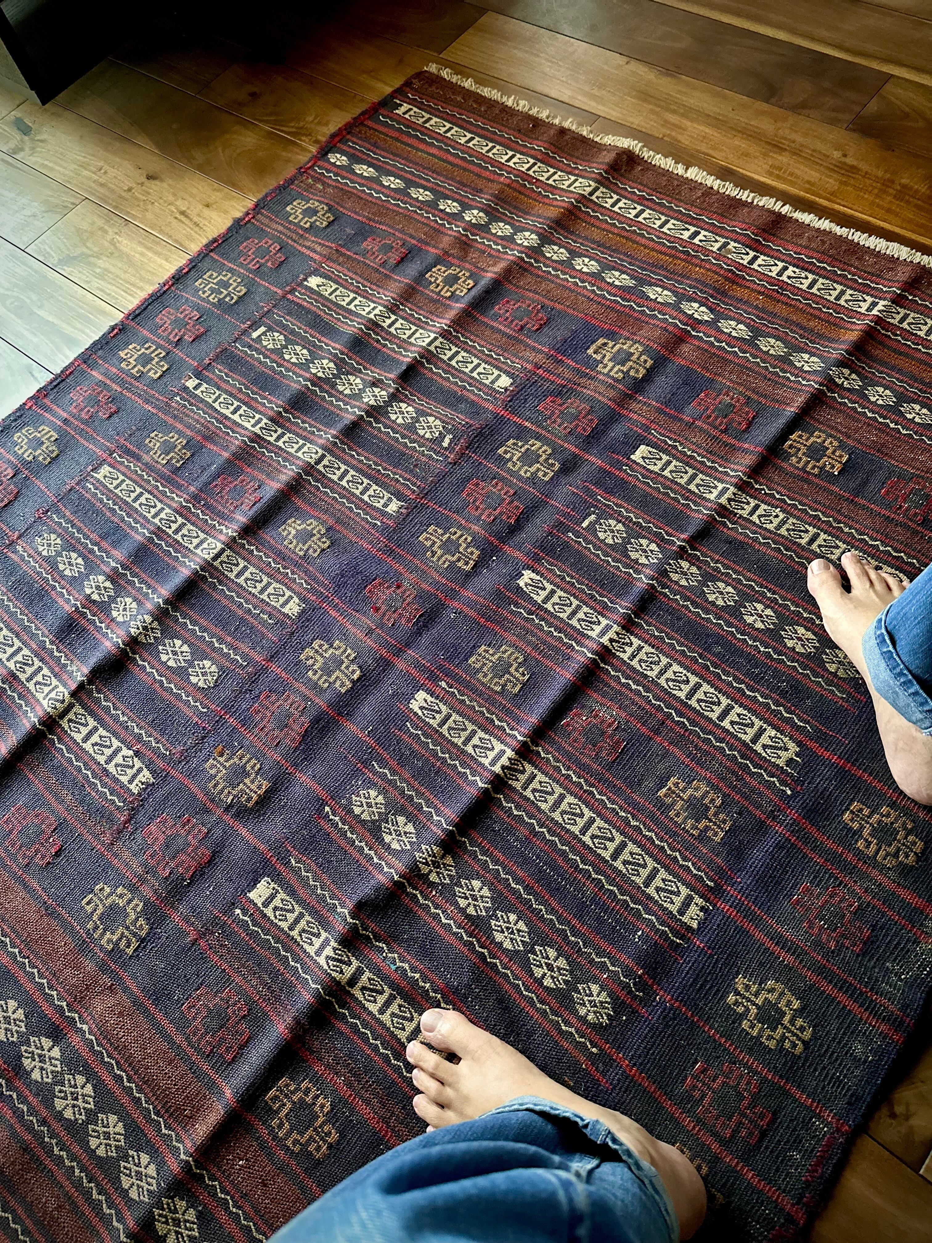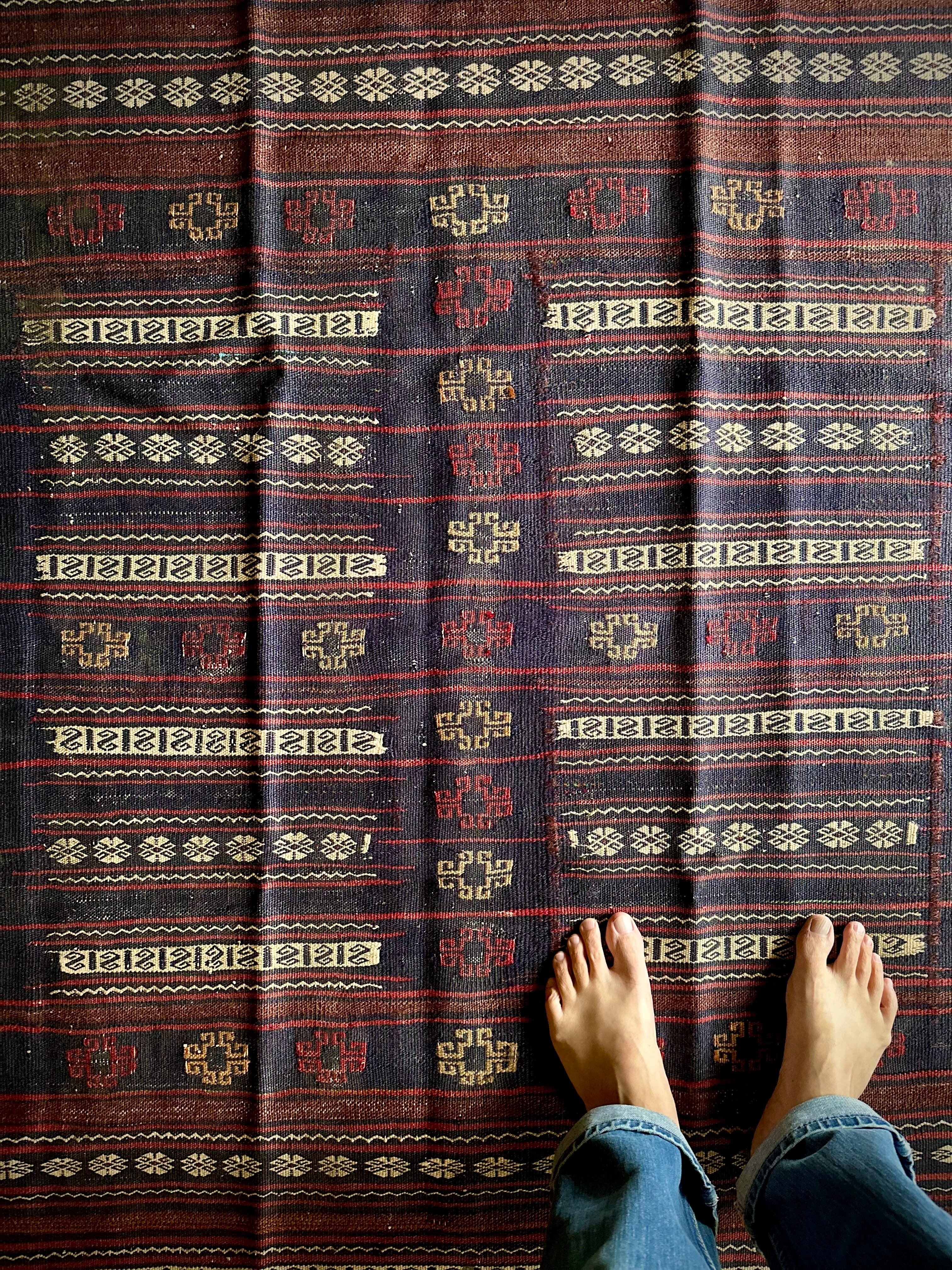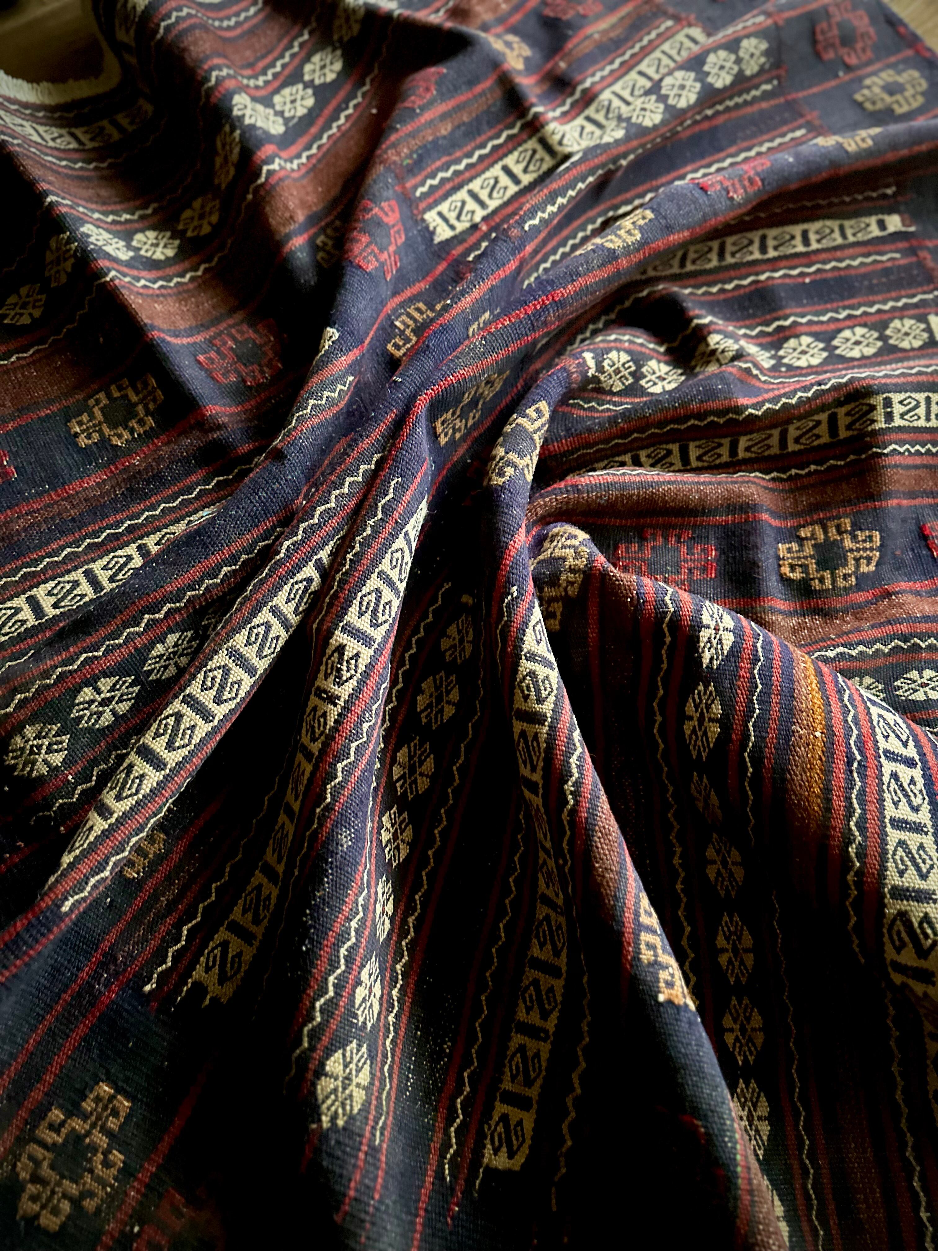 ネイビーのベースに赤と白のラインが映えるアフガニスタンに住むバルーチ族のキリムラグで、日常生活には欠かせないパンやナンを包んで運ぶソフレと呼ばれる食卓布になります。
