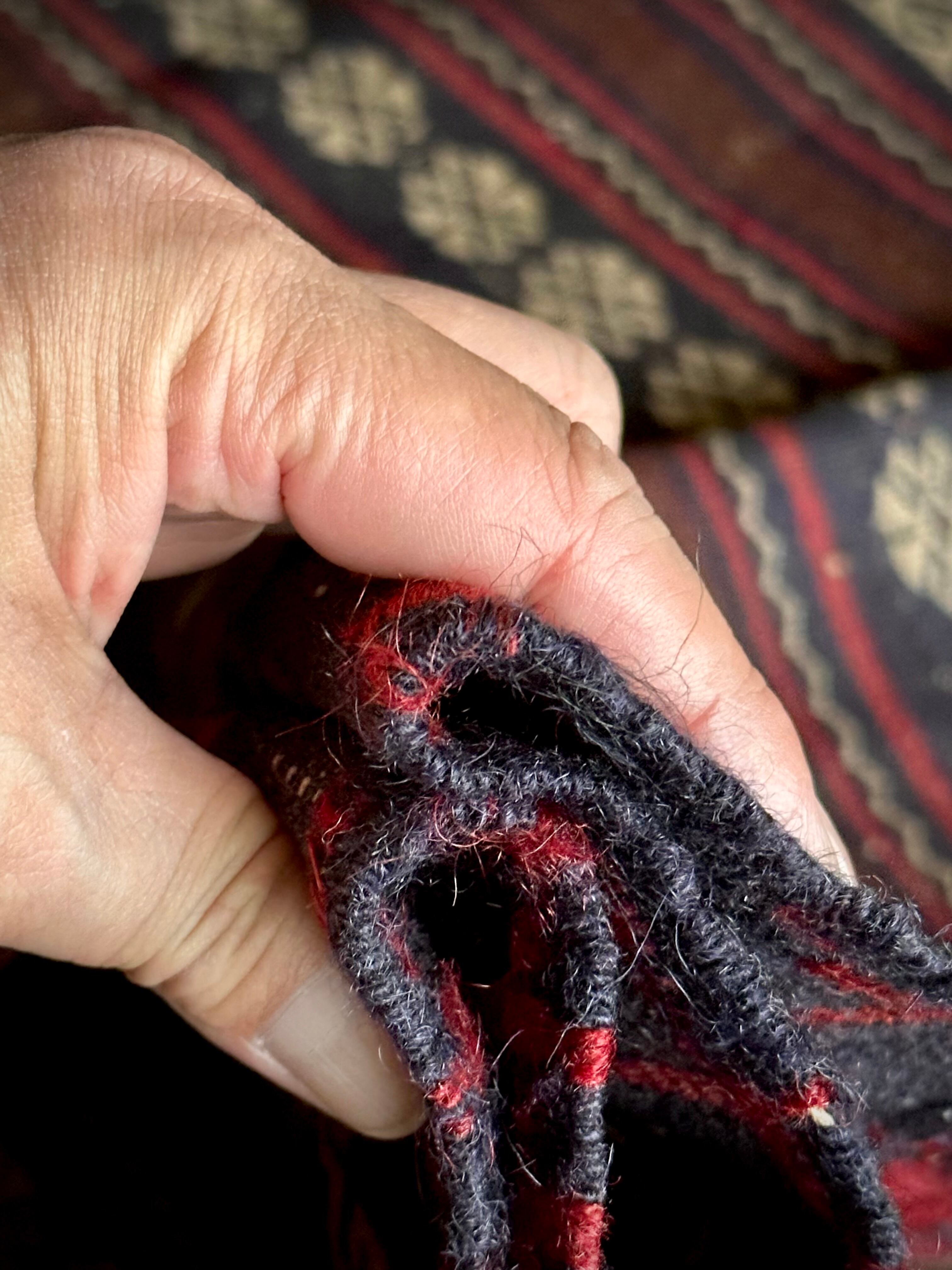 経年としてはそれなりに古い50年のヴィンテージラグとして、使用感はもちろん経年劣化によるクタレ感があり、破れてはいませんが擦り切れ箇所がありますので雰囲気として補てください。