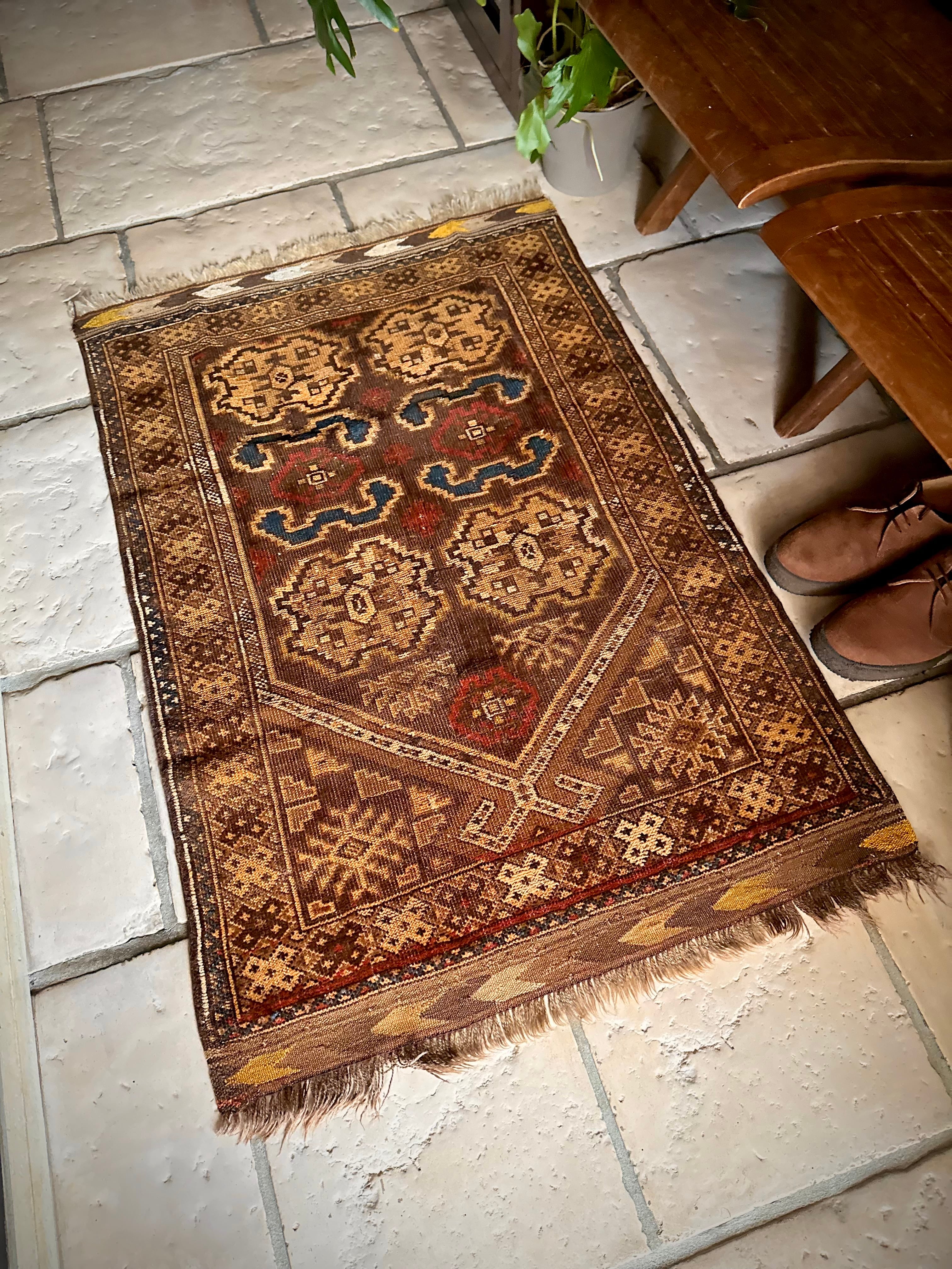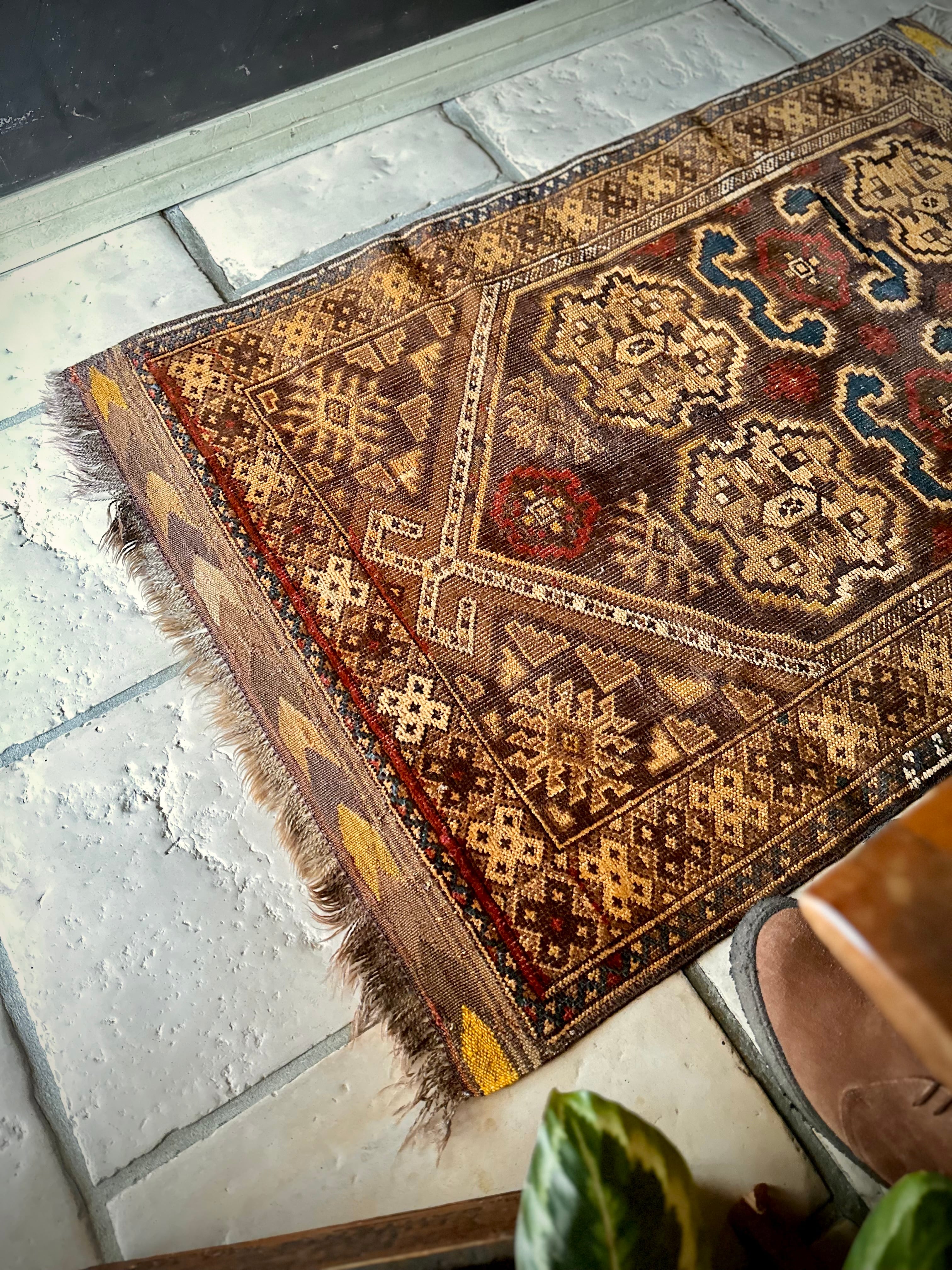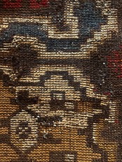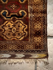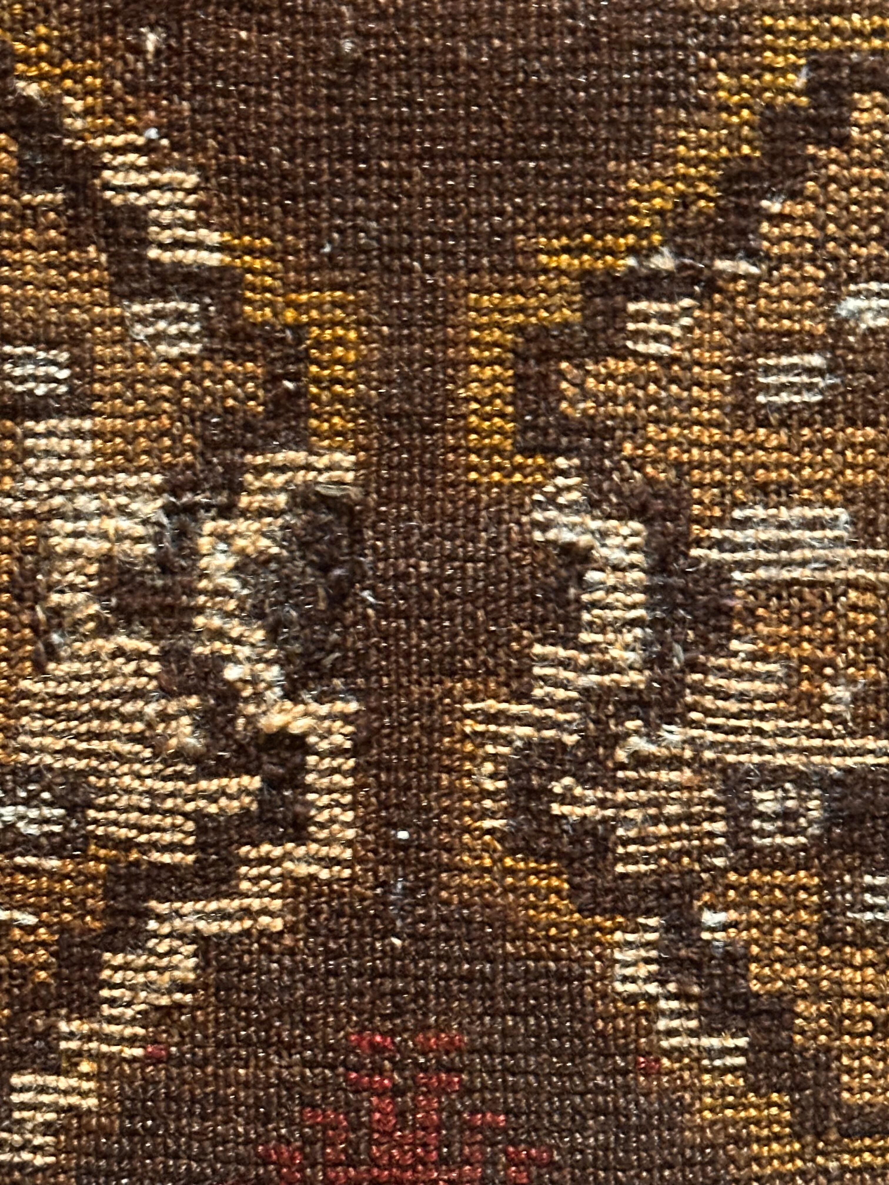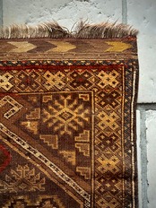 コンディションとしては、おおよそ1世紀という年月を経たアンティークラグらしく、当時のリペアがあり全体的にはかなり薄手でパイルの毛足もほぼありませんが、歴史的なテキスタイルとして壁に飾って眺めるというのが大人な楽しみ方かと、個人的にはアンティーク云々は興味はありませんが、ただ安かったのでピックしてみた次第です。